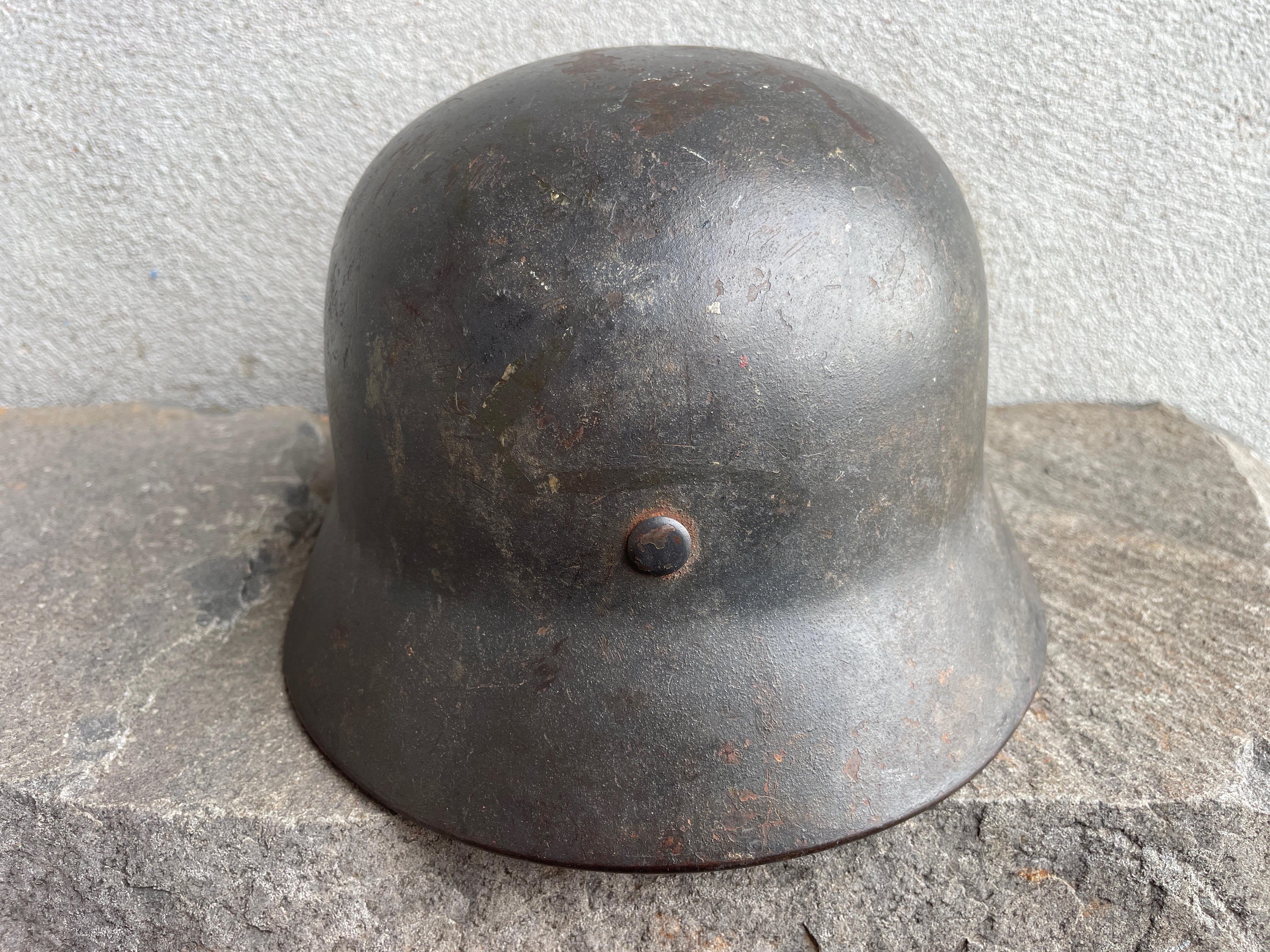 Well here's a helmet that newer collectors tend to appreciate once they have had a few years of study under their belt and are craving something untouched an original from WW2. Here is an original M40 Q62 mid-war single decal Luftwaffe helmet with actual battle war patina that just screams out been there and done that. The rear lot number is DN172 which placed the factory production date to June 1941 according to Brian Ice's lot data book. Making this a real mid war everyday fighting man's helmet.