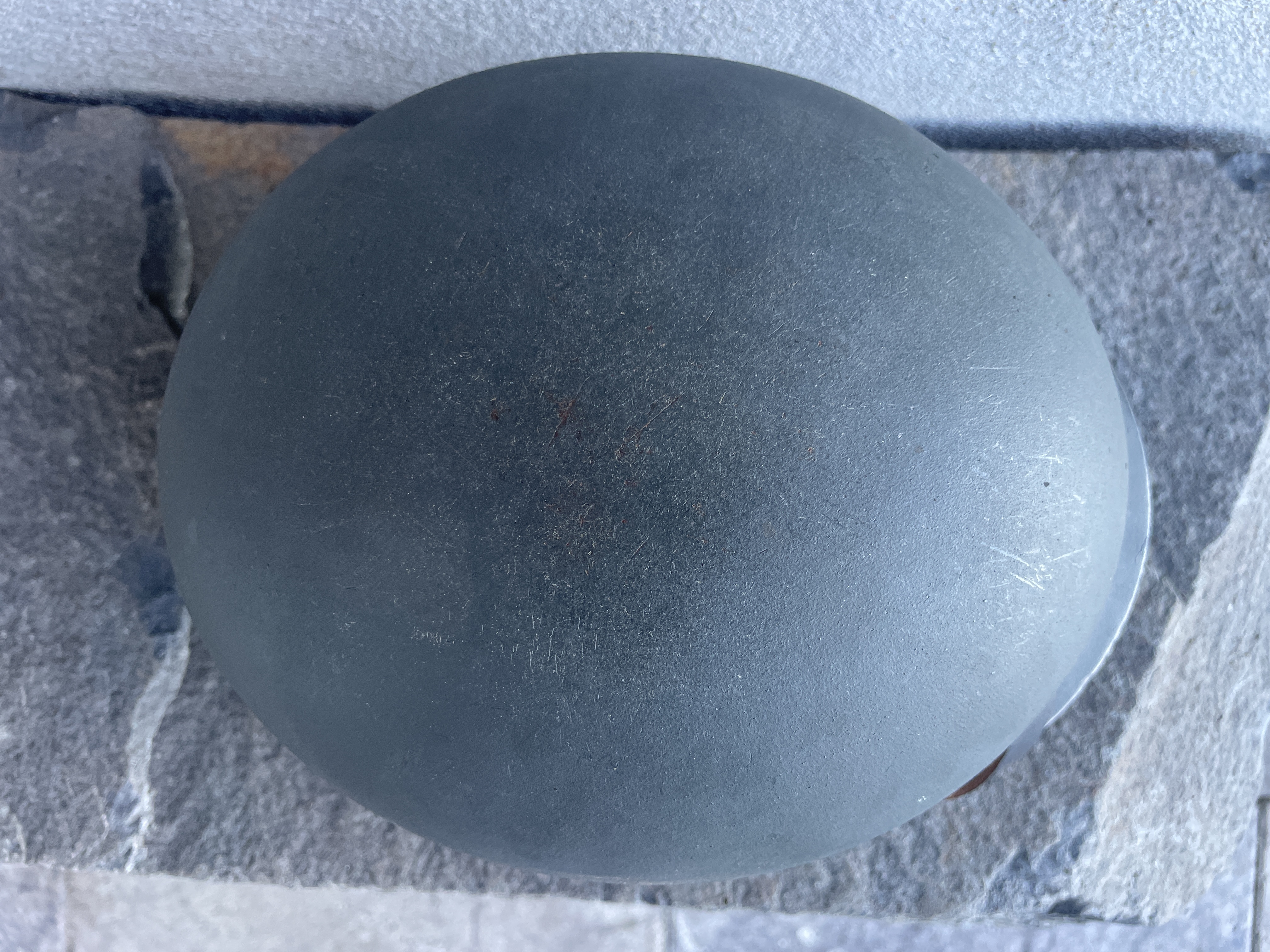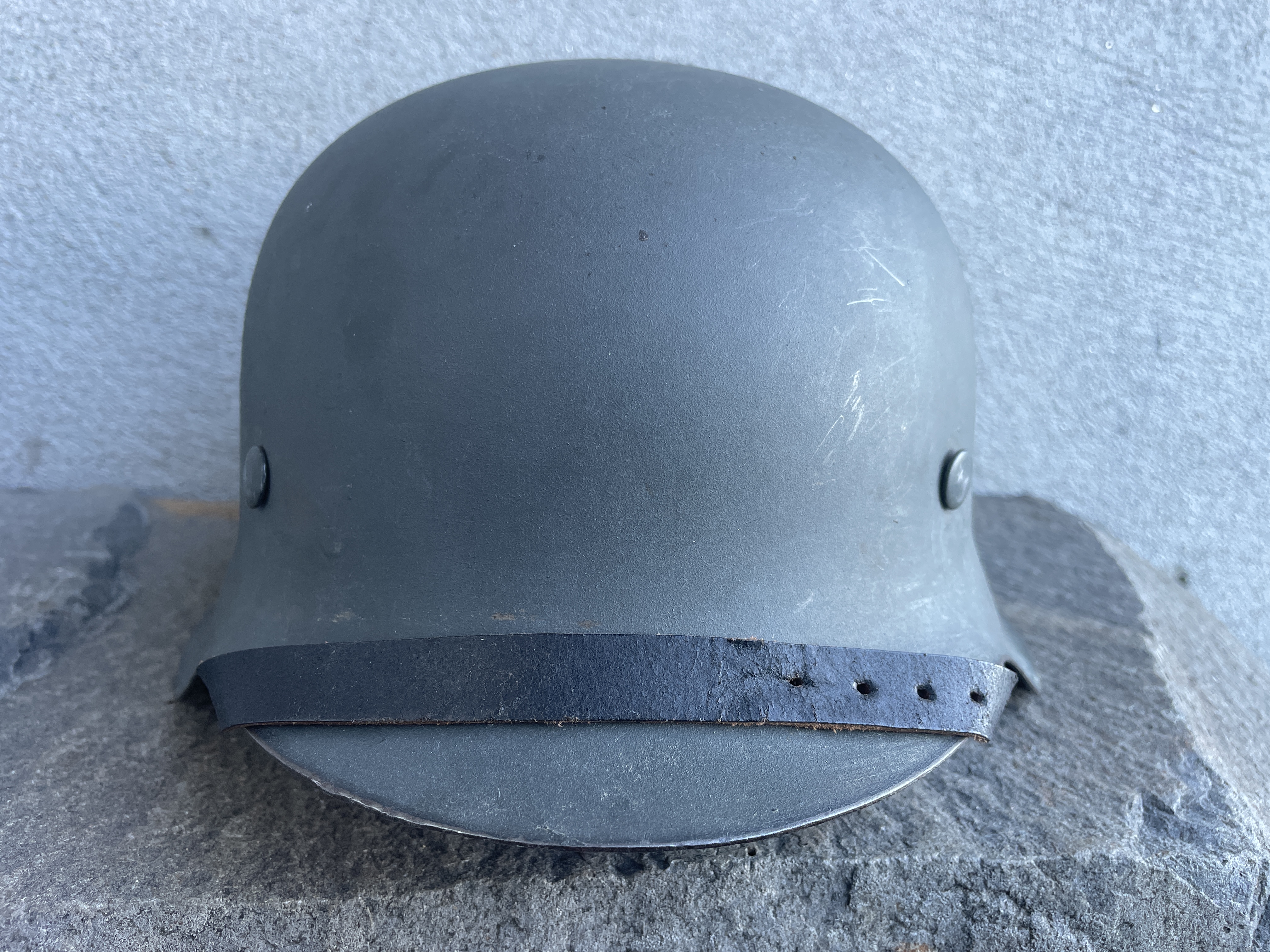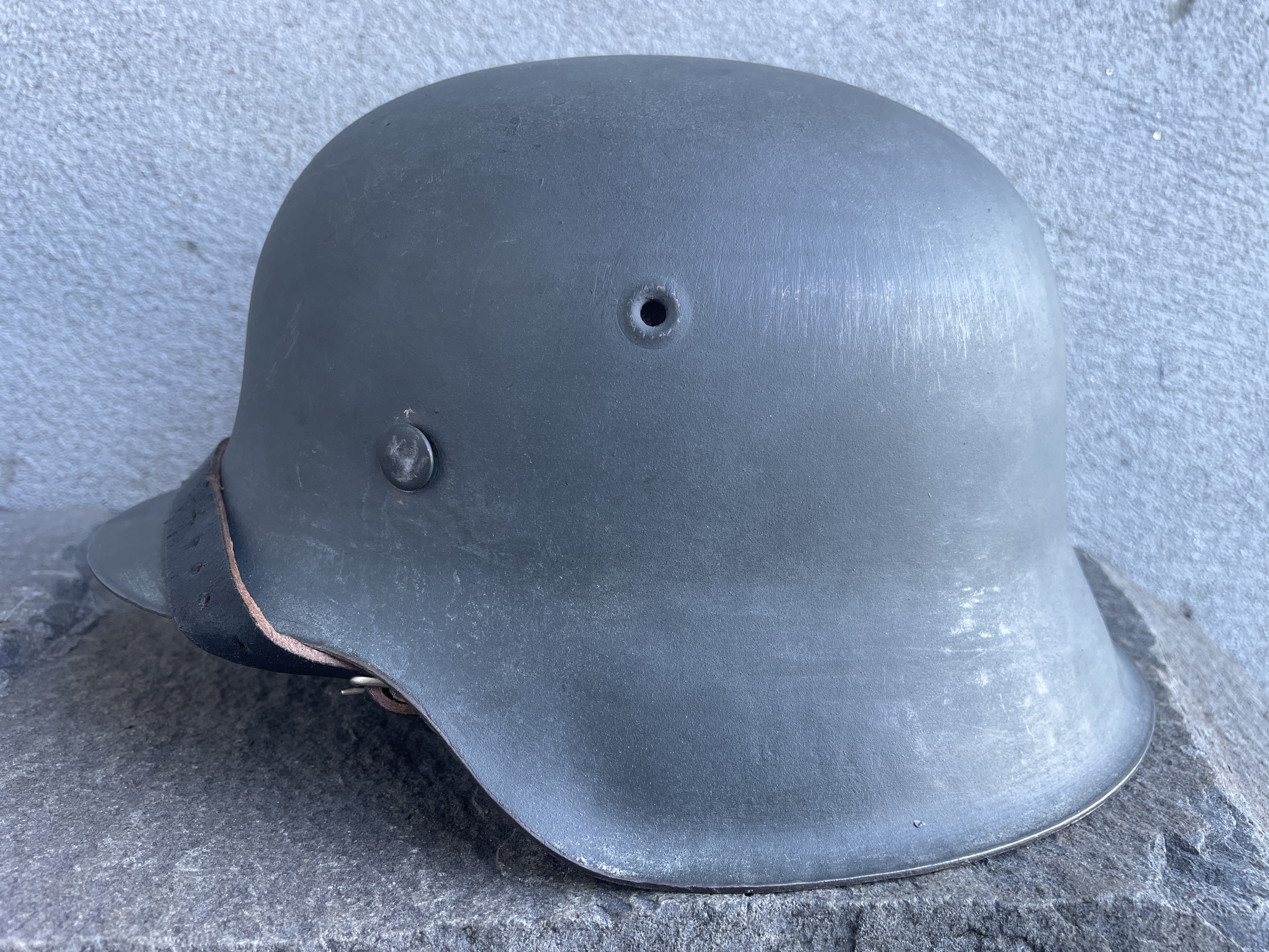 Here is a professionally restored using an ORIGINAL German WW2 produced M42 shell. This is a medium sized M42 helmet produced by Eisenhuttenwerke, Thale, Germany. The rear lot number suggests 1943 factory production. The helmet. was professionally restored with textured feldgrau paint on the outside and a smooth enamel finish on the inside.