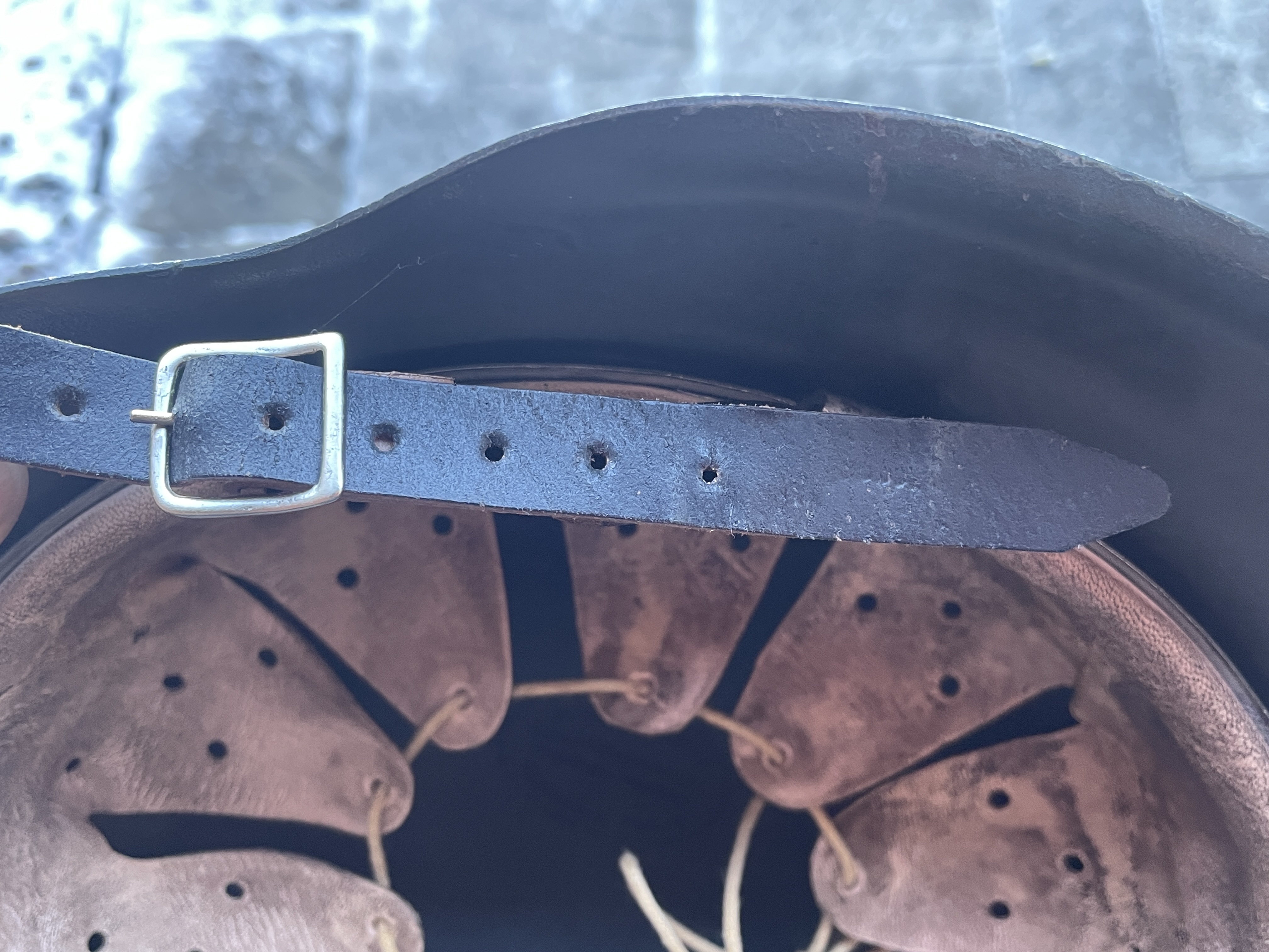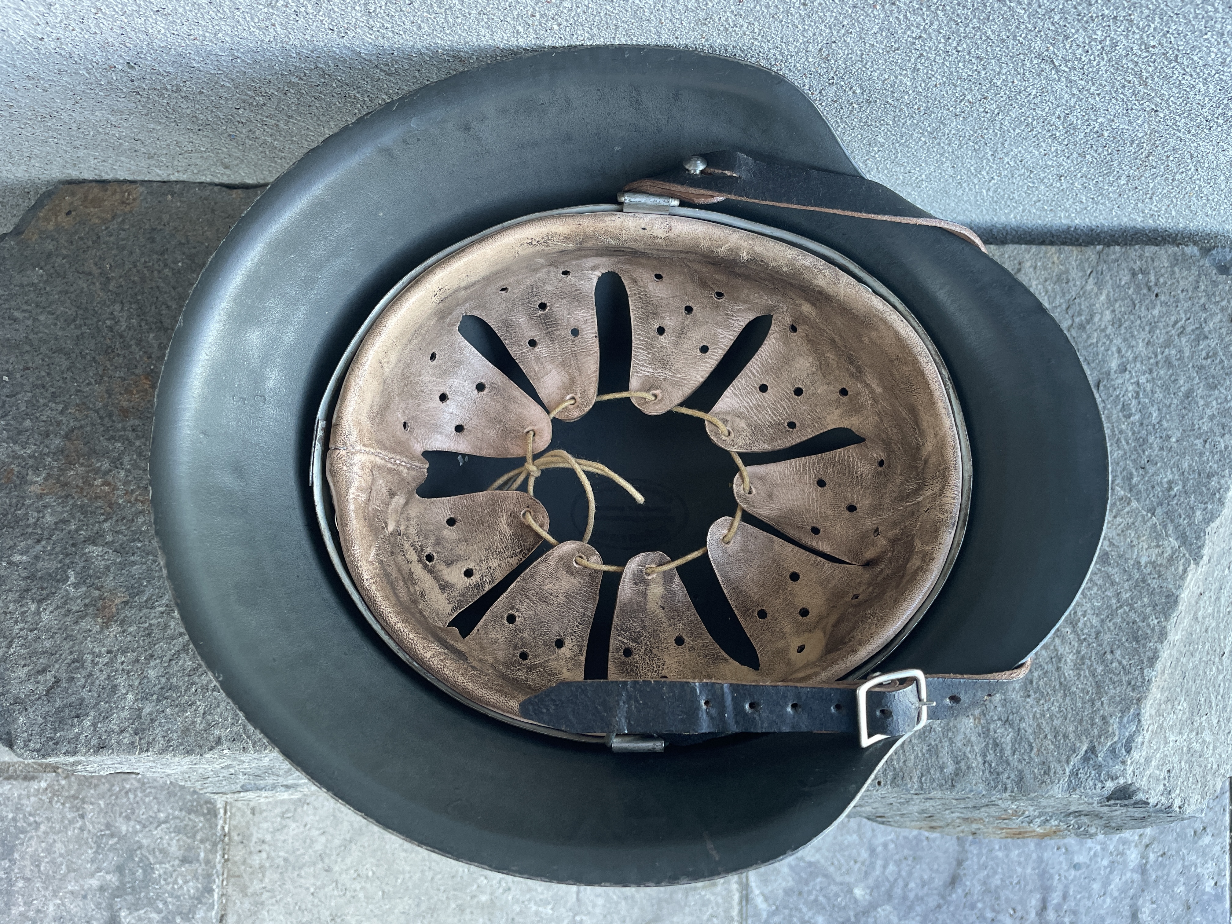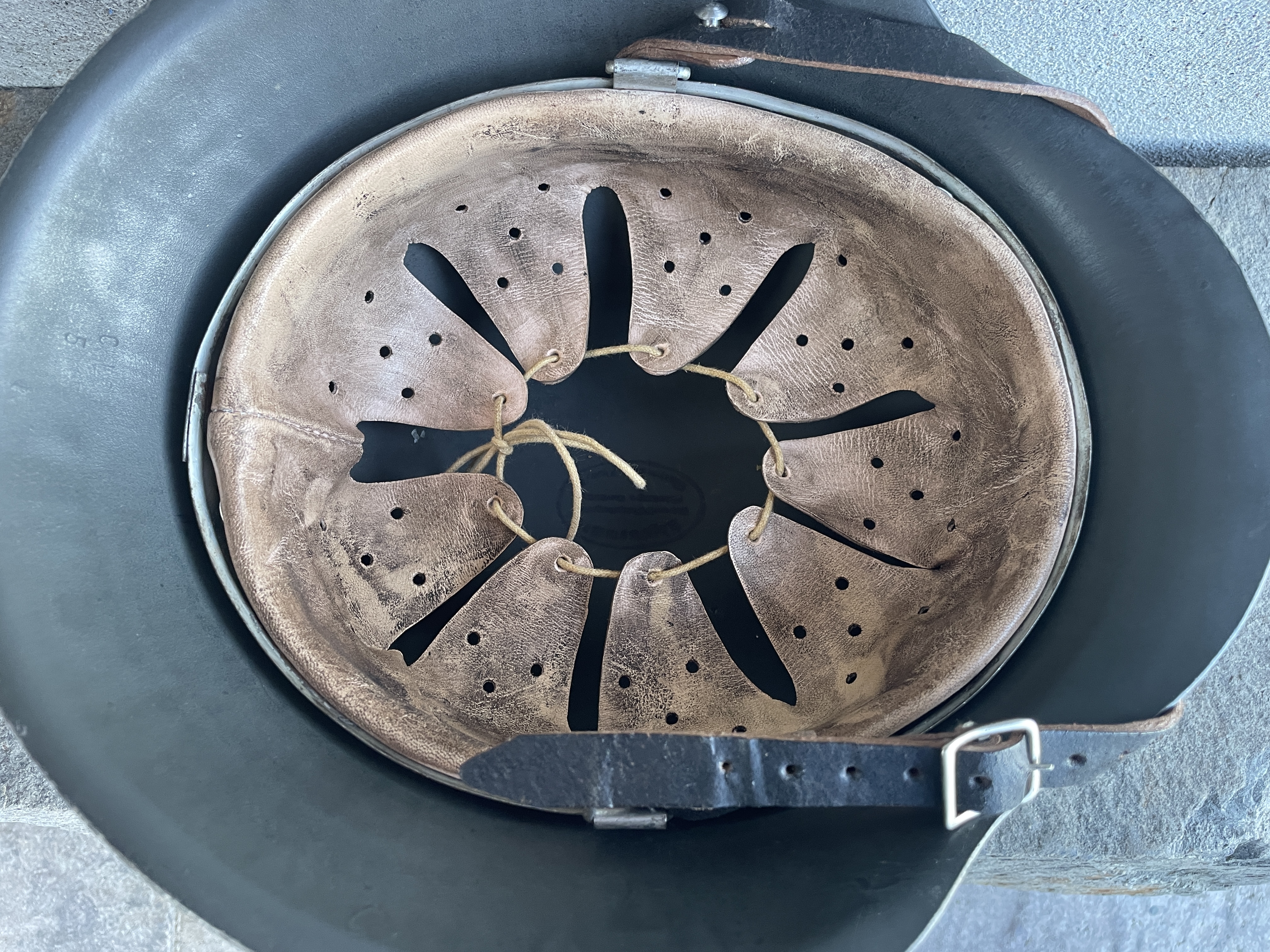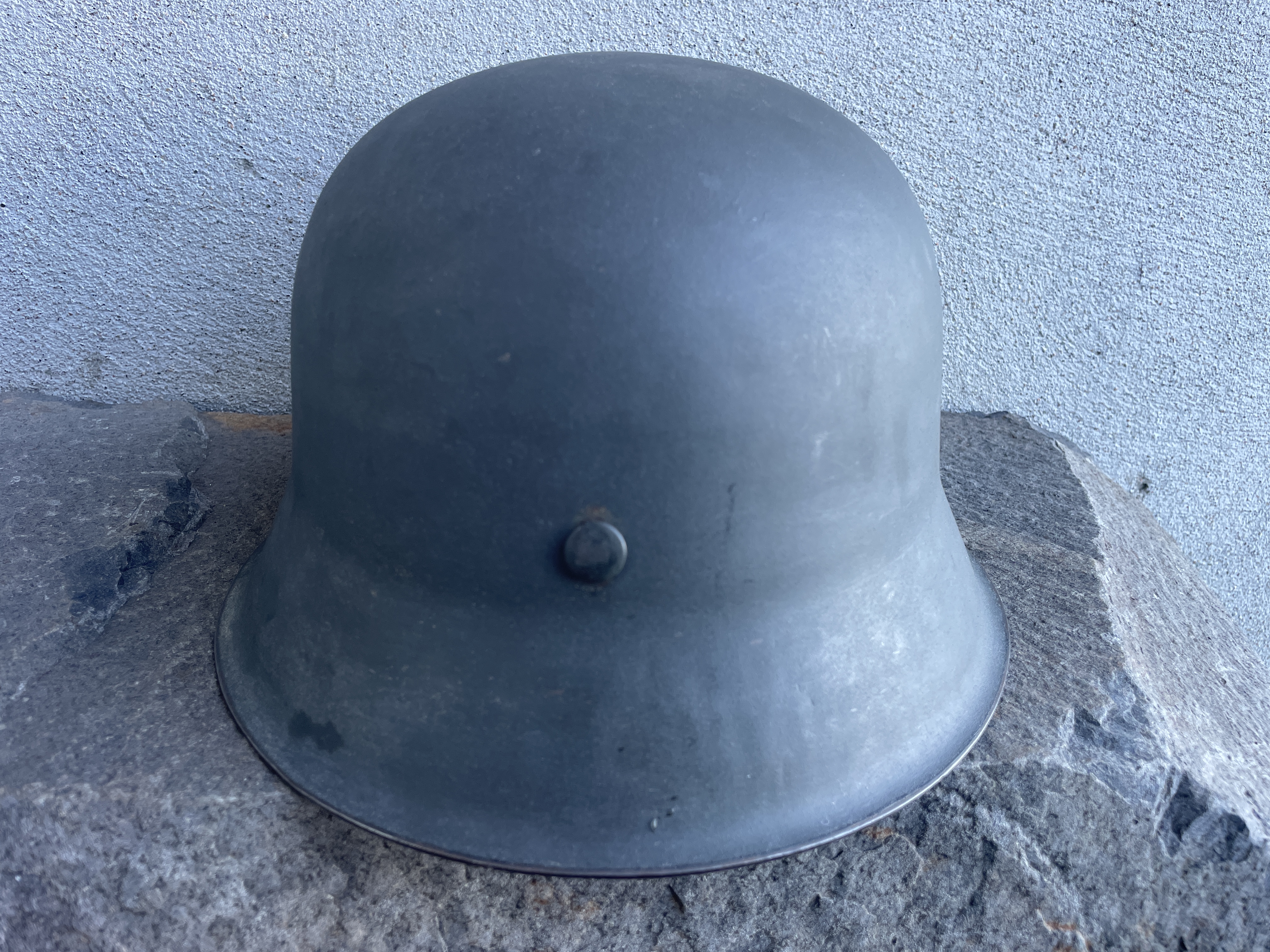 Here is a professionally restored using an ORIGINAL German WW2 produced M42 shell. This is a medium sized M42 helmet produced by Eisenhuttenwerke, Thale, Germany. The rear lot number suggests 1943 factory production. The helmet. was professionally restored with textured feldgrau paint on the outside and a smooth enamel finish on the inside.