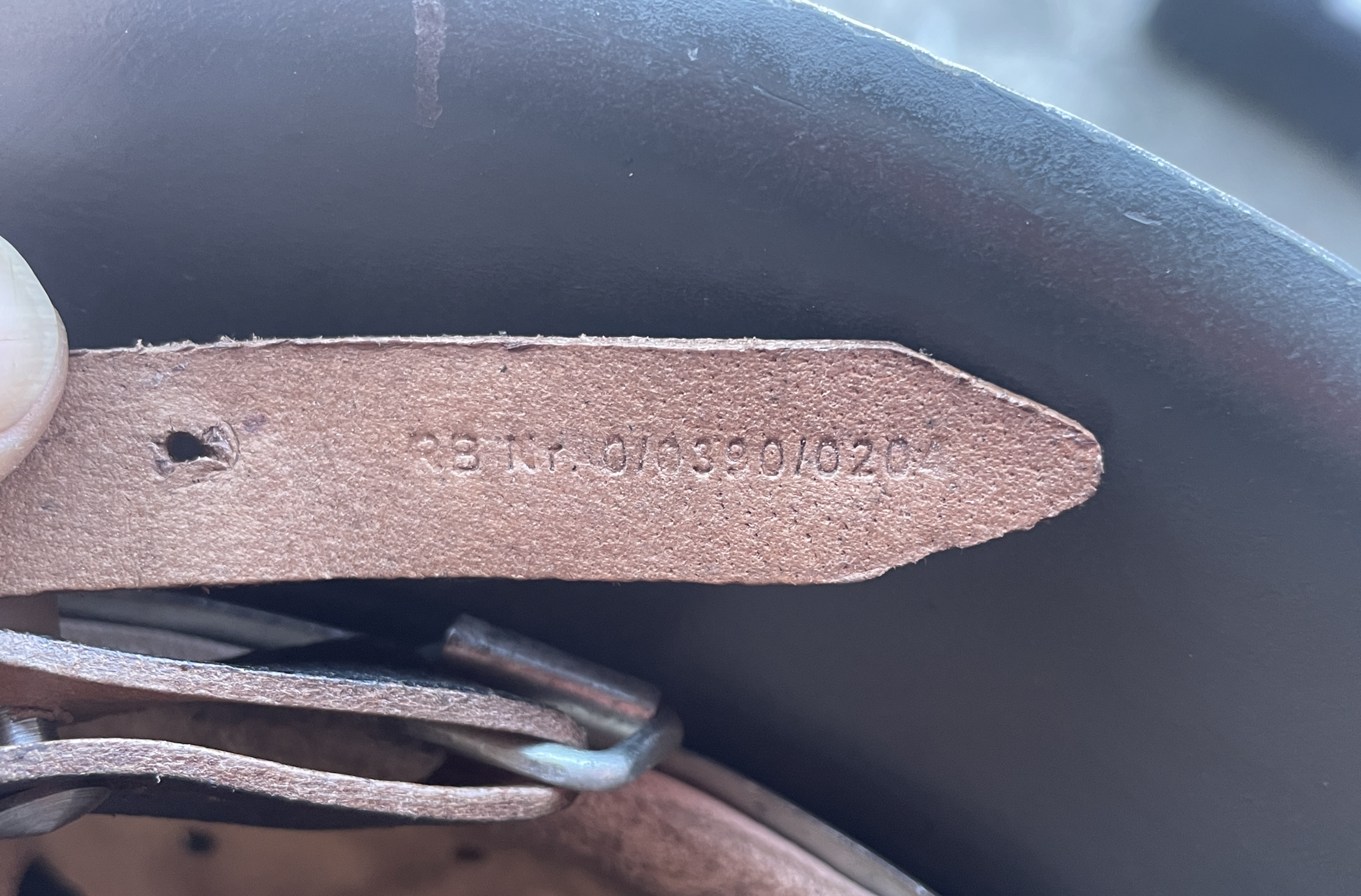(Every original German helmet produced from 1935 to 45 had two factory stampings punched into the side and rear or both in the rear. The alpha numeric number refers to the factory location and the inside metric circumference in centimeters. The rear lot number refers to the production run and was used as a quality control measure. The font styles used at each factory were slightly different but highly consistent throughout the war and so fakes or reproductions will either not have these numbers at all or they will use the wrong font style or letter spacing and so are easily identified as post war made.)