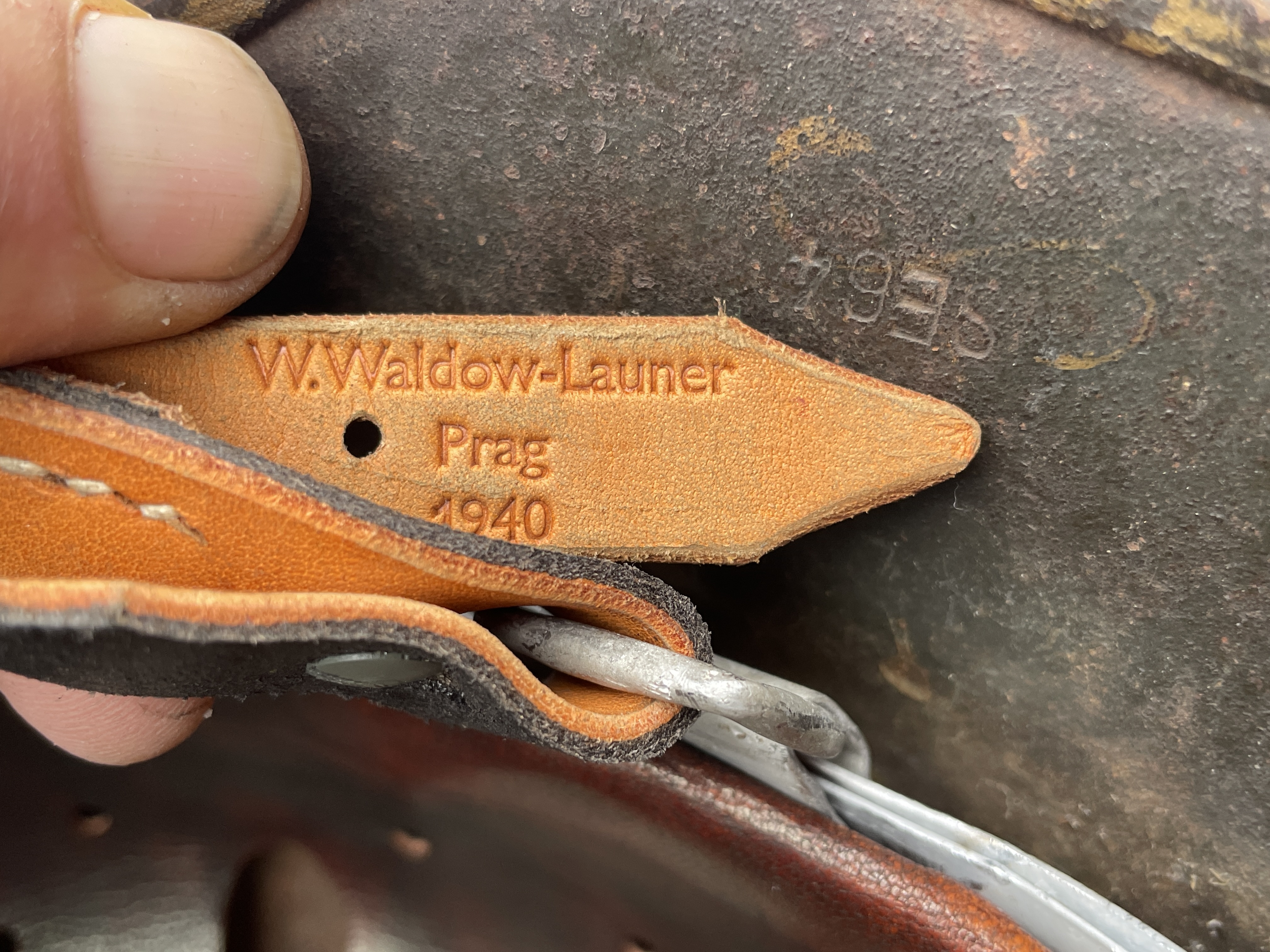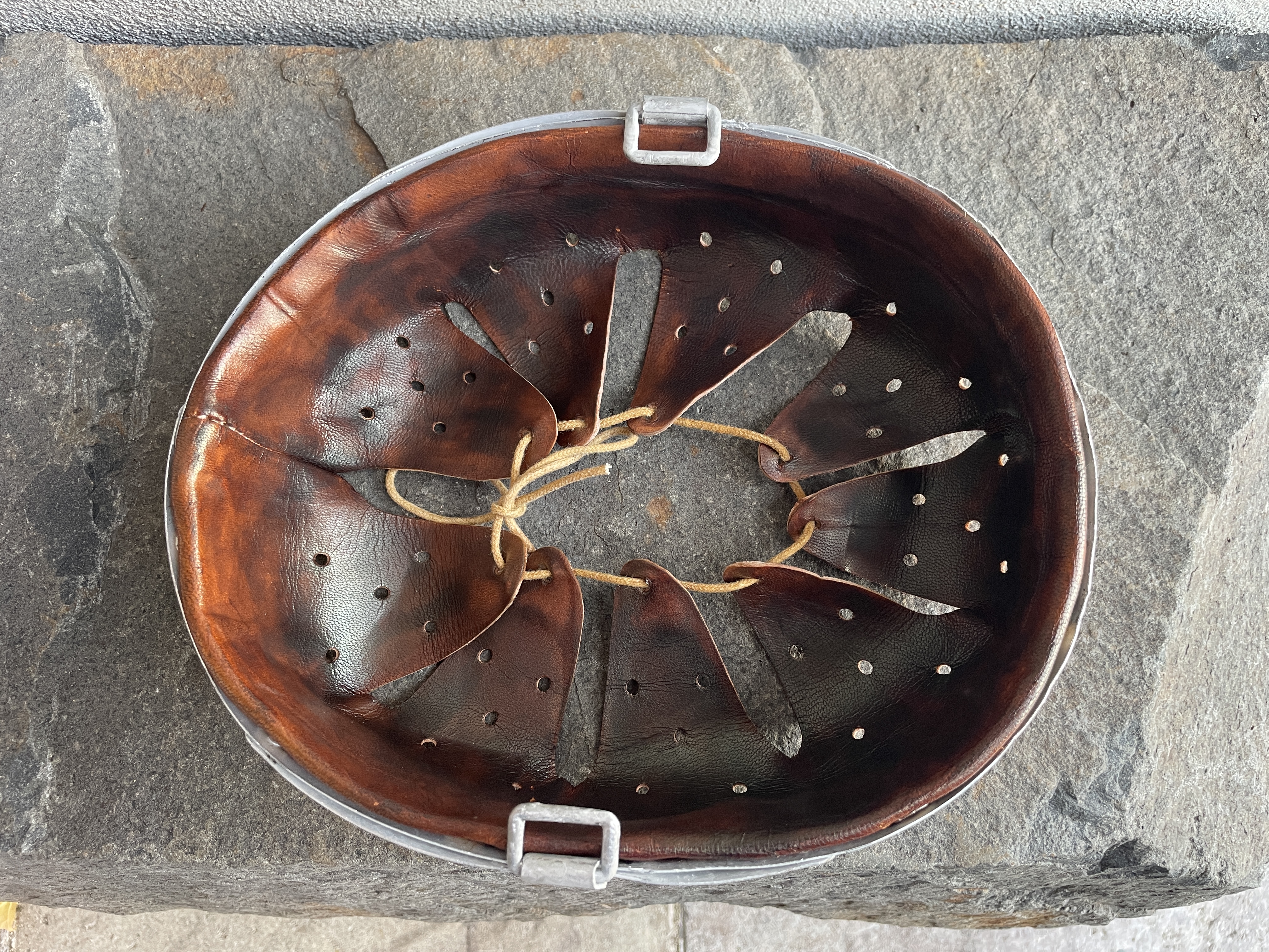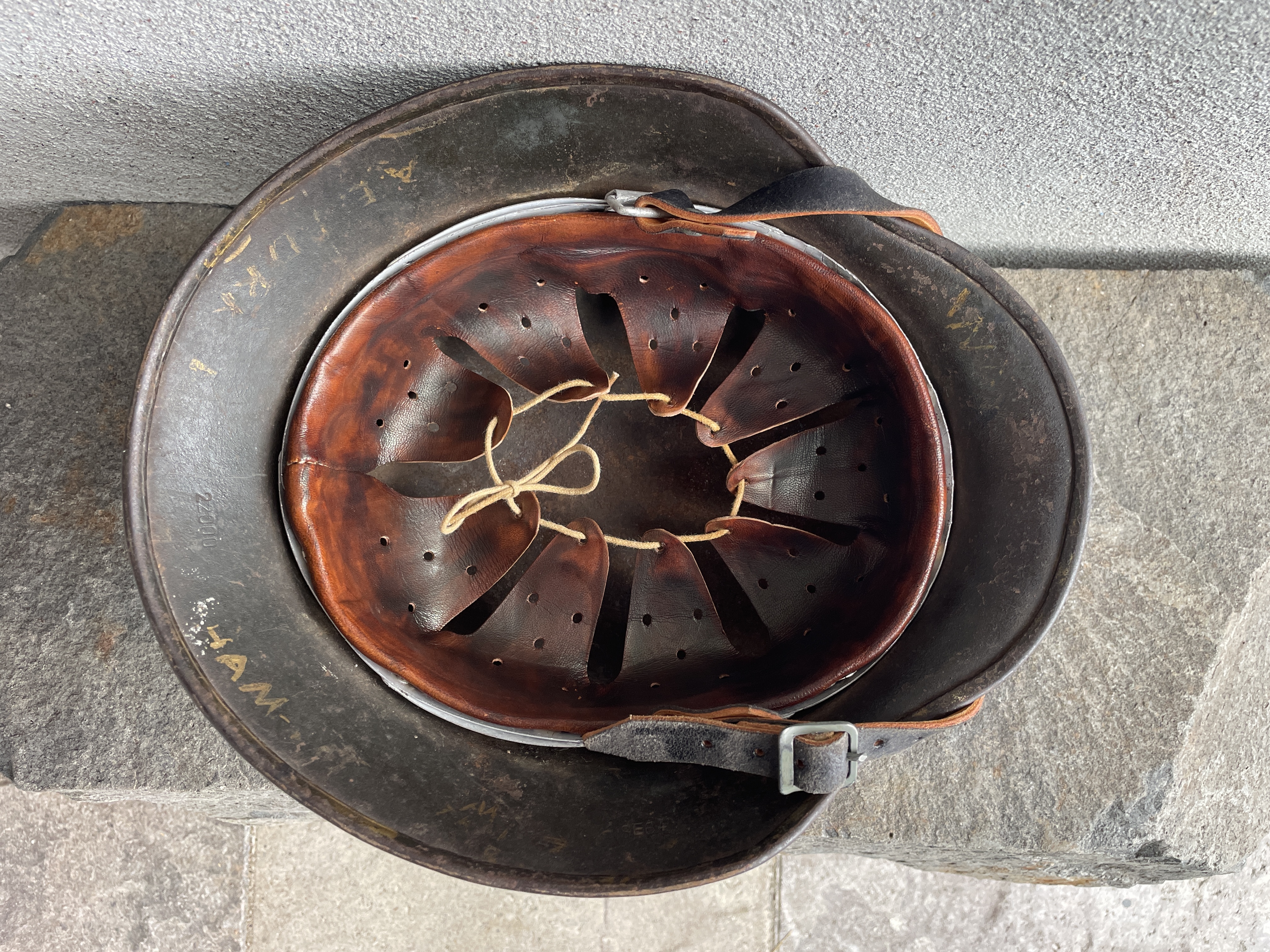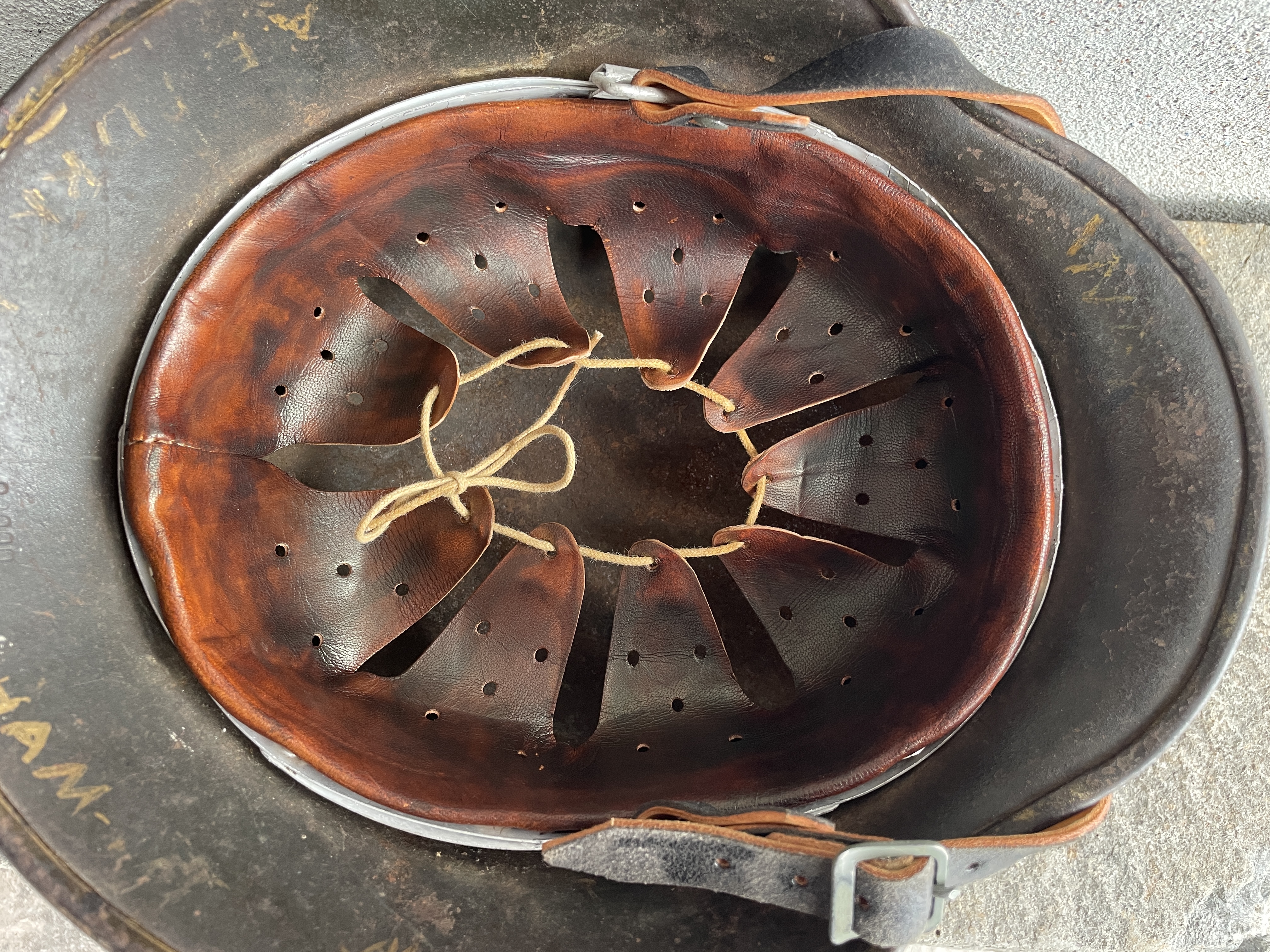 Both the outside and inside paint are 100% from the German factory in 1941 with only the decal and leather section of the liner being replaced. Even the outer aluminum rounded chinstrap bale liner band is original to the helmet and stamped 1941. This original outer liner band was kept with the helmet and a new but aged leather system was added in order to complete the piece. There are a few small pea sized shallow dents at the back of the helmet but nothing that distracts from this being a one time looker. The chinstrap is a high level modern reproduction and lightly aged to compliment the helmet.