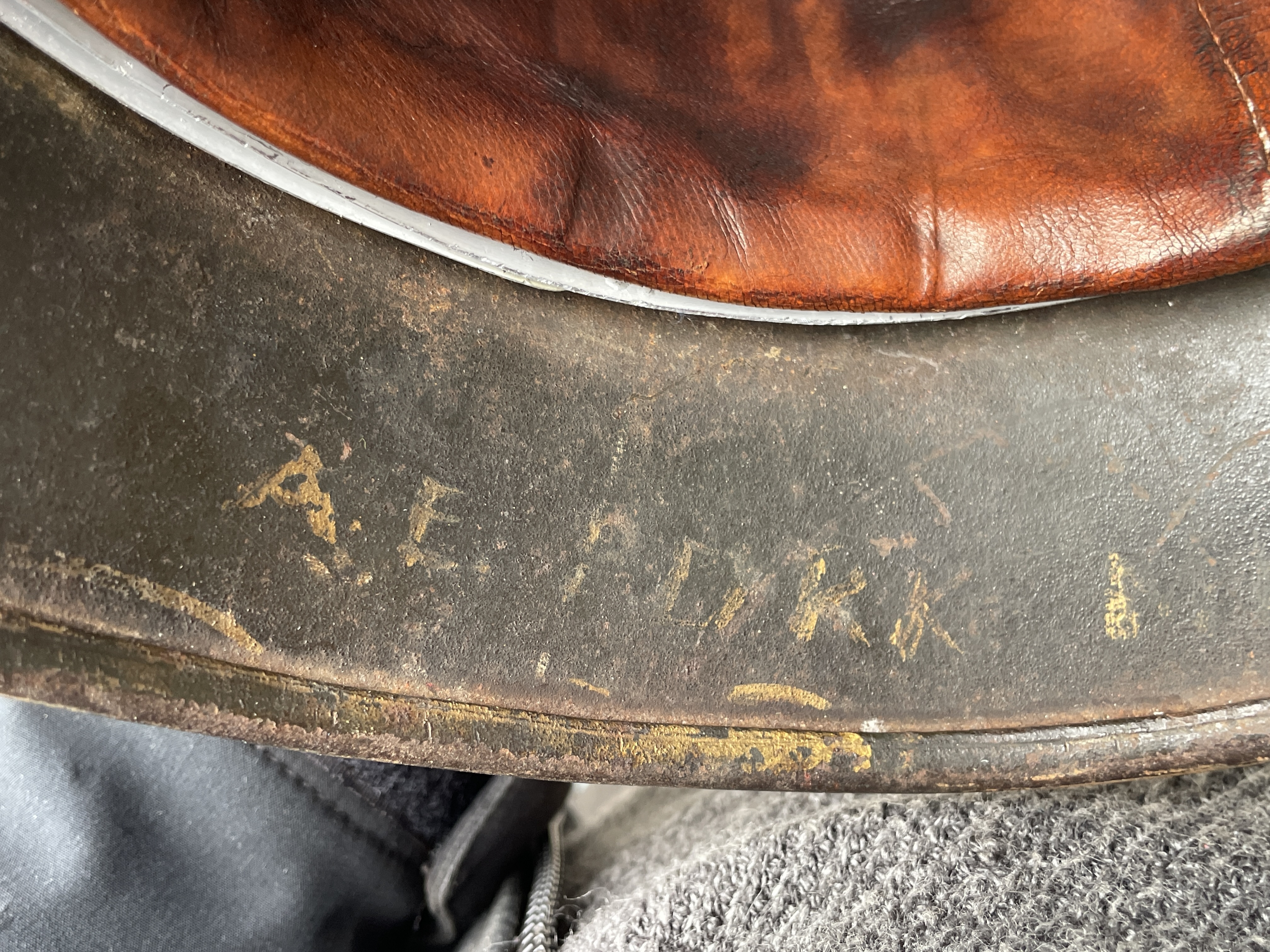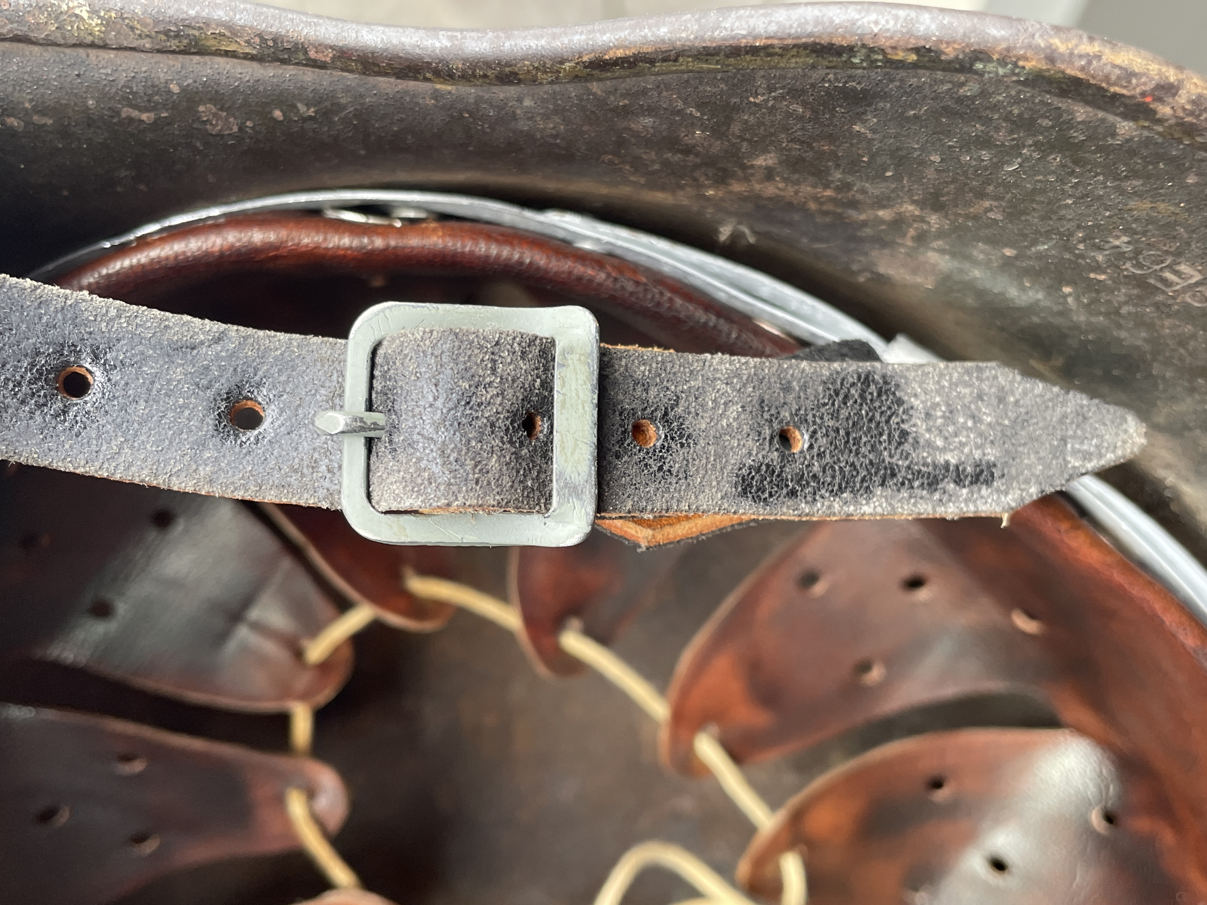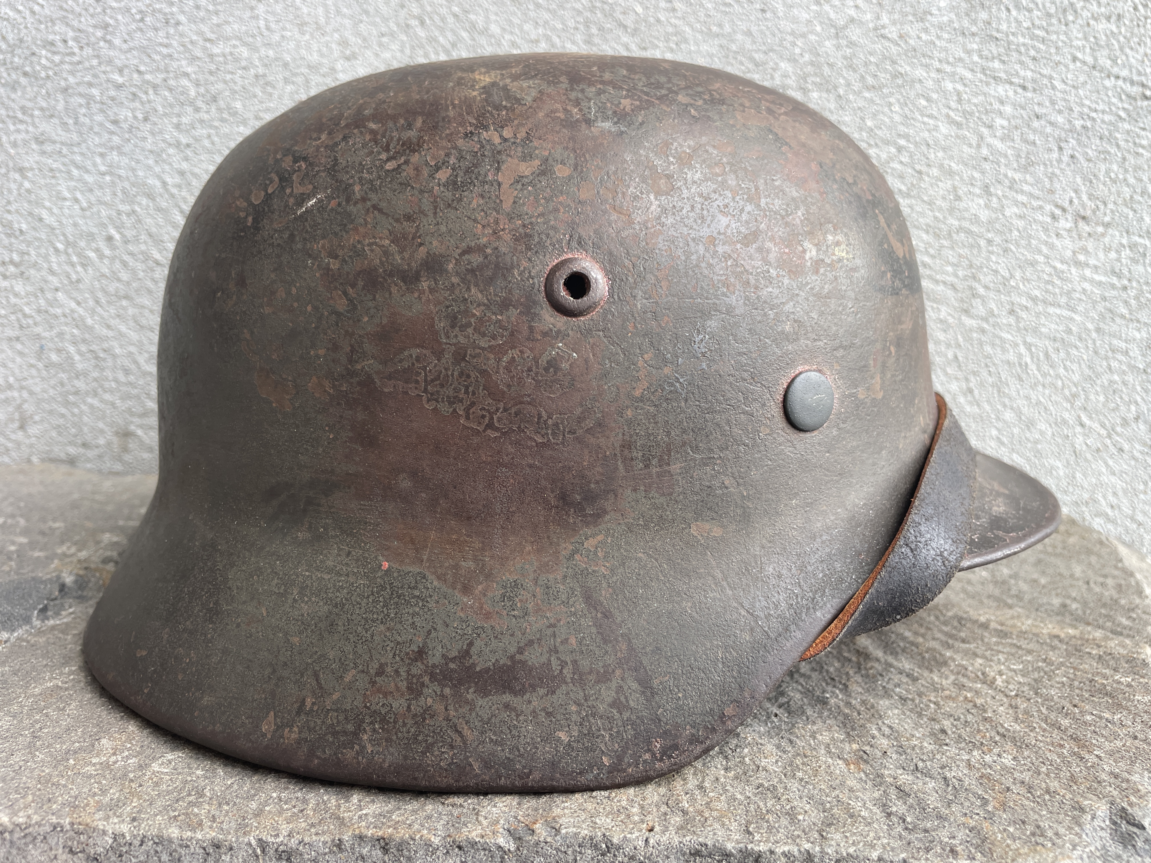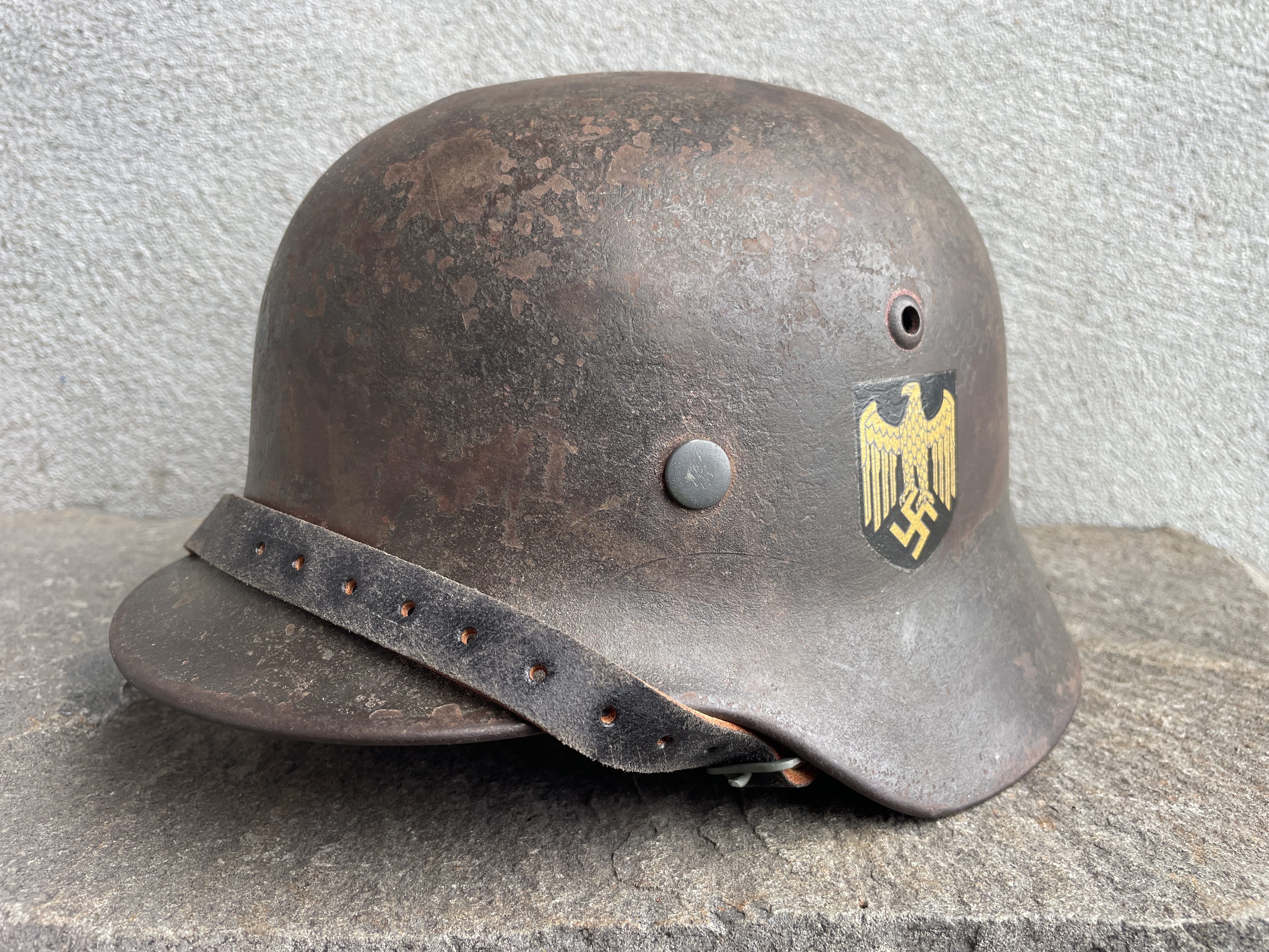 In this particular example I only replaced the decal which was missing with a high quality golden metallic version indicative of an ET factory style eagle. The helmet also had it's original 1941 dated rare aluminum round chinstrap bale outer liner band which was fitted with a newly aged leather component to complete the piece. A high quality matching chinstrap was also added and is post war made. So yeah it's a bit of a Frankenstein but still a pretty cool looking helmet that actually was in the war and did look almost exactly like this since the paint is all original. Ode to history.