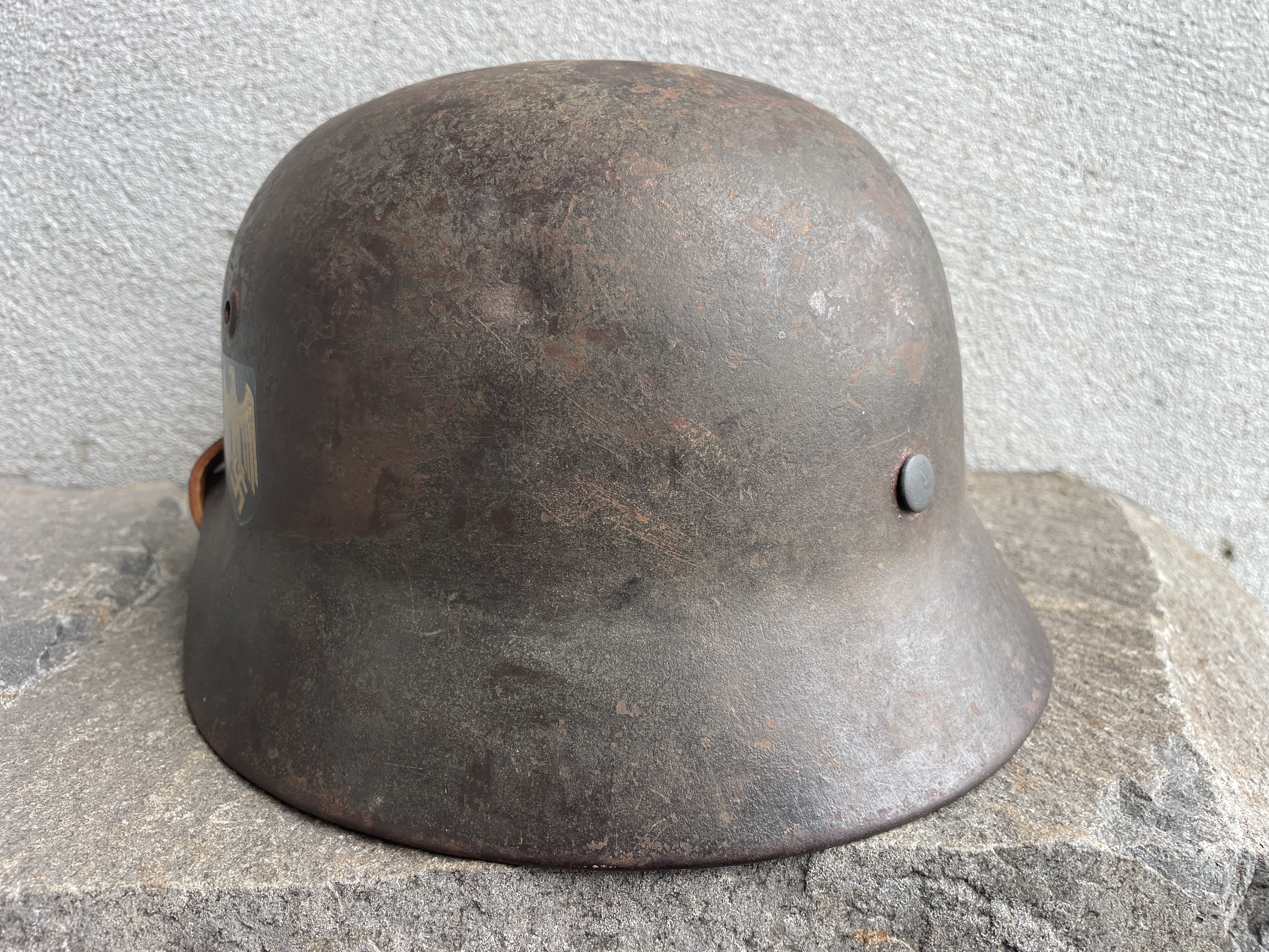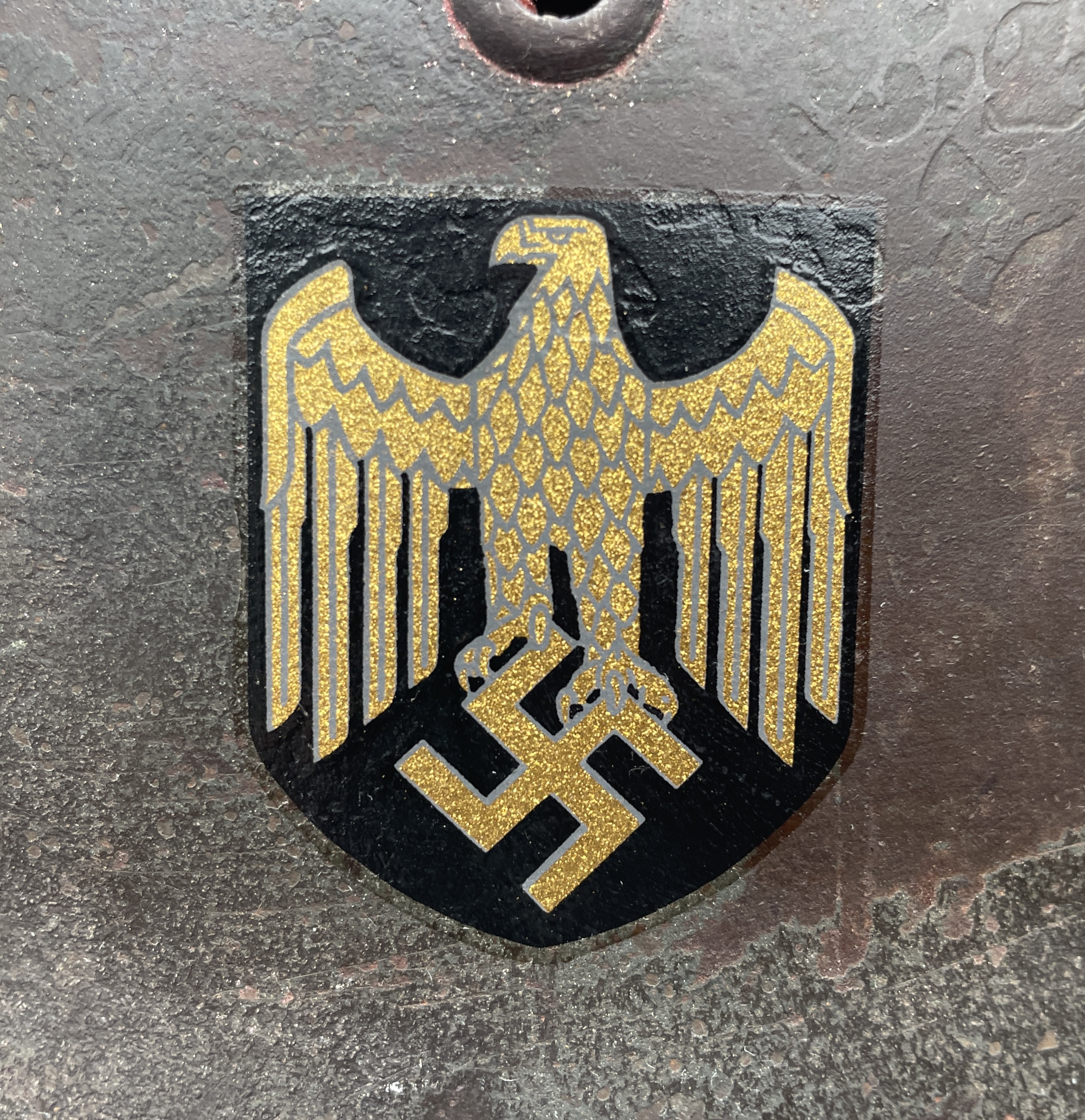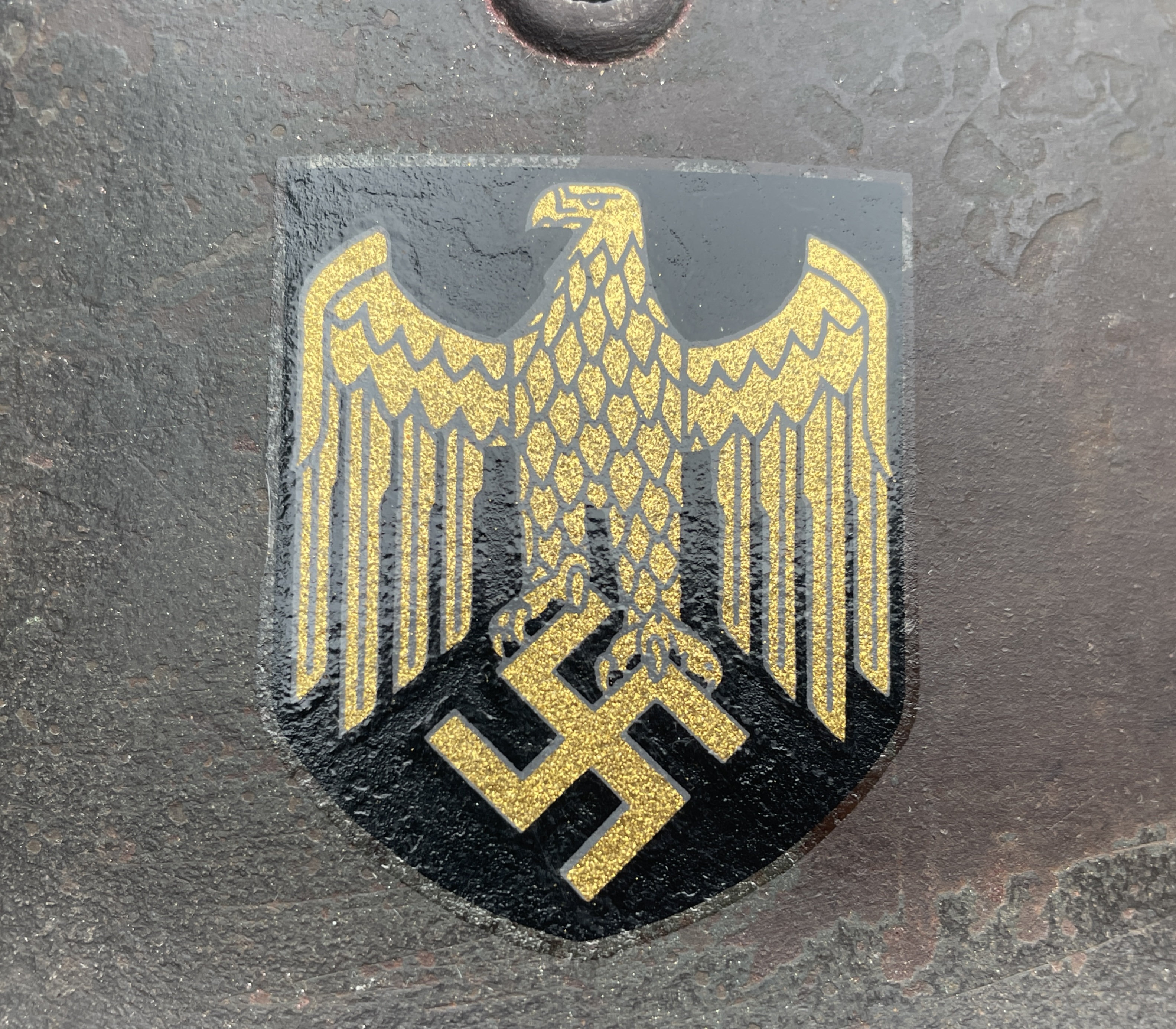 The inside paint is smooth enamel with a textured outside finish in textbook German flat feld grau (field gray) and all original. The eagle is your textbook Kriegsmarine ET factory applied version with the same 3D effect whereby the eagle shape is protruding outwards against the flat black shield background. The ink used to create the decal is golden and metallic and so as close to an original as possible. I can age the decal further if one so chooses free of charge.