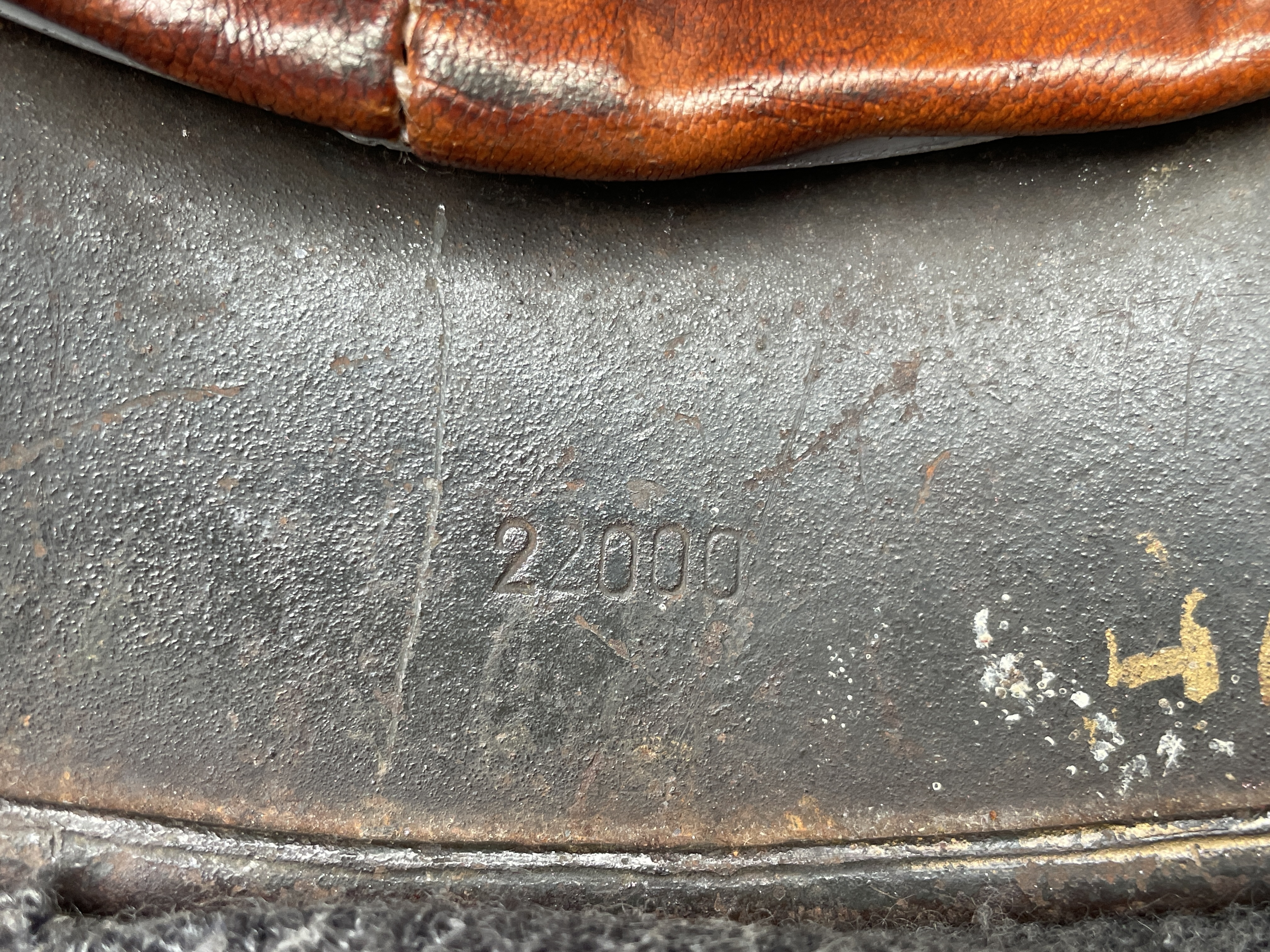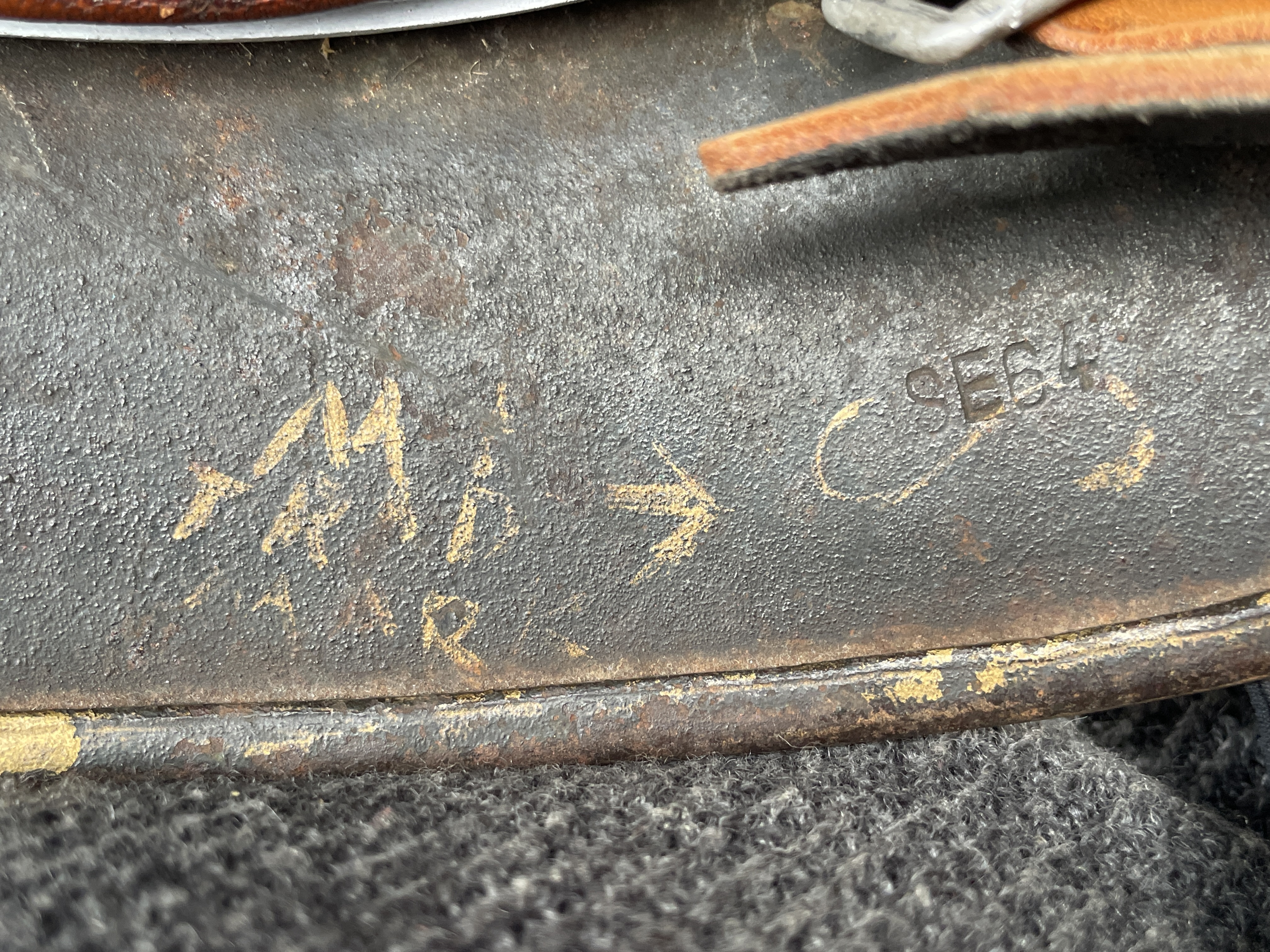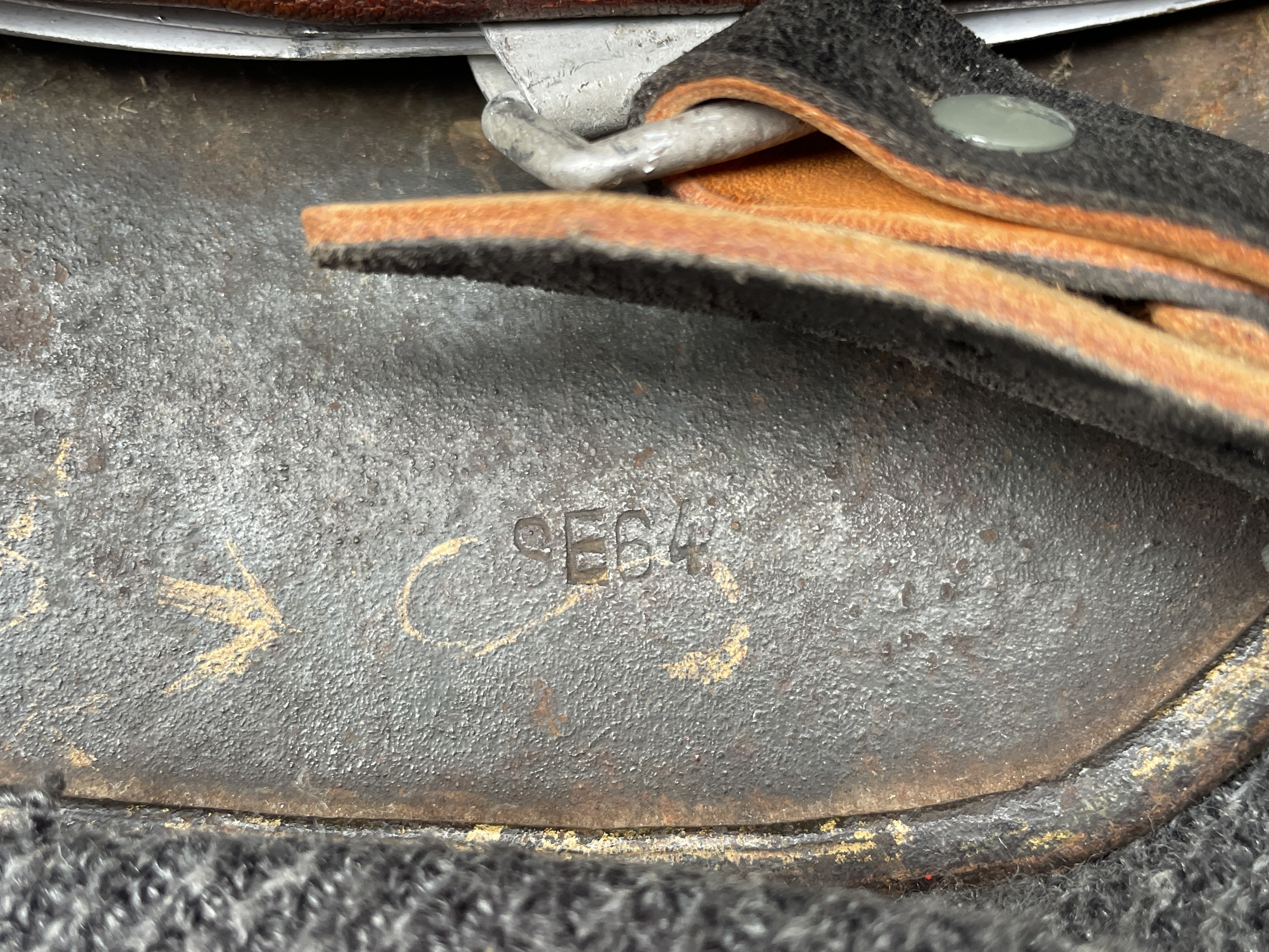 (Every original German helmet produced from 1935 to 45 had two factory stampings punched into the side and rear or both in the rear. The alpha numeric number refers to the factory location and the inside metric circumference in centimeters. The rear lot number refers to the production run and was used as a quality control measure. The font styles used at each factory were slightly different but highly consistent throughout the war and so fakes or reproductions will either not have these numbers at all or they will use the wrong font style or letter spacing and so are easily identified as post war made.)