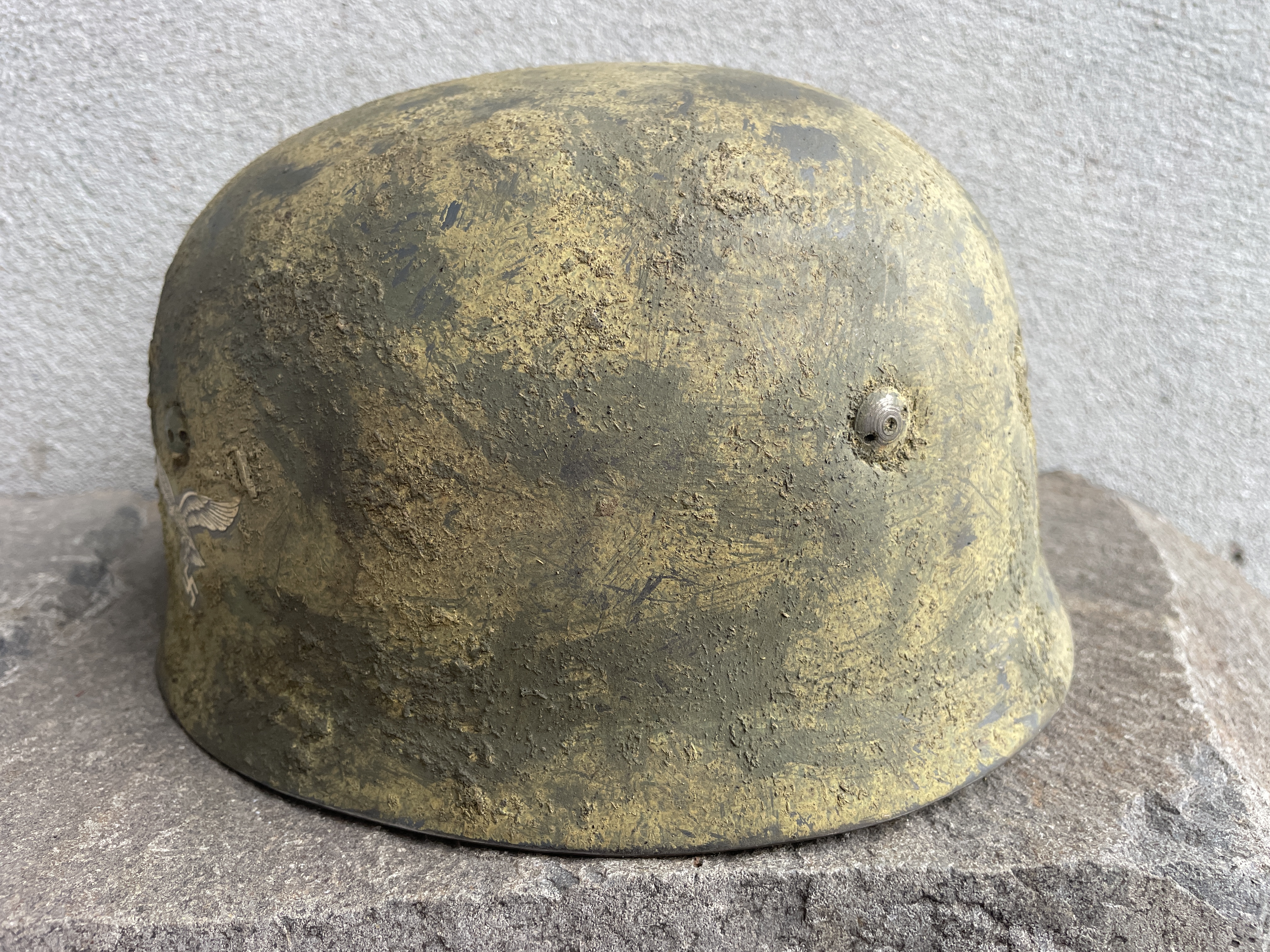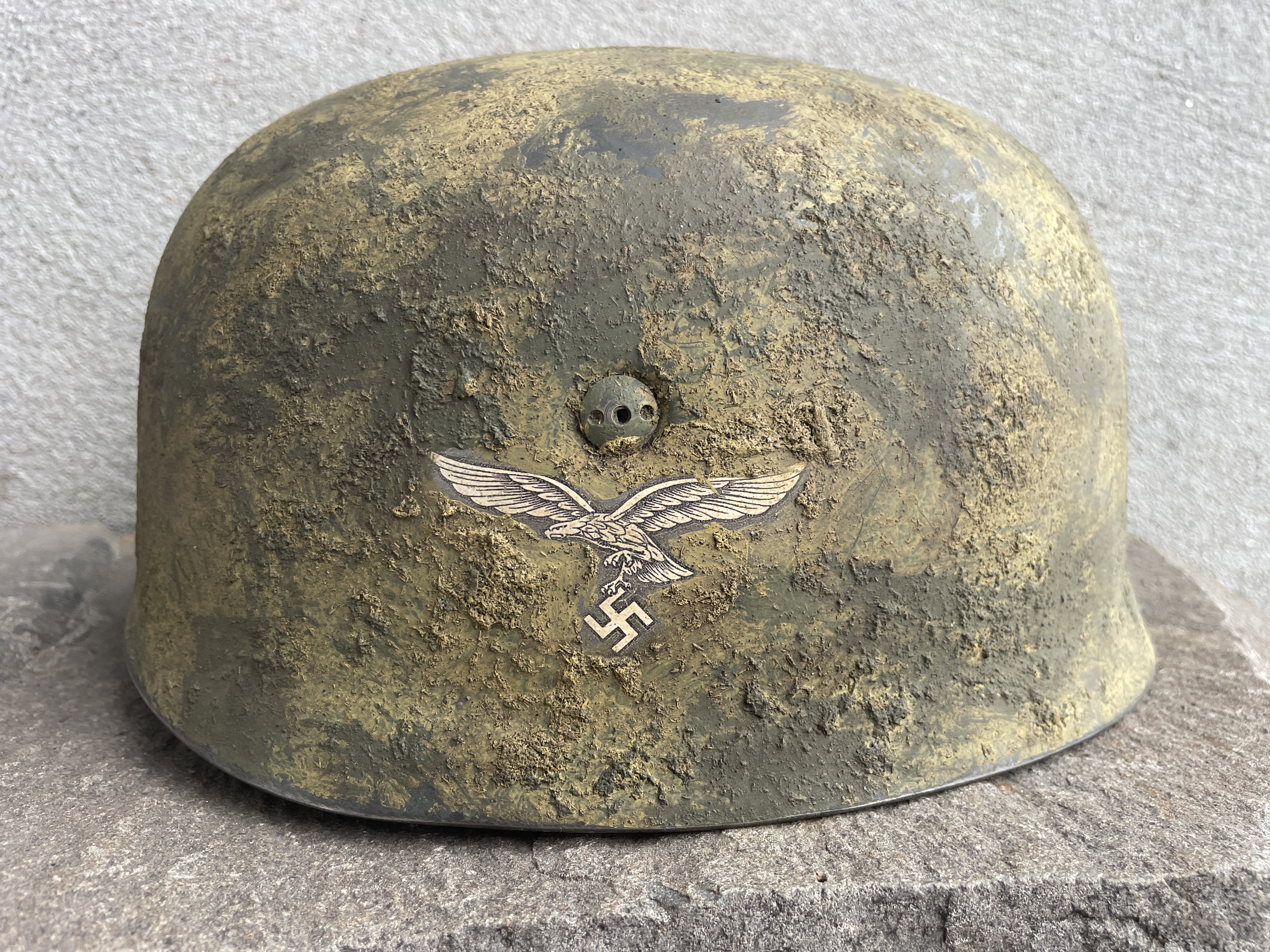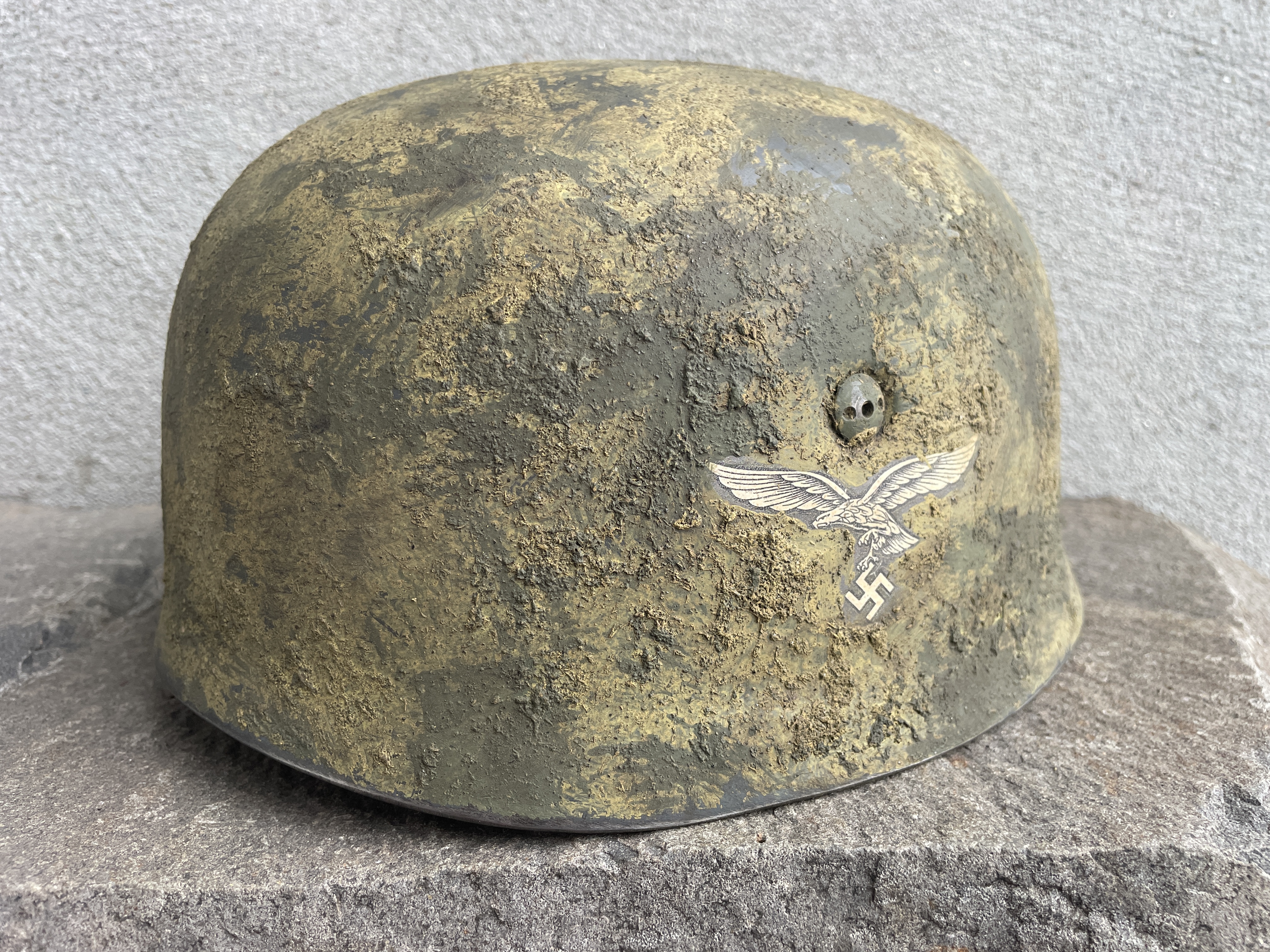 The camo pattern was inspired from known originals I have studied online and in books featuring a classic FJ6 Spring camo pattern with a deep yellow tan base layer followed by pneumatic blasts of light green paint accents. The paint was embedded with actual sawdust from pine logs I cut in the fall and mix directly into the paint just like the Germans did. I spent several weeks aging the helmet to give it that battle hardened look and am quite pleased with the overall results achieved. The inside liner was specifically created by a master leather maker out of Castelfranco, Italy who started making German WW2 paratrooper helmets about 10 years ago and only makes that particular model of liner in addition to his handbag line. The leather is goatskin just like the originals with historically accurate size and manufacturer ink stampings on the inside. The stitching is aged and in the correct end over end stitch method and not zigzag pattern like you see with cheap Asian imports. Basically a museum quality replica that was repainted and aged many decades ago in a beautiful Normandy camouflage pattern. Plus it is a wonderfully large size CKL71 with rear lot number 3982 and so large enough to fit most heads of today. The rear lot number 3982 matches up to known originals as a mid war single decal Luftwaffe helmet based on the lot data book by Brian Ice. So everything checks out for that uber detailed oriented German helmet collector.