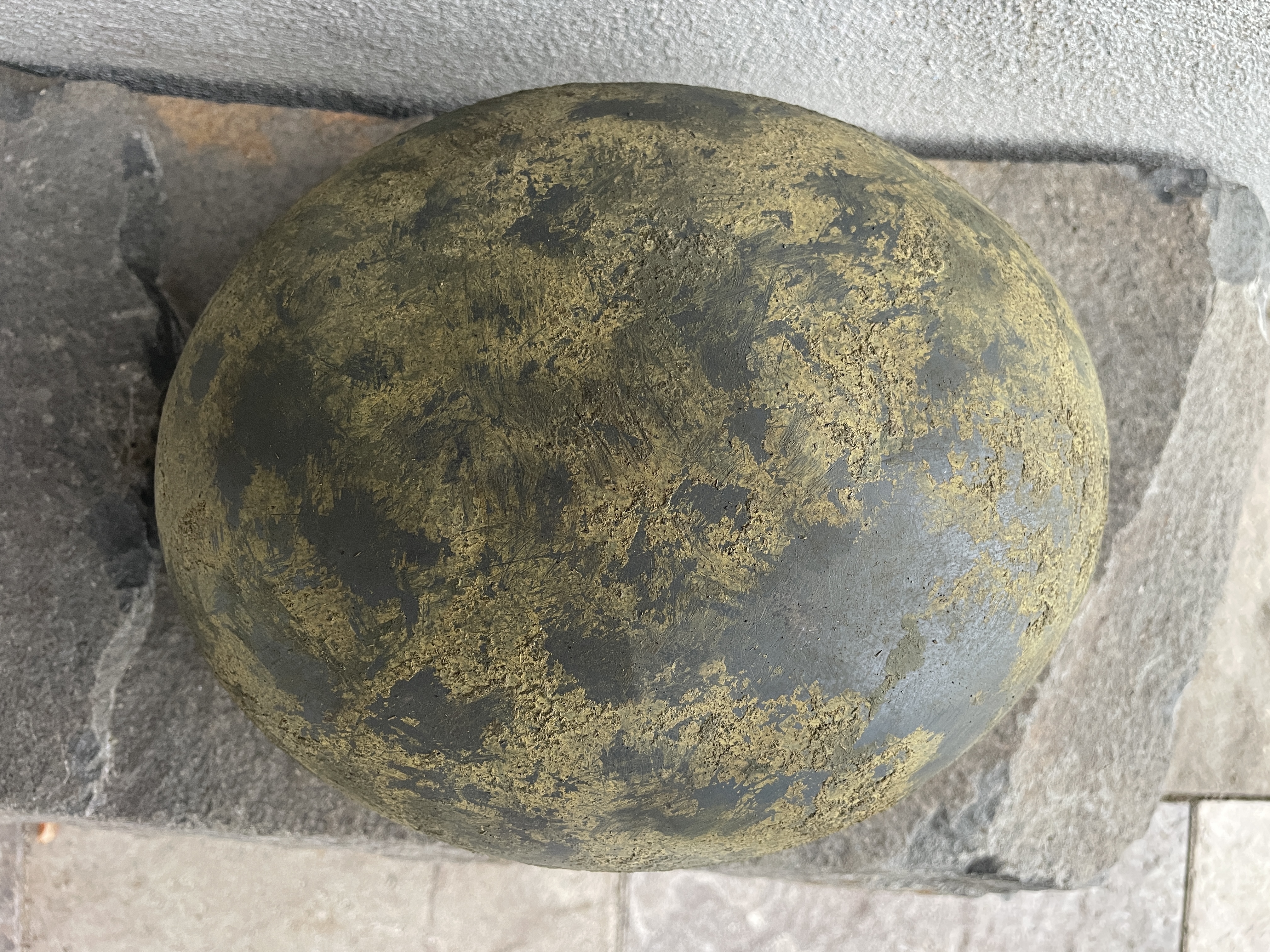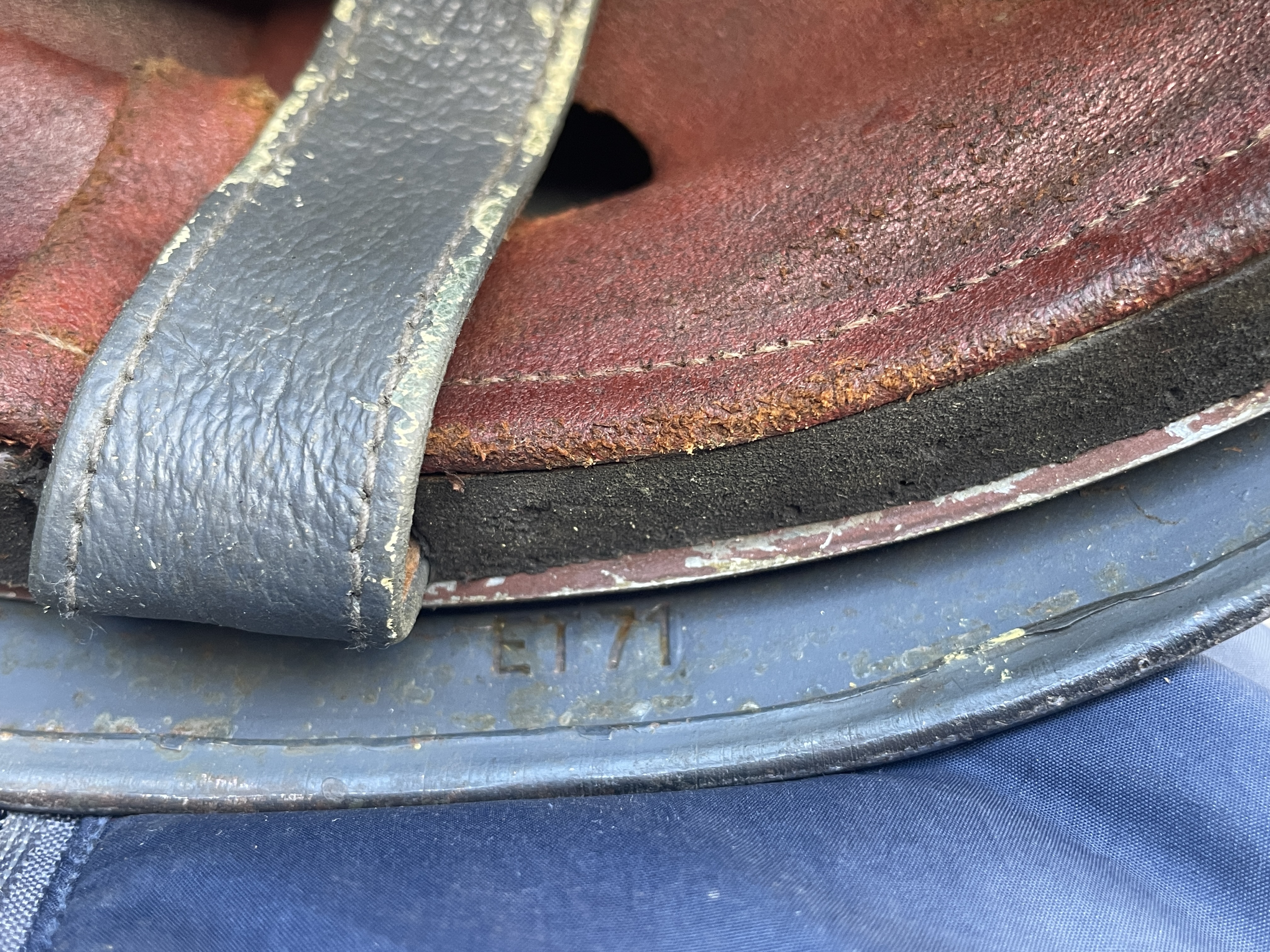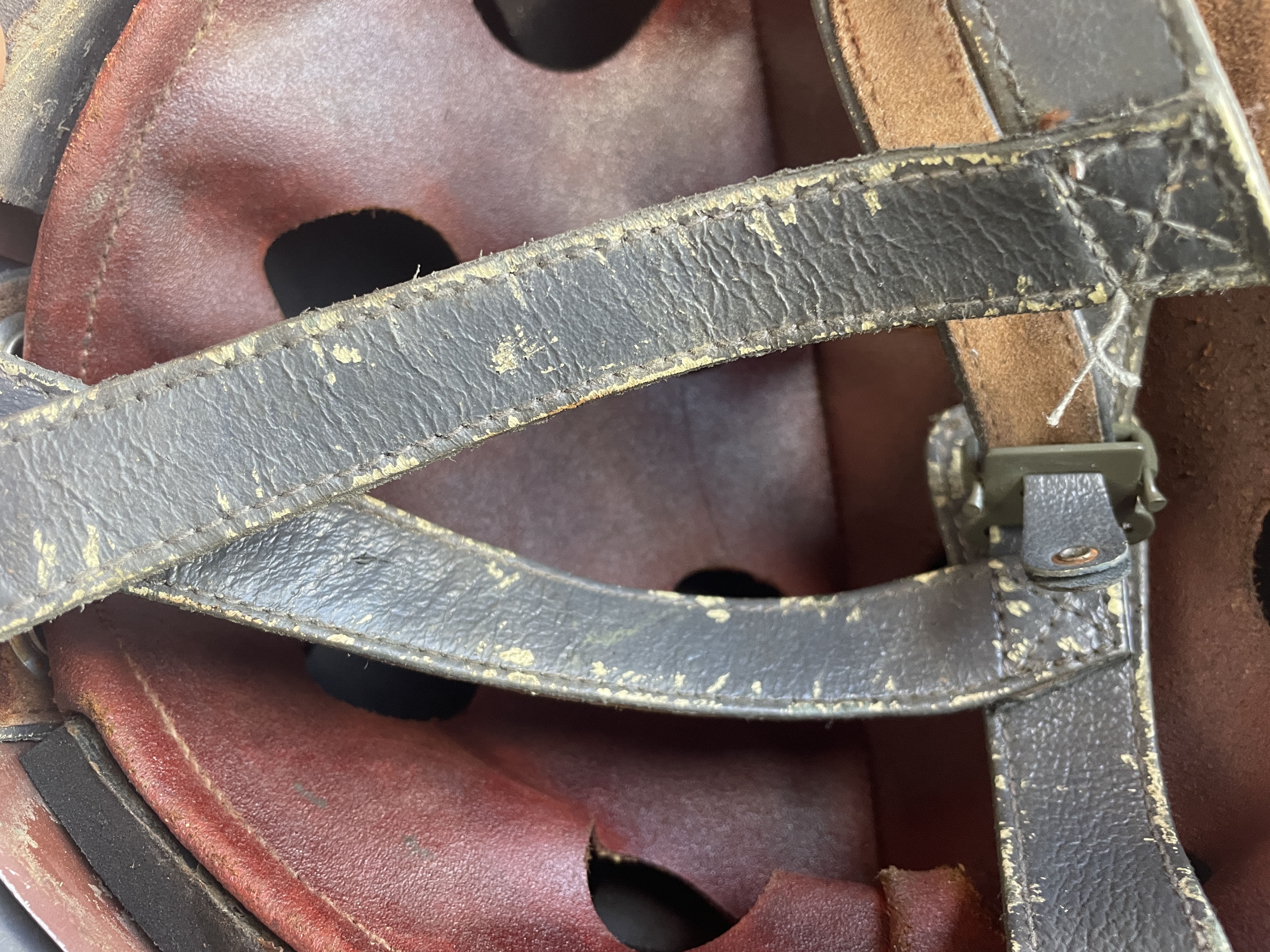 The camo pattern was inspired from known originals I have studied online and in books featuring a classic FJ6 Spring camo pattern with a deep yellow tan base layer followed by pneumatic blasts of light green paint accents. The paint was embedded with actual sawdust from pine logs I cut in the fall and mix directly into the paint just like the Germans did. I spent several weeks aging the helmet to give it that battle hardened look and am quite pleased with the overall results achieved. The inside liner was specifically created by a master leather maker out of Castelfranco, Italy who started making German WW2 paratrooper helmets about 10 years ago and only makes that particular model of liner in addition to his handbag line. The leather is goatskin just like the originals with historically accurate size and manufacturer ink stampings on the inside. The stitching is aged and in the correct end over end stitch method and not zigzag pattern like you see with cheap Asian imports. Basically a museum quality replica that was repainted and aged many decades ago in a beautiful Normandy camouflage pattern. Plus it is a wonderfully large size CKL71 with rear lot number 3982 and so large enough to fit most heads of today. The rear lot number 3982 matches up to known originals as a mid war single decal Luftwaffe helmet based on the lot data book by Brian Ice. So everything checks out for that uber detailed oriented German helmet collector.