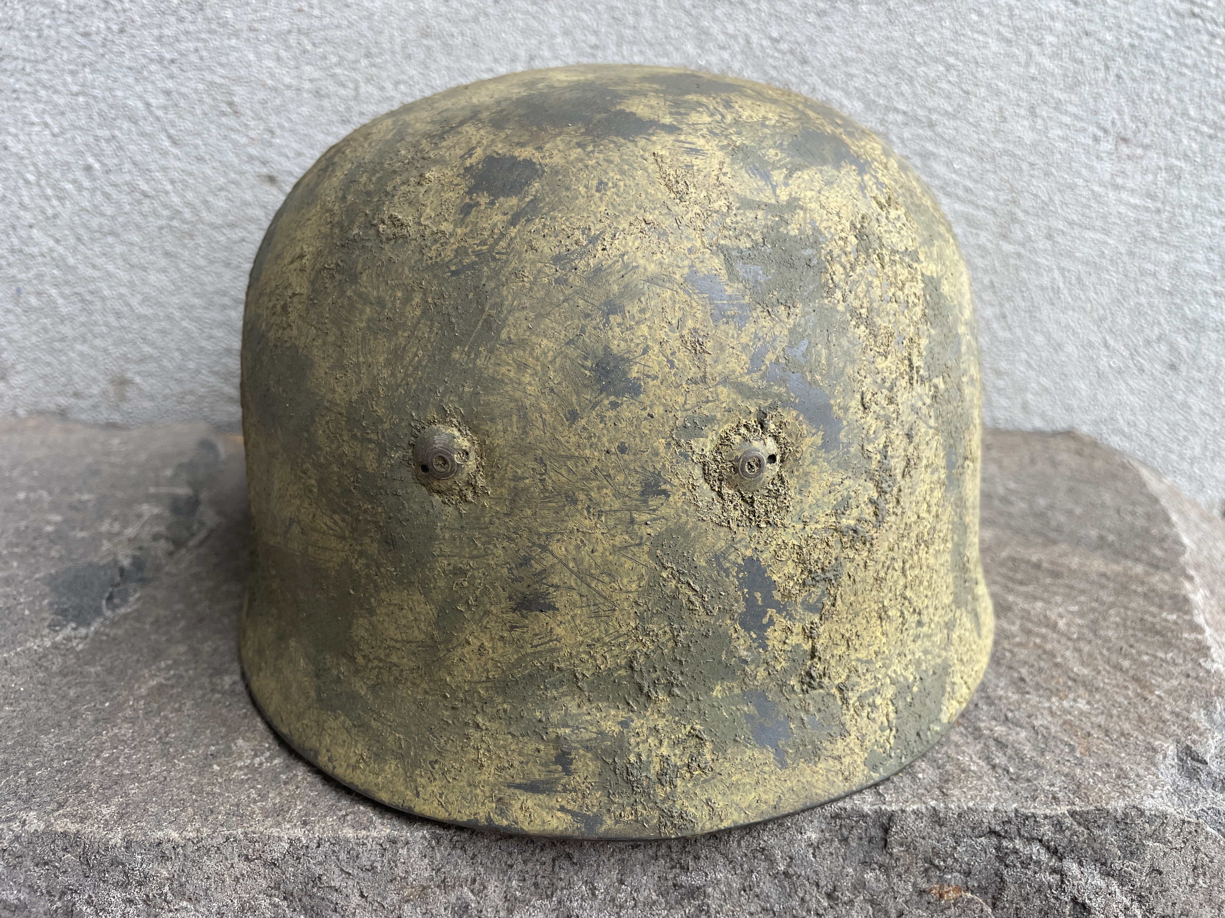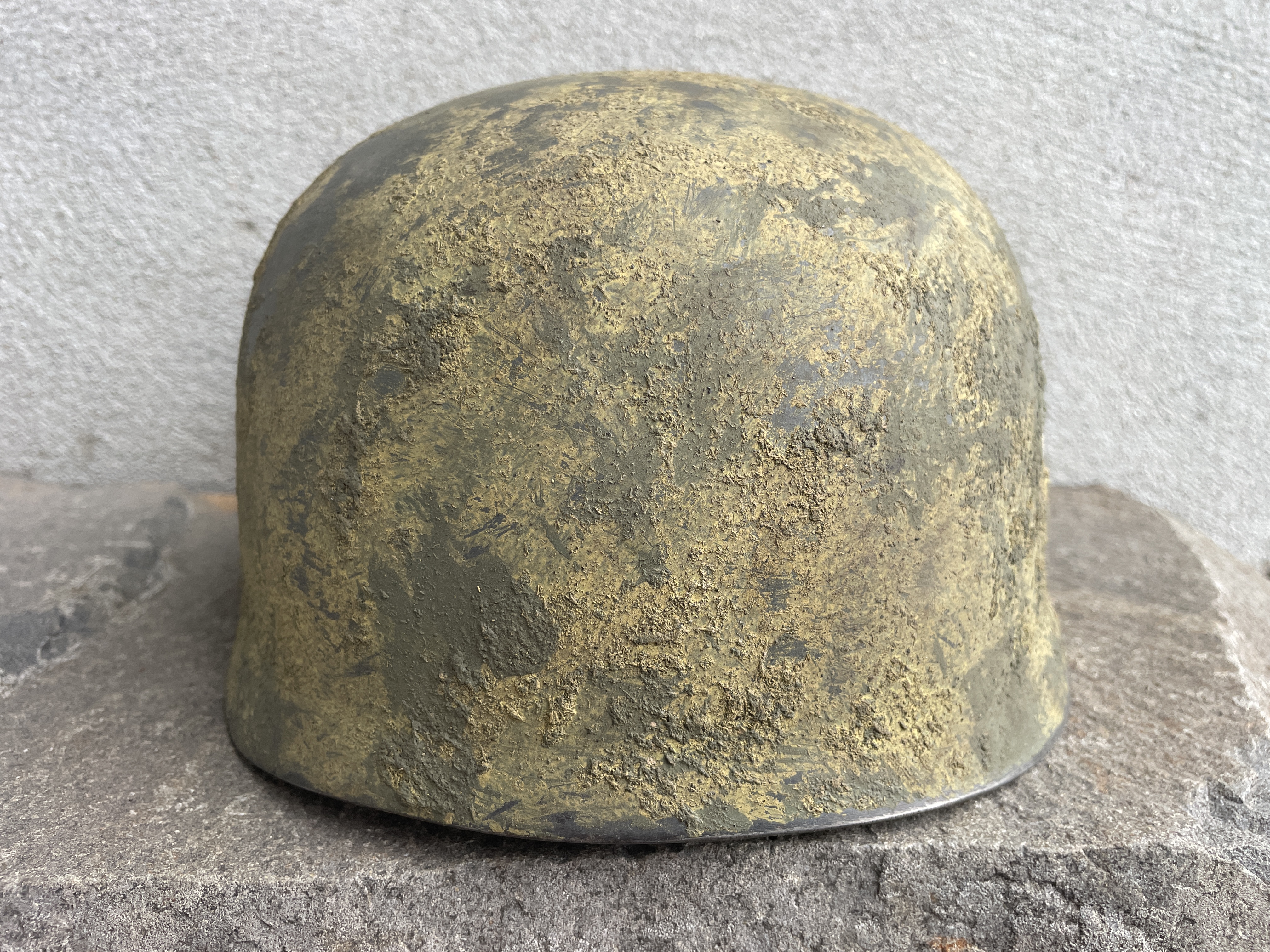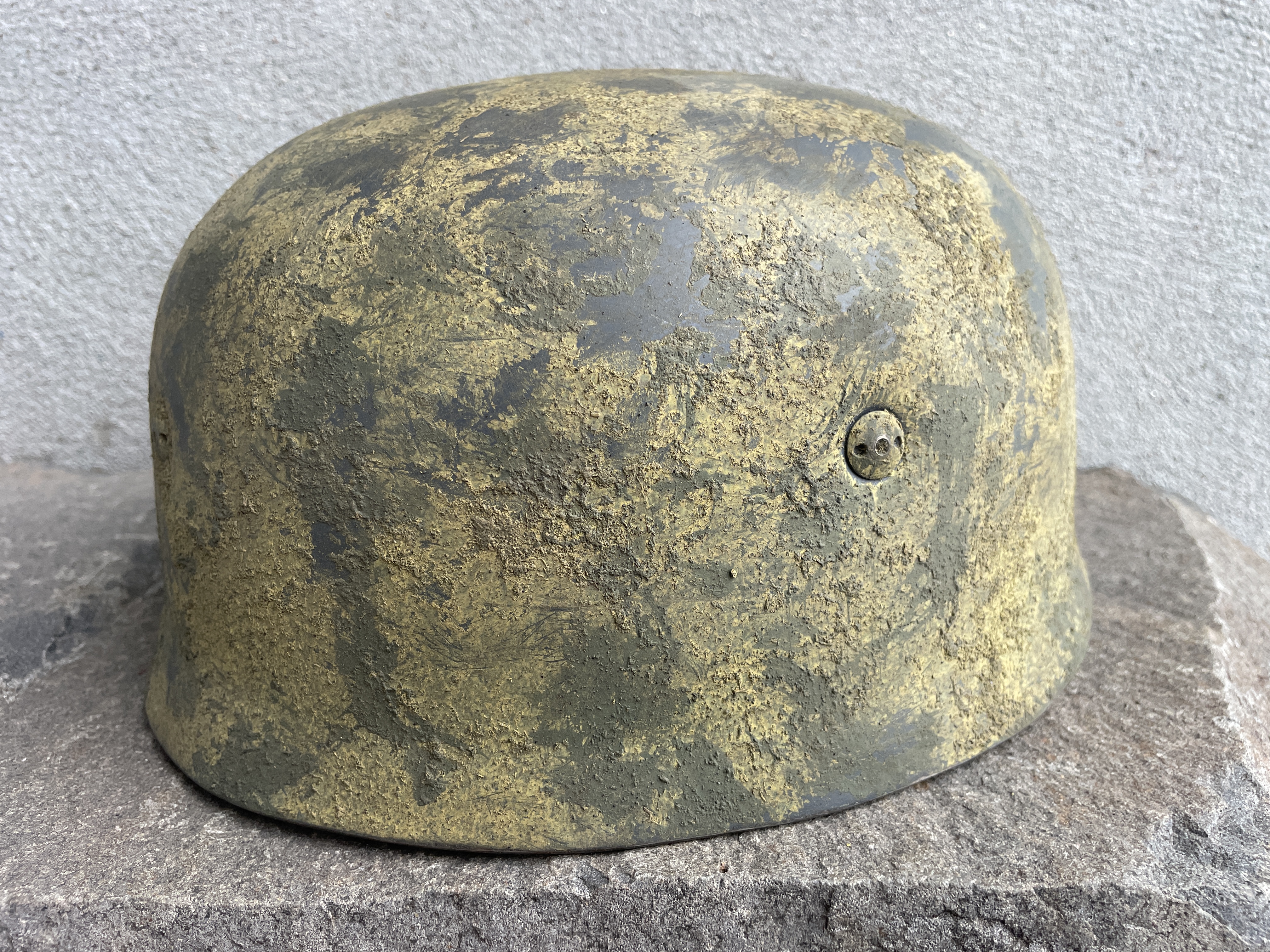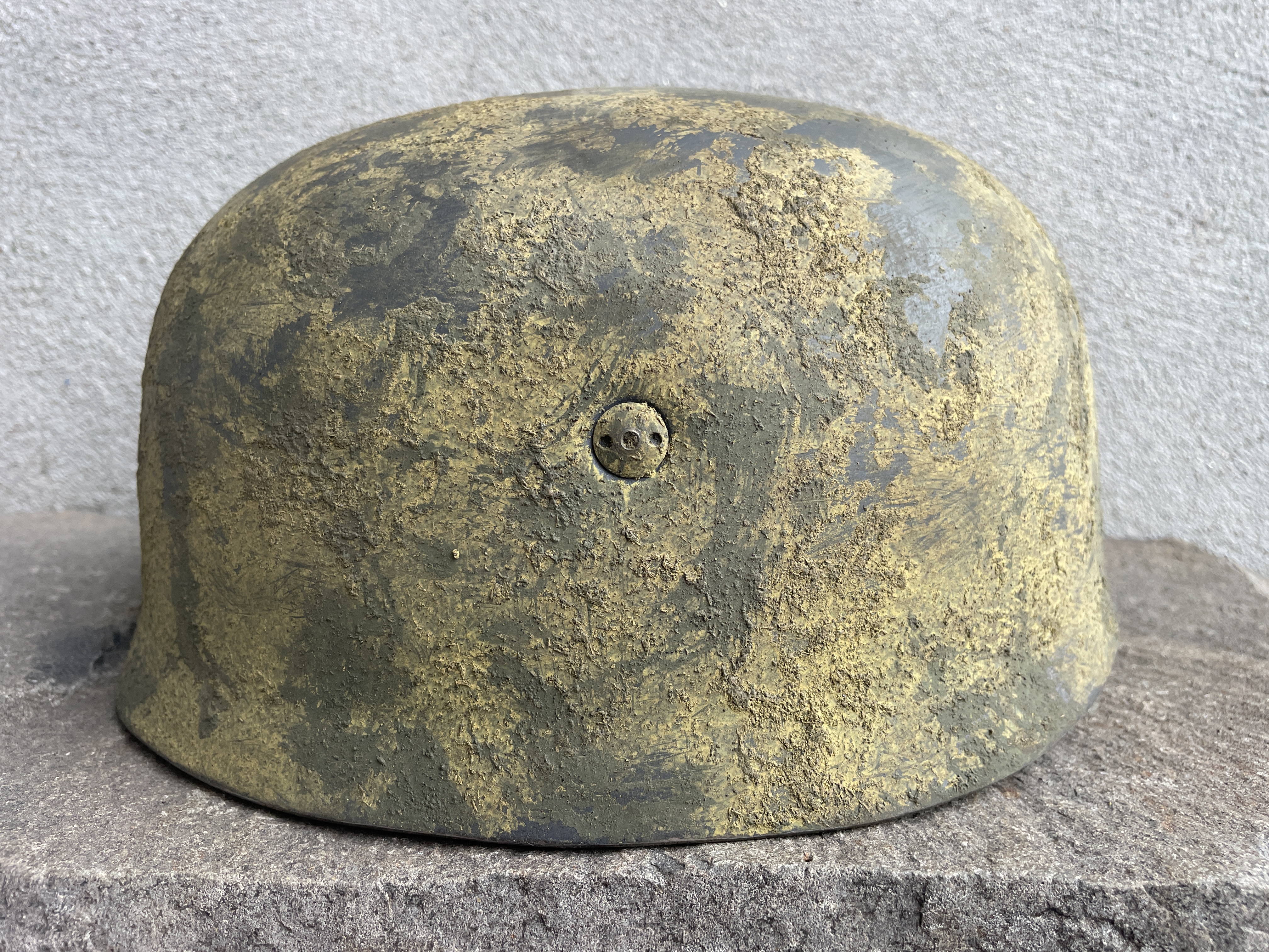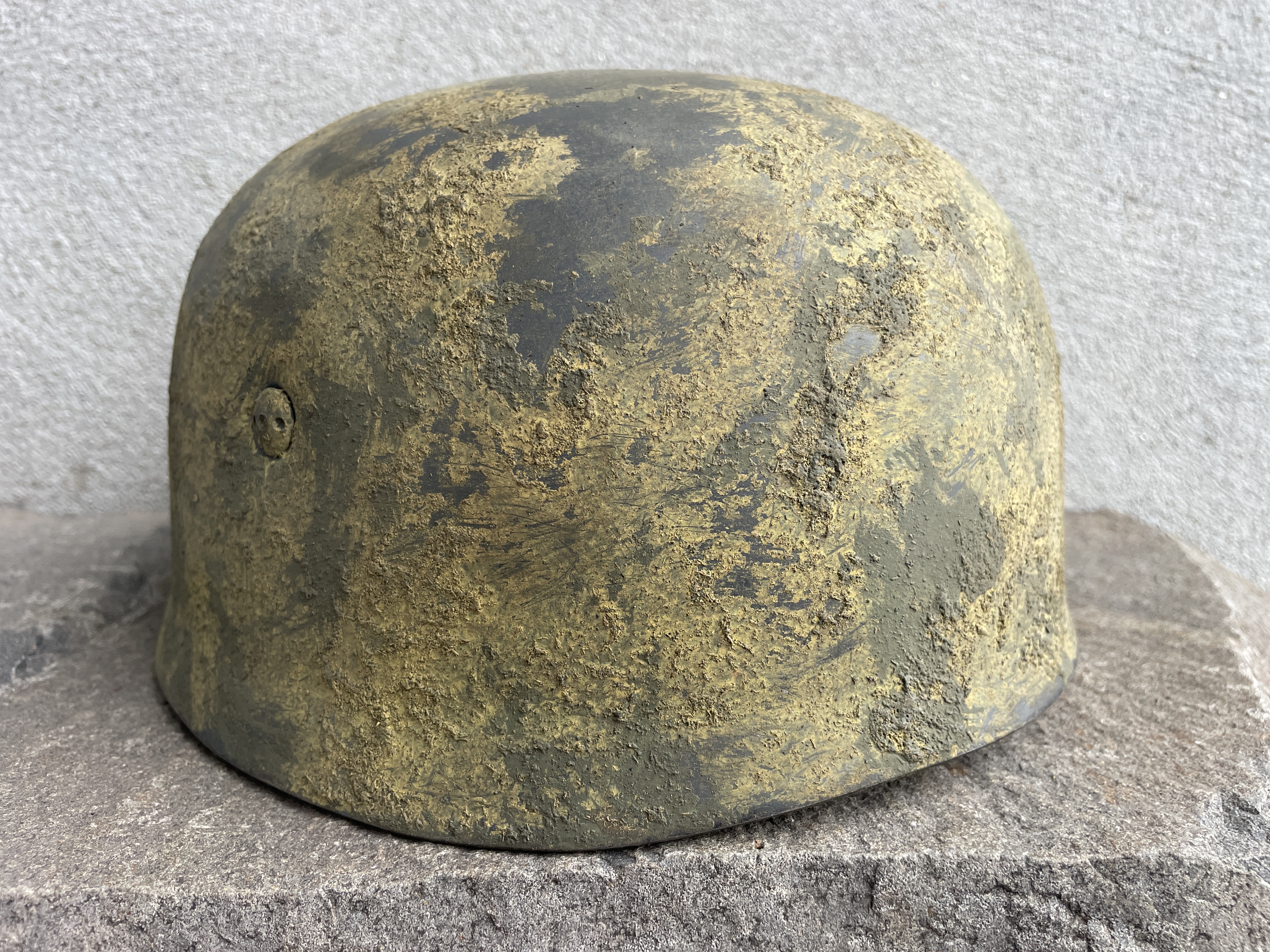 The FJR6 in Normandy: Carentan was defended by two battalions of Fallschirmjäger-Regiment 6 (6th Parachute Regiment), commanded by Oberst Friedrich von der Heydte, and remnants of 91 Air Landing Division's Grenadier-Regiment 1058. Both had escaped from nearby Saint Côme-du-Mont on 8 June when the village was captured by the 101st Airborne. II./FJR6 and III./FJR6 (2nd and 3rd Battalions, 6th Parachute Regiment) were still intact as fighting formations, but III./GR1058 had been nearly destroyed in three days of combat and was no longer effective as a unit. This helmet depicts a helmet used by the famous 6th Parachute Regiment as well as many other helmets from that same location all with the same camo pattern i.e. a medium tan base and light greens with actual sawdust embedded into the paint for added texture and concealment in the field.