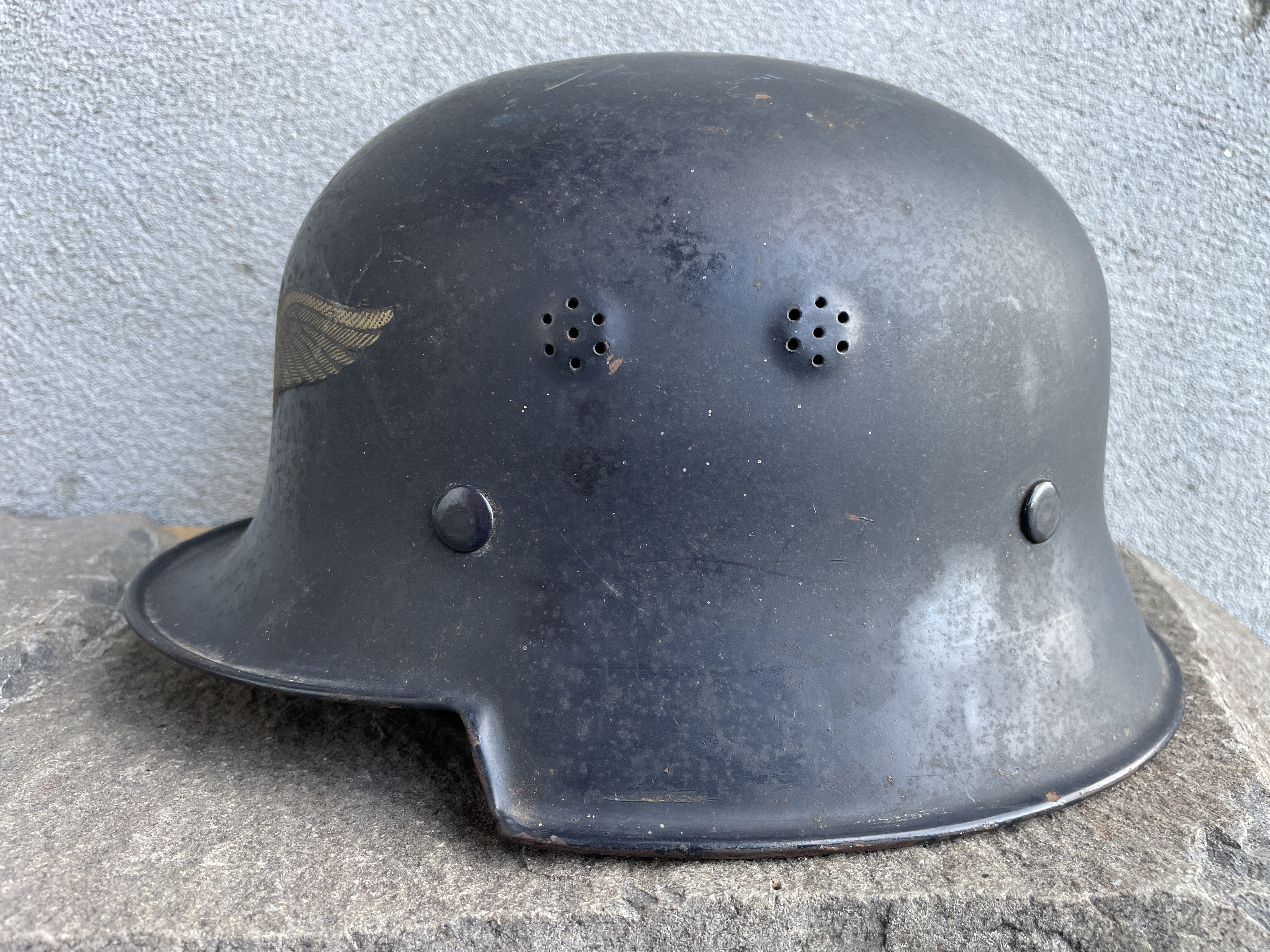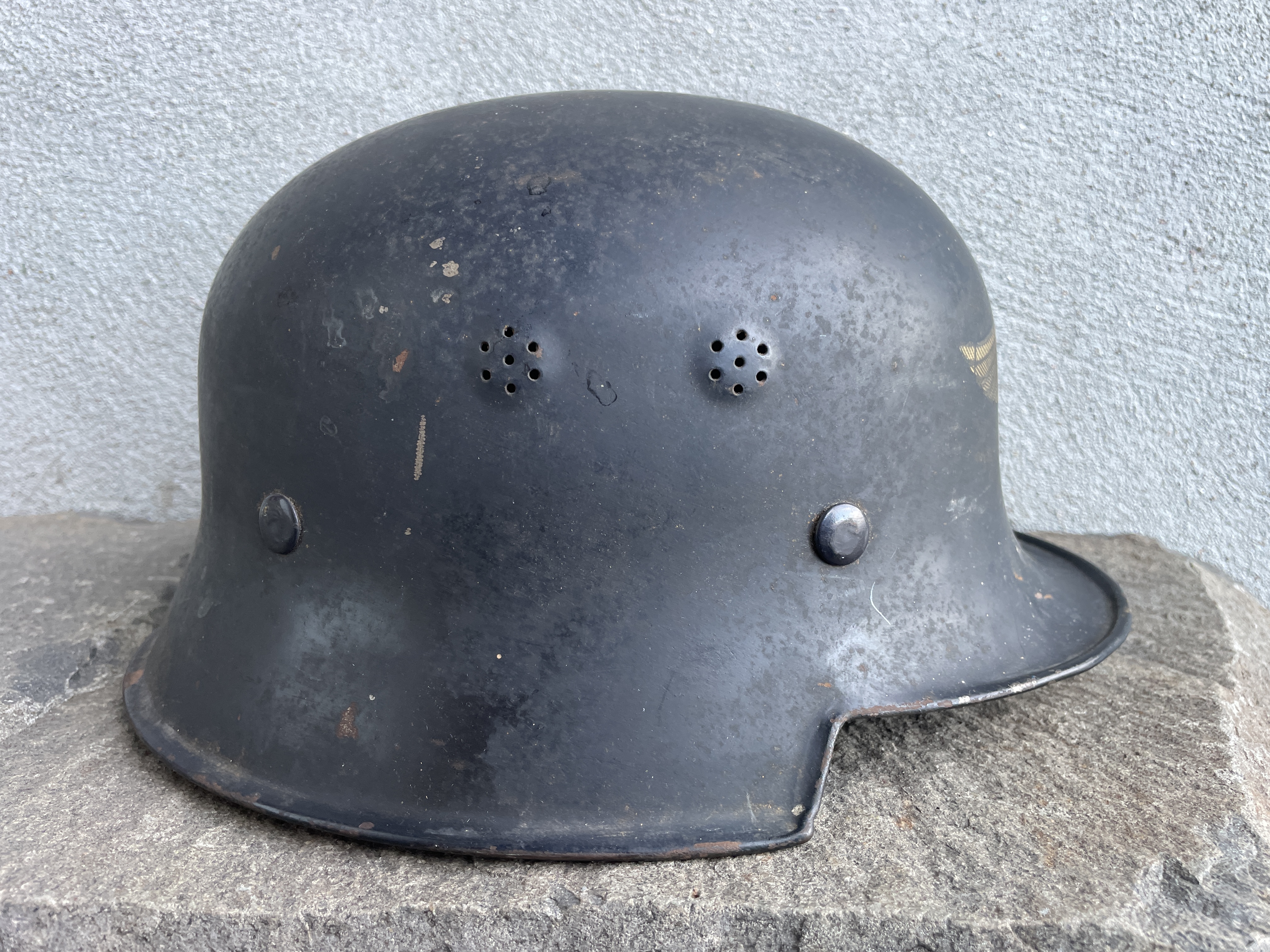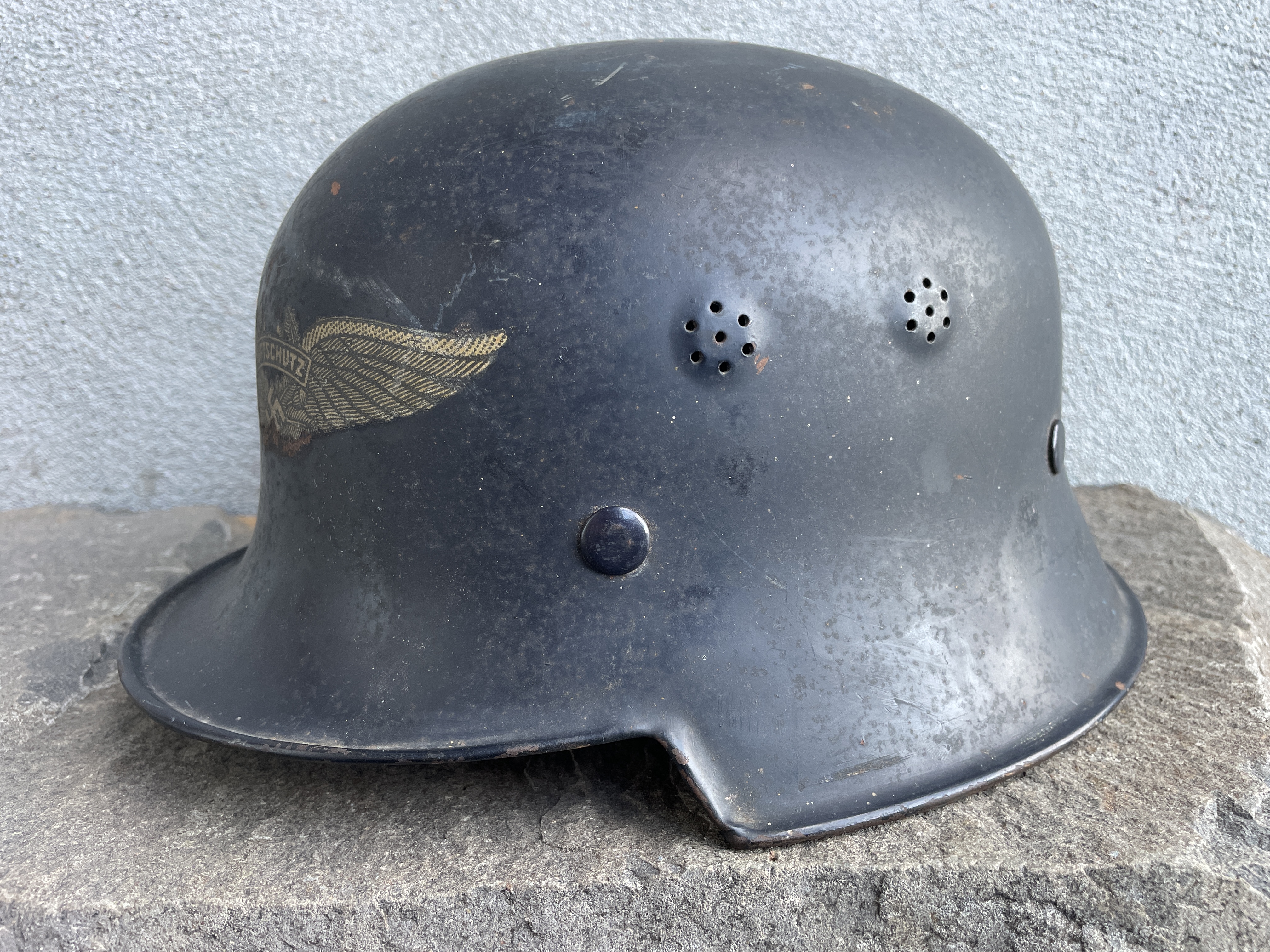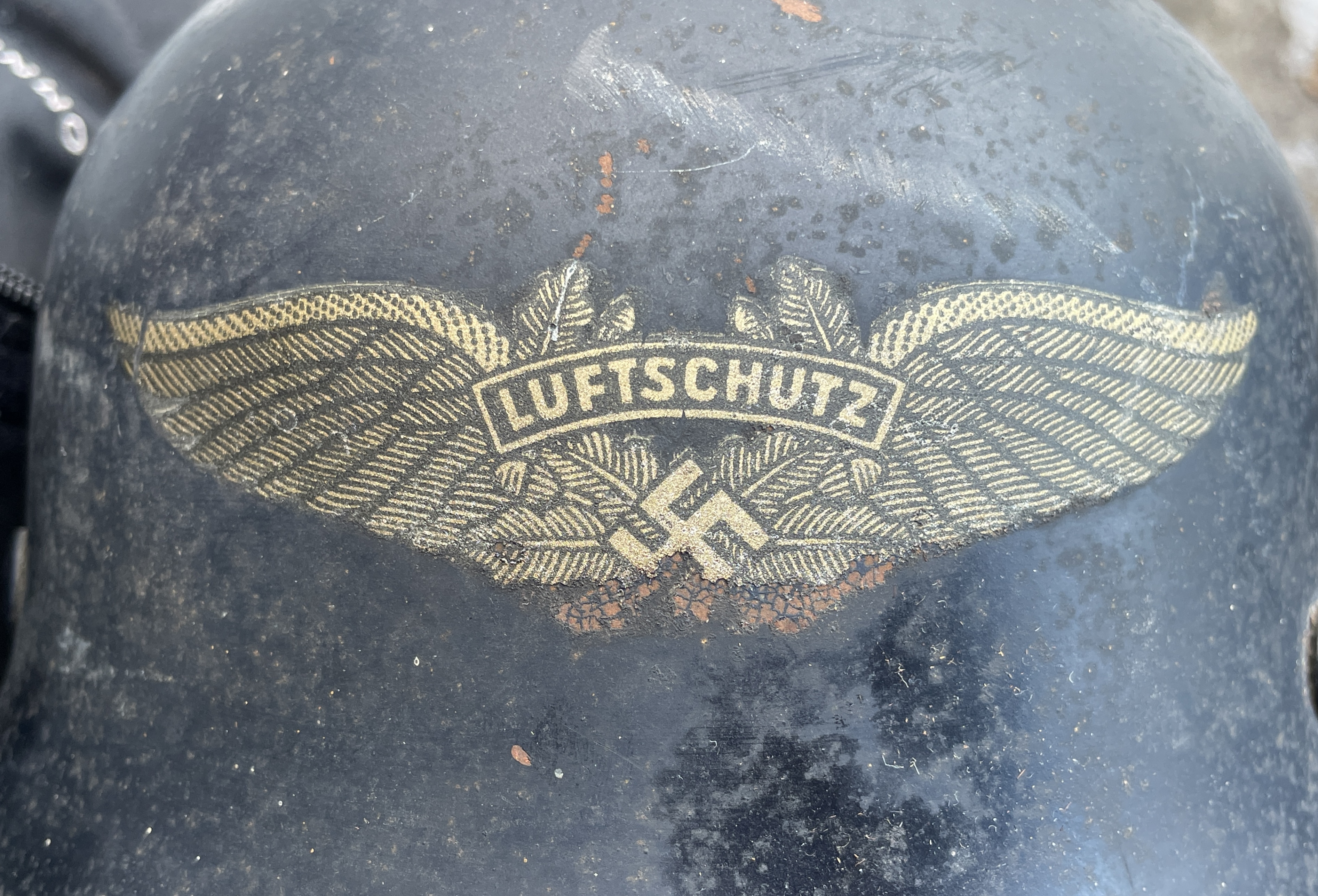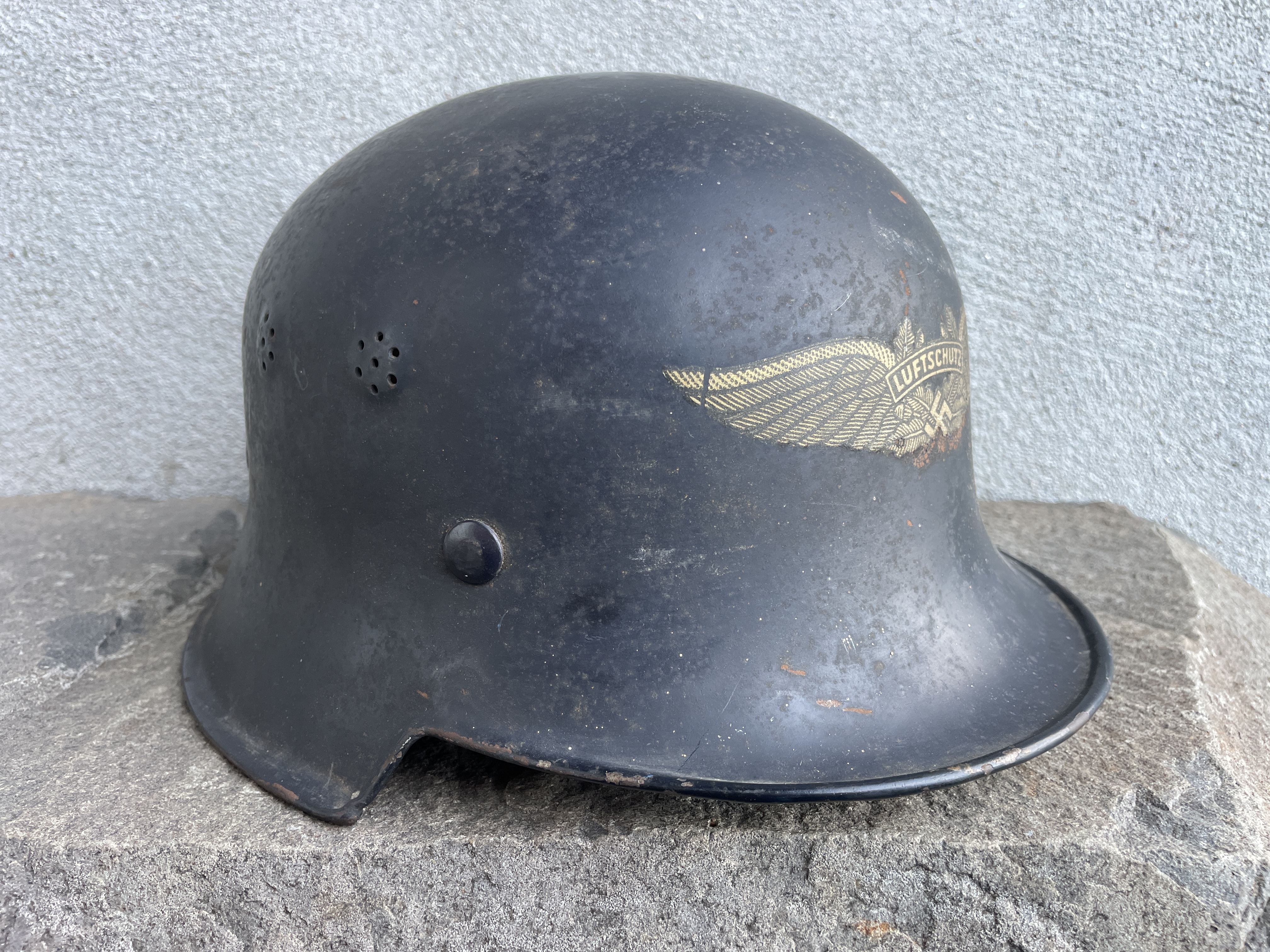 In 1938 the Reichsluftschutzbund was transformed into the Luftschutz (LS) Air Defense. The helmets got a new dark blue color (as opposed to the grey and green of the RLB) and also a new decal was placed on these helmets. It changed from a voluntary service to a compulsory one in 1943 and women were from then on not to be excluded