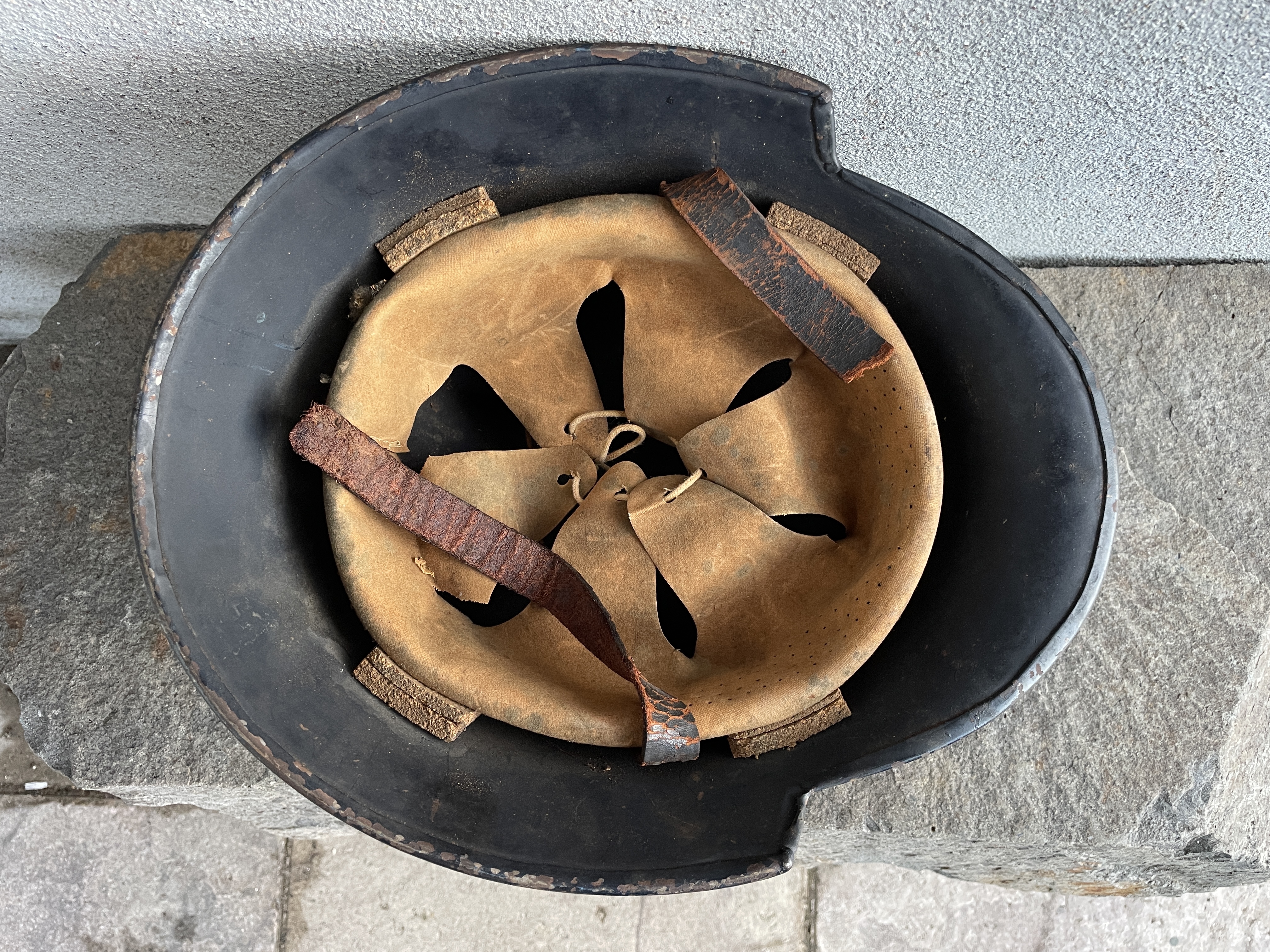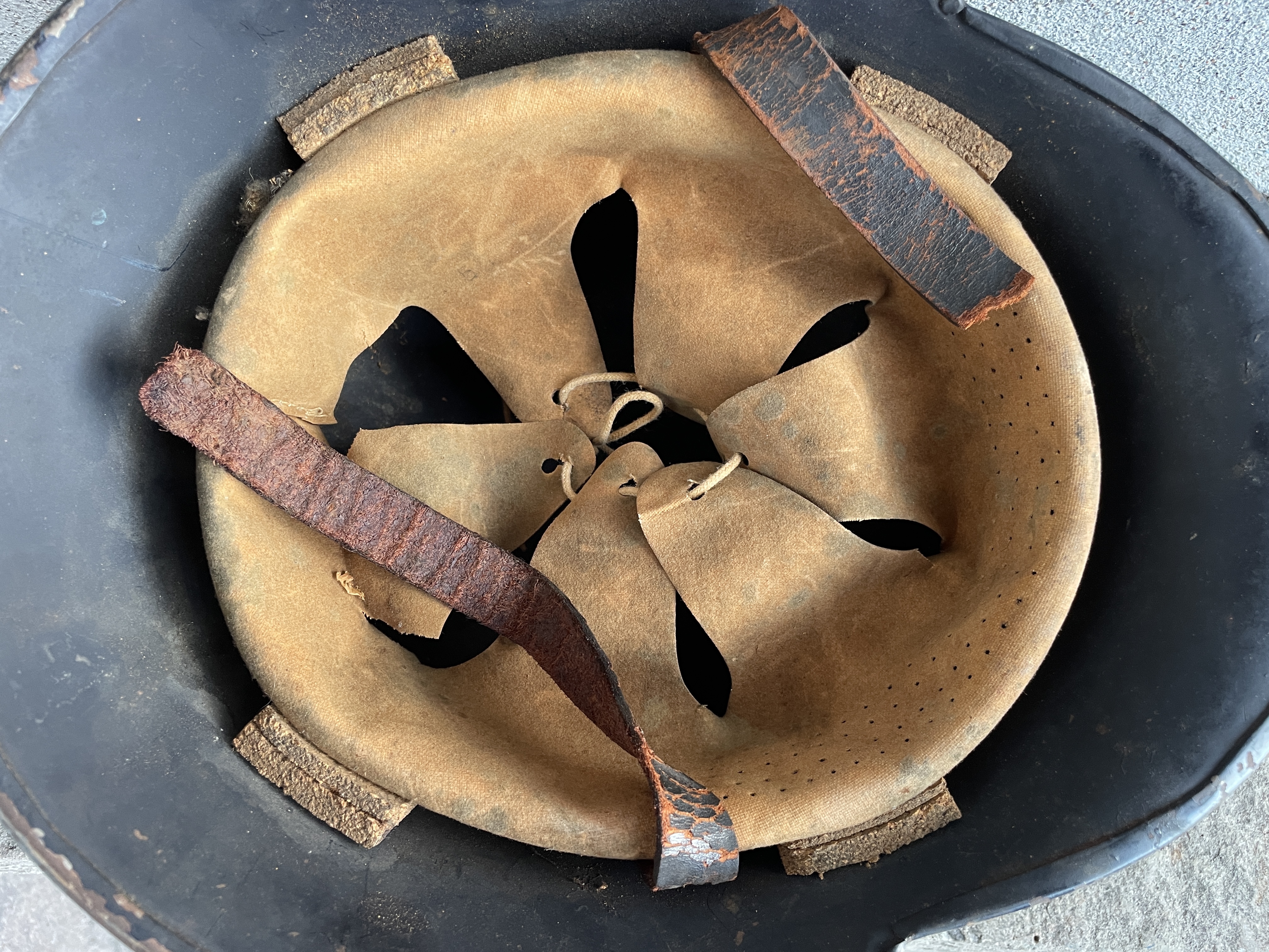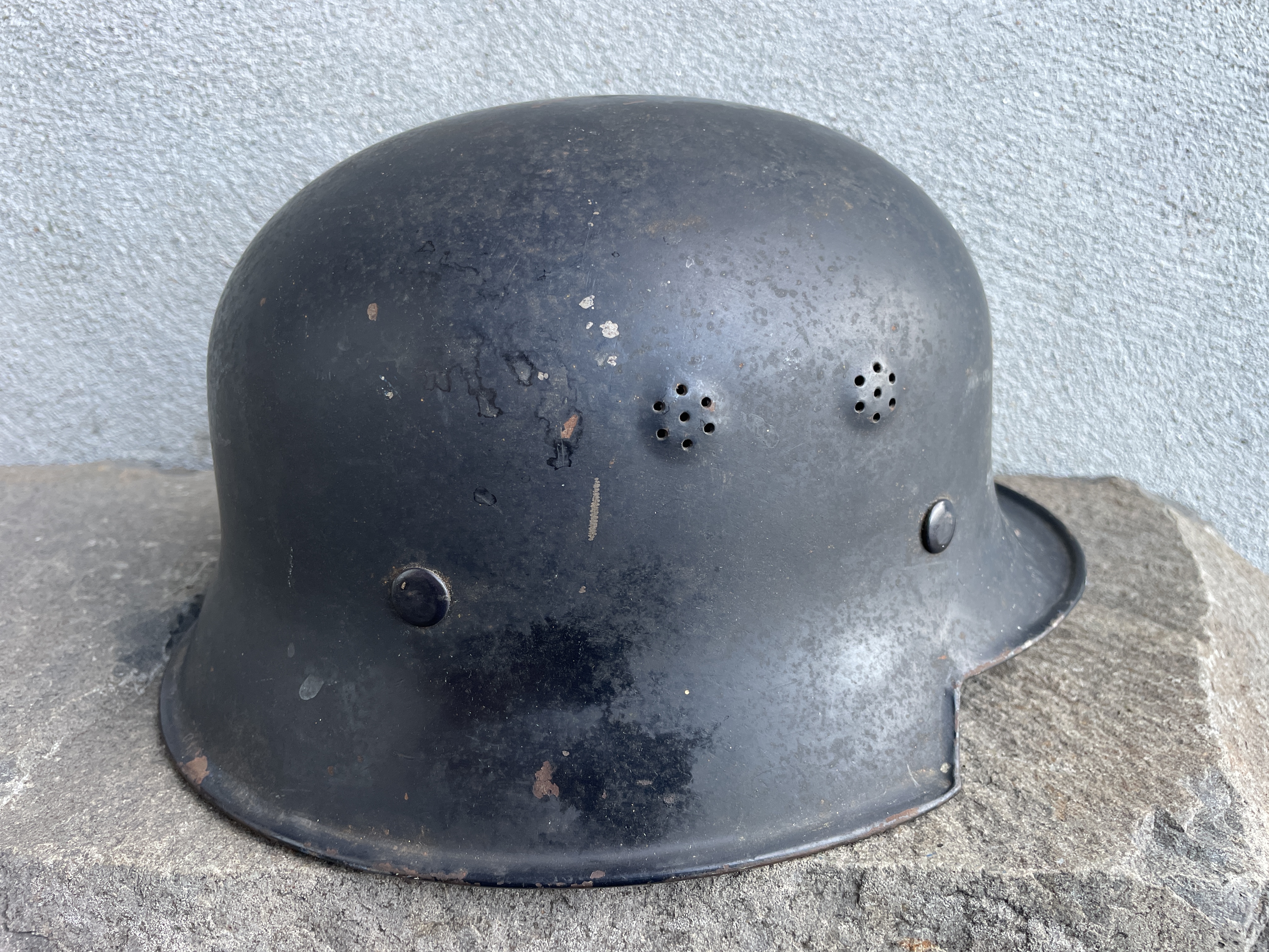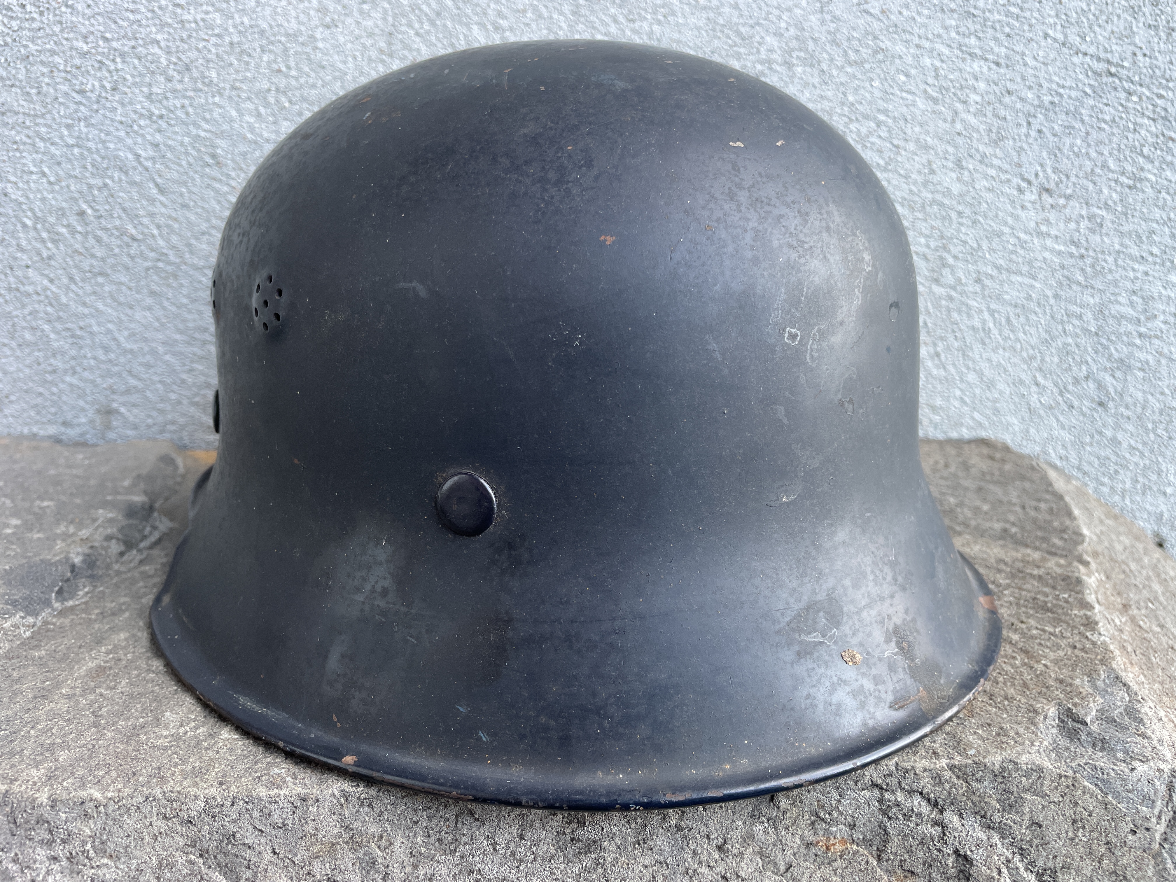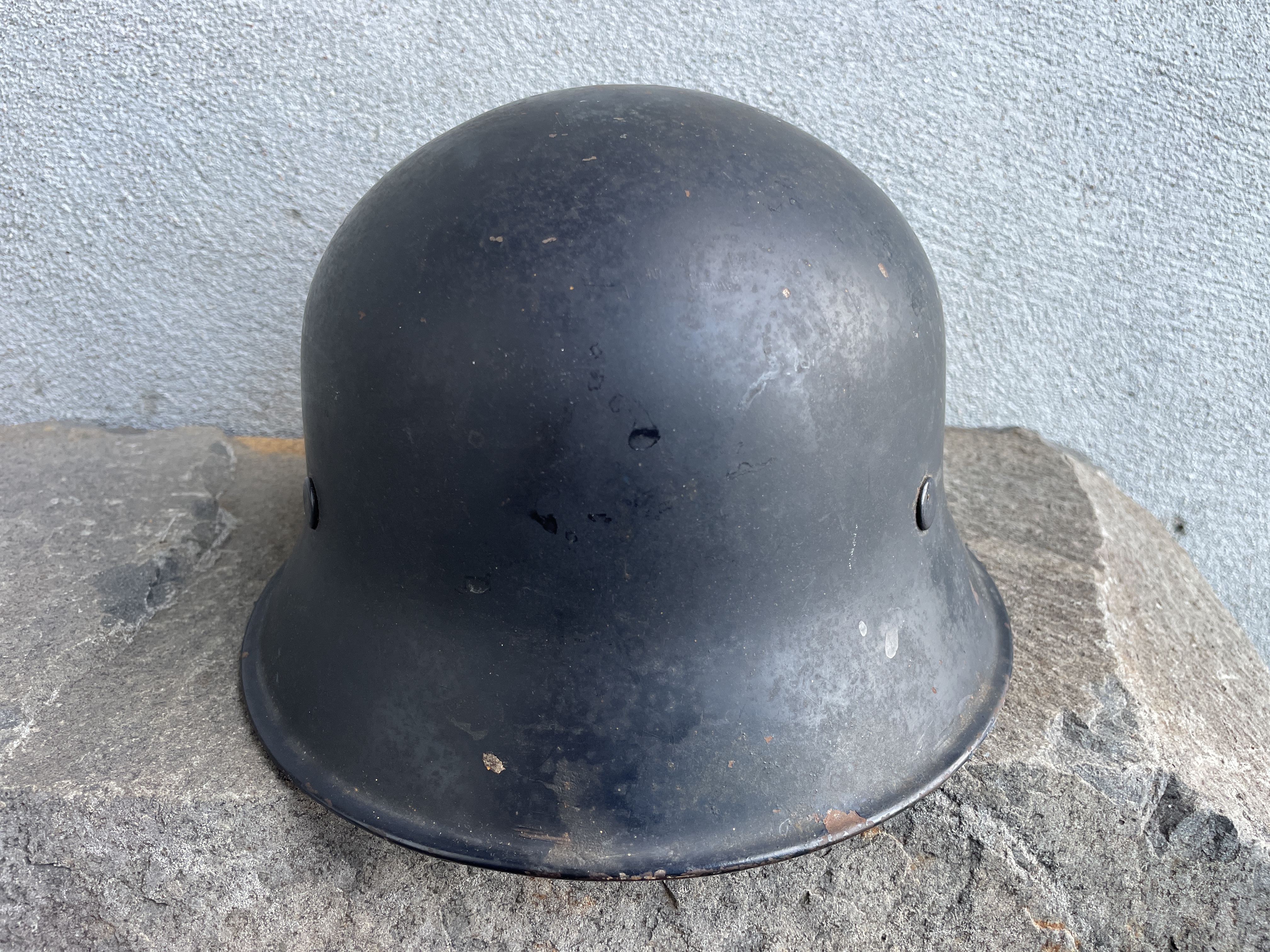 This example represents an early war example circa 1935-38 while M34 square dip model helmets were still being issued. The helmet is a very early pattern, with vent holes that protrude outwards. Later models of the M34 had flat vents. The Luftschutz officially only were issued these helmets from 1935 until 1938 making these quite rare compared to other models. Later in the war they went with beaded helmets and gladiator style. The helmet is completely untouched since the war and is a direct vet bring back from the grand daughter who recently sold it to us. The front LS decal is 100% original as is the dark blue paint and helmet liner. The chinstrap is also original to the helmet but sadly was broken at some point and so the buckle is no longer present.