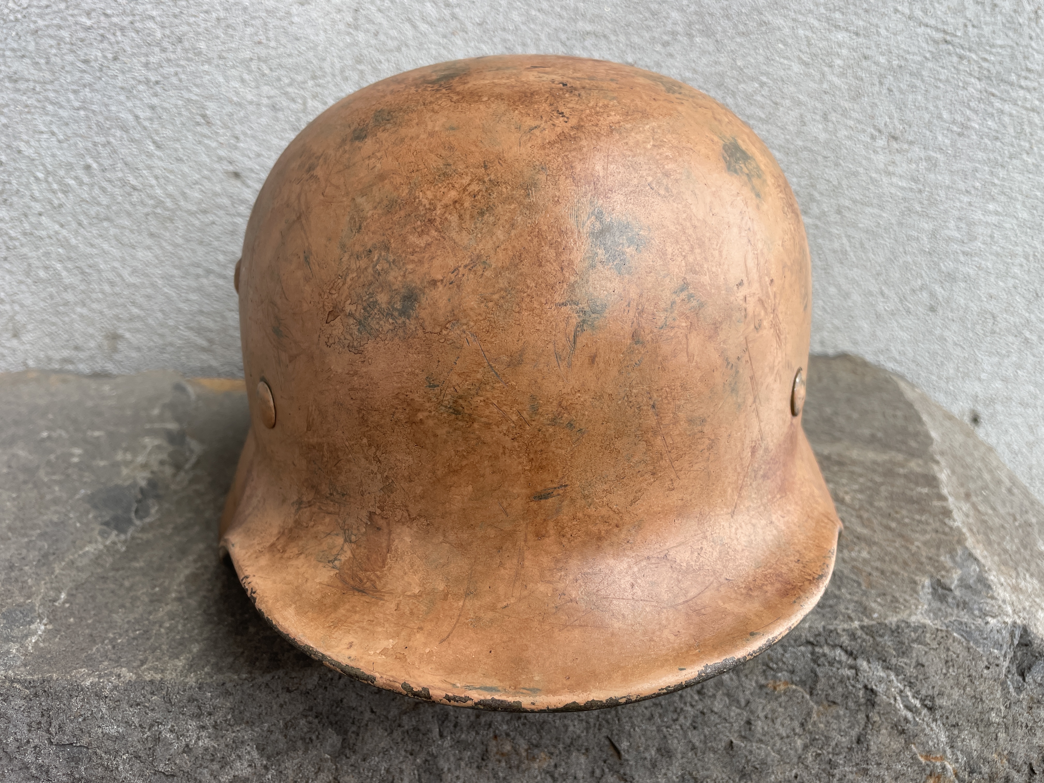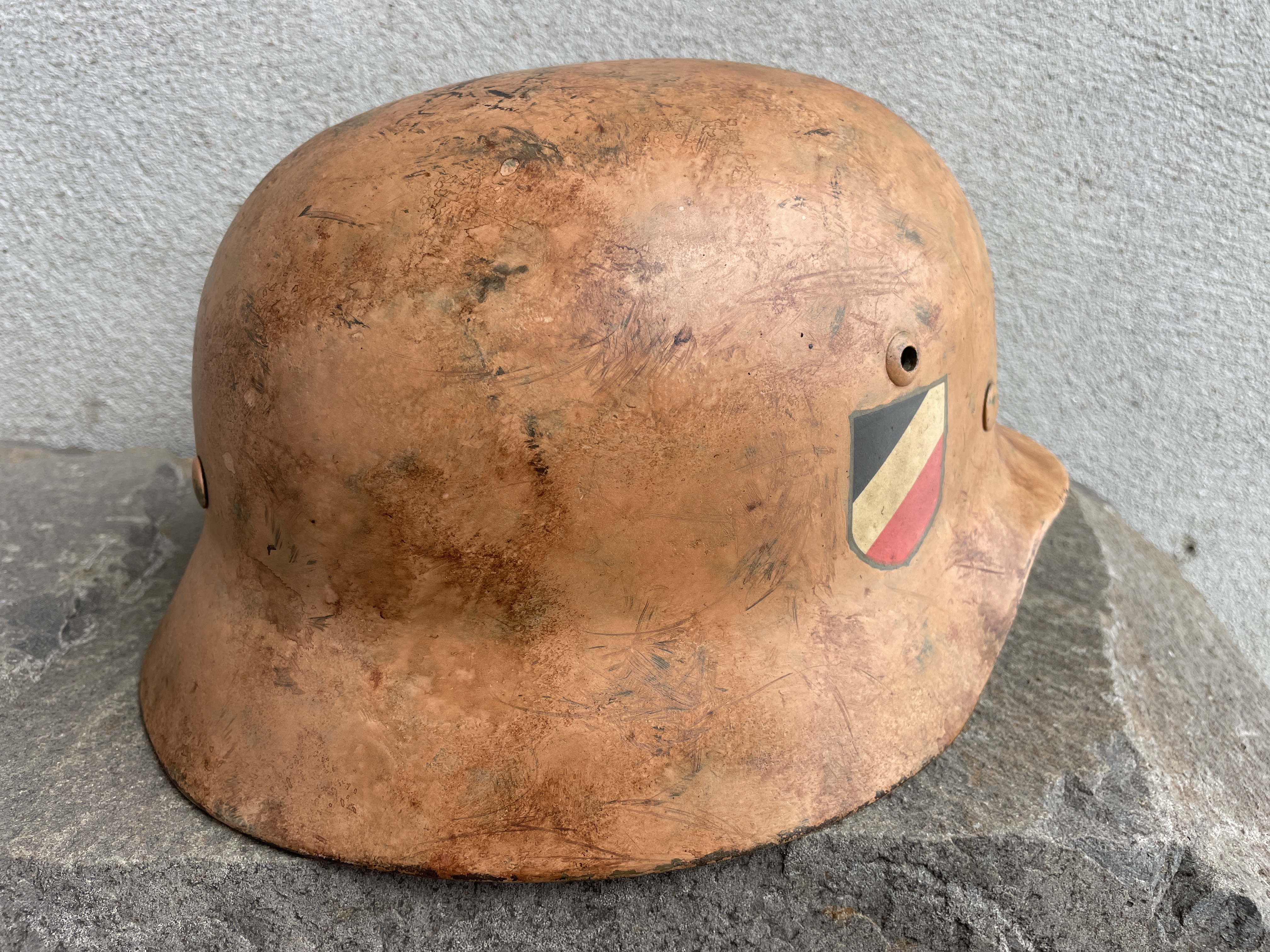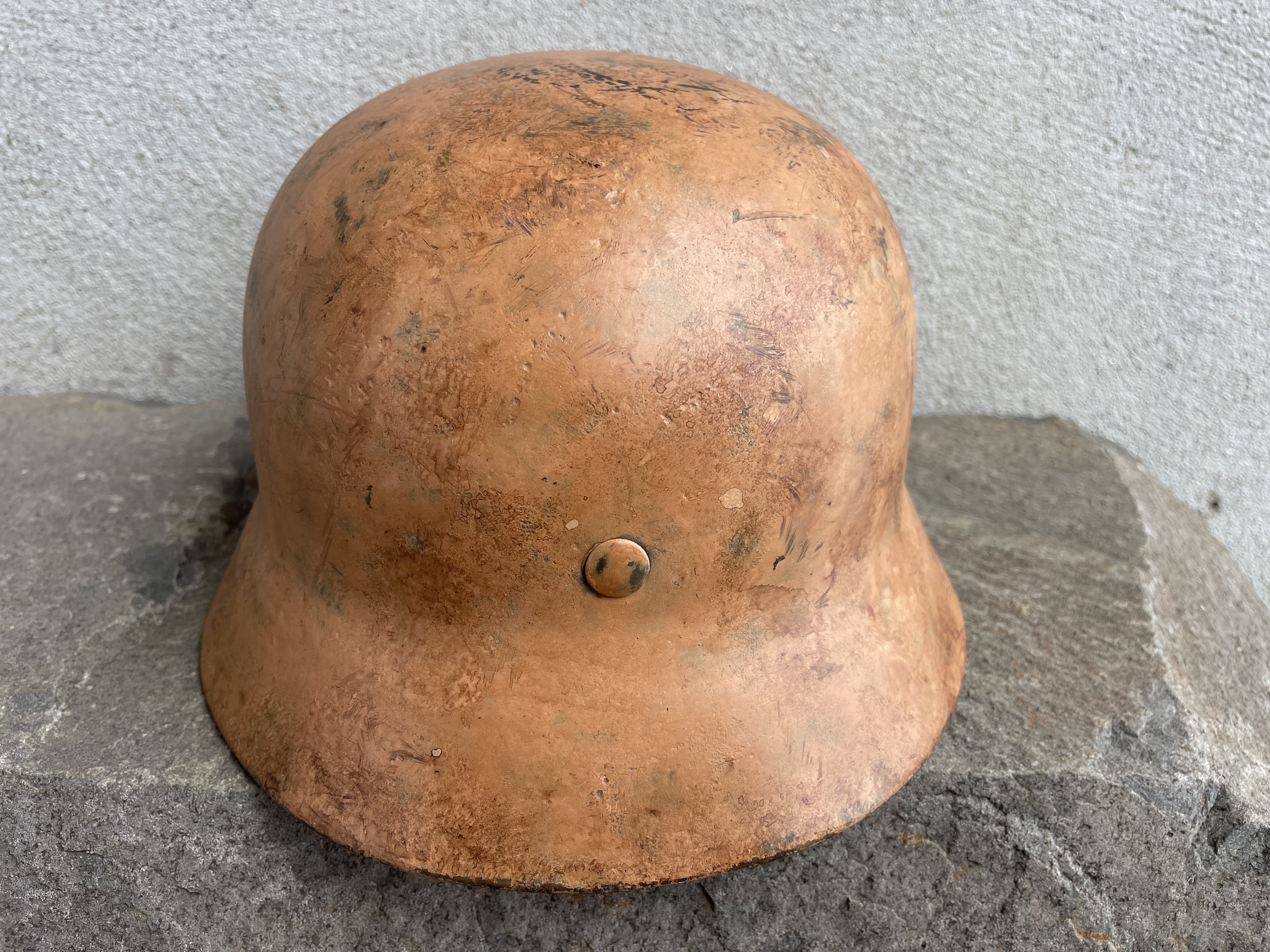 Historical photos show rows of dark gray German helmets arranged in lines on the ground to be painted over with large pneumatic spray guns the kind used for vehicles. Most of these were given a light to dark yellow tan color but some where given more of a bubble gum pinkish hue. This color was debated for some time but when enough original examples came to the marketplace their existence become well known among the collector community. In countries such as Tunisia, Libya, Algeria and Morocco there exist sand that was formed among ancient red coral beds broken up over time creating a pinkish hue especially at dawn or sunset. Other regions of the Sahara are rich in iron oxides creating hues of reddish copper to an orangey pink and so many variations of tan exist among German helmets.