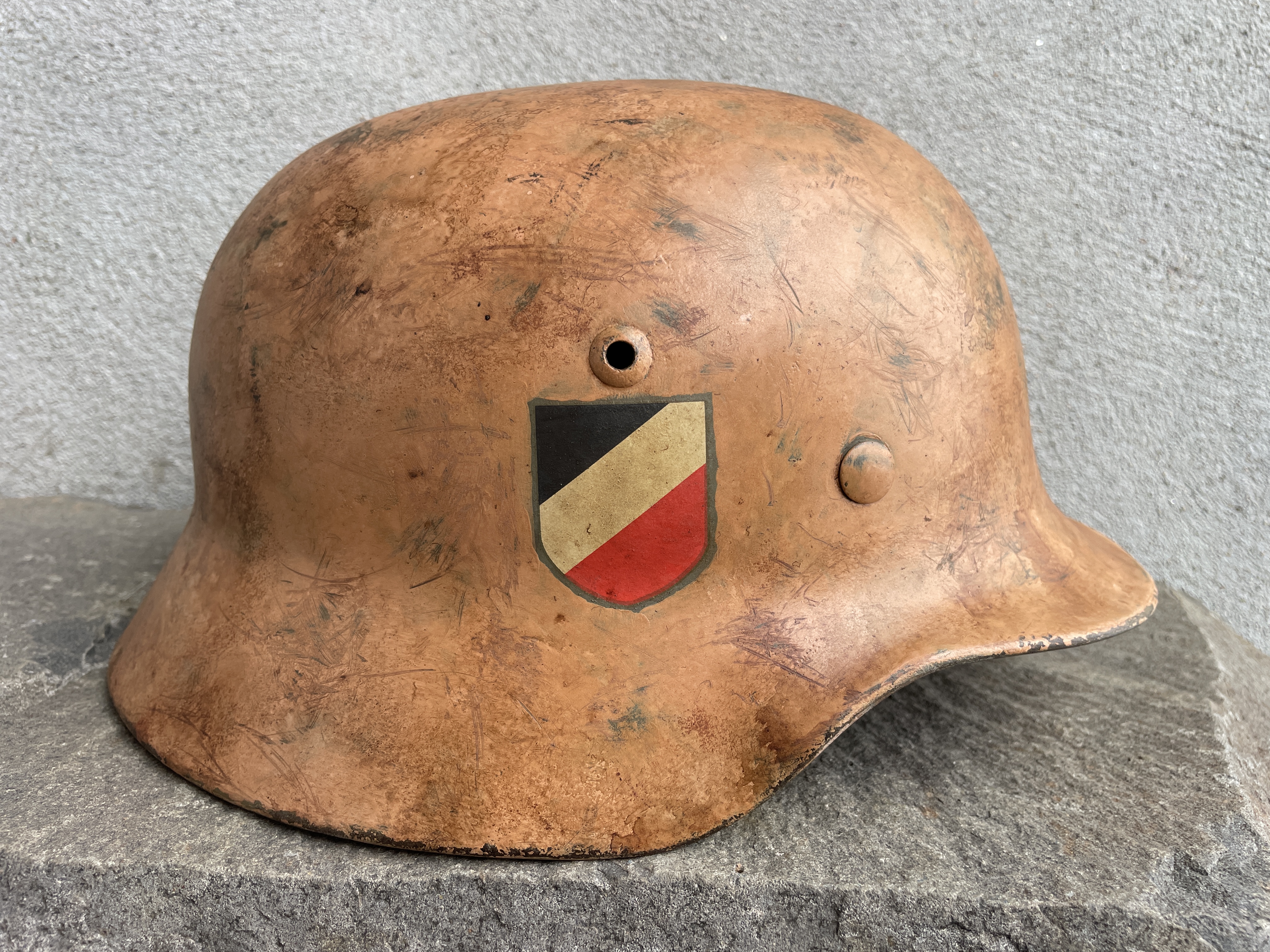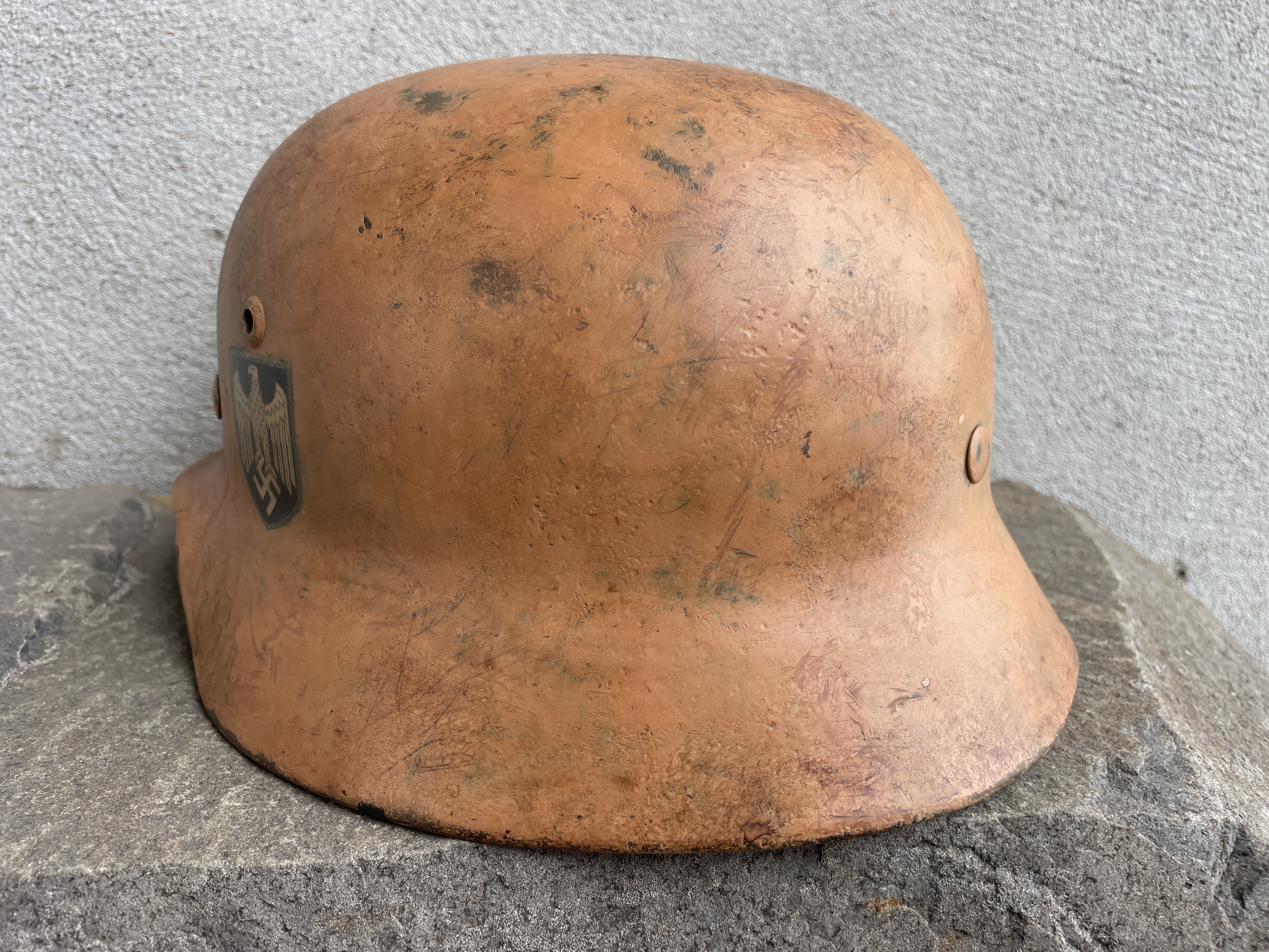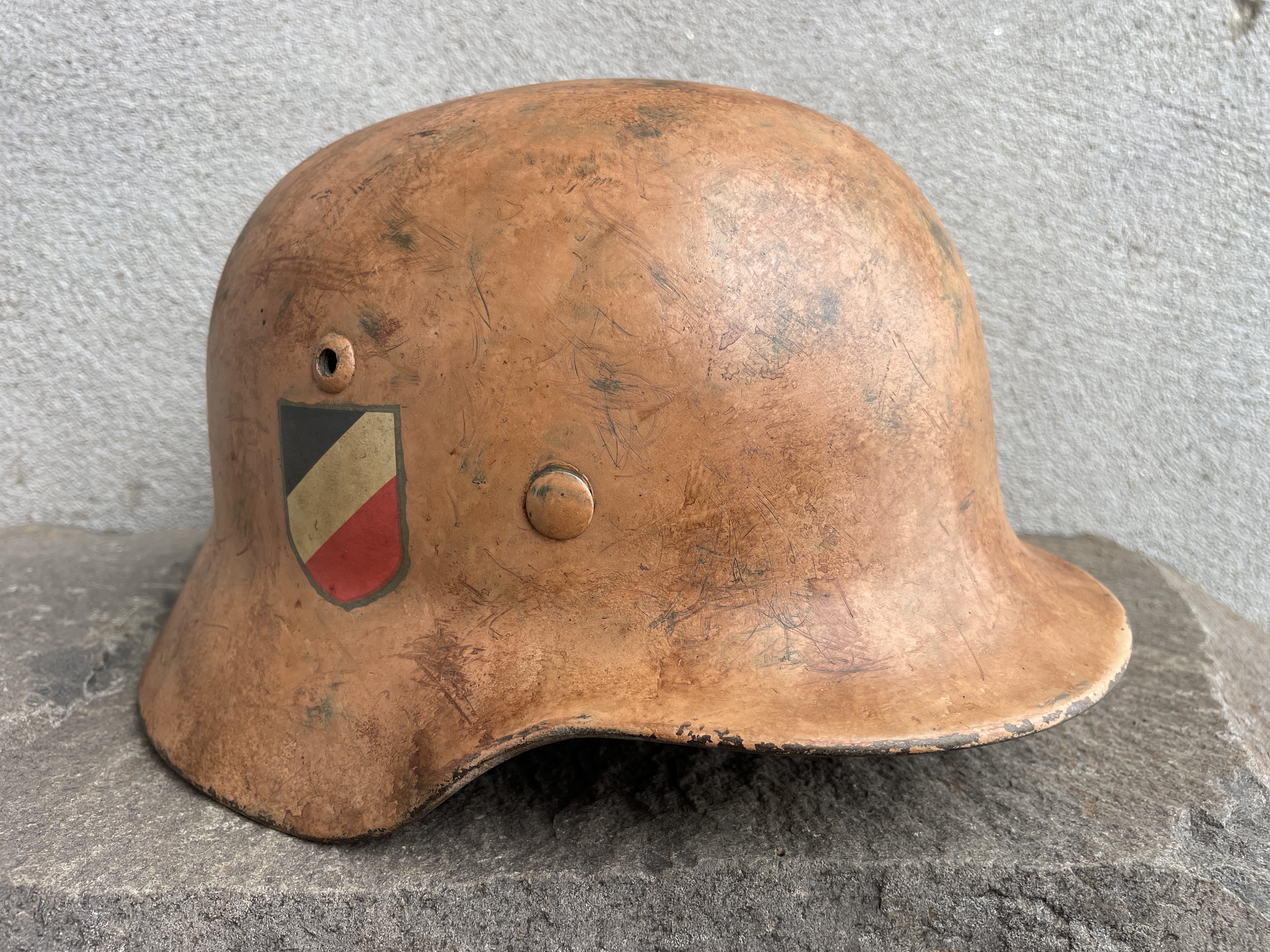 Historical photos show rows of dark gray German helmets arranged in lines on the ground to be painted over with large pneumatic spray guns the kind used for vehicles. Most of these were given a light to dark yellow tan color but some where given more of a bubble gum pinkish hue. This color was debated for some time but when enough original examples came to the marketplace their existence become well known among the collector community. In countries such as Tunisia, Libya, Algeria and Morocco there exist sand that was formed among ancient red coral beds broken up over time creating a pinkish hue especially at dawn or sunset. Other regions of the Sahara are rich in iron oxides creating hues of reddish copper to an orangey pink and so many variations of tan exist among German helmets.