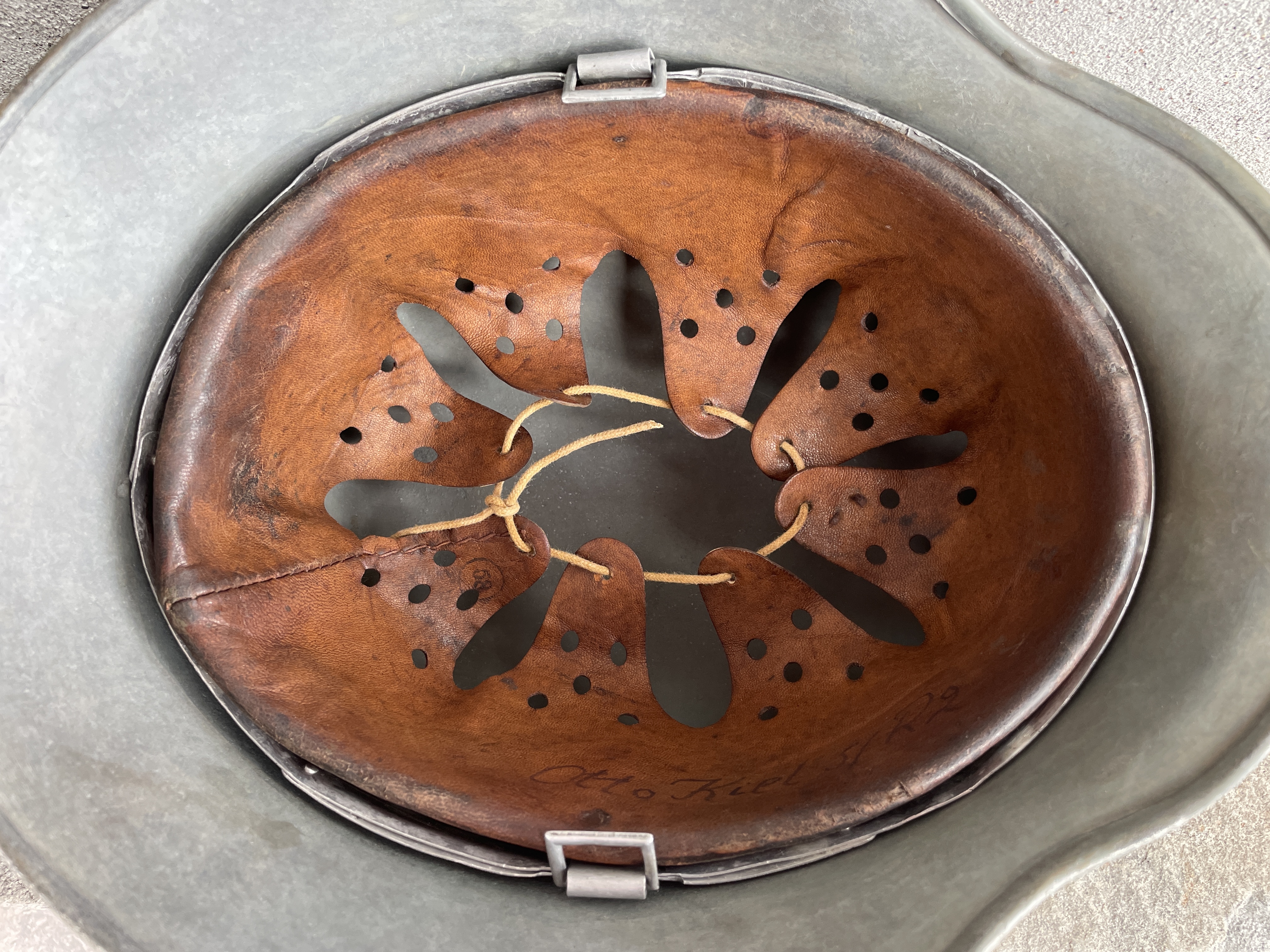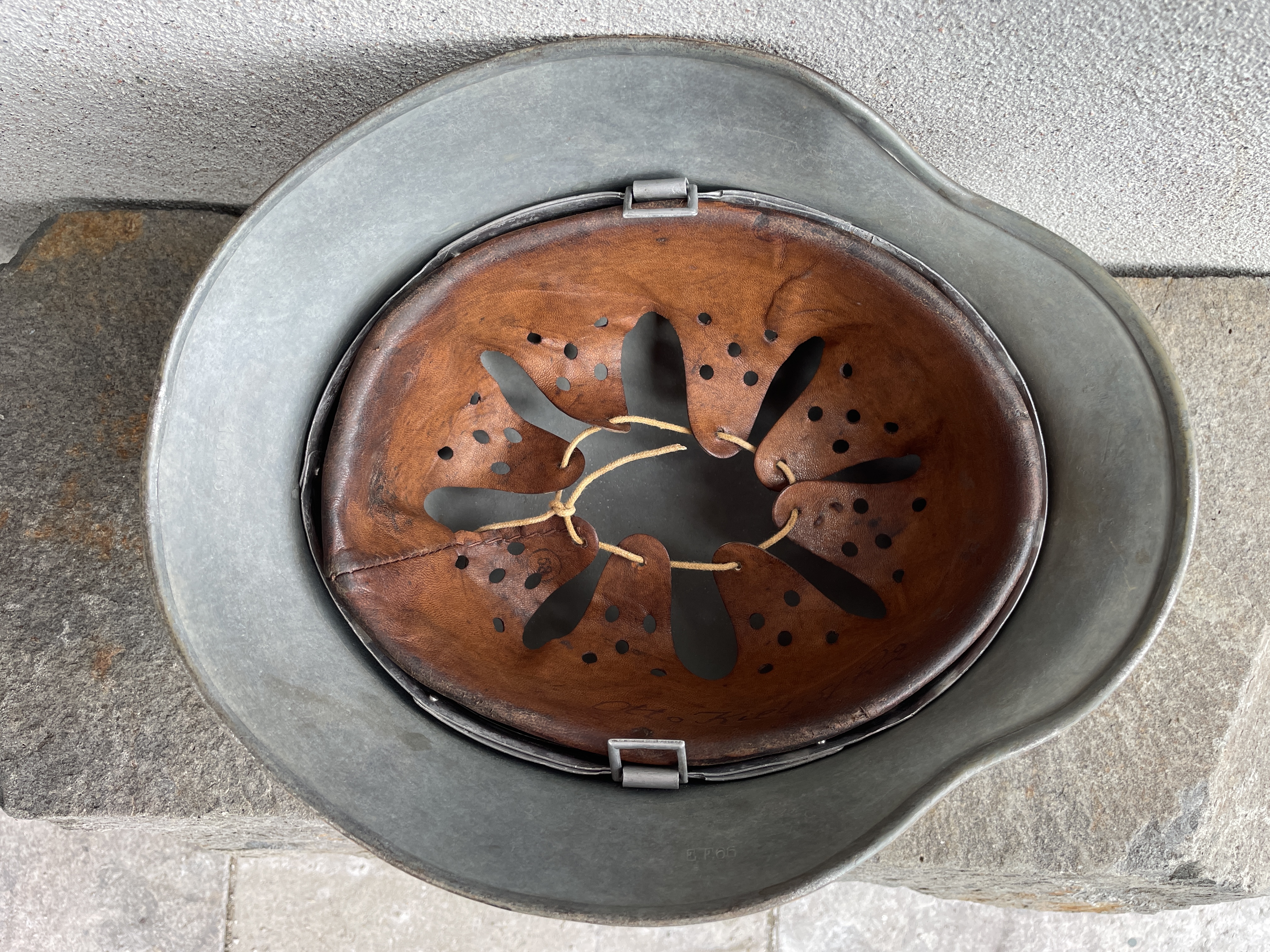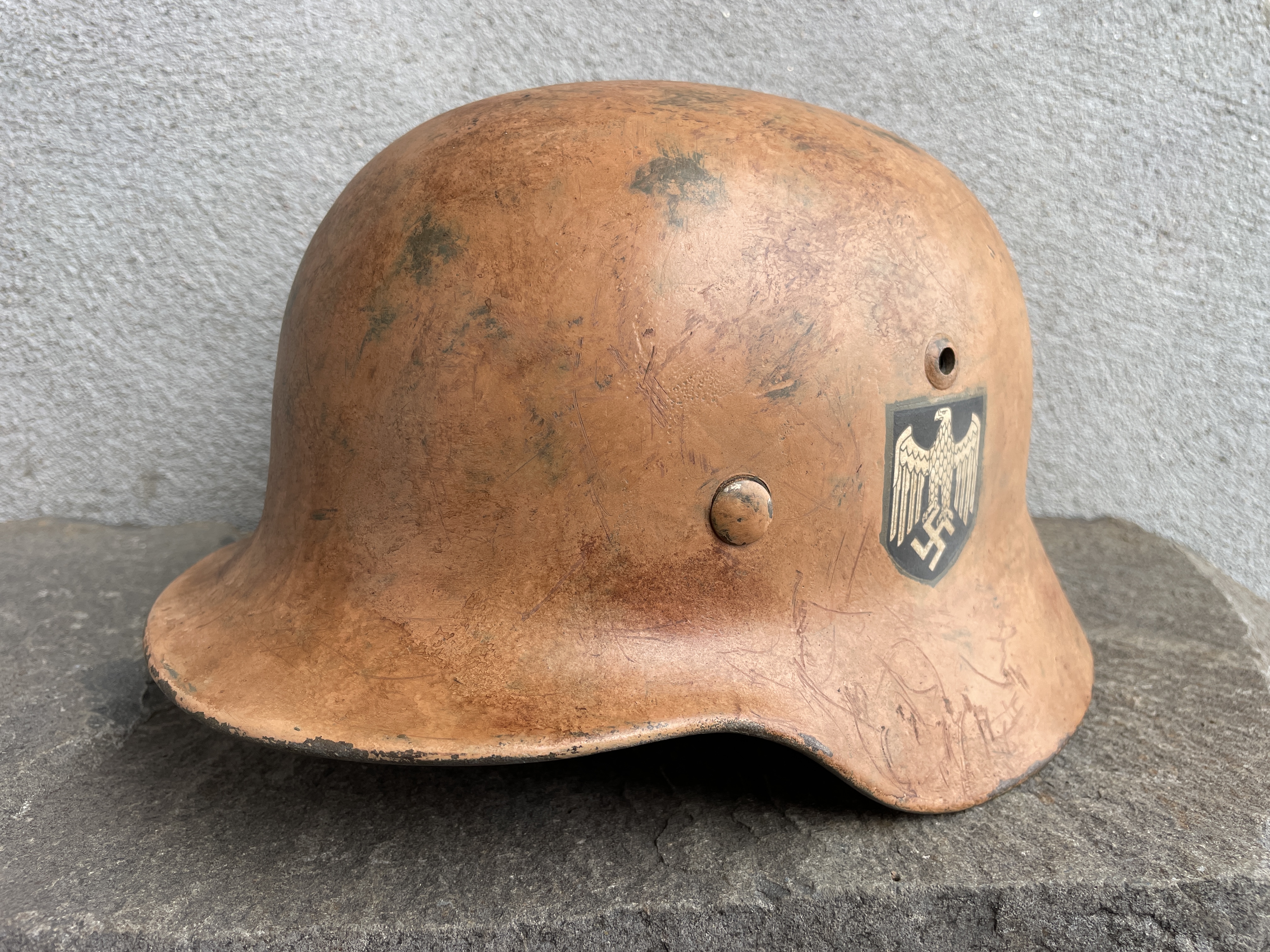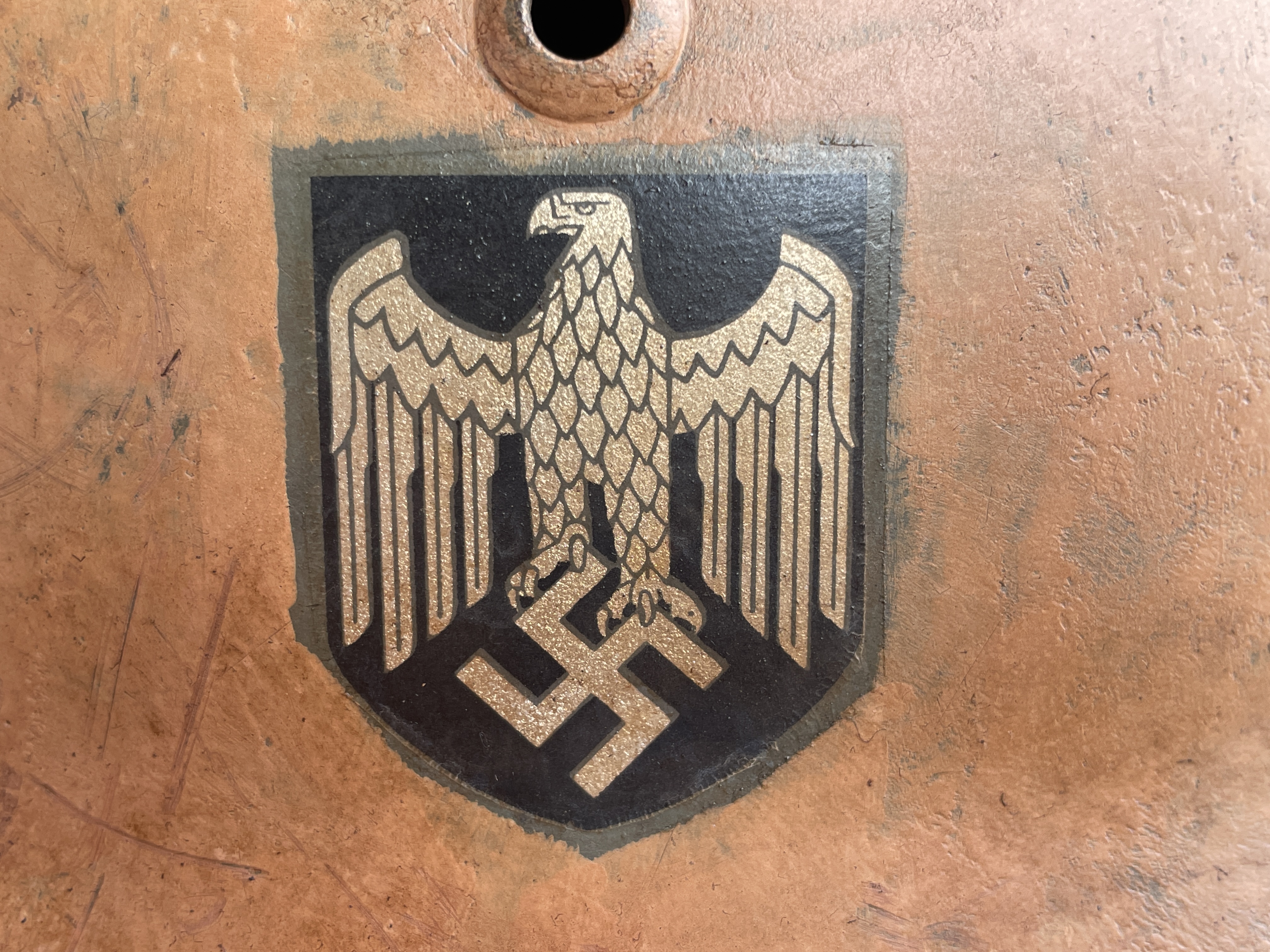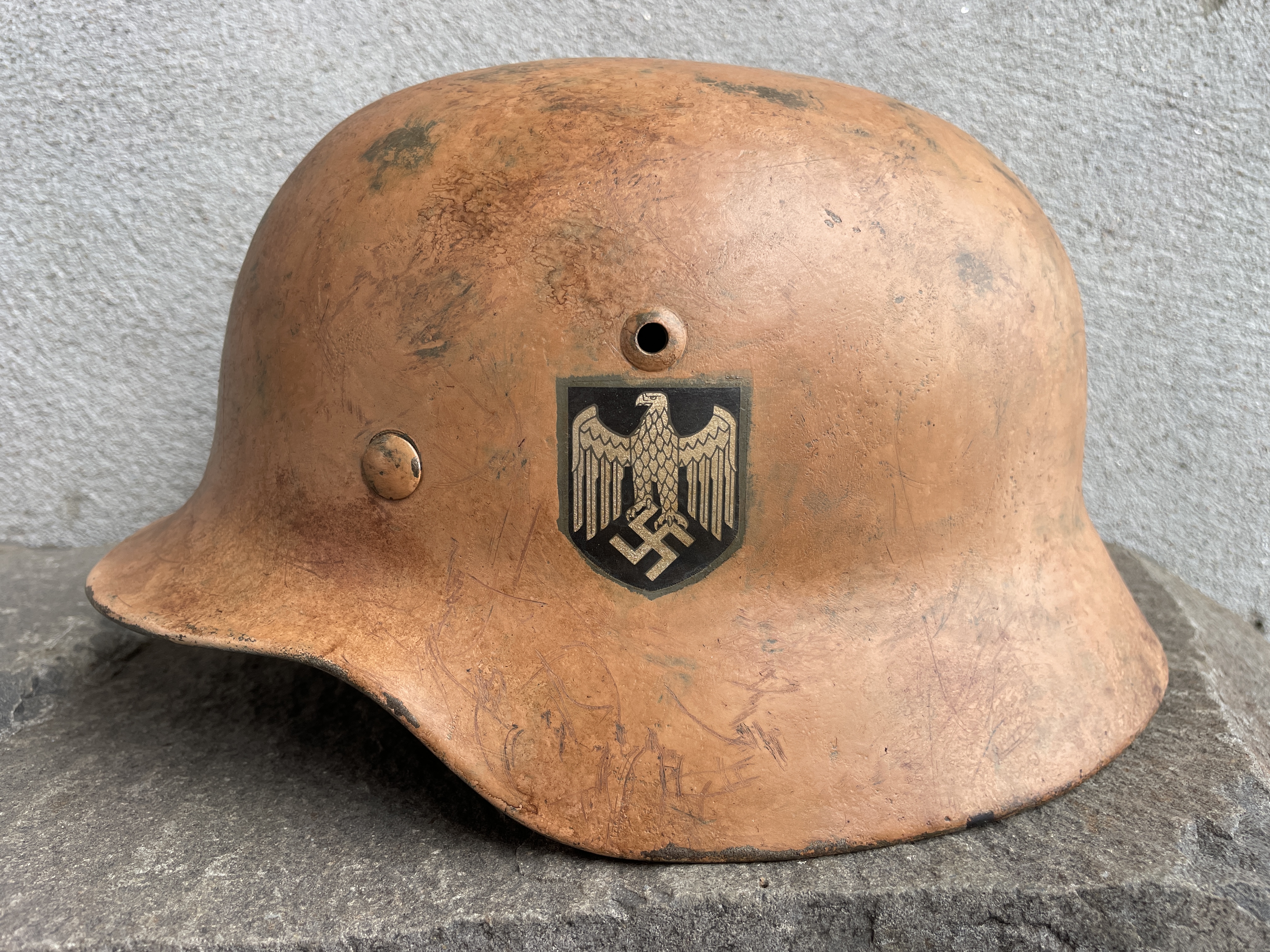 The inside liner is actually original and was supplied by the owner. The Heer eagle is historically accurate since early M35 EF helmets didn't officially have their own EF specific decals yet and so relied heavily on ET makers at that time.