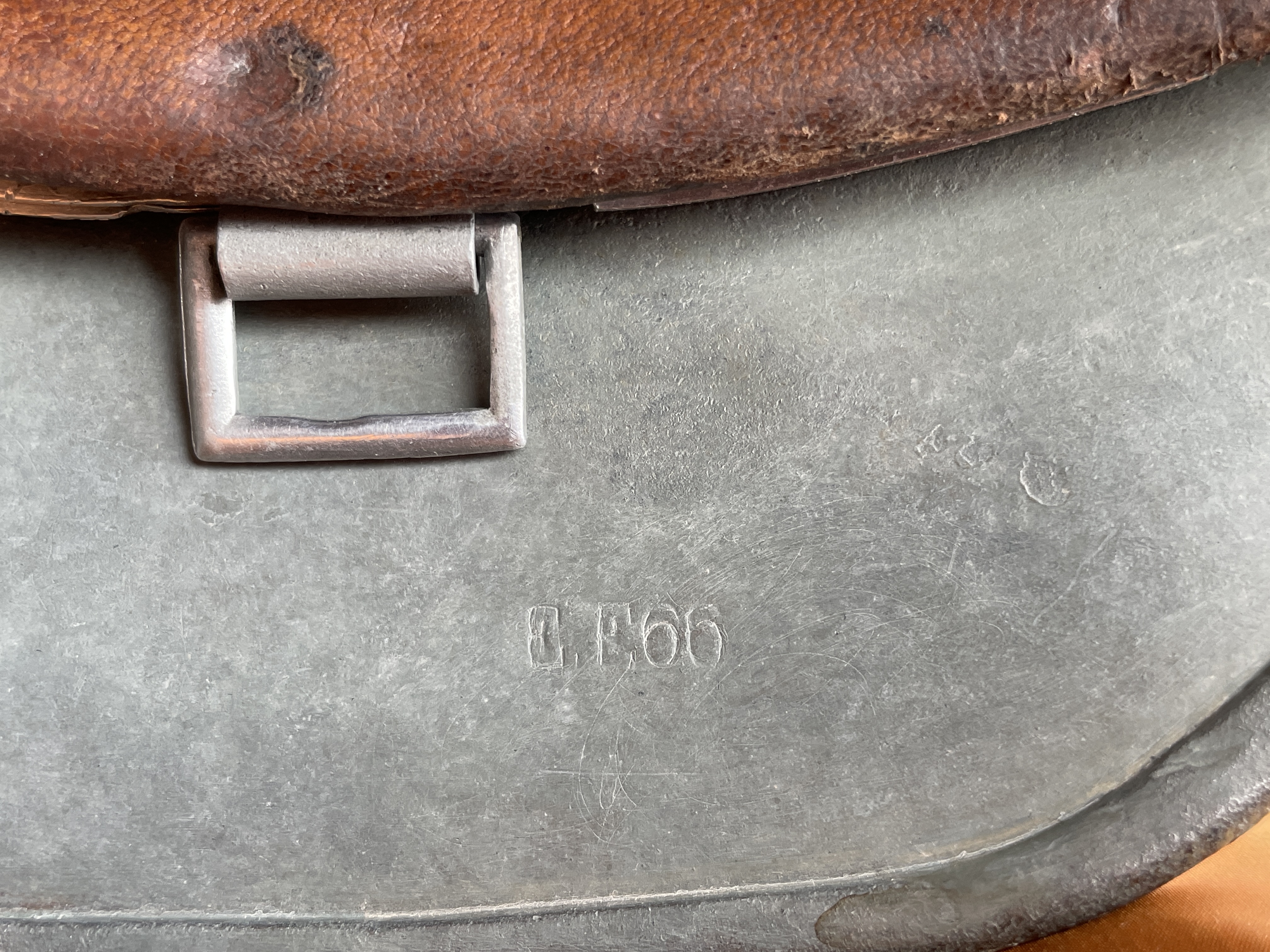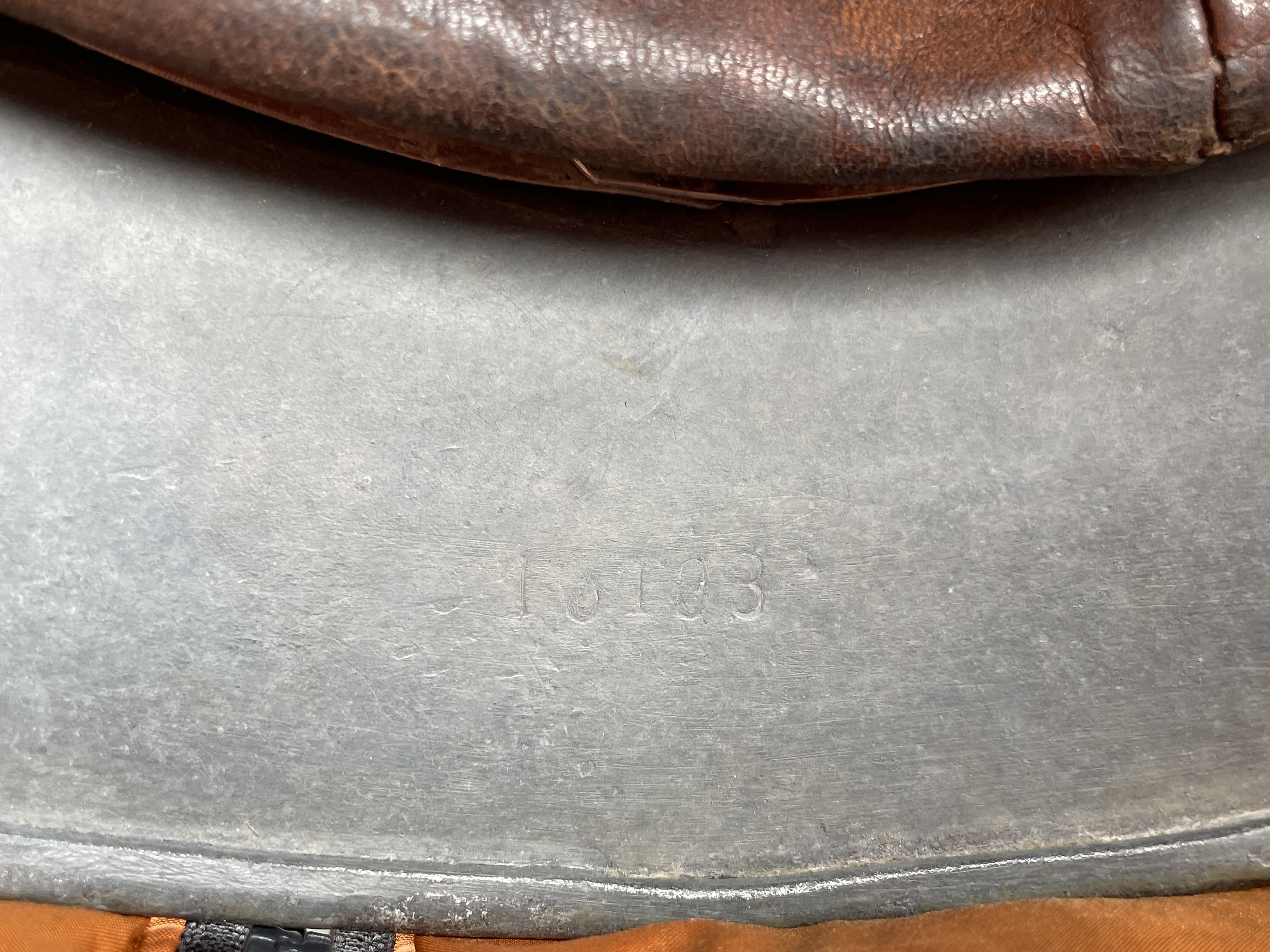 (Every original German helmet produced from 1935 to 45 had two factory stampings punched into the side and rear or both in the rear.  The alpha numeric number refers to the factory location and the inside metric circumference in centimeters.  The rear lot number refers to the production run and was used as a quality control measure. The font styles used at each factory were slightly different but highly consistent throughout the war and so fakes or reproductions will either not have these numbers at all or they will use the wrong font style or letter spacing and so are easily identified as post war made.)