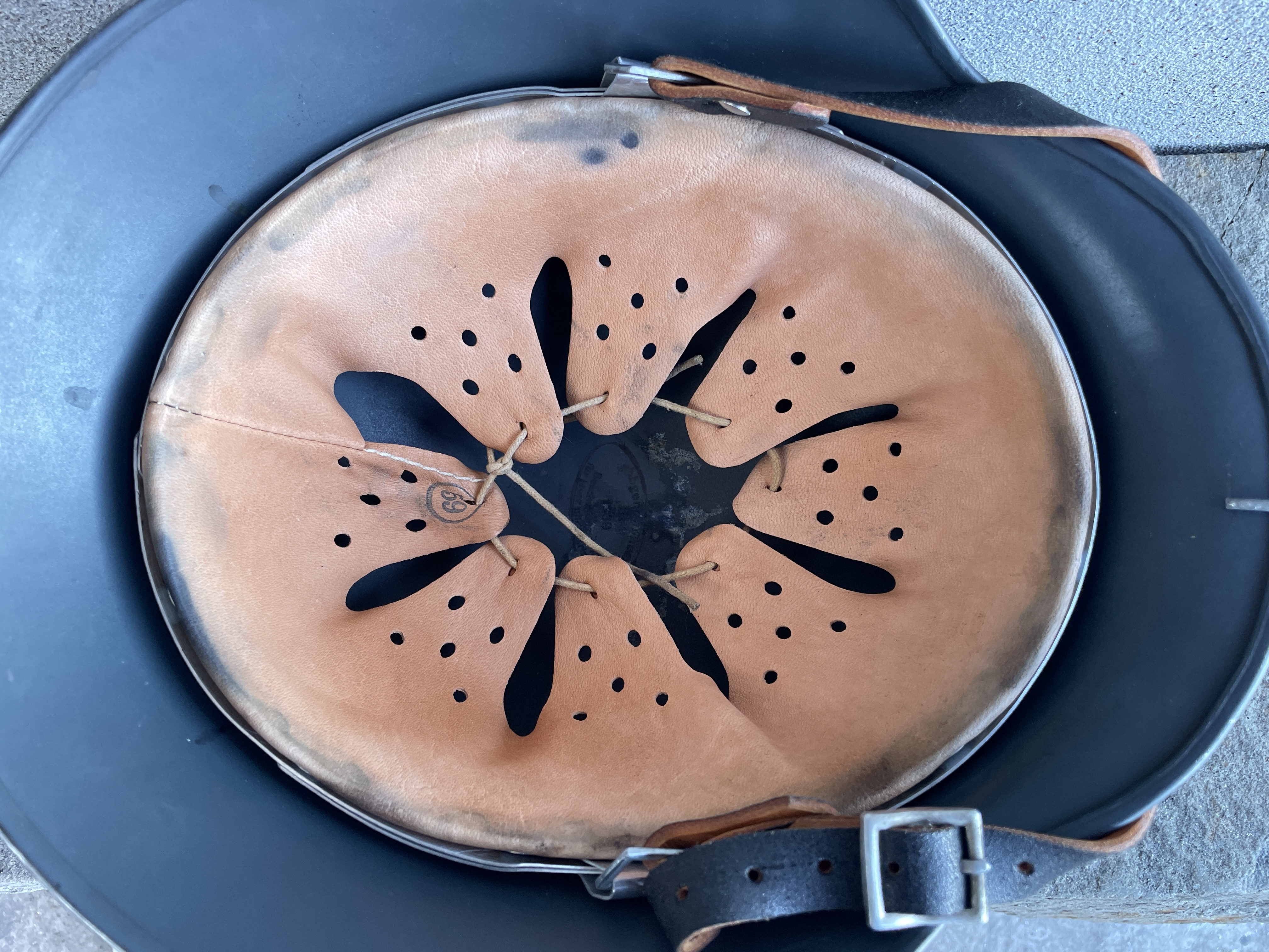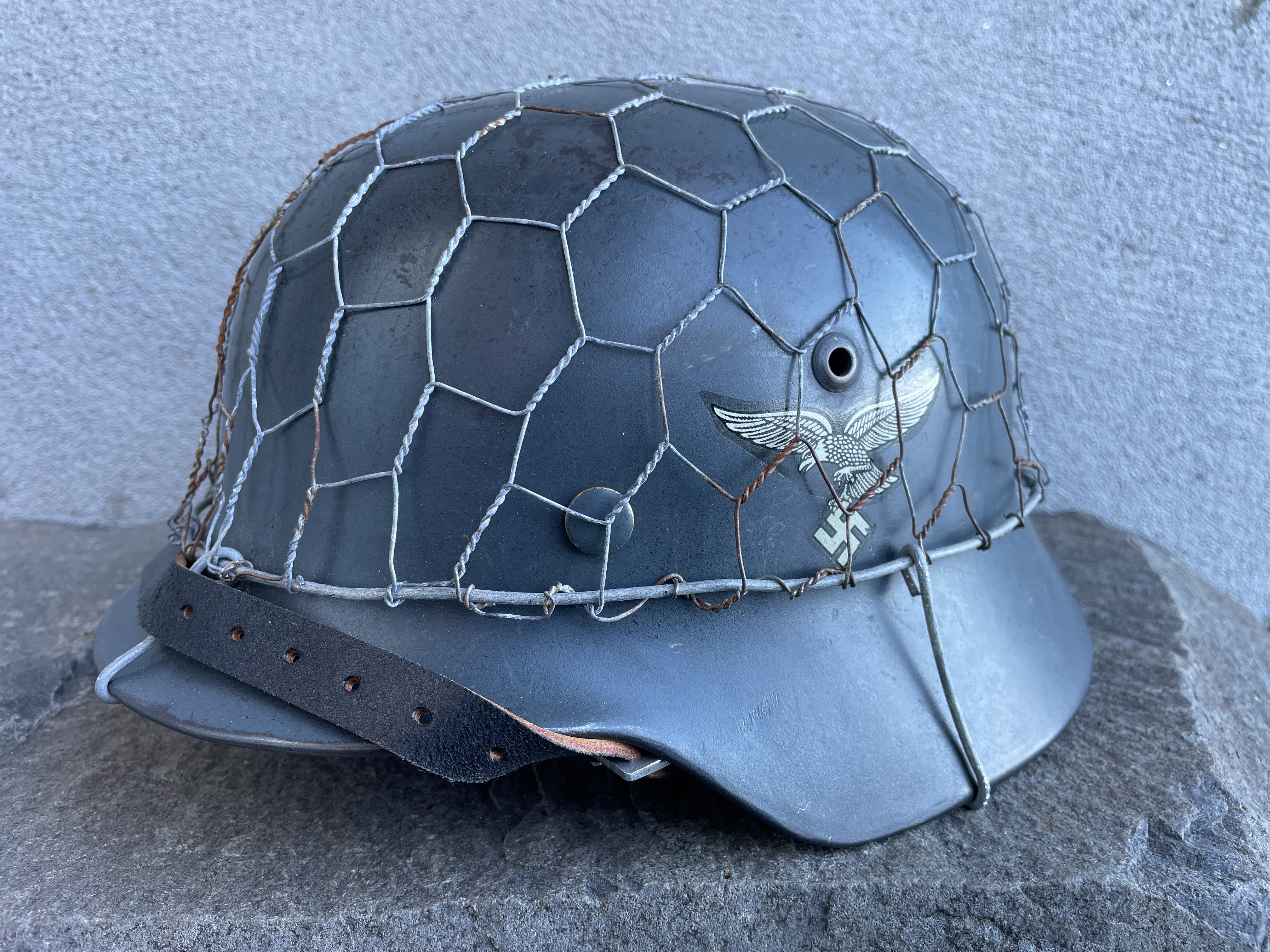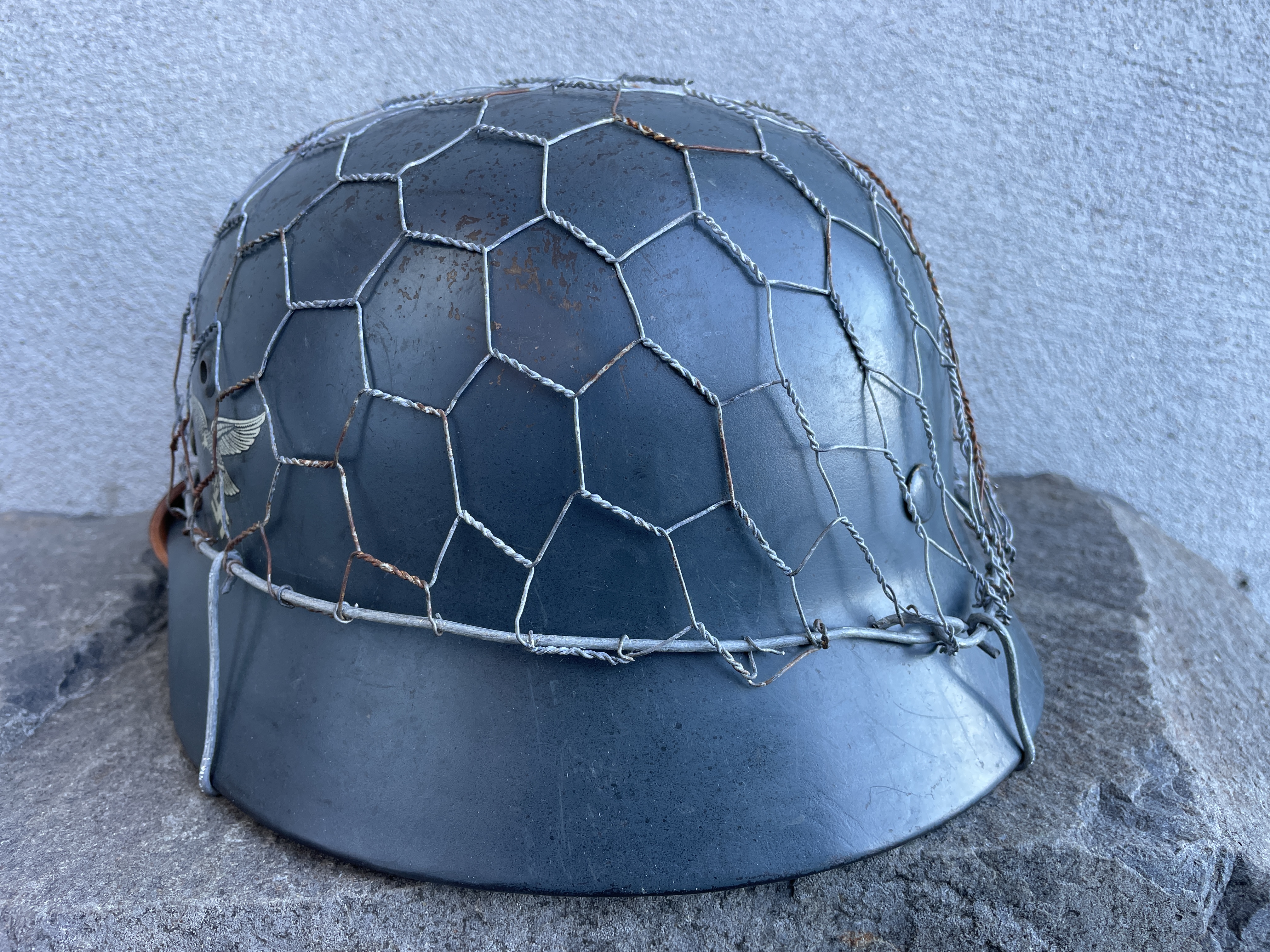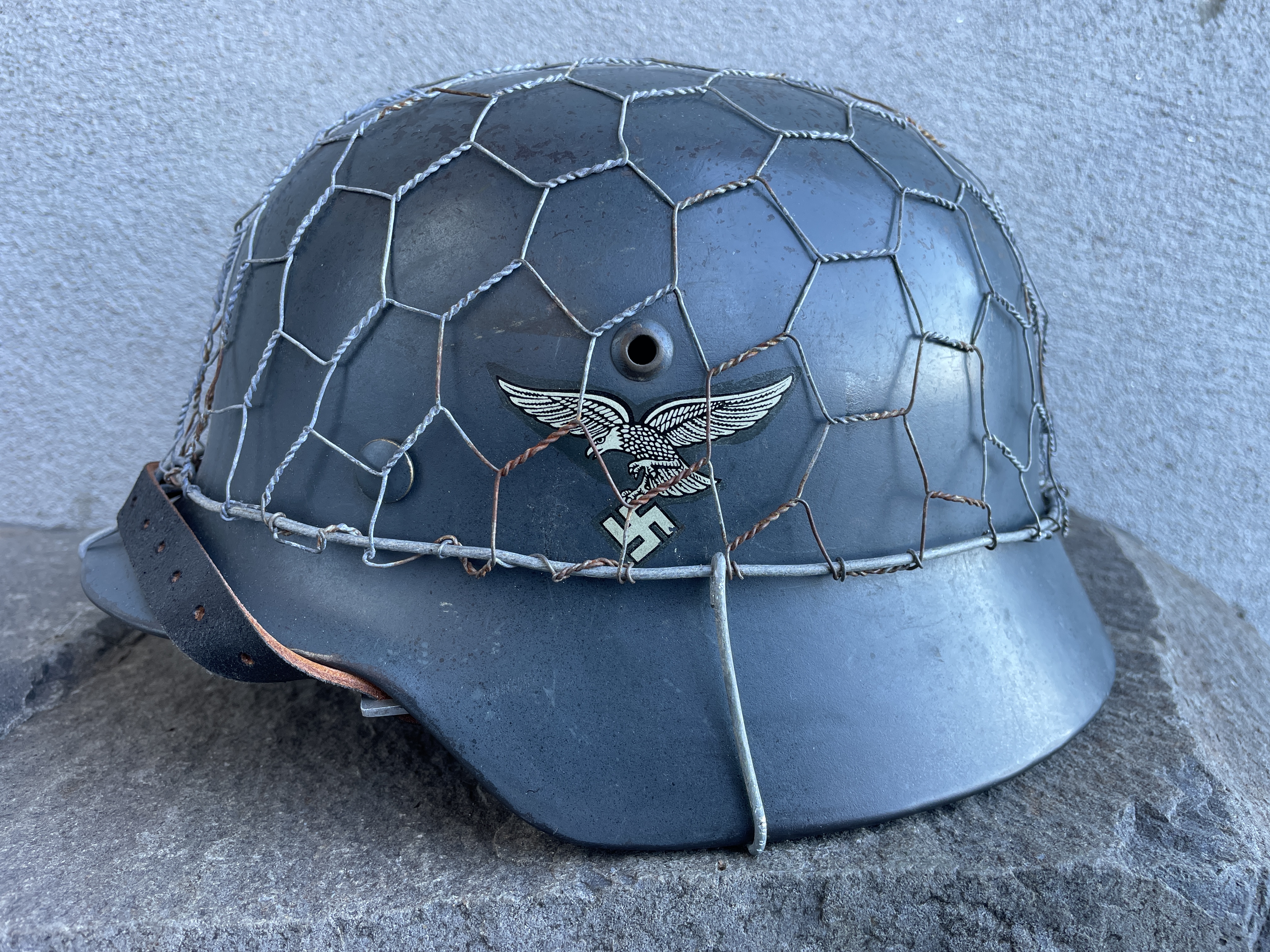 The helmet was painted in RAL 7016 Luftwaffe anthracite blue gray and is an exact match to original since the color code is exact. I went ahead and aged both the half wire basket and over paint and decals to create this batter worn effect. The inside liner is a large size 59 and would fit most men's heads of today.