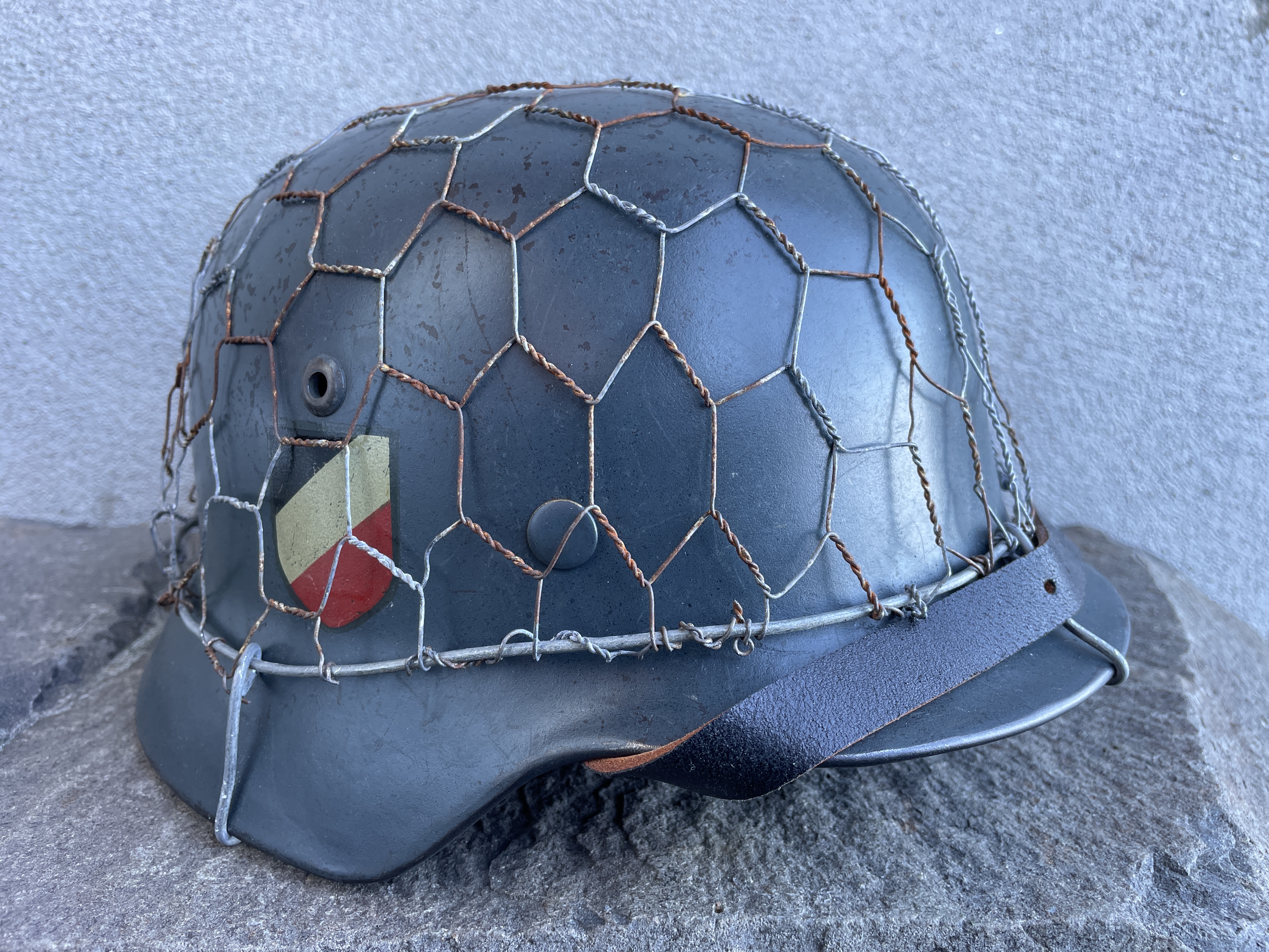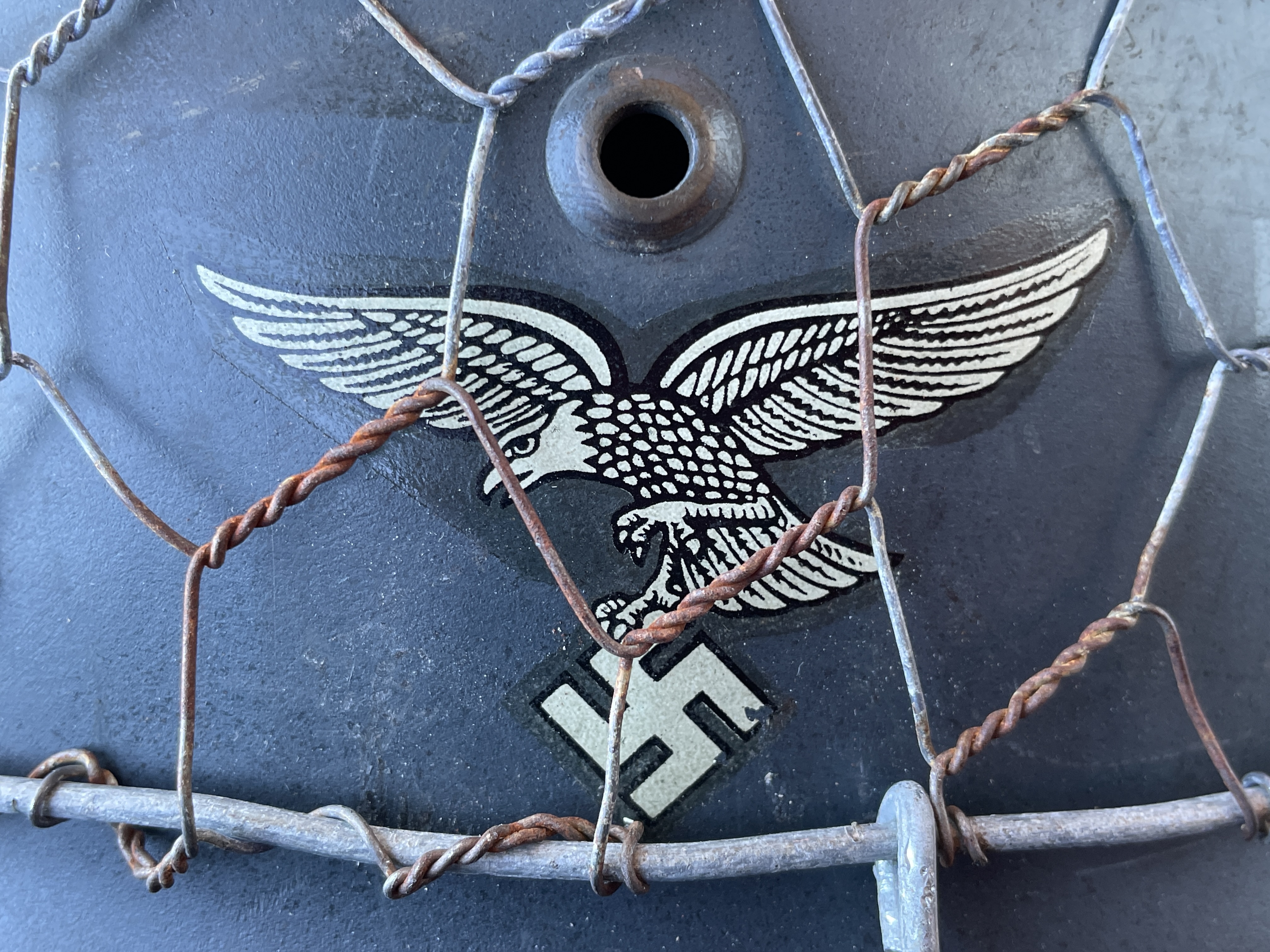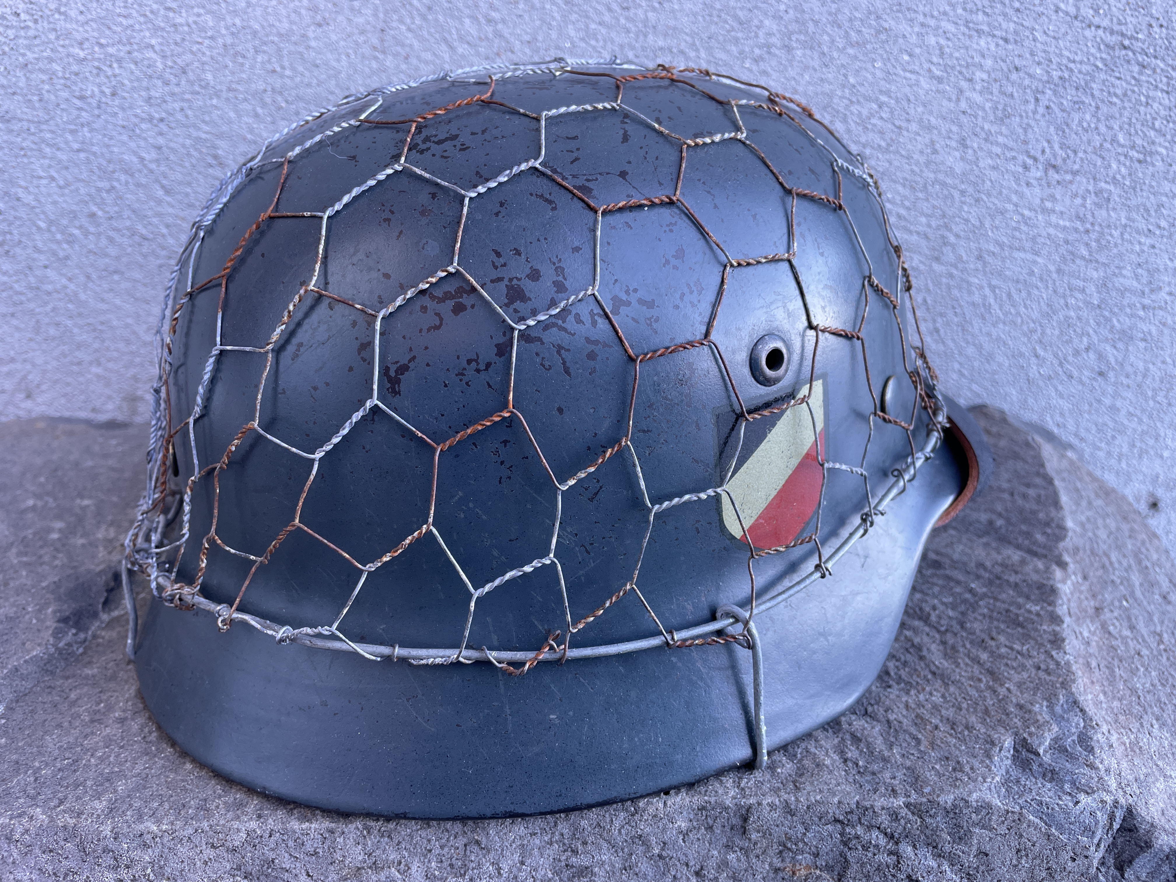The helmet was painted in RAL 7016 Luftwaffe anthracite blue gray and is an exact match to original since the color code is exact. I went ahead and aged both the half wire basket and over paint and decals to create this batter worn effect. The inside liner is a large size 59 and would fit most men's heads of today.