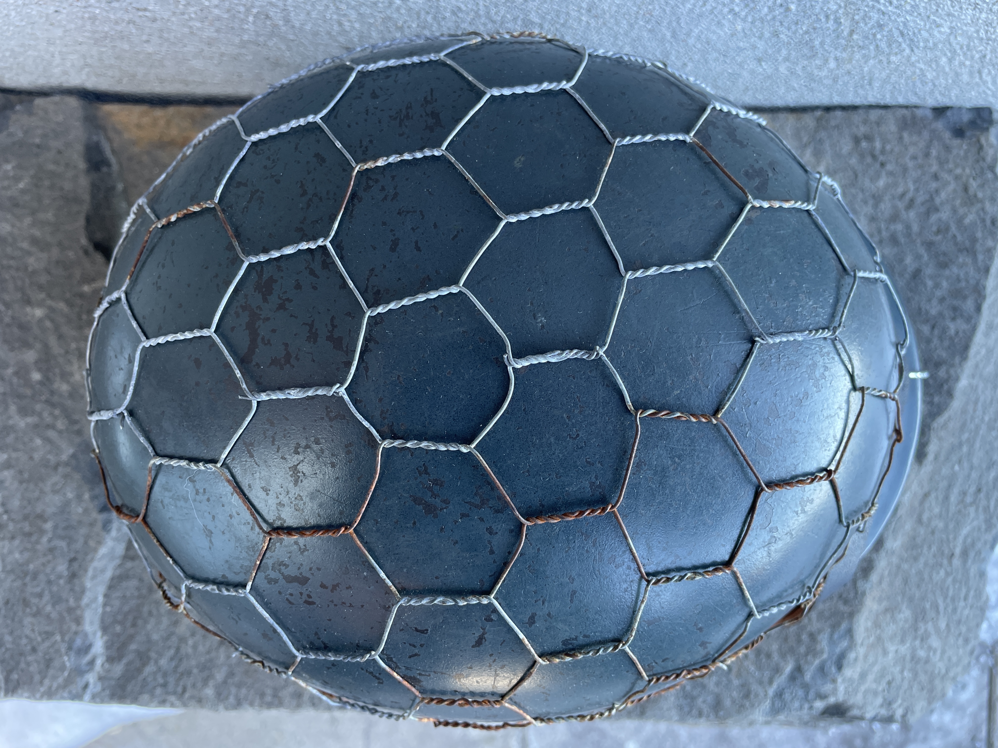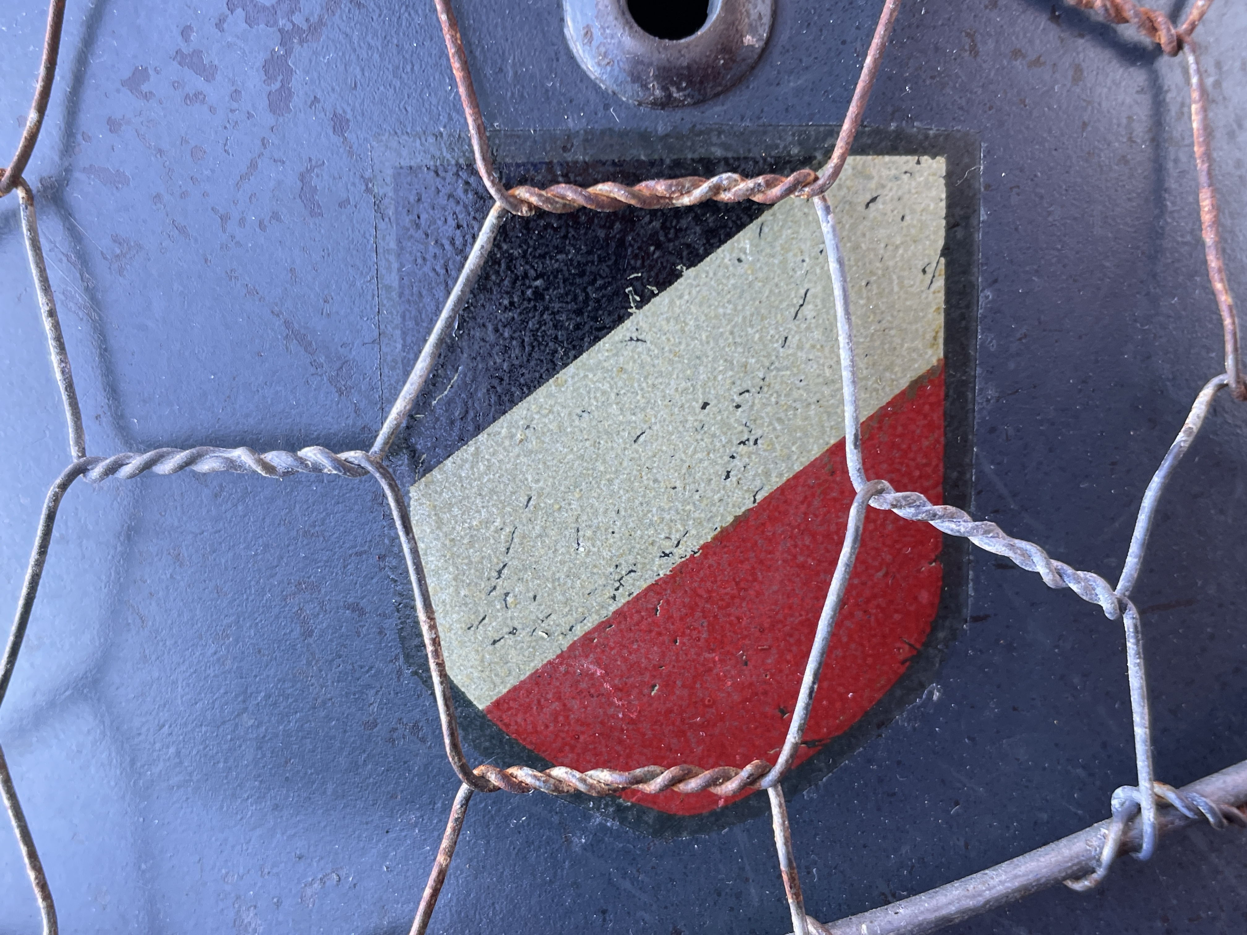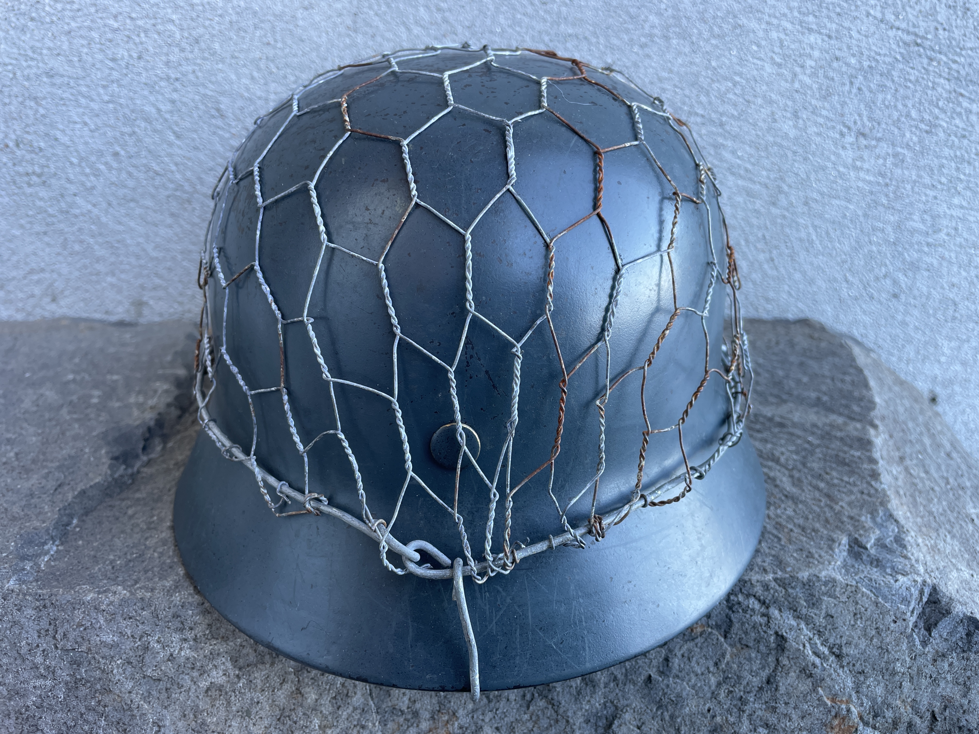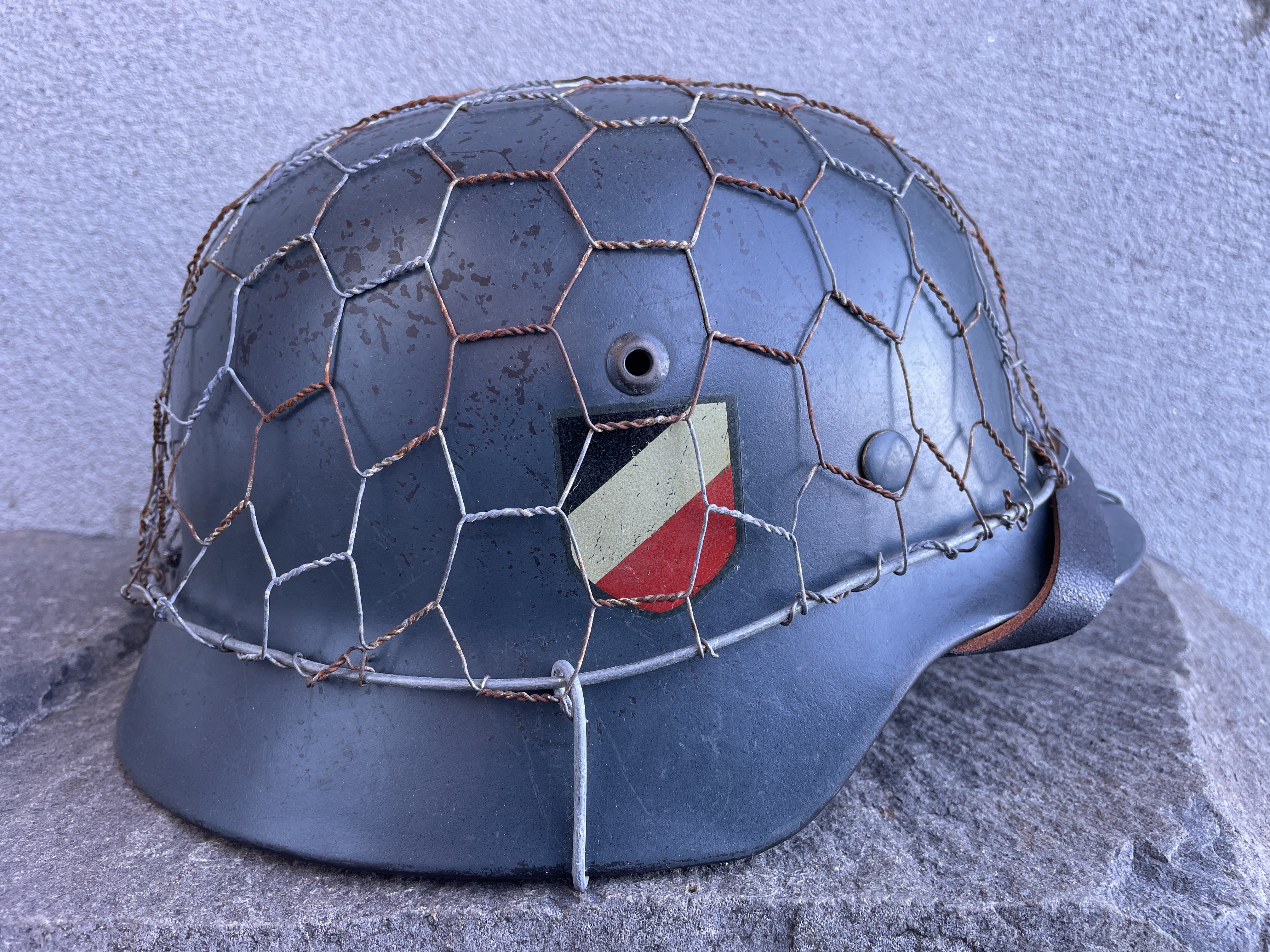 The helmet was painted in RAL 7016 Luftwaffe anthracite blue gray and is an exact match to original since the color code is exact. I went ahead and aged both the half wire basket and over paint and decals to create this batter worn effect. The inside liner is a large size 59 and would fit most men's heads of today.