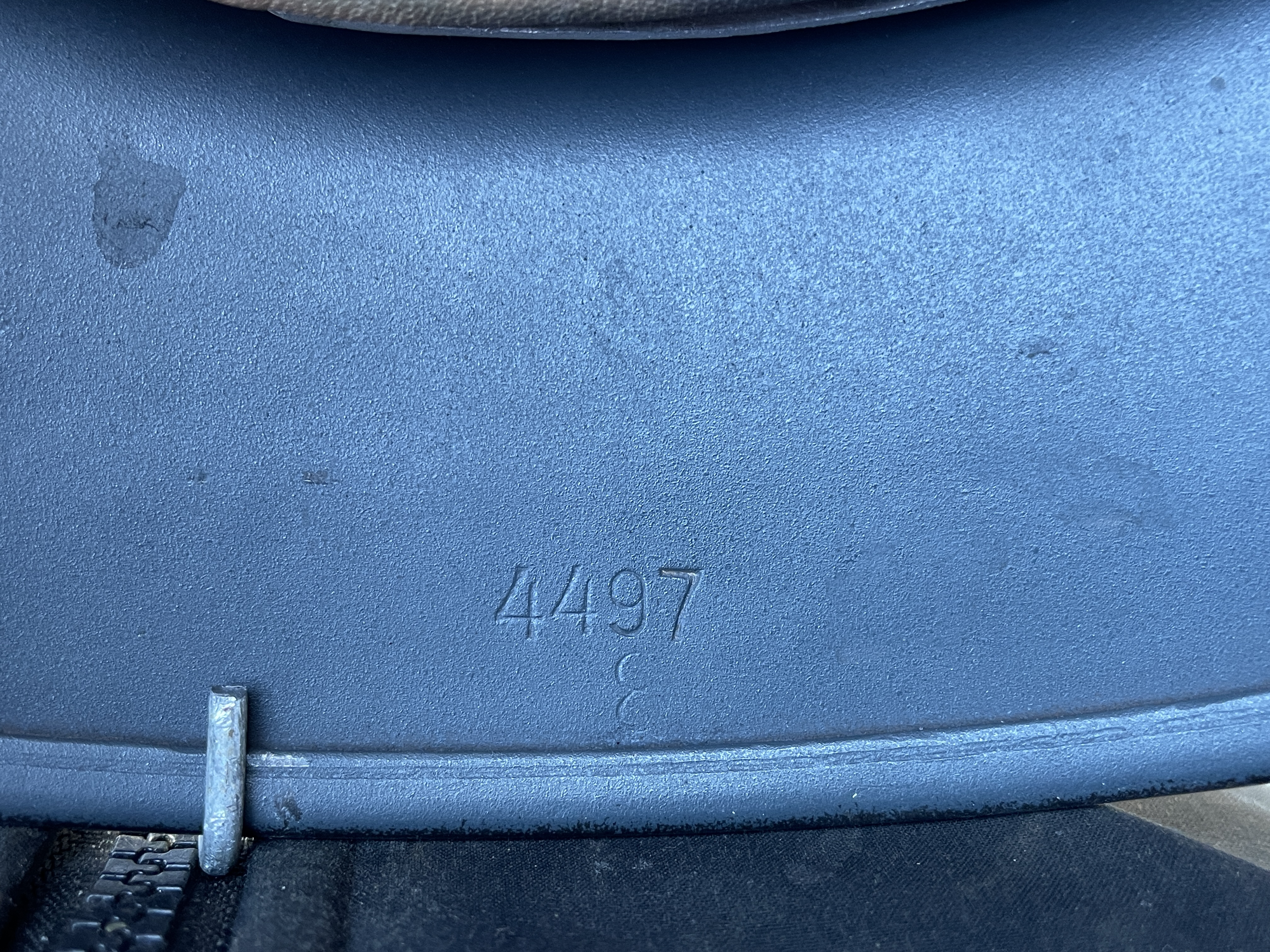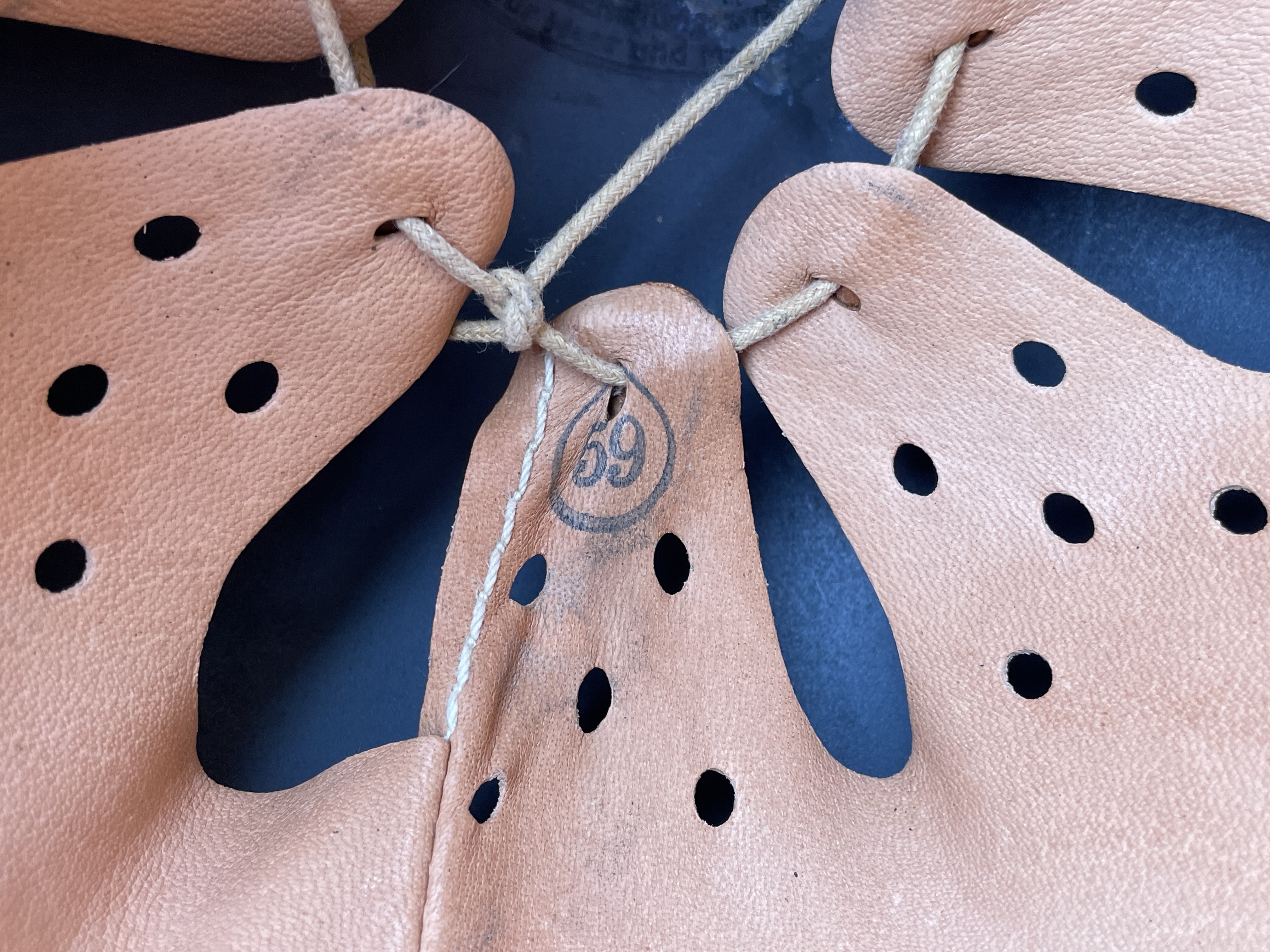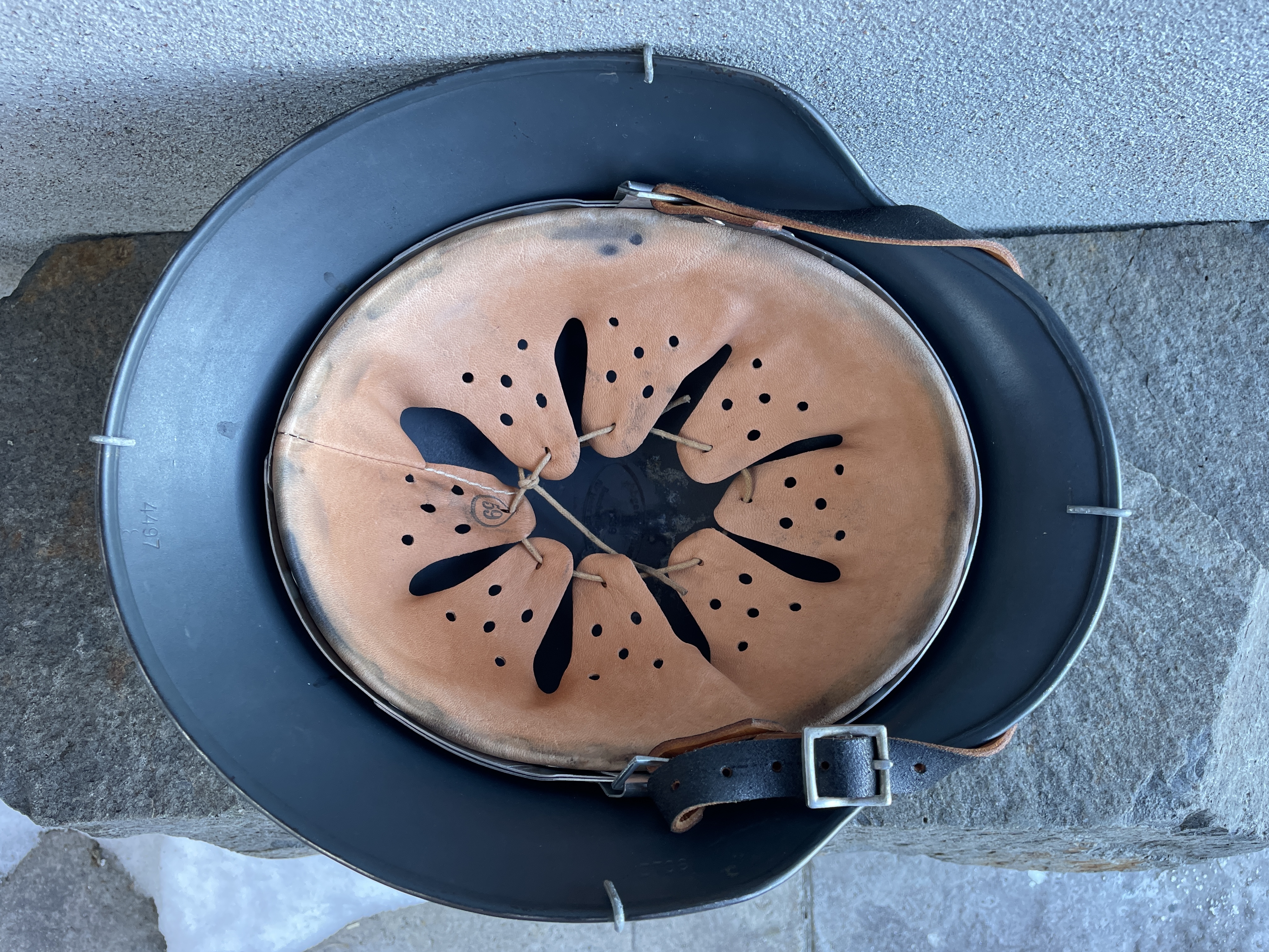 (Every original German helmet produced from 1935 to 45 had two factory stampings punched into the side and rear or both in the rear. The alpha numeric number refers to the factory location and the inside metric circumference in centimeters. The rear lot number refers to the production run and was used as a quality control measure. The font styles used at each factory were slightly different but highly consistent throughout the war and so fakes or reproductions will either not have these numbers at all or they will use the wrong font style or letter spacing and so are easily identified as post war made.)