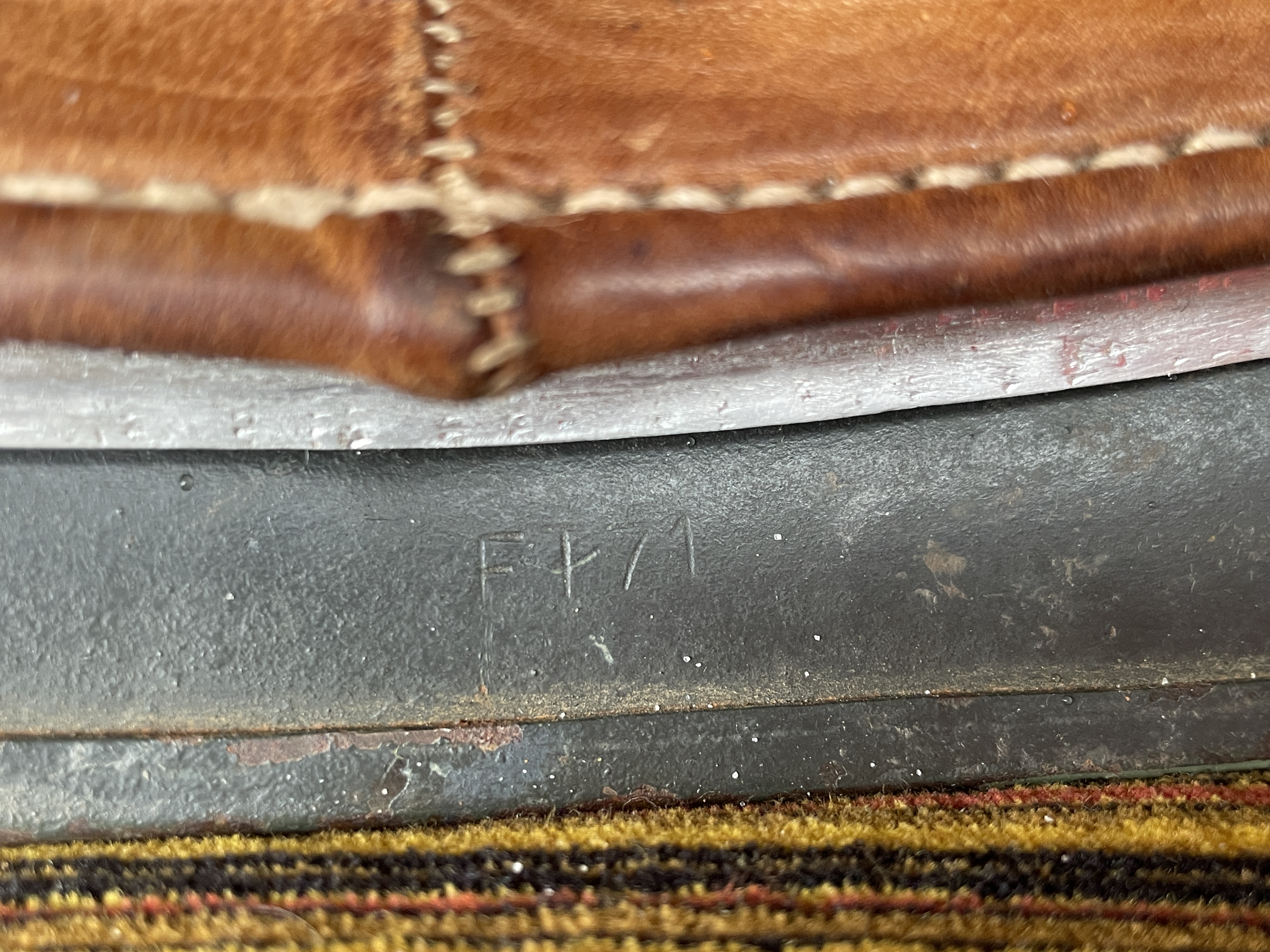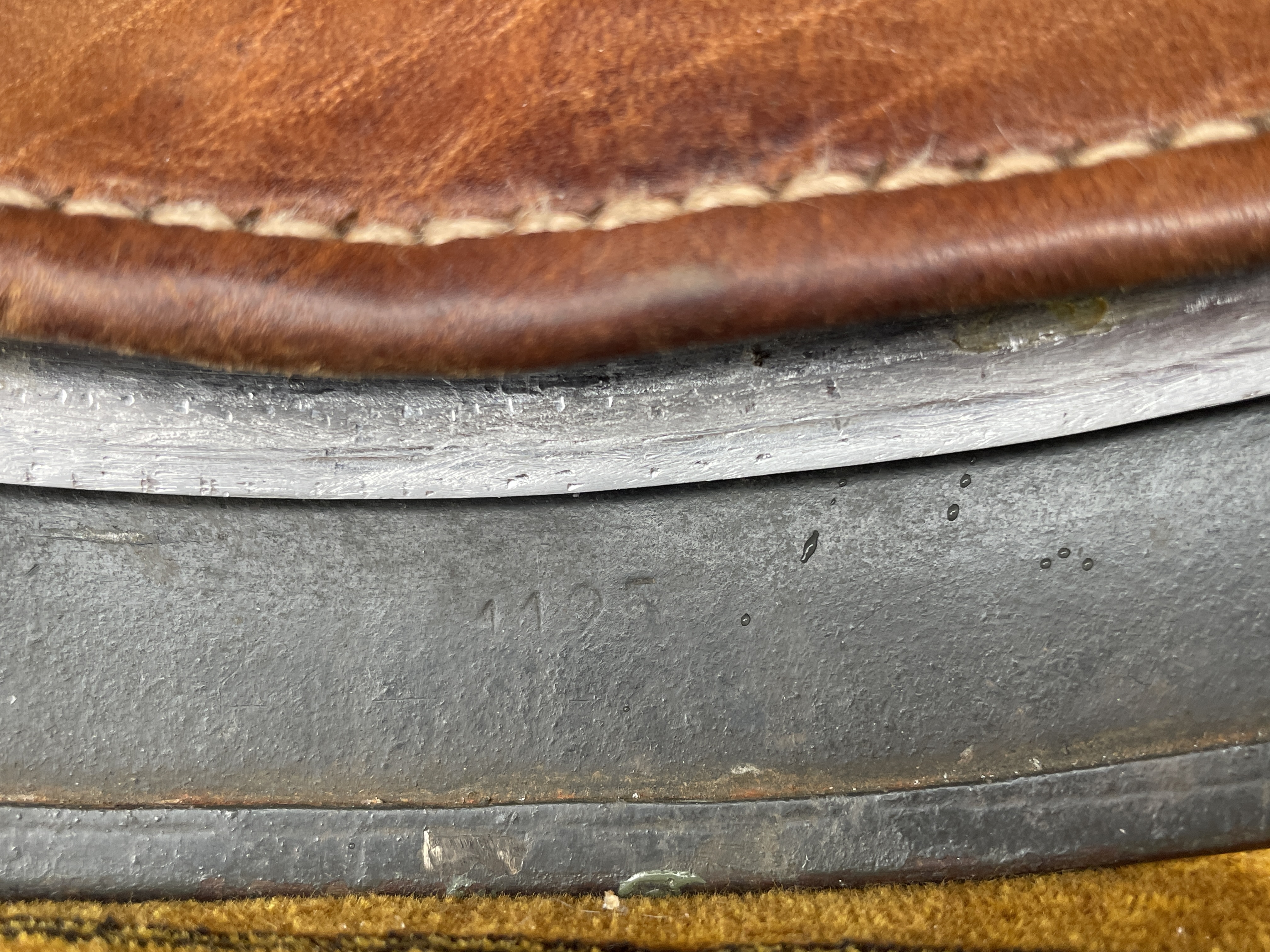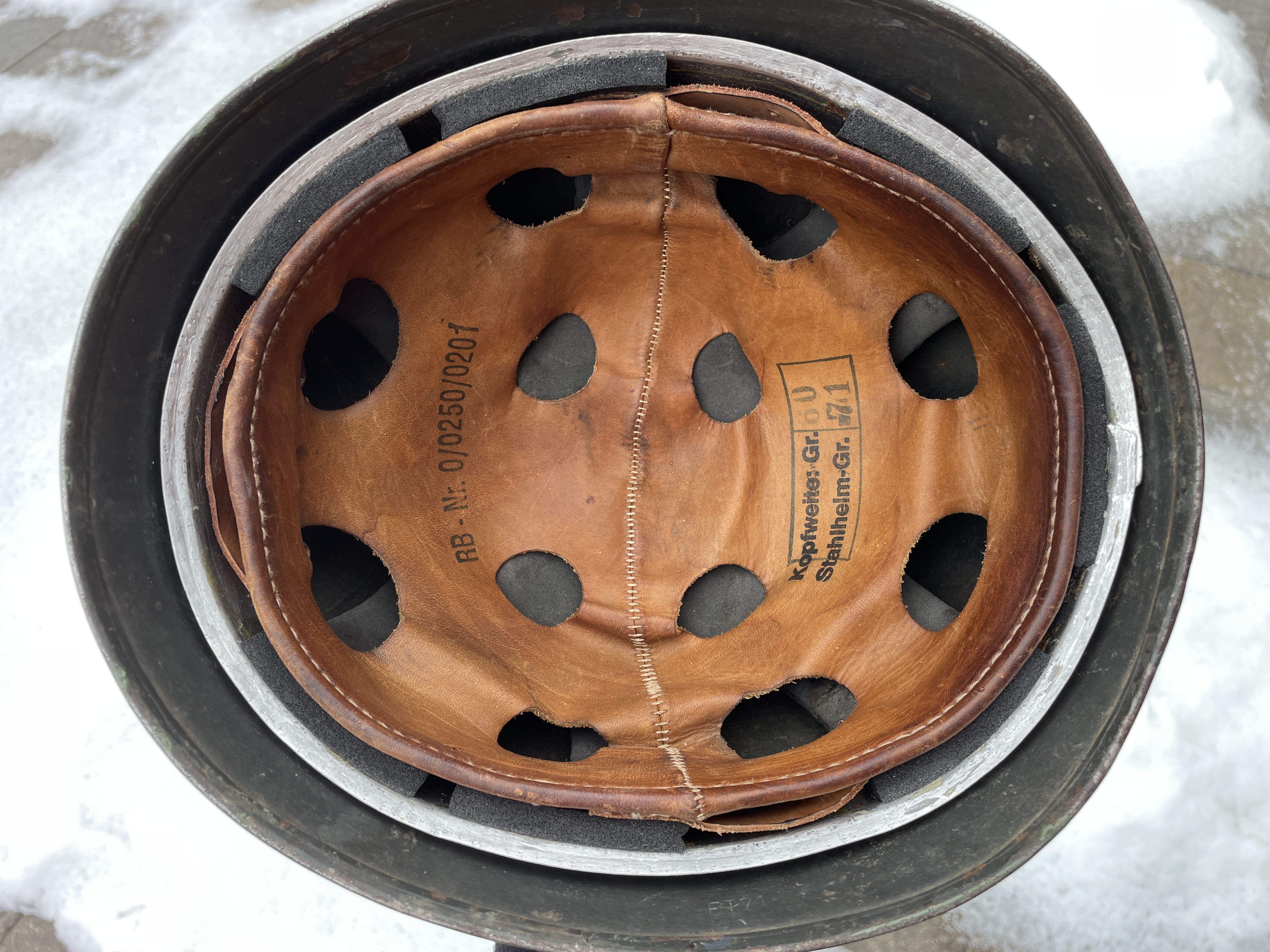 (Every original German helmet produced from 1935 to 45 had two factory stampings punched into the side and rear or both in the rear.  The alpha numeric number refers to the factory location and the inside metric circumference in centimeters.  The rear lot number refers to the production run and was used as a quality control measure. The font styles used at each factory were slightly different but highly consistent throughout the war and so fakes or reproductions will either not have these numbers at all or they will use the wrong font style or letter spacing and so are easily identified as post war made.)