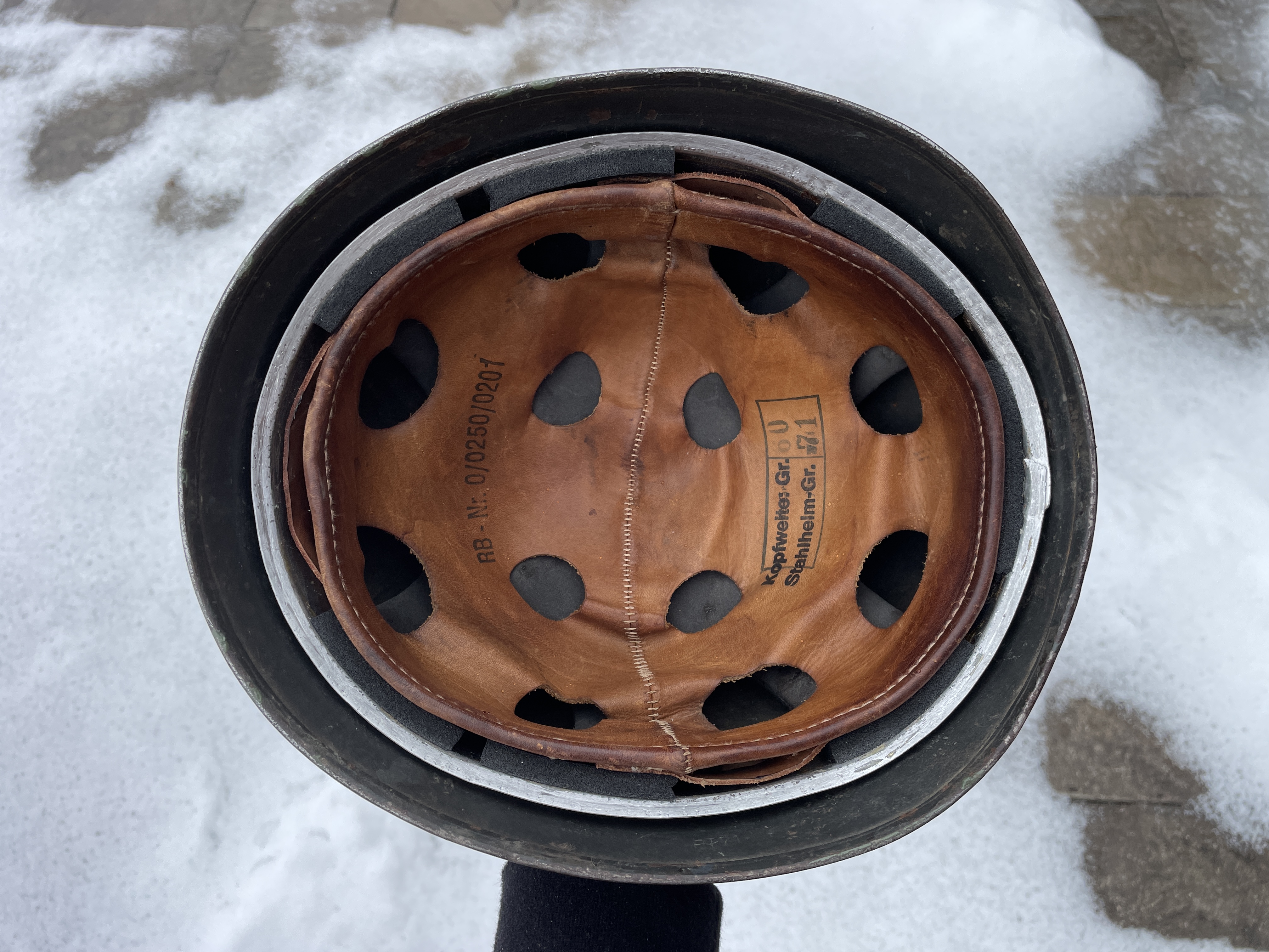 This helmet was originally located from a long time collector out of California via his late estate then passed it on down to his eldest daughter who then sold it to me among several other helmets that will be listed shortly. The helmet arrived in several layers of post war paint and was stripped down to bare metal and then repainted first in it's factory RAL 7016 matte blue gray enamel paint followed by multiple layers of historically accurate camo paint. The camo scheme closely mimics ones seen in textbooks sourced from the battlefields of Anzio or from the fields of France in a beautiful 3 tone double green and a brownish auburn violet.