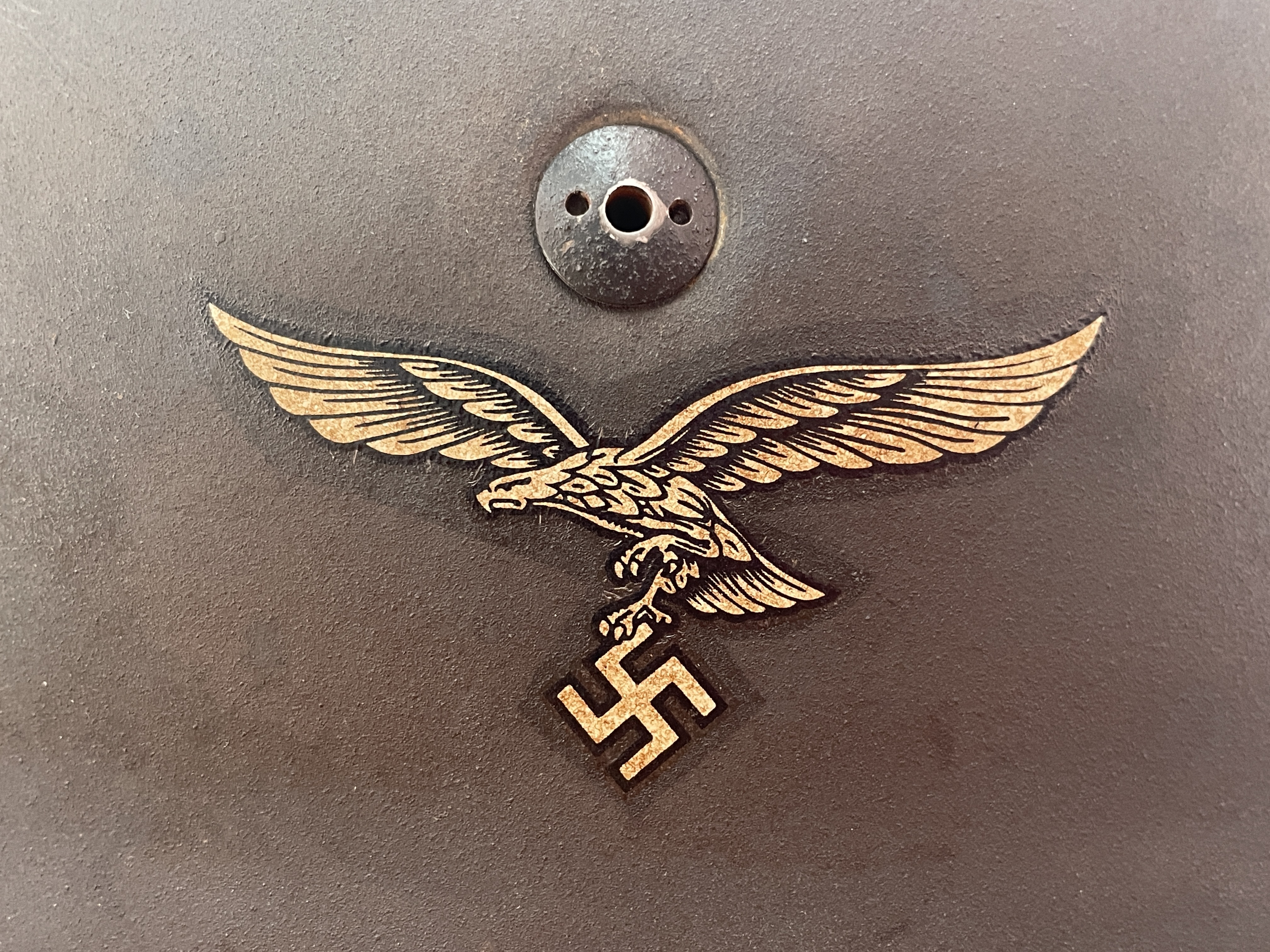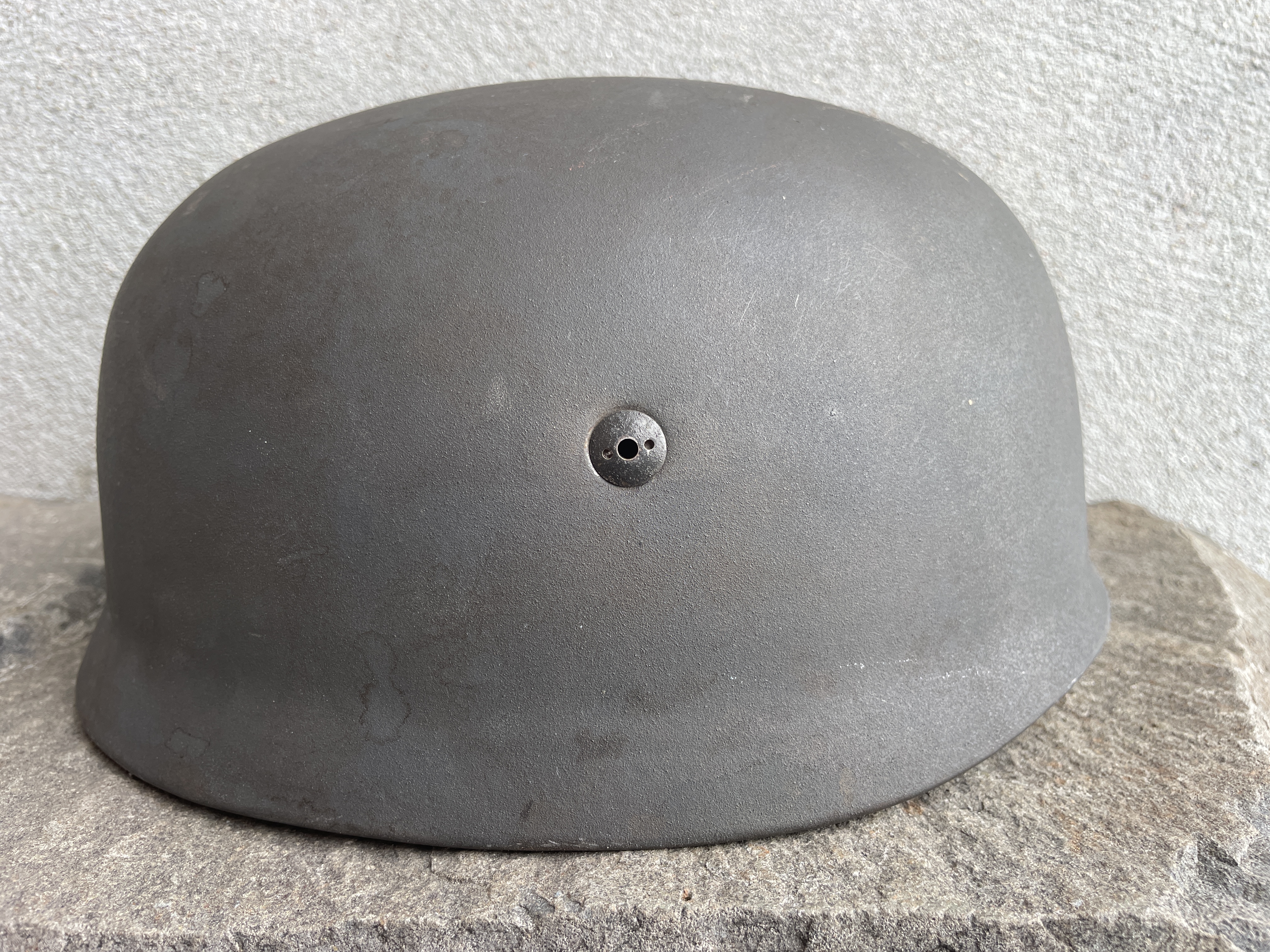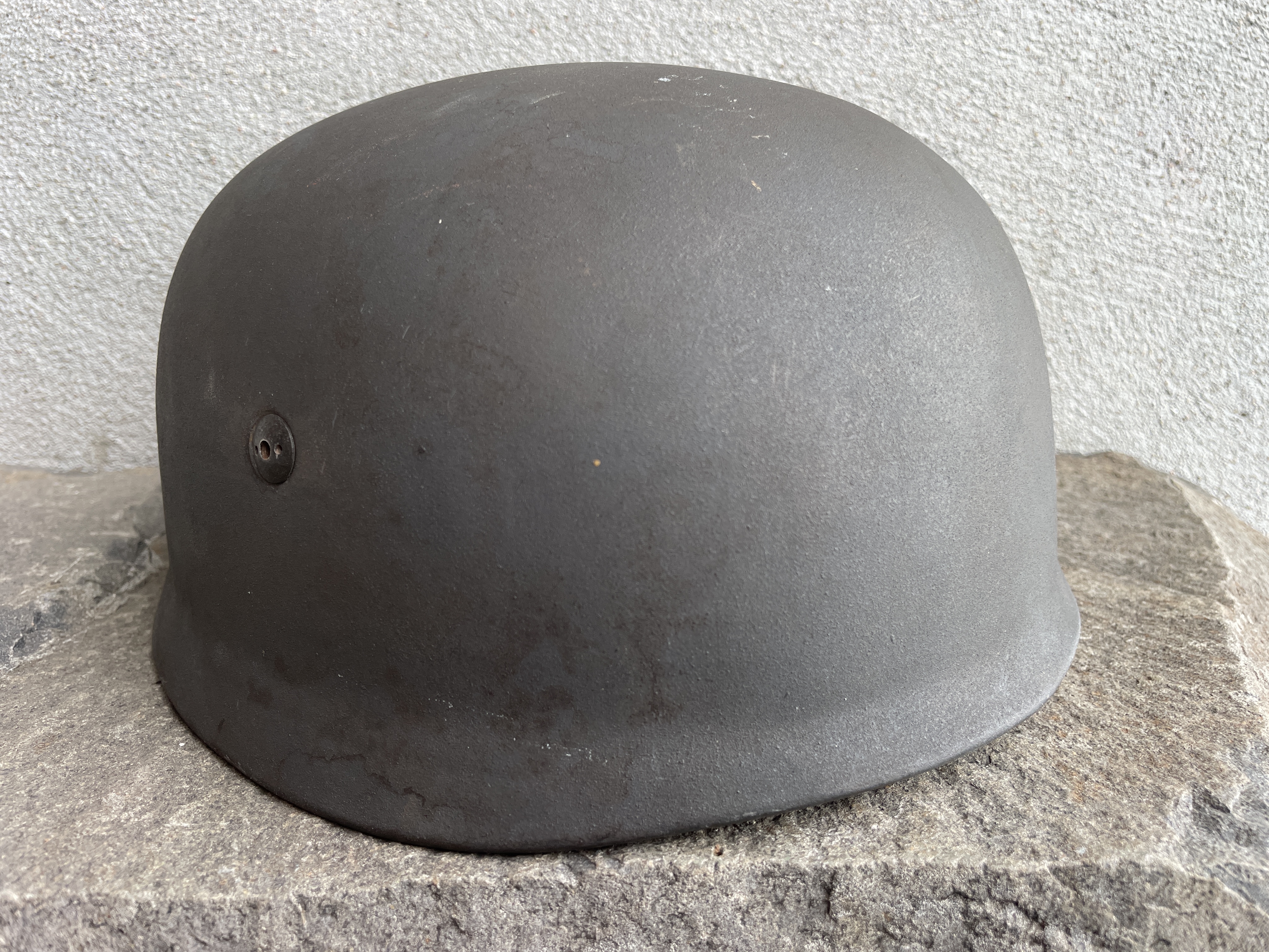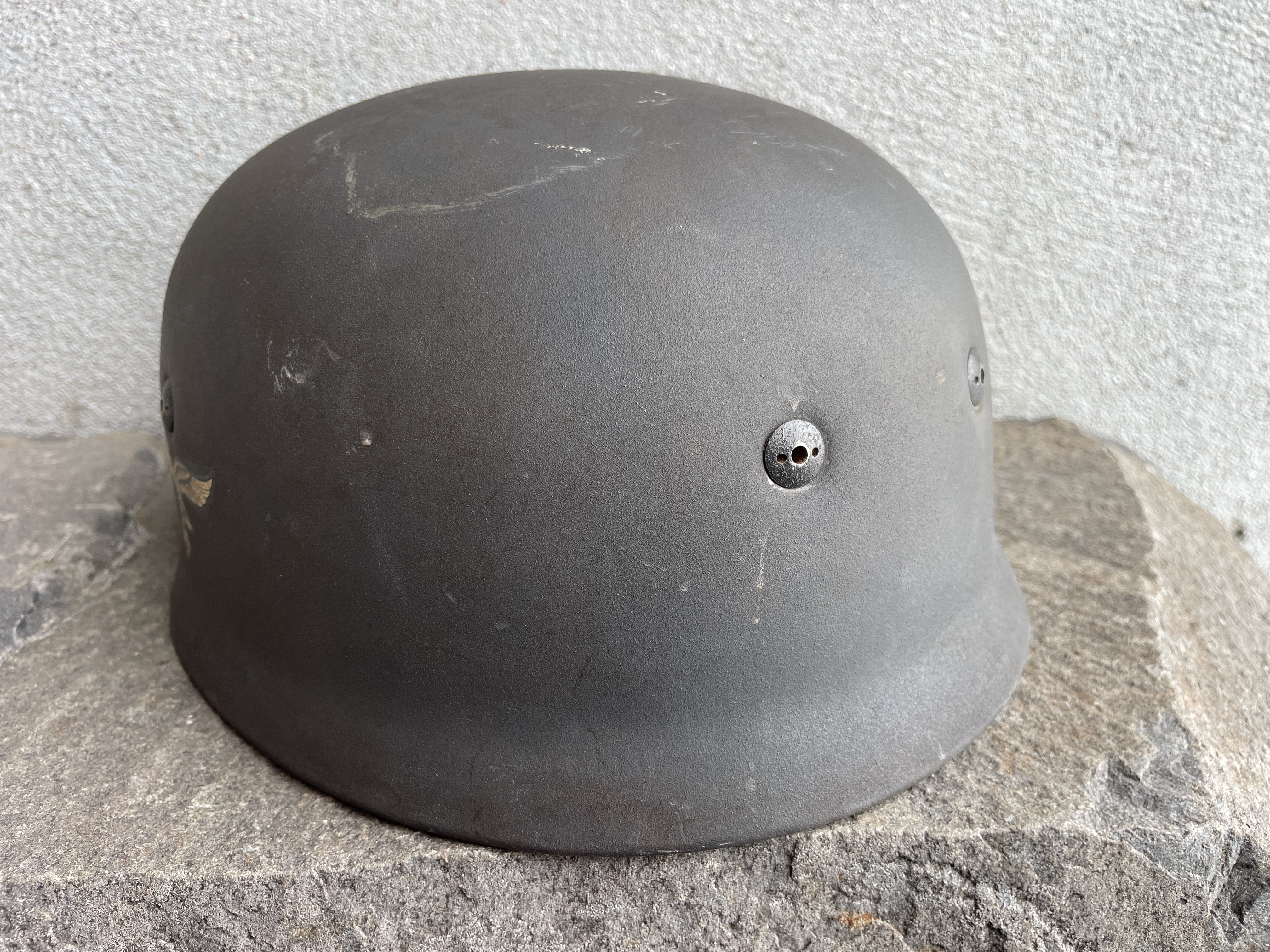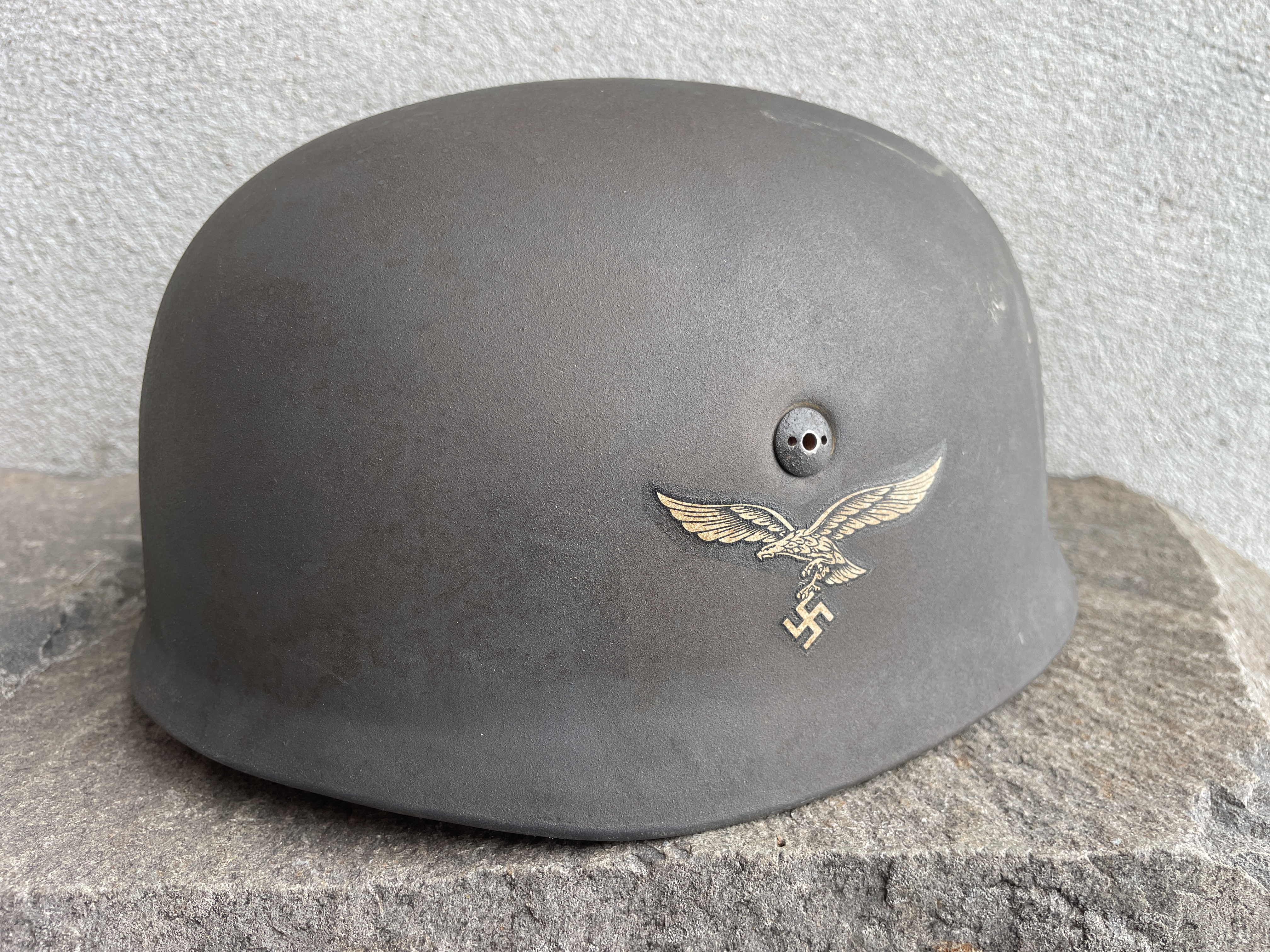 This helmet was originally located from a long time German re-eanctor and was repainted in the correct Luftwaffe textured RAL 7016 (Anthrazitgrau) dark blue gray color in a matte enamel finish. A single factory ET Ader decal was then added and aged to blend in with the rest of the helmet.