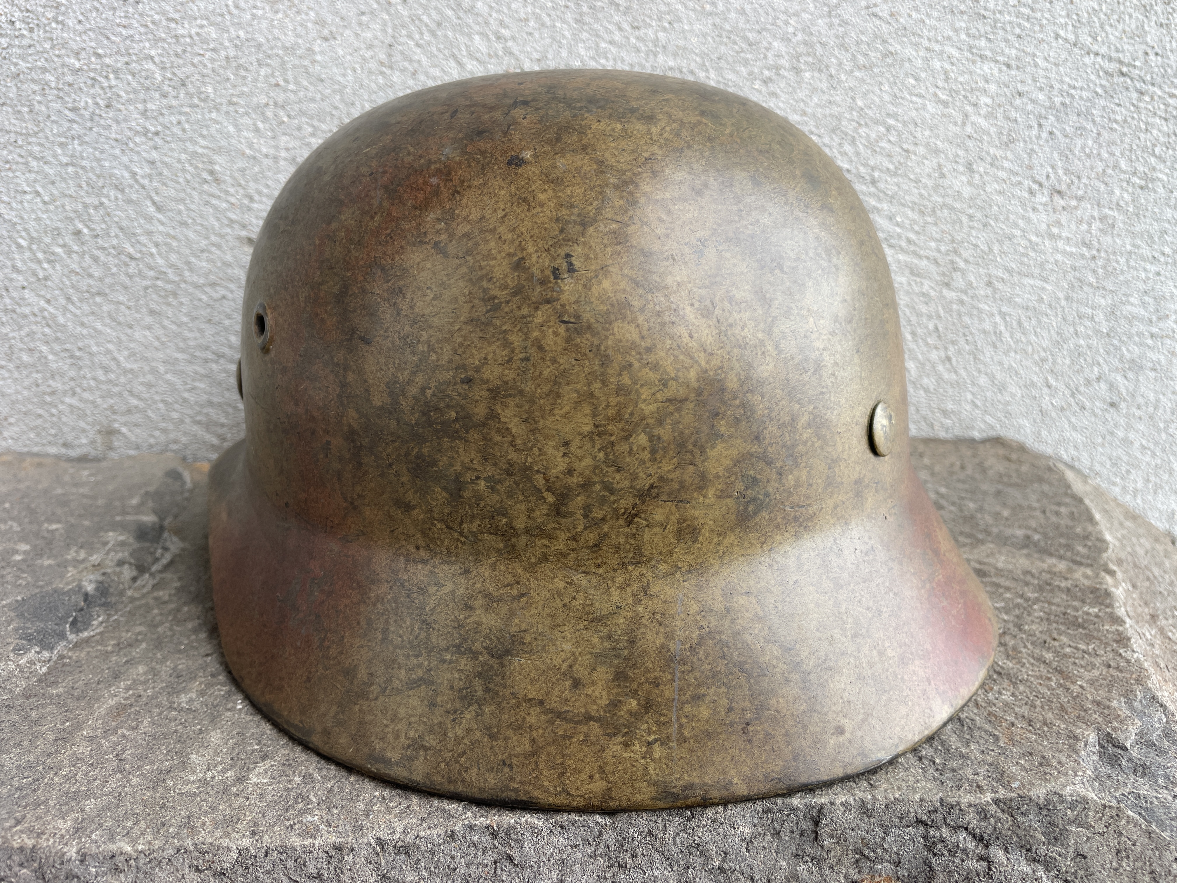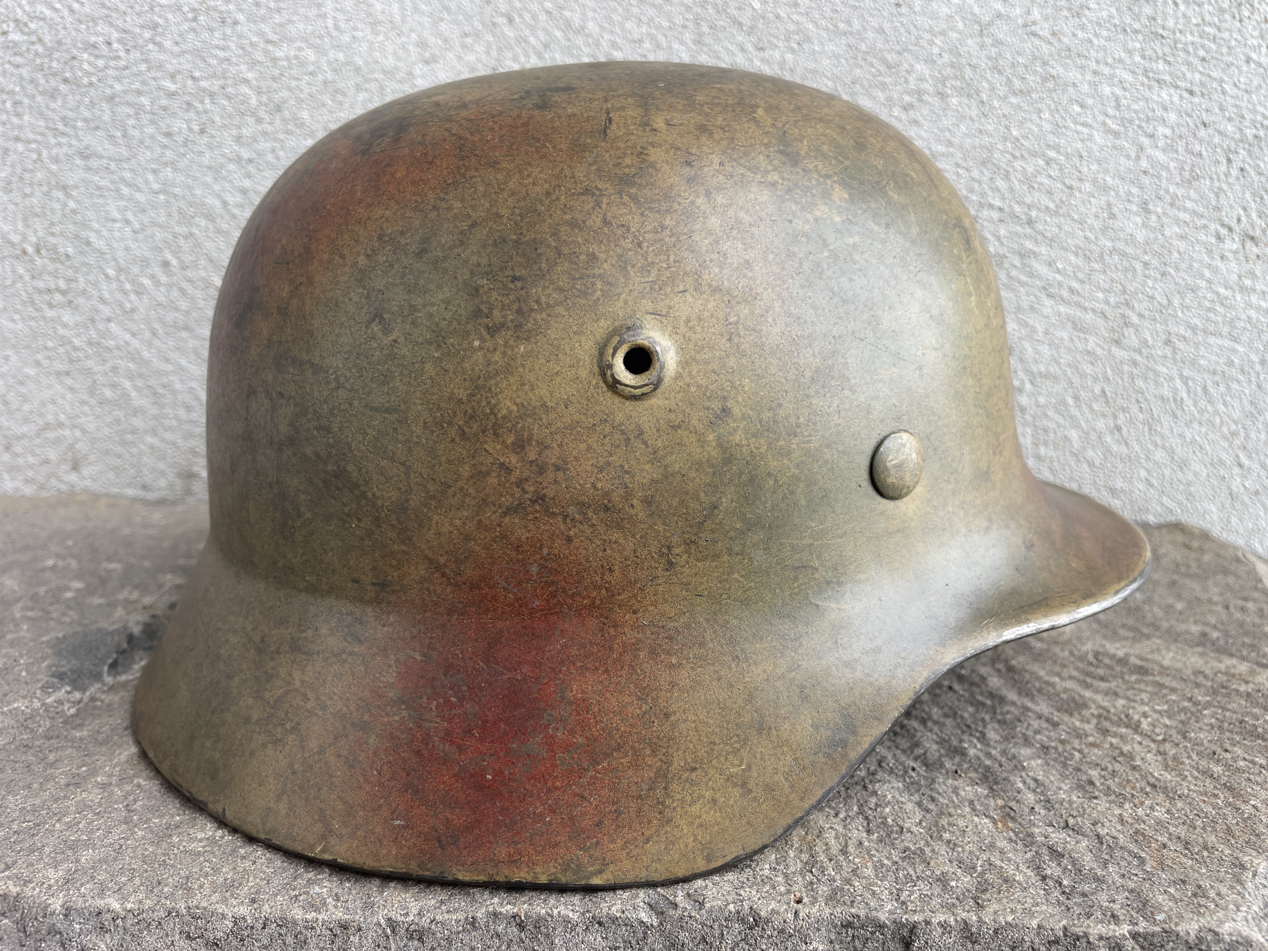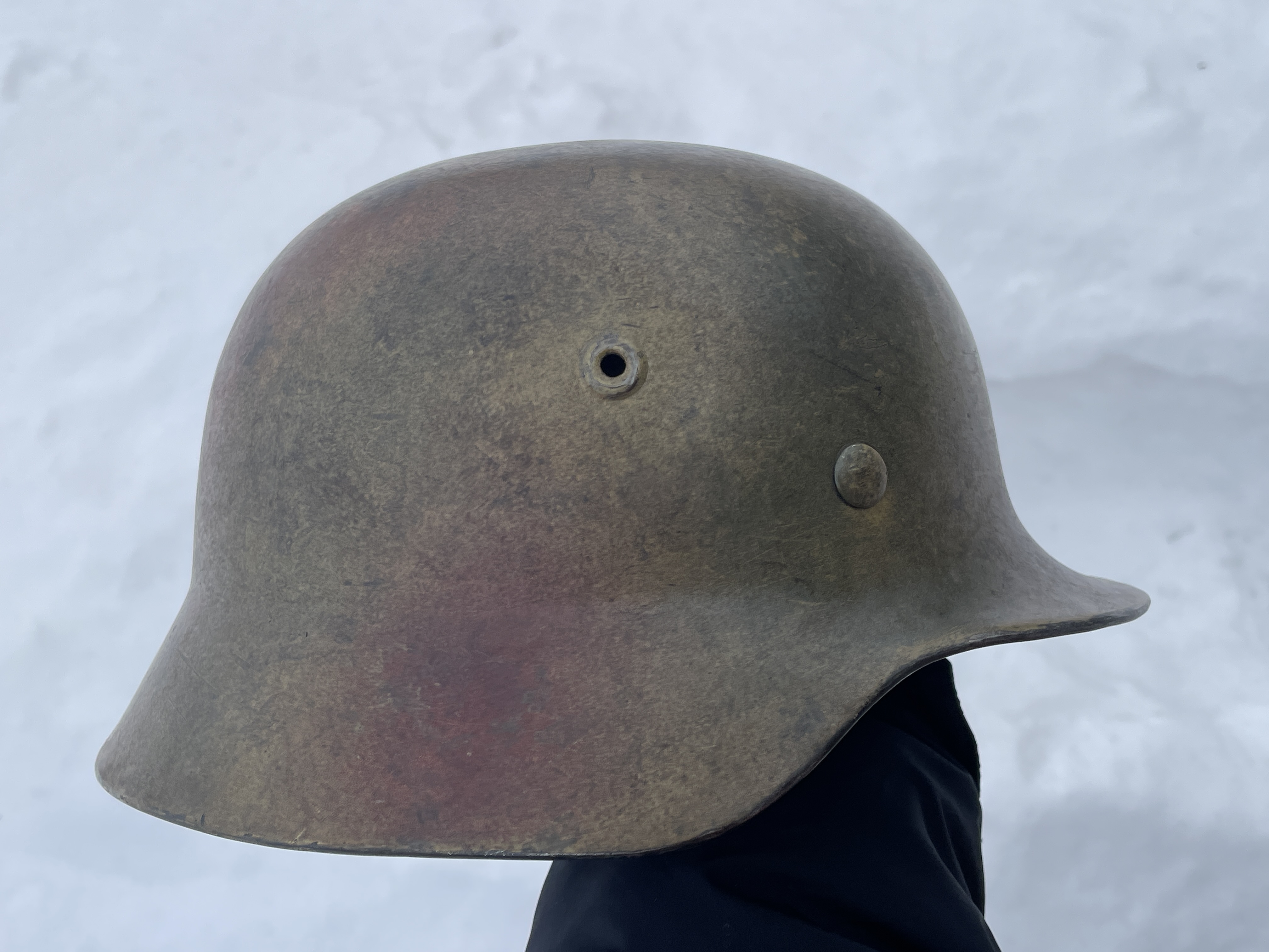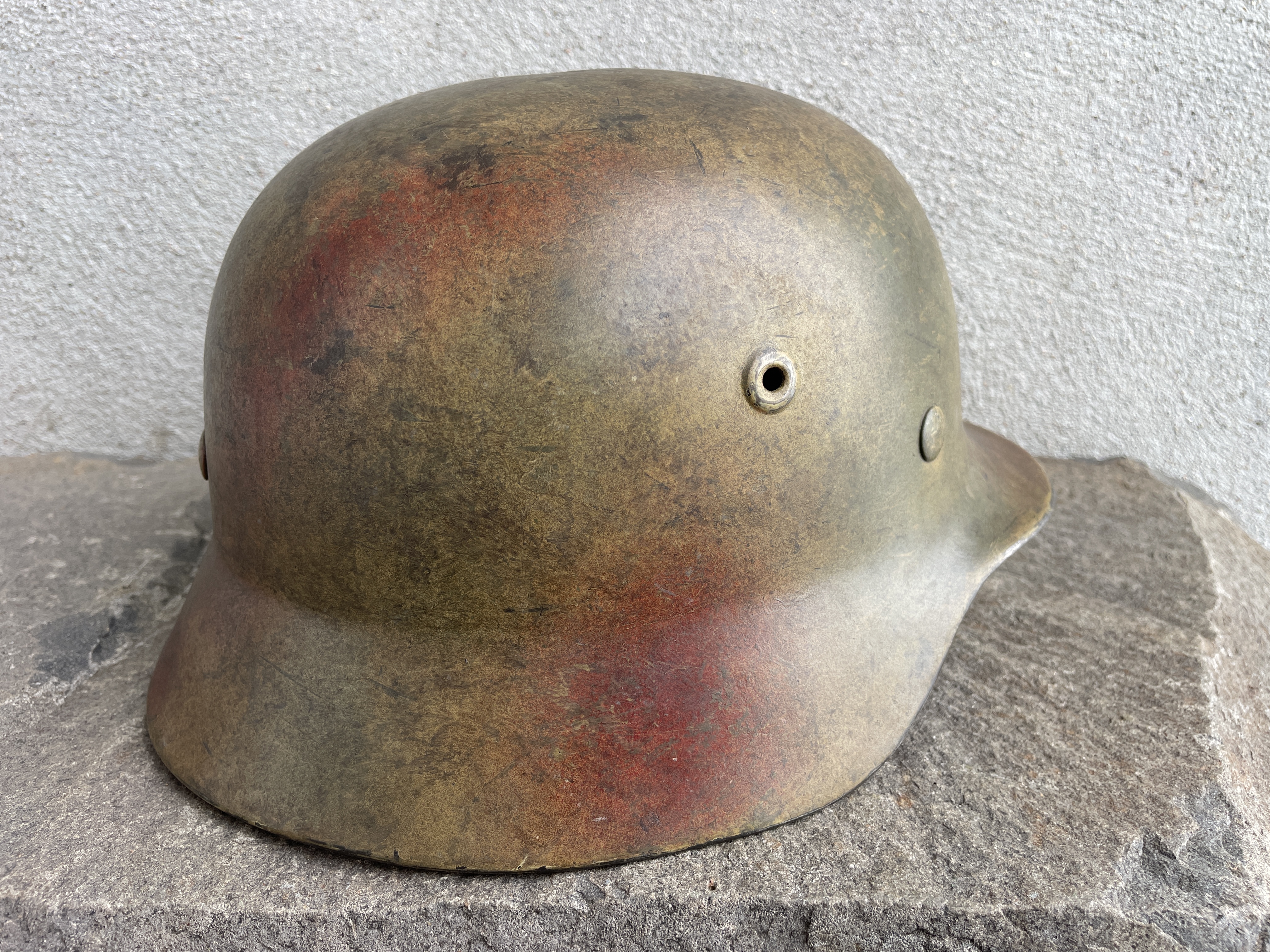 When I first received this helmet nearly all of the outside paint and Heer eagle were worn away over time. A good customer of mine sent it to me for a museum level restoration on a big budget and wanted it to represent a top of the line three color Normandy camo pattern. I went ahead and did the work but unfortunately his marriage fell into hard times and he abandoned the project with me I guess saving his Harley's was more of a priority now.