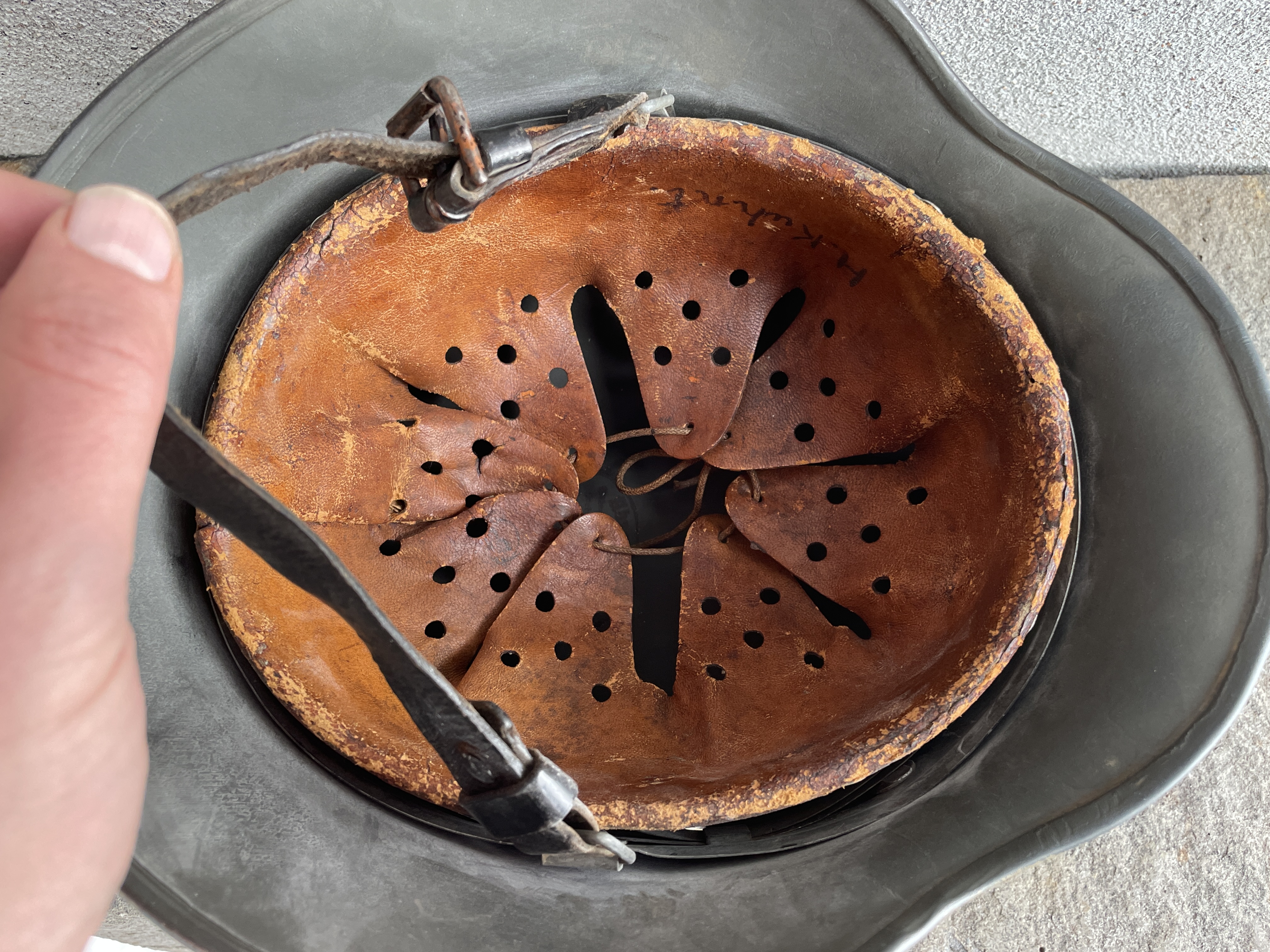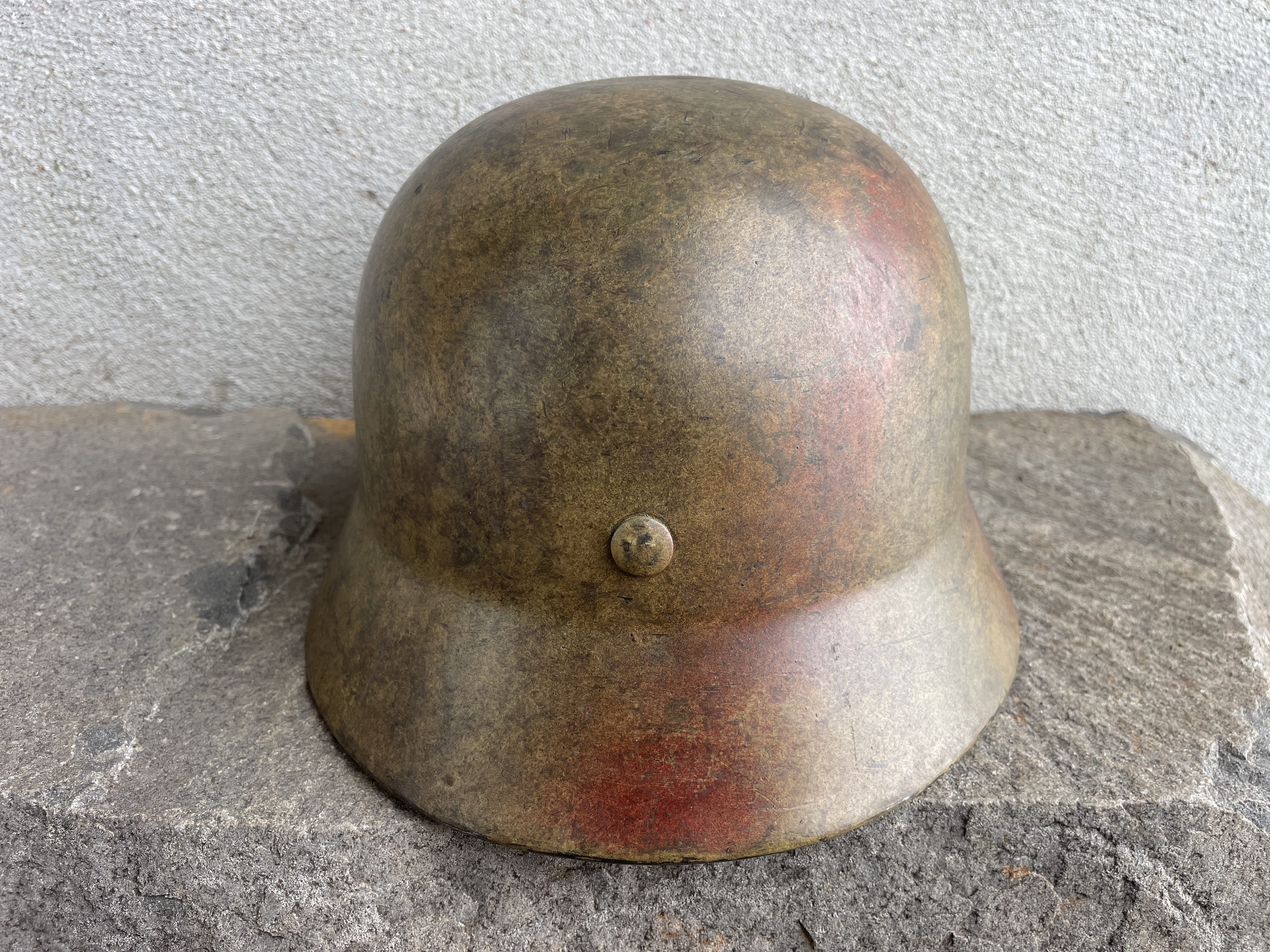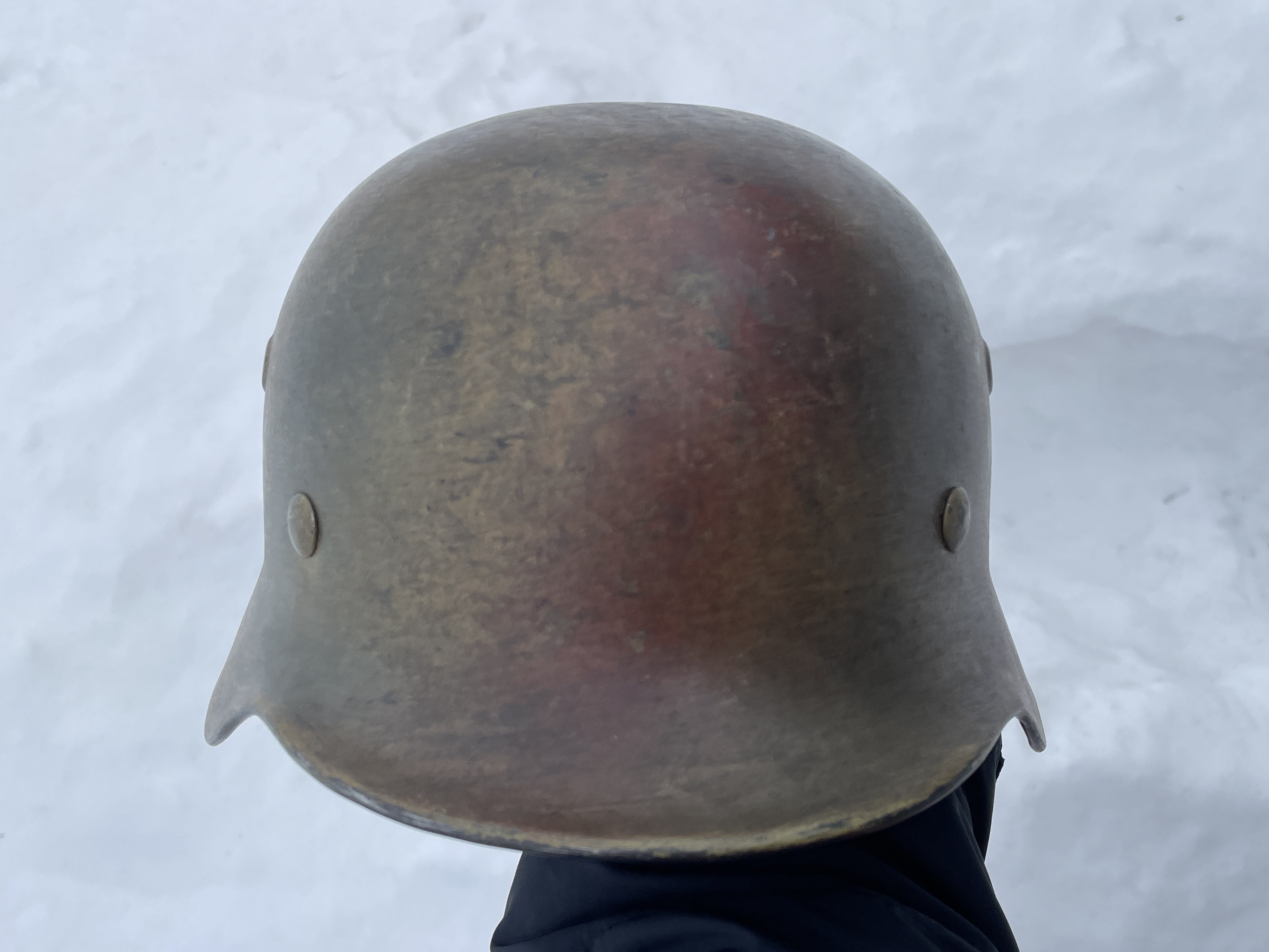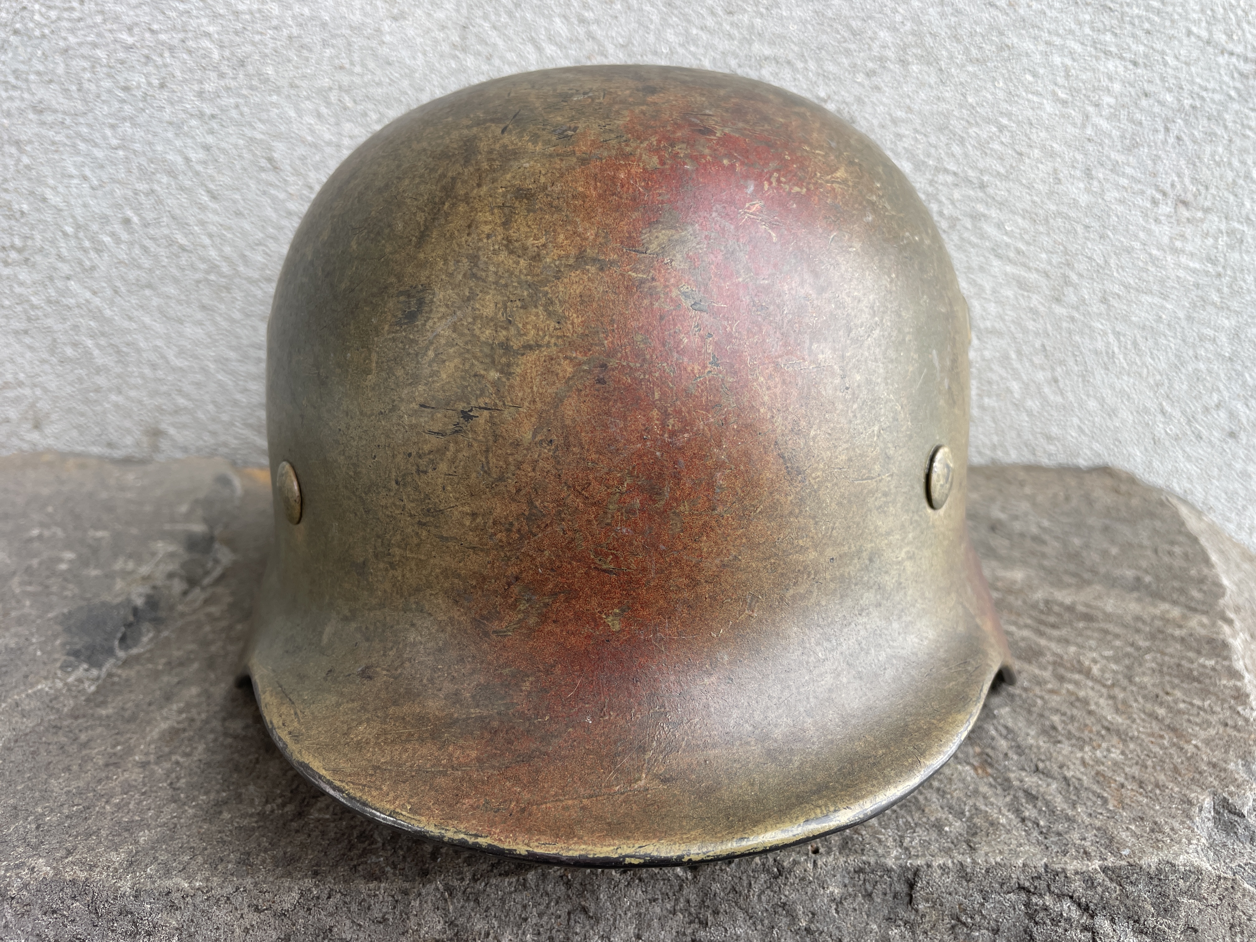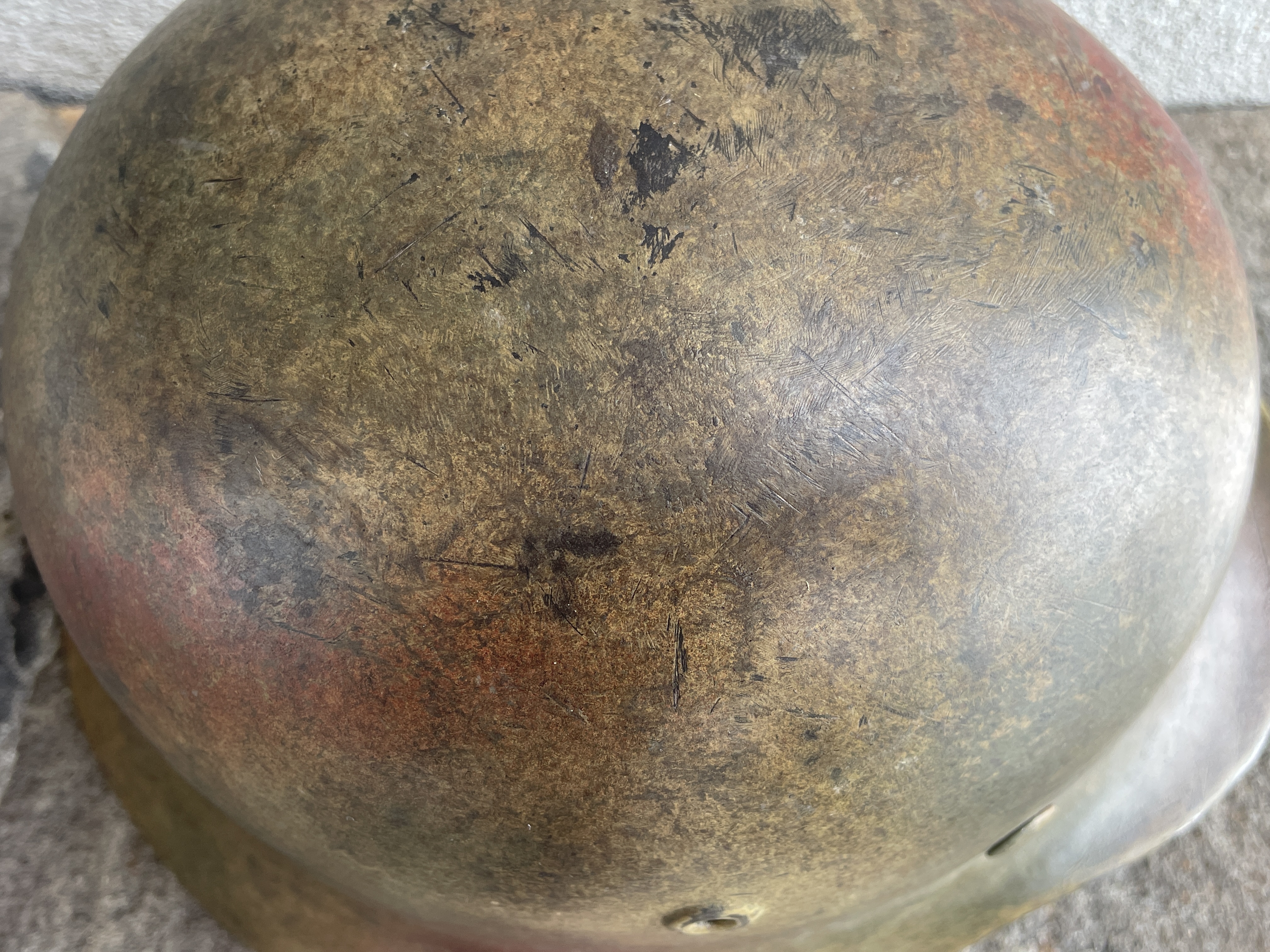 When I first received this helmet nearly all of the outside paint and Heer eagle were worn away over time. A good customer of mine sent it to me for a museum level restoration on a big budget and wanted it to represent a top of the line three color Normandy camo pattern. I went ahead and did the work but unfortunately his marriage fell into hard times and he abandoned the project with me I guess saving his Harley's was more of a priority now.