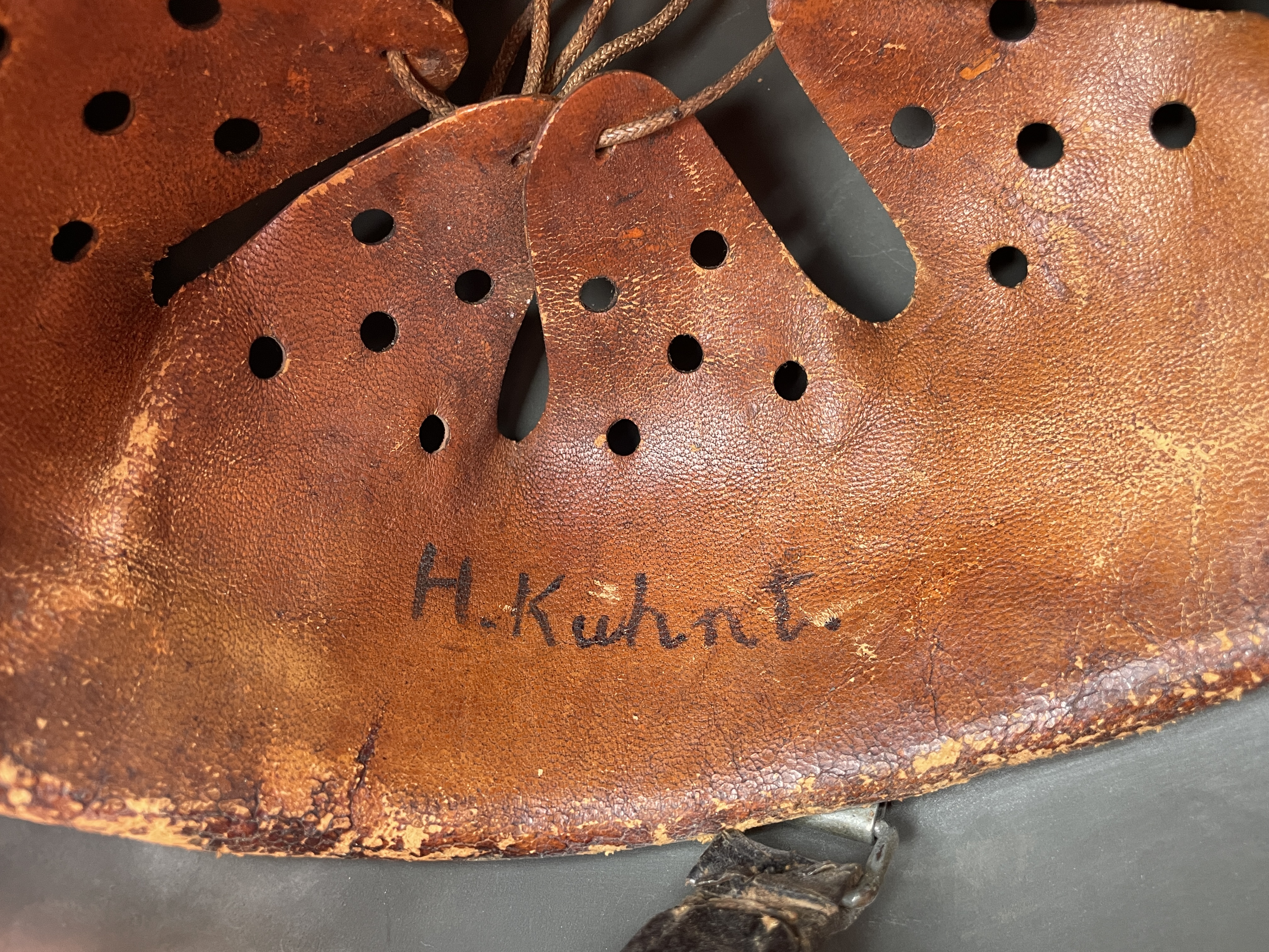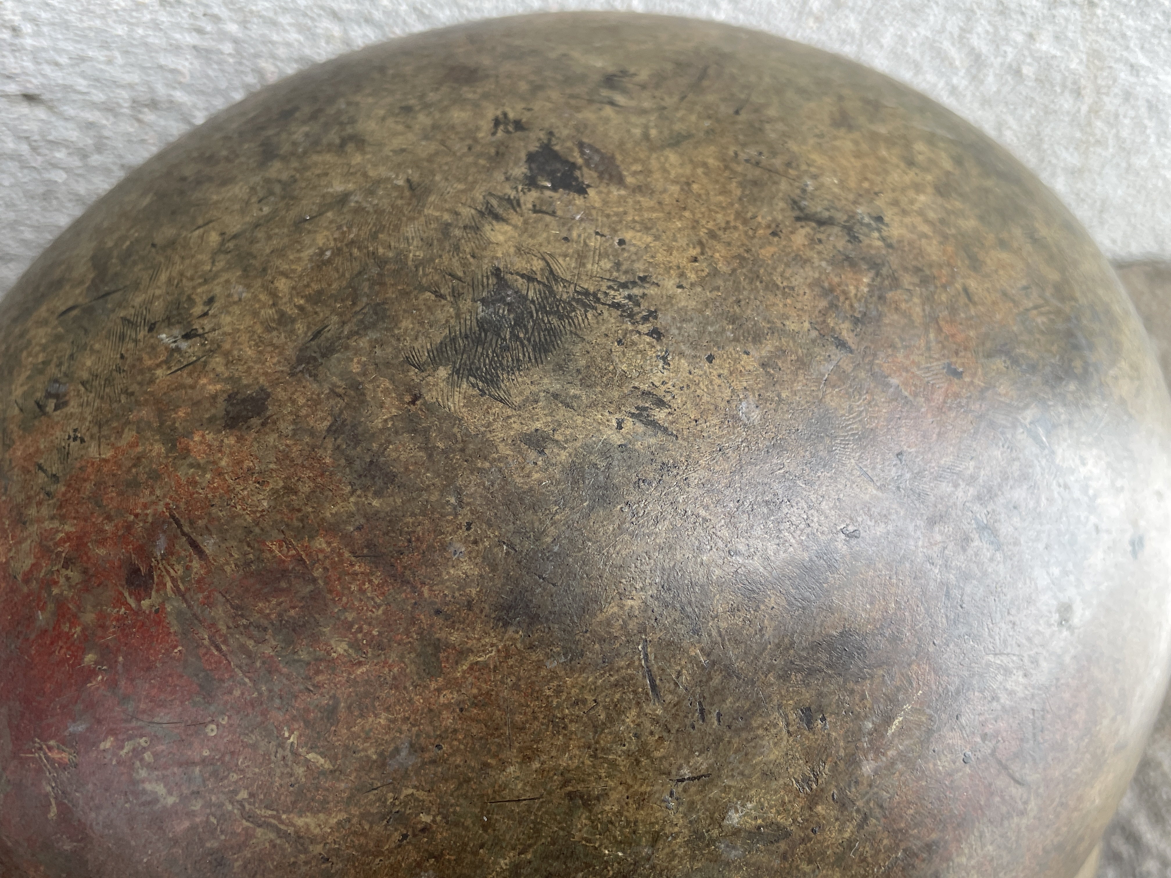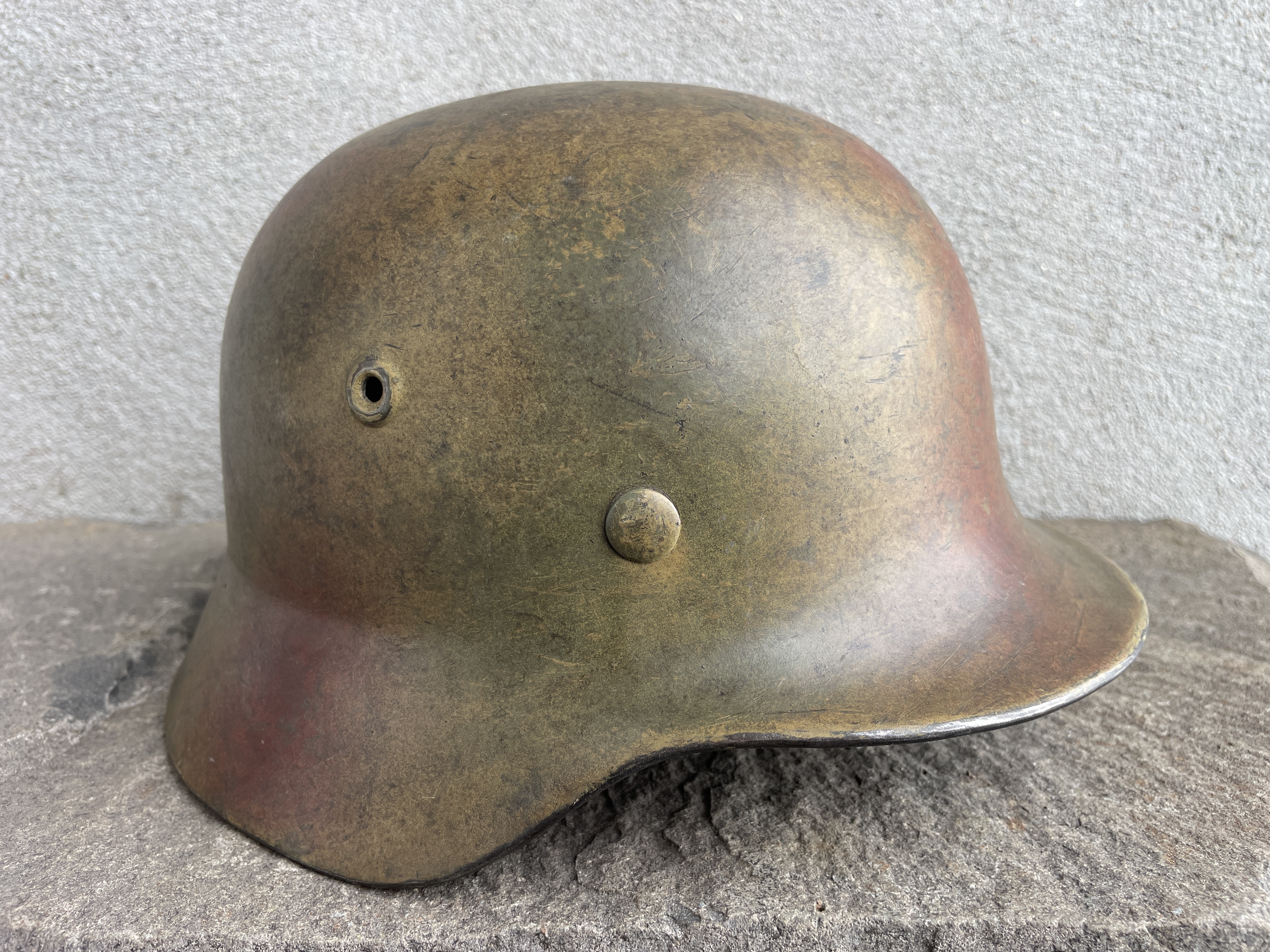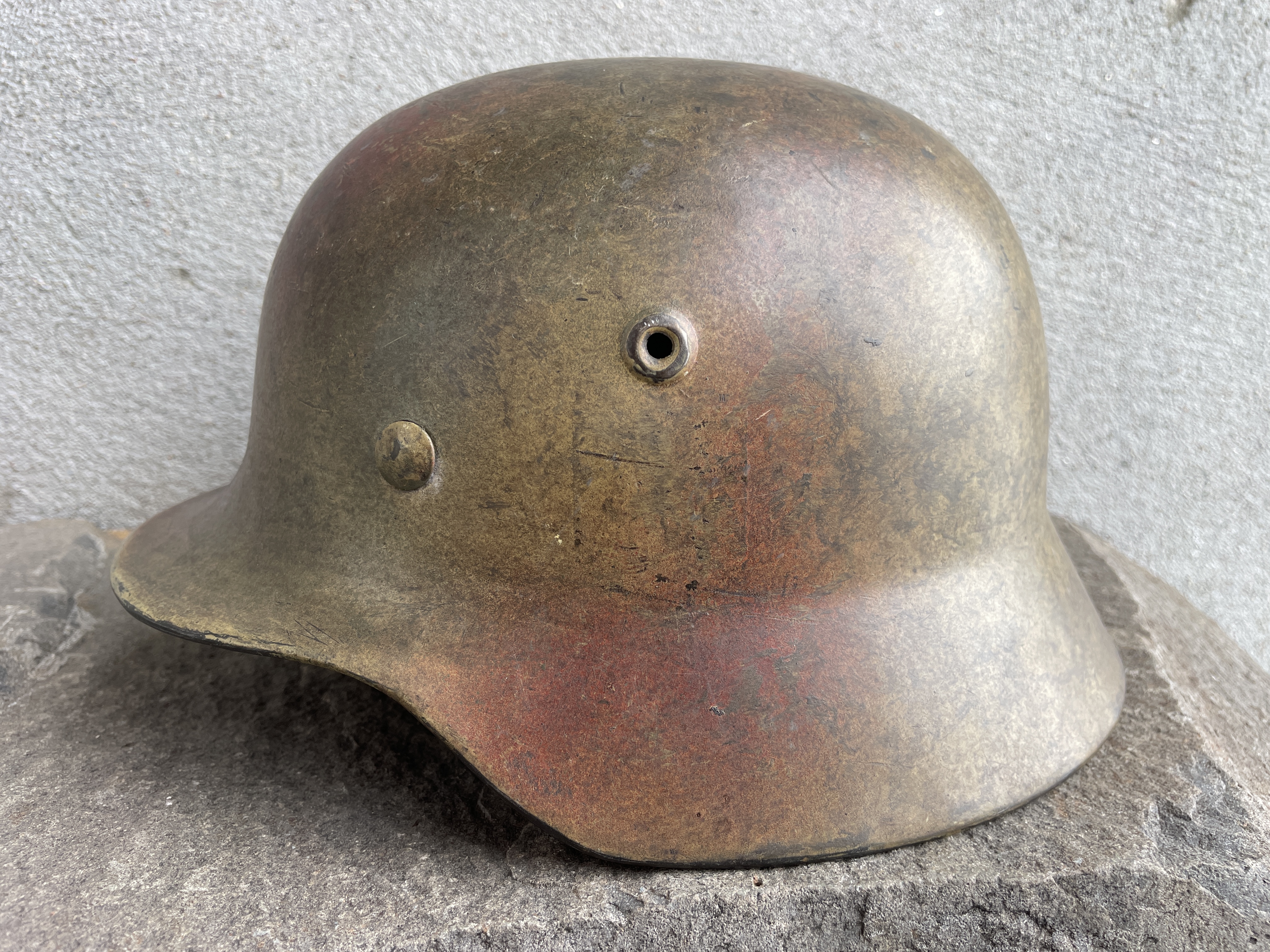 When I first received this helmet nearly all of the outside paint and Heer eagle were worn away over time. A good customer of mine sent it to me for a museum level restoration on a big budget and wanted it to represent a top of the line three color Normandy camo pattern. I went ahead and did the work but unfortunately his marriage fell into hard times and he abandoned the project with me I guess saving his Harley's was more of a priority now.