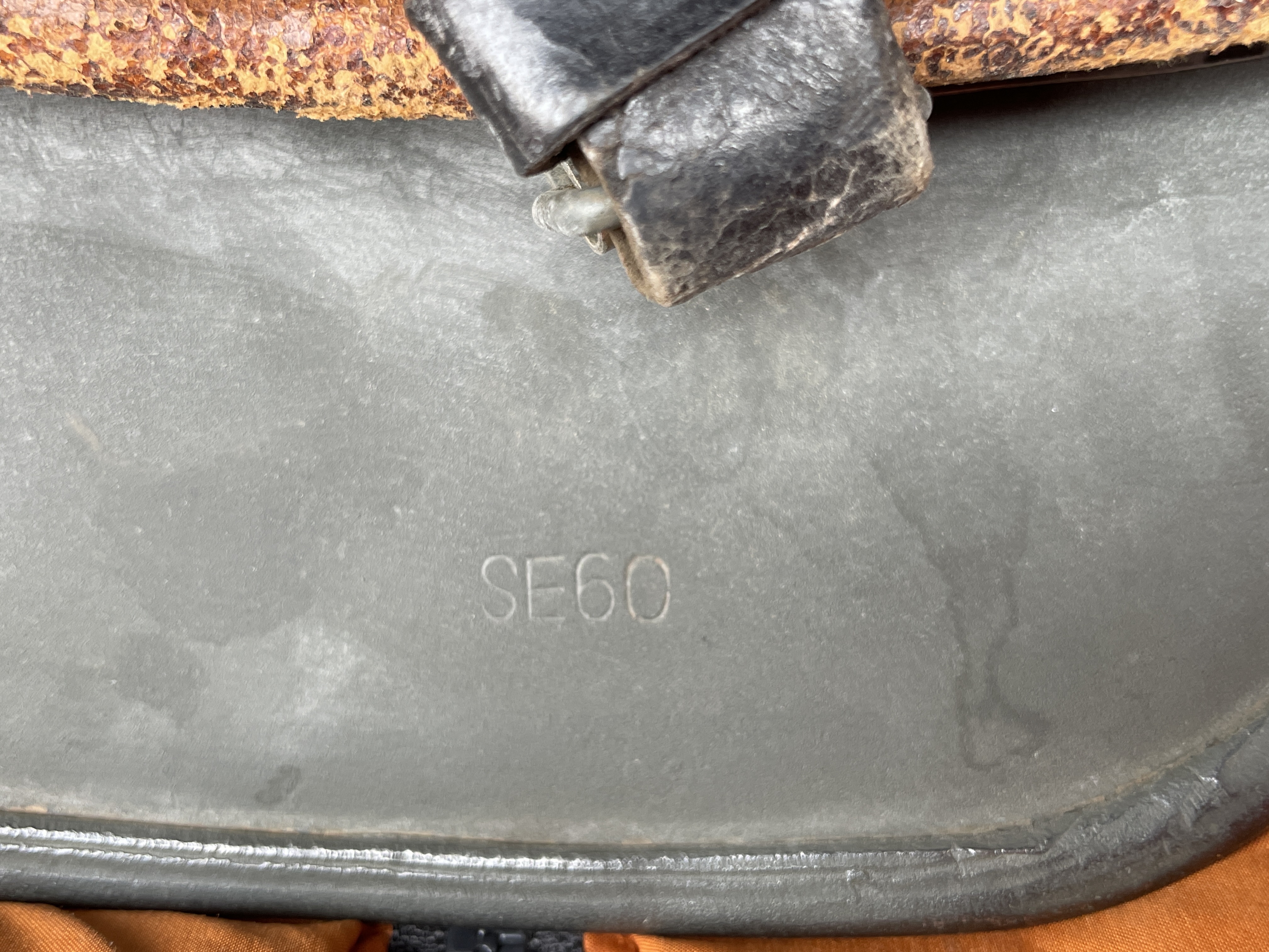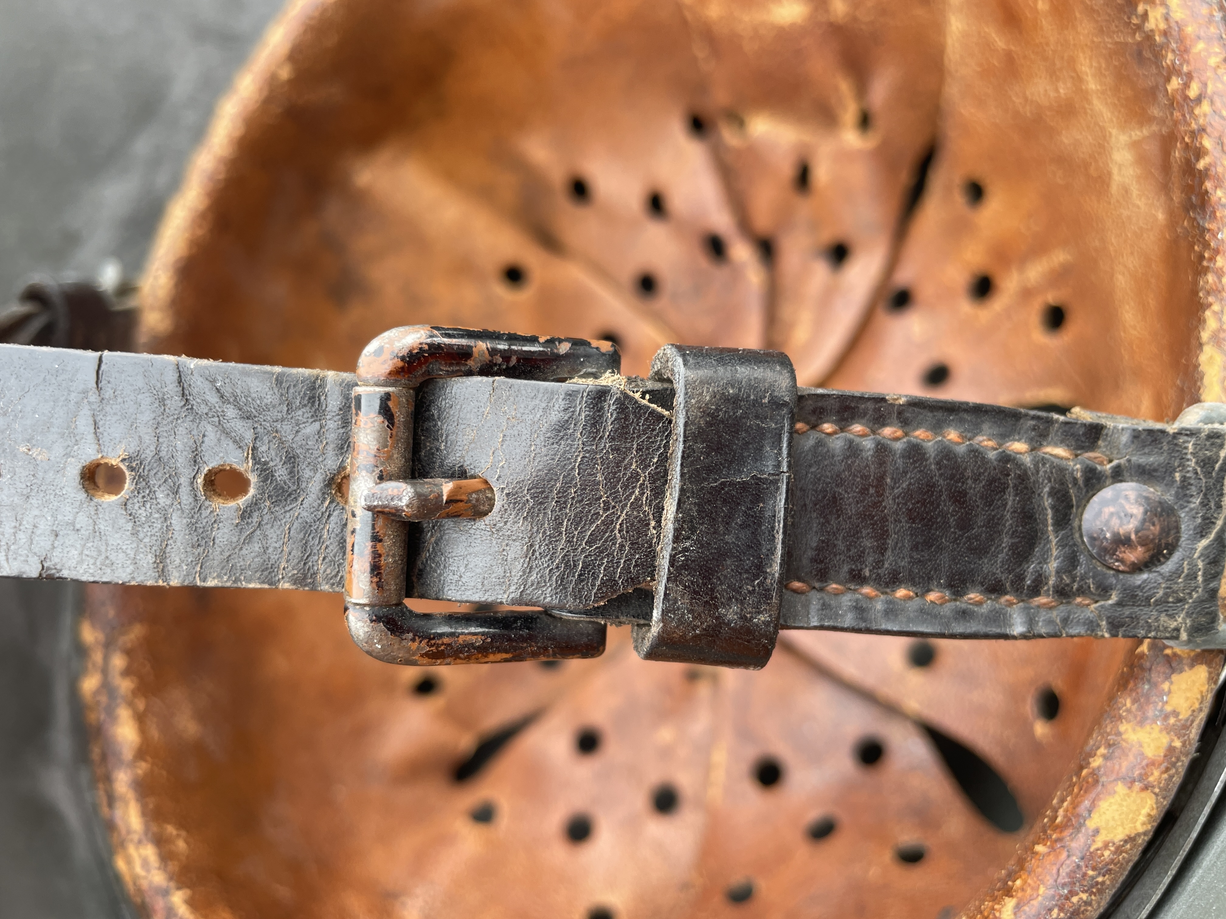 This is a beautiful three color Normandy camo helmet on an original M40 SE60 German helmet with it's original liner and 3 split pins still in tact. The chinstrap I believe it also original to the helmet and is some type of field hybrid as perhaps the wearer was a bit too small for a standard length chinstrap. I believe it was mink oiled back in the day which kept it soft and pliable but a tends to darken it a bit. Fortunately the liner itself was not mink oiled otherwise it would be near black by now which tends to happen.