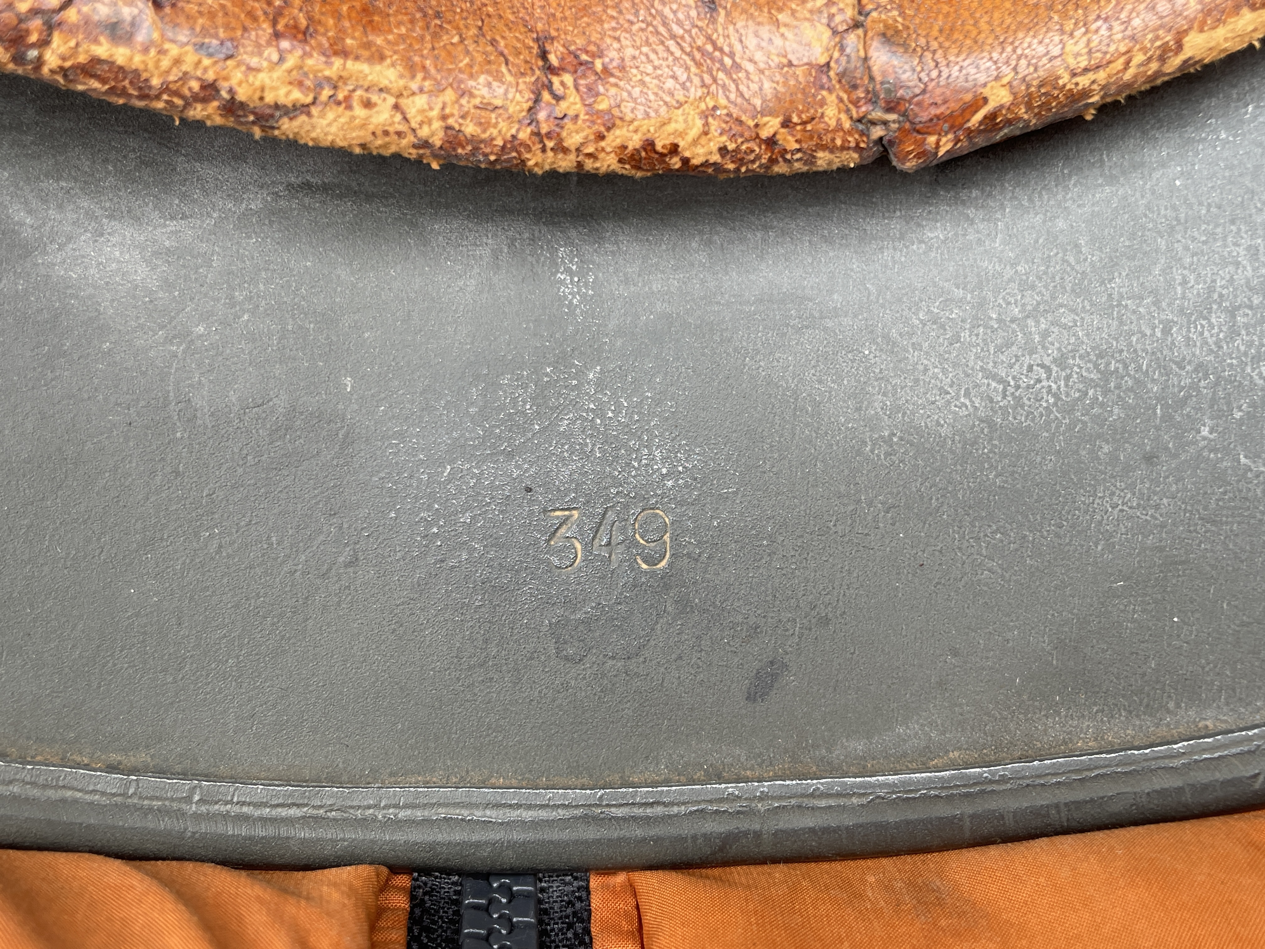 (Every original German helmet produced from 1935 to 45 had two factory stampings punched into the side and rear or both in the rear. The alpha numeric number refers to the factory location and the inside metric circumference in centimeters. The rear lot number refers to the production run and was used as a quality control measure. The font styles used at each factory were slightly different but highly consistent throughout the war and so fakes or reproductions will either not have these numbers at all or they will use the wrong font style or letter spacing and so are easily identified as post war made.)