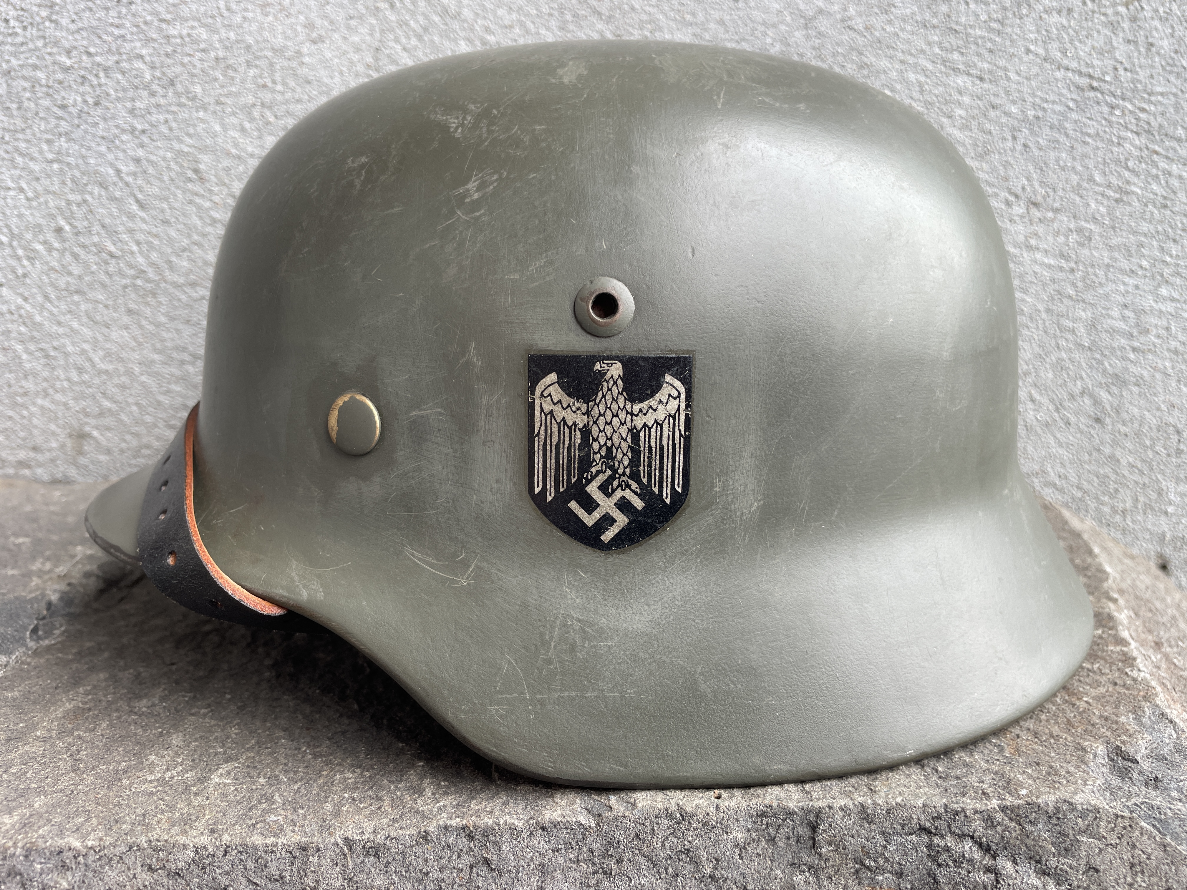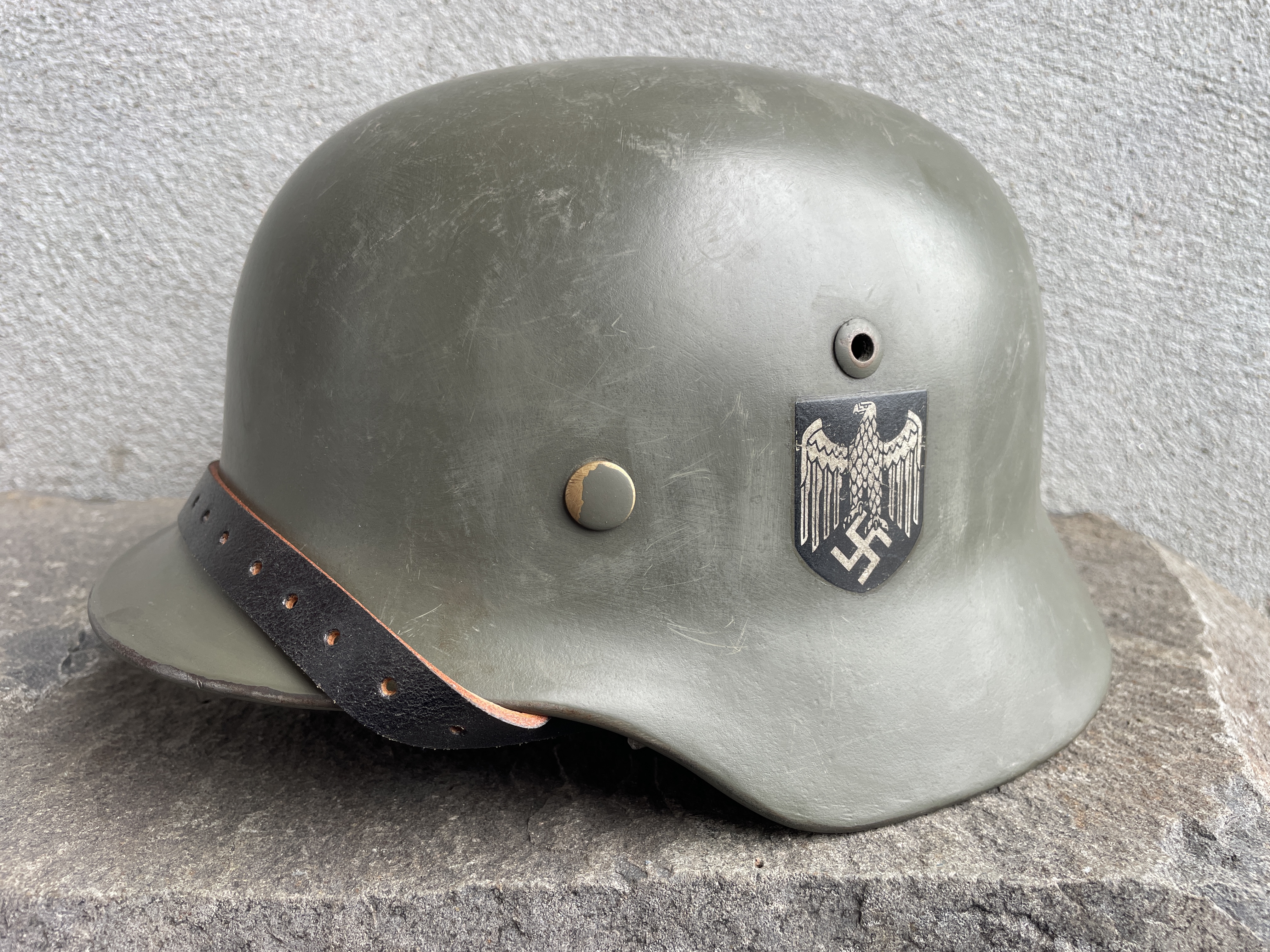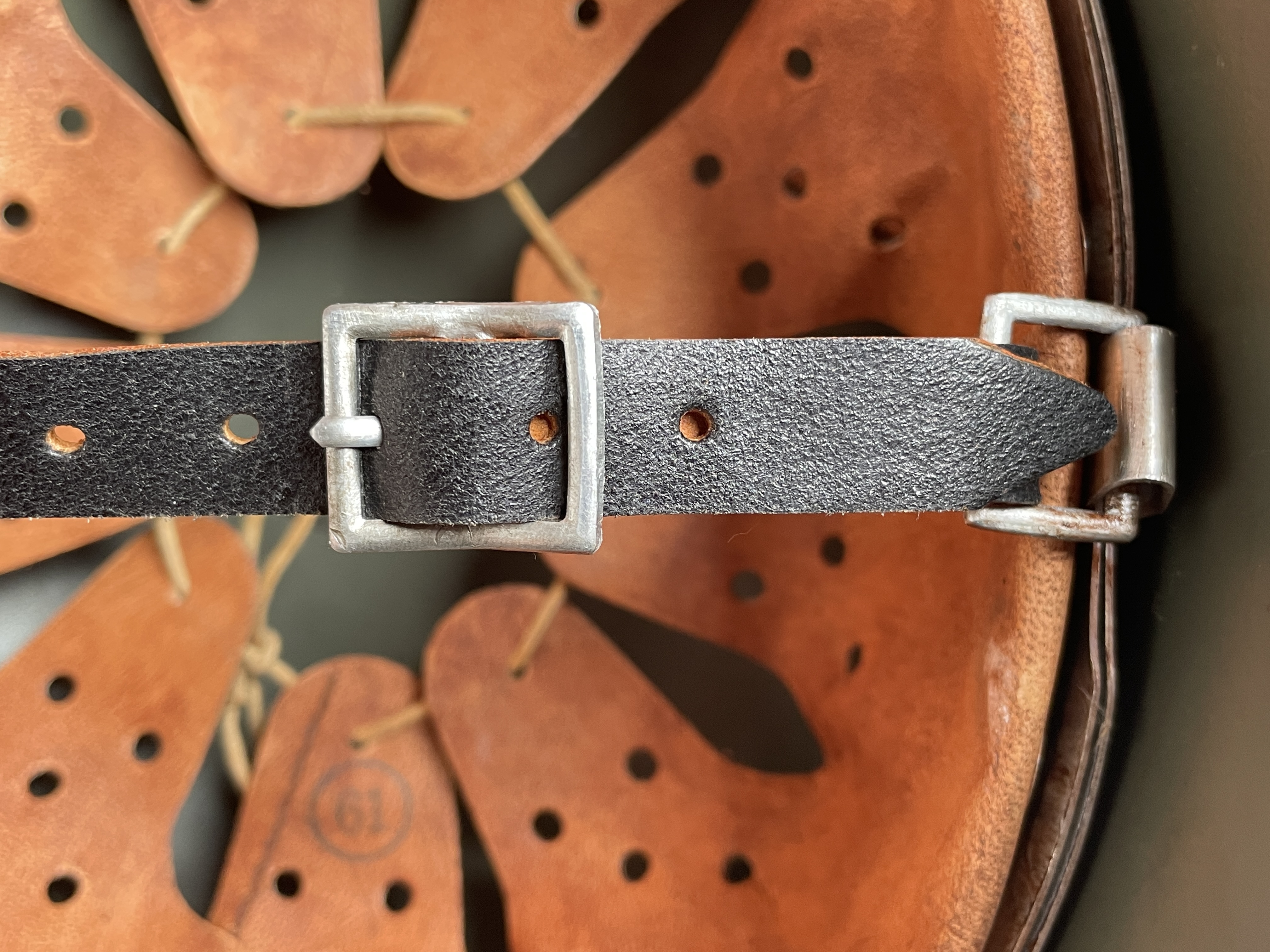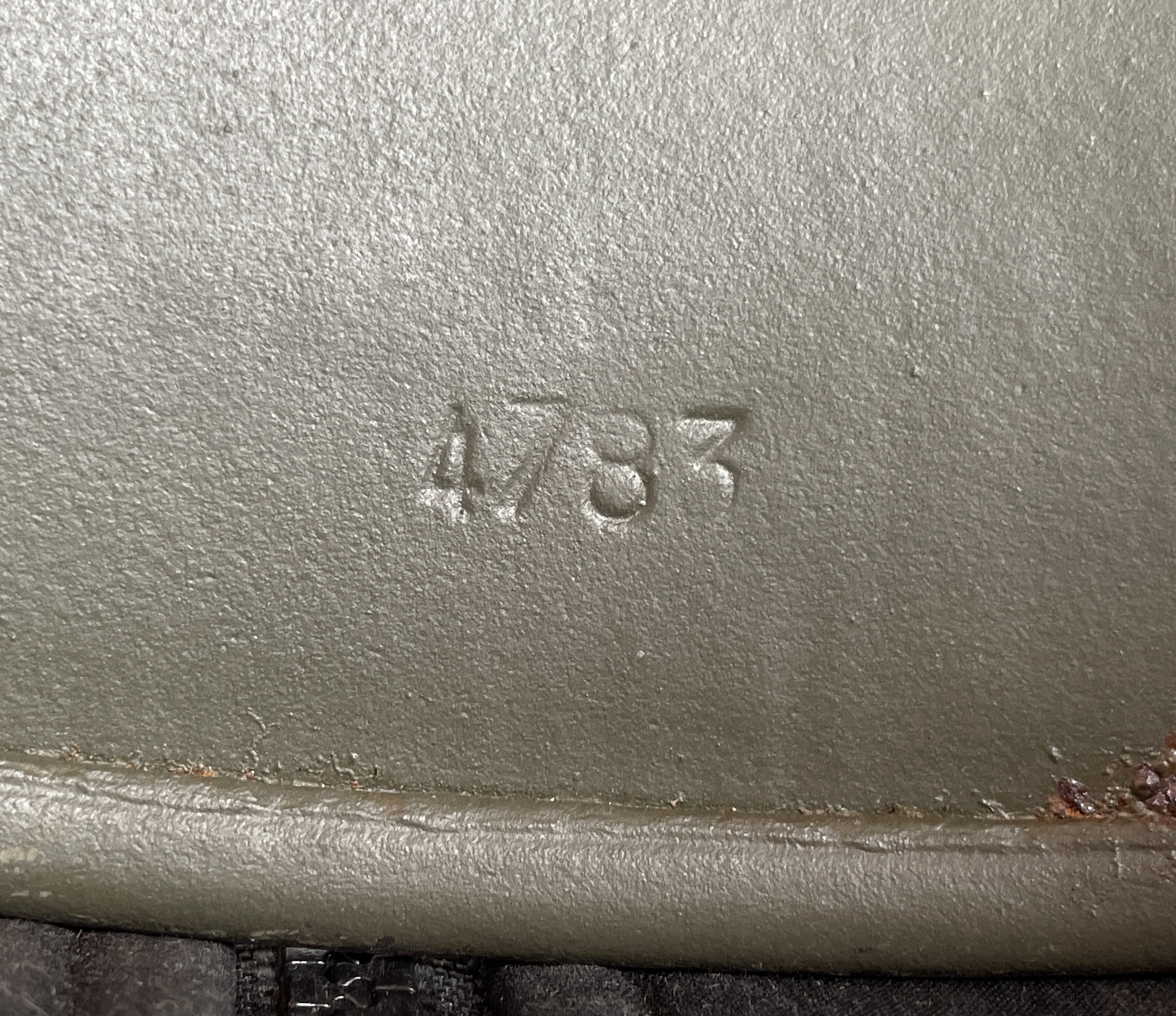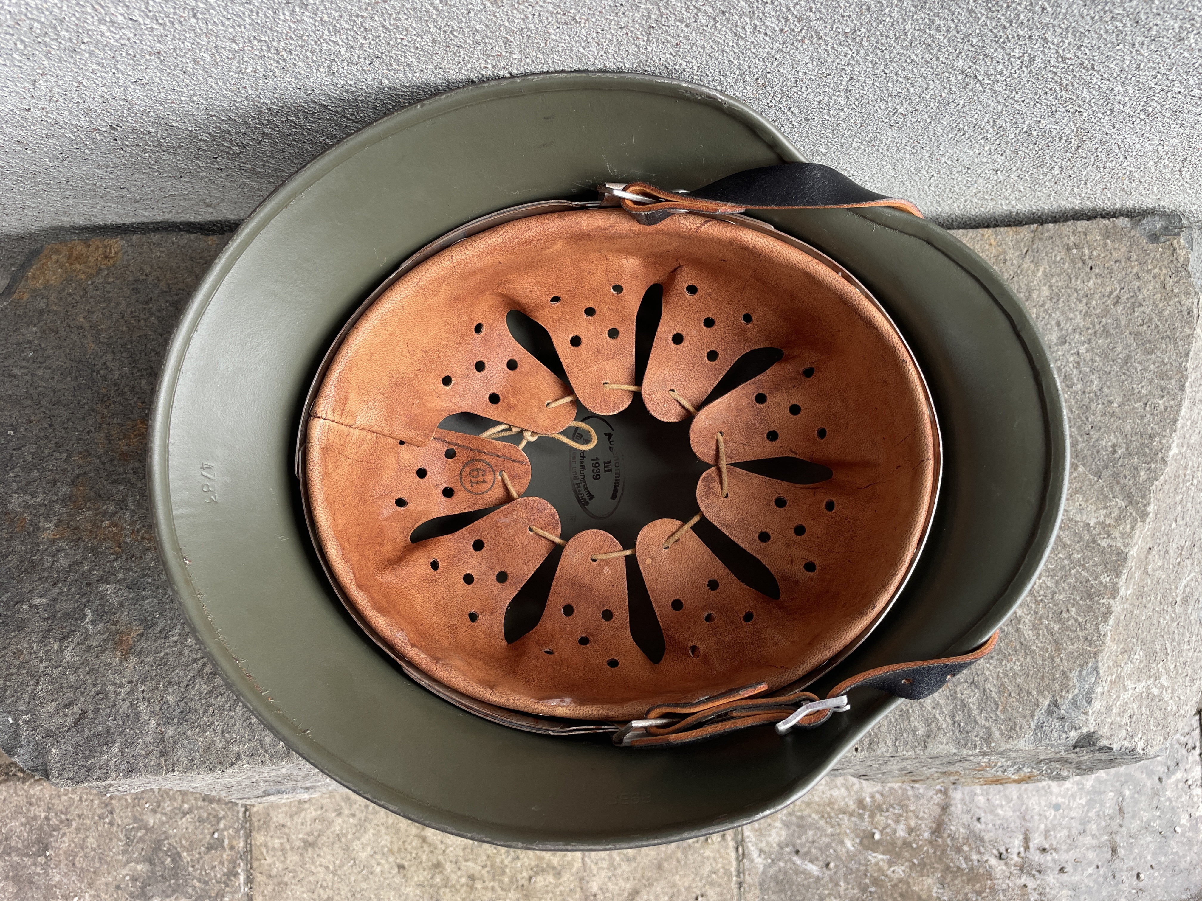 (Every original German helmet produced from 1935 to 45 had two factory stampings punched into the side and rear or both in the rear. The alpha numeric number refers to the factory location and the inside metric circumference in centimeters. The rear lot number refers to the production run and was used as a quality control measure. The font styles used at each factory were slightly different but highly consistent throughout the war and so fakes or reproductions will either not have these numbers at all or they will use the wrong font style or letter spacing and so are easily identified as post war made.)