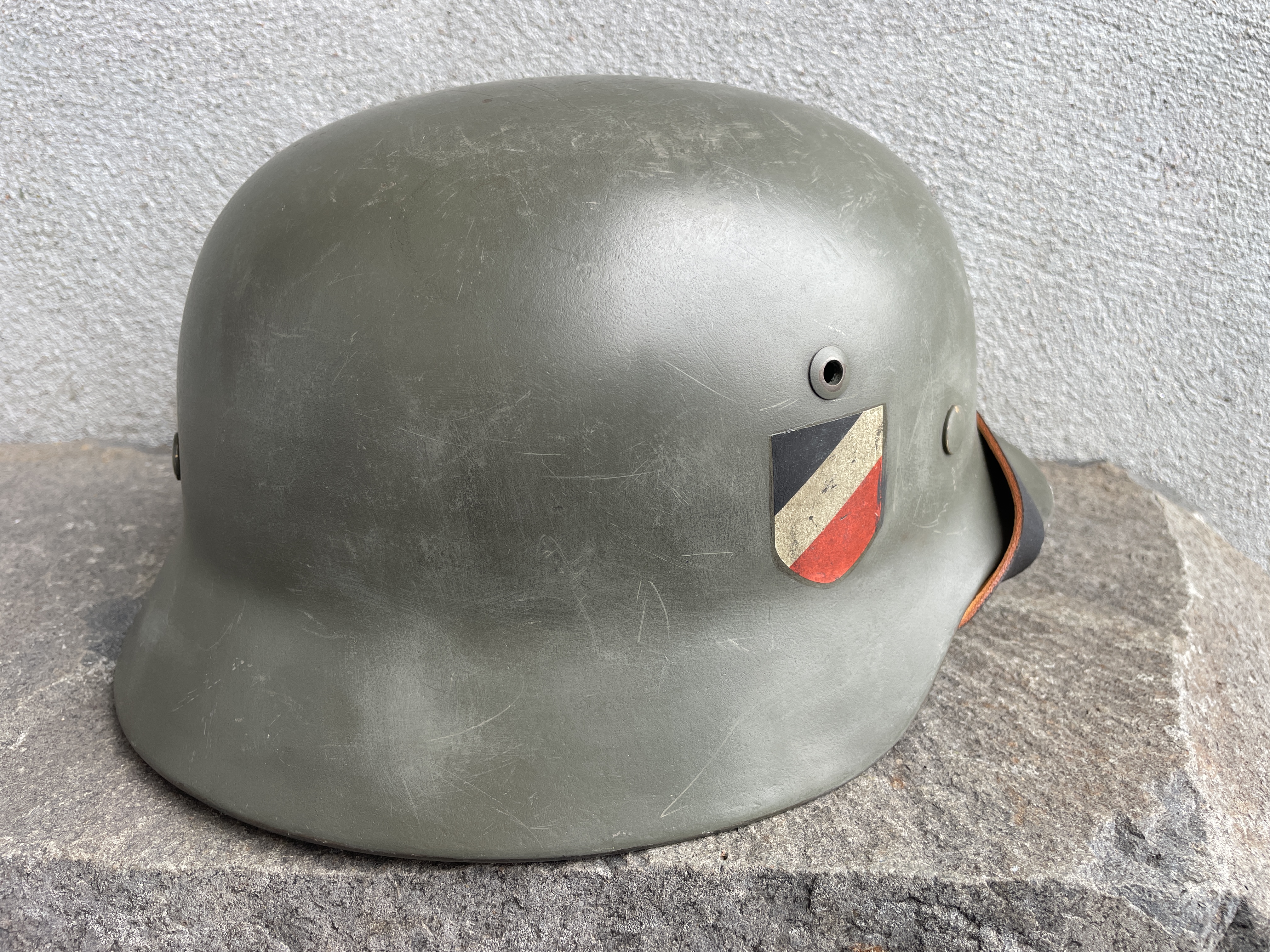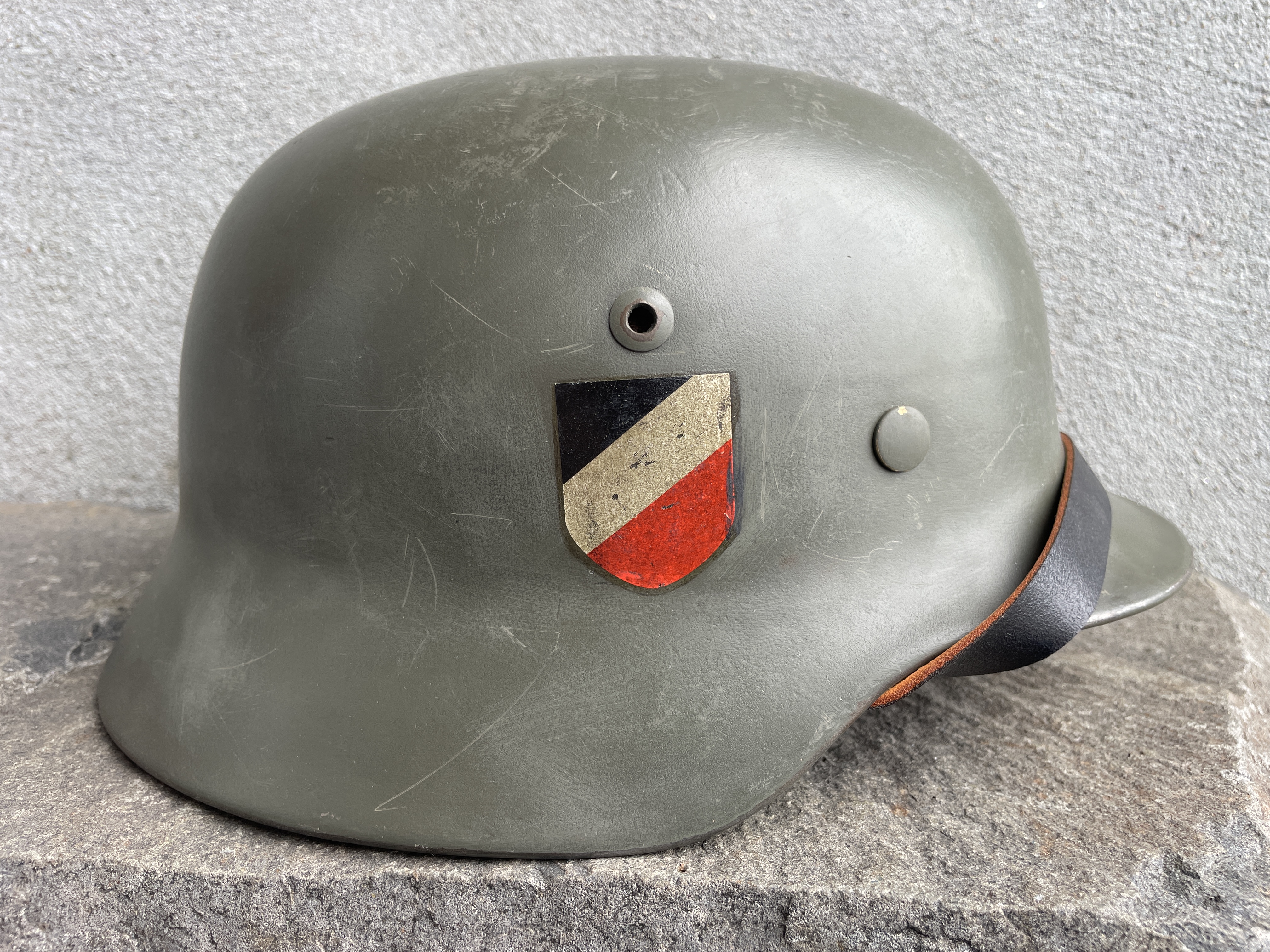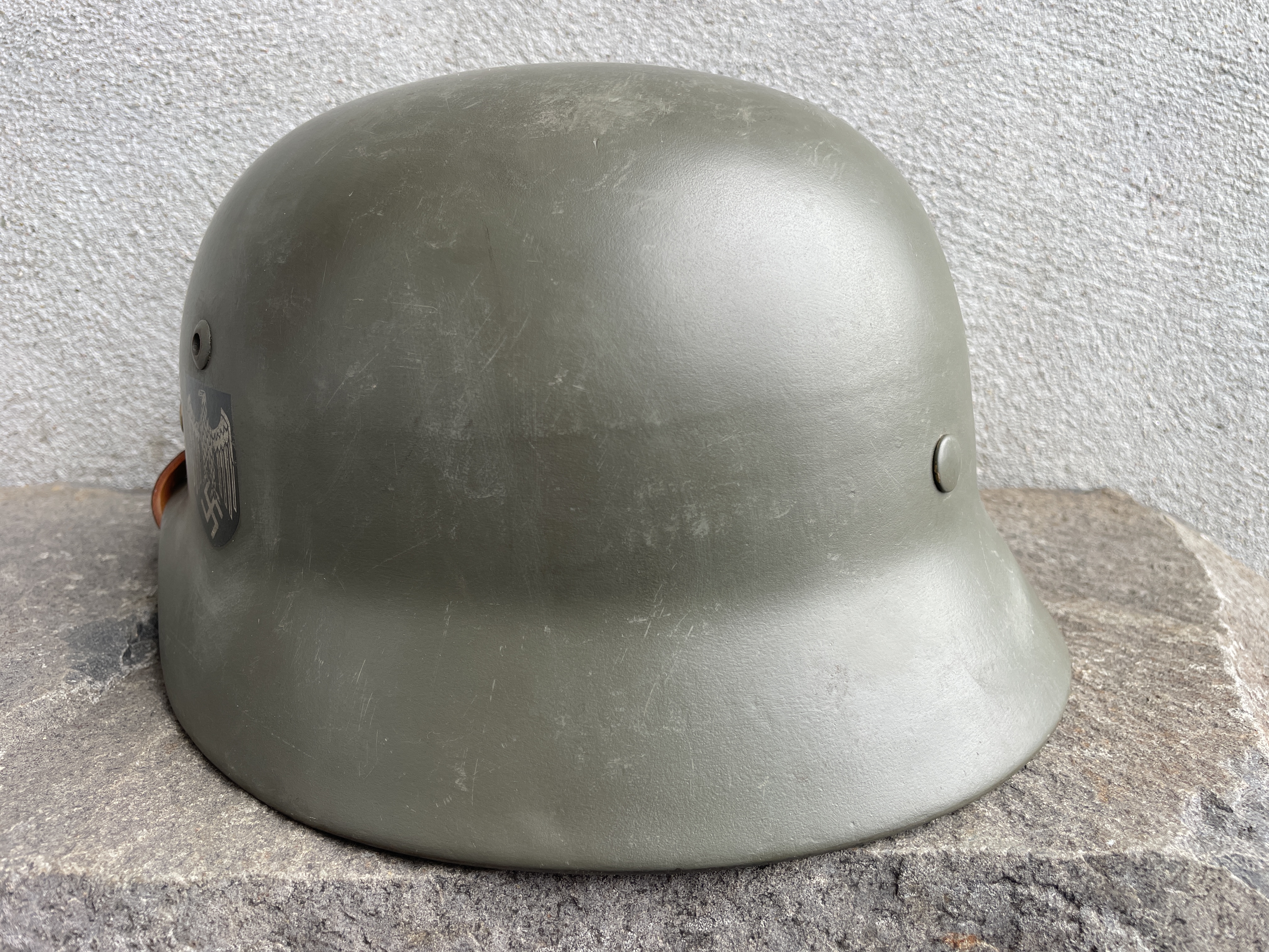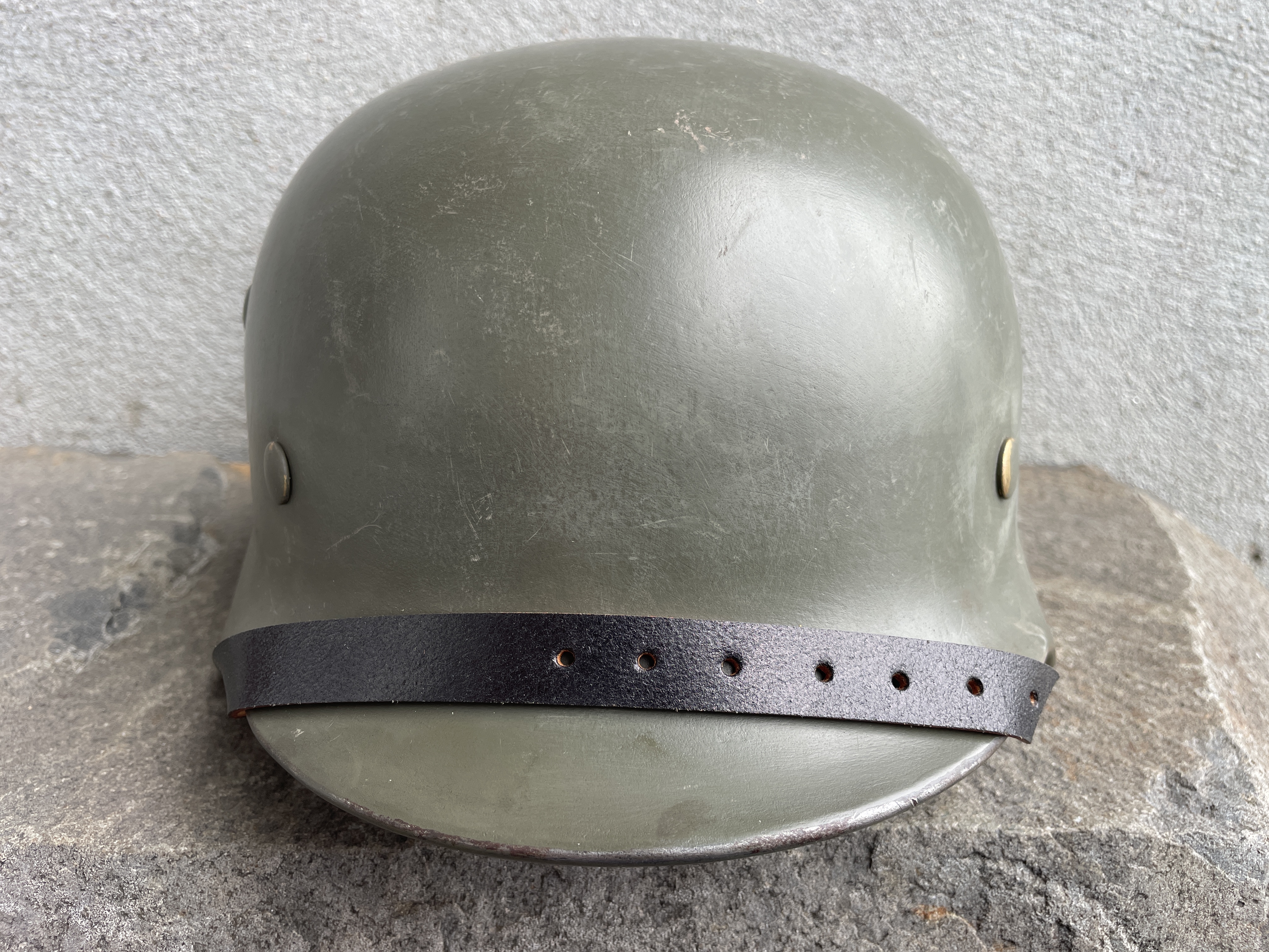 (Every original German helmet produced from 1935 to 45 had two factory stampings punched into the side and rear or both in the rear. The alpha numeric number refers to the factory location and the inside metric circumference in centimeters. The rear lot number refers to the production run and was used as a quality control measure. The font styles used at each factory were slightly different but highly consistent throughout the war and so fakes or reproductions will either not have these numbers at all or they will use the wrong font style or letter spacing and so are easily identified as post war made.)