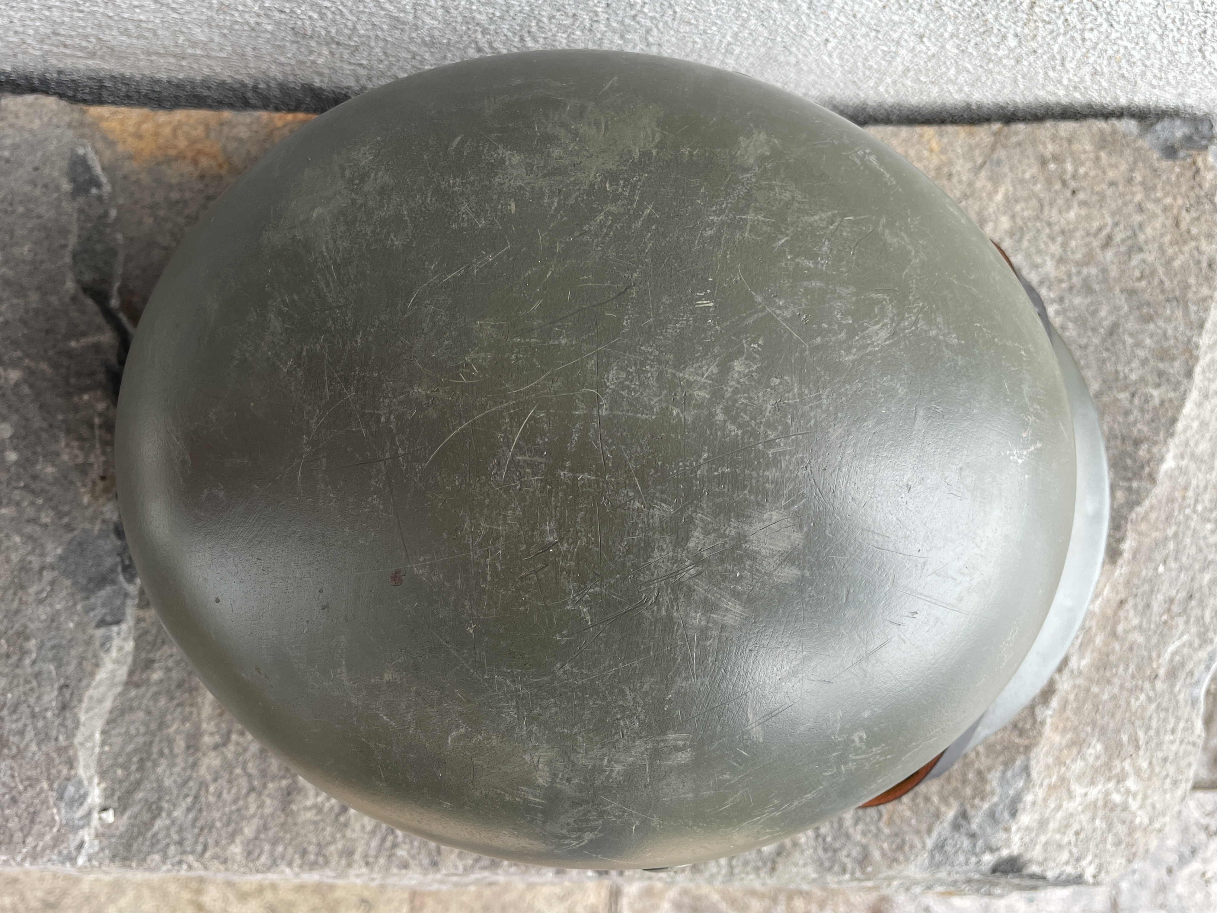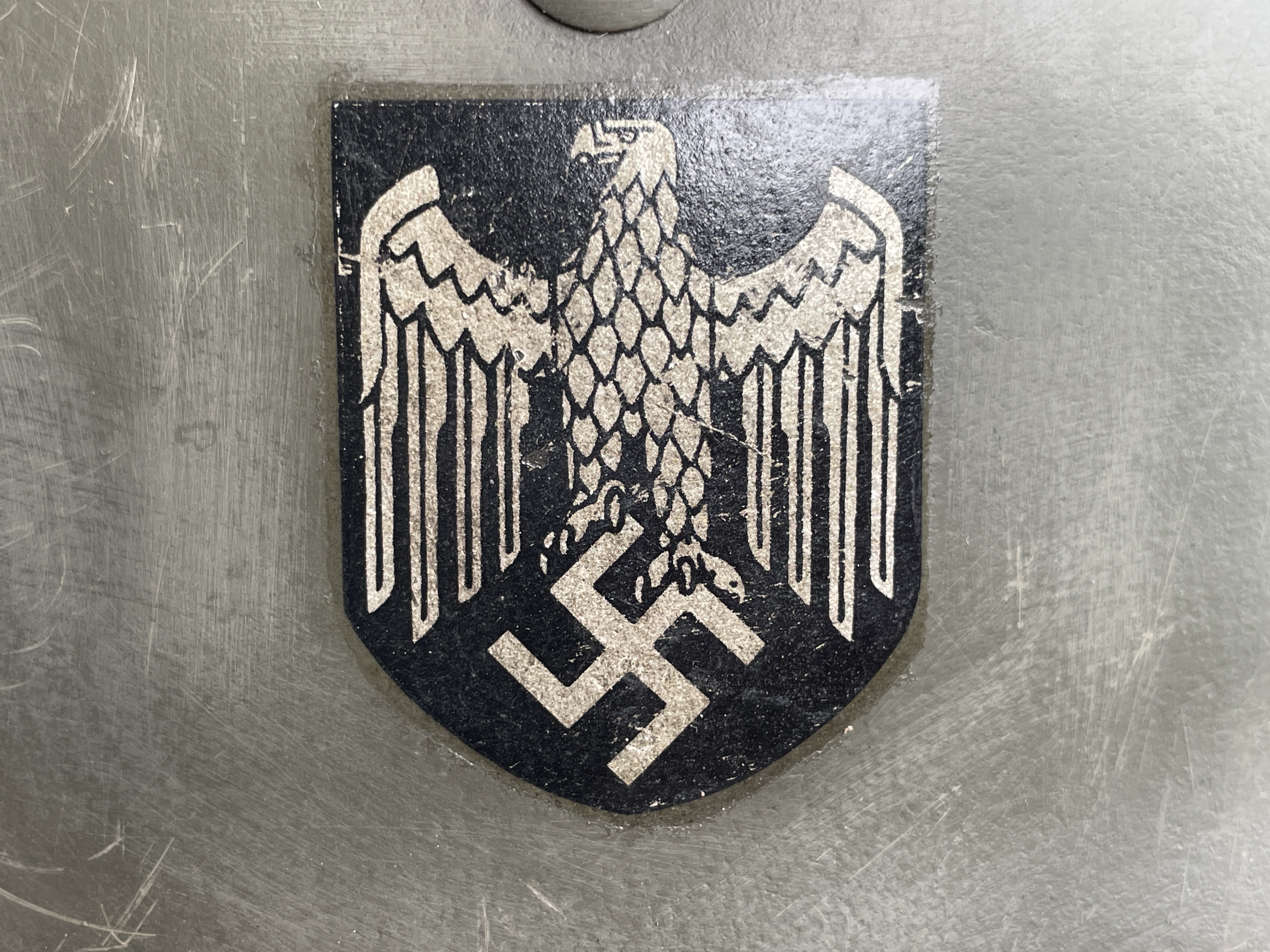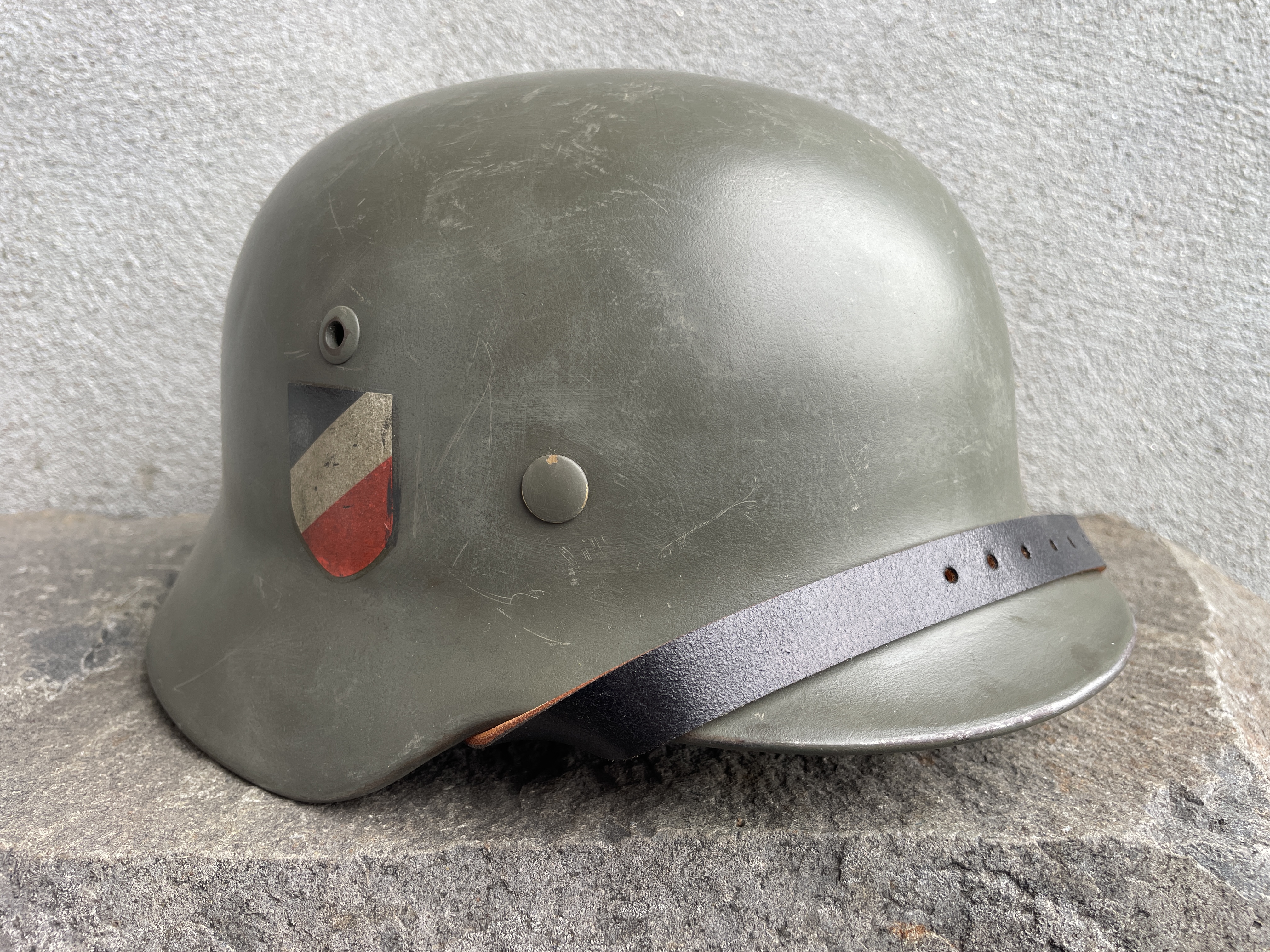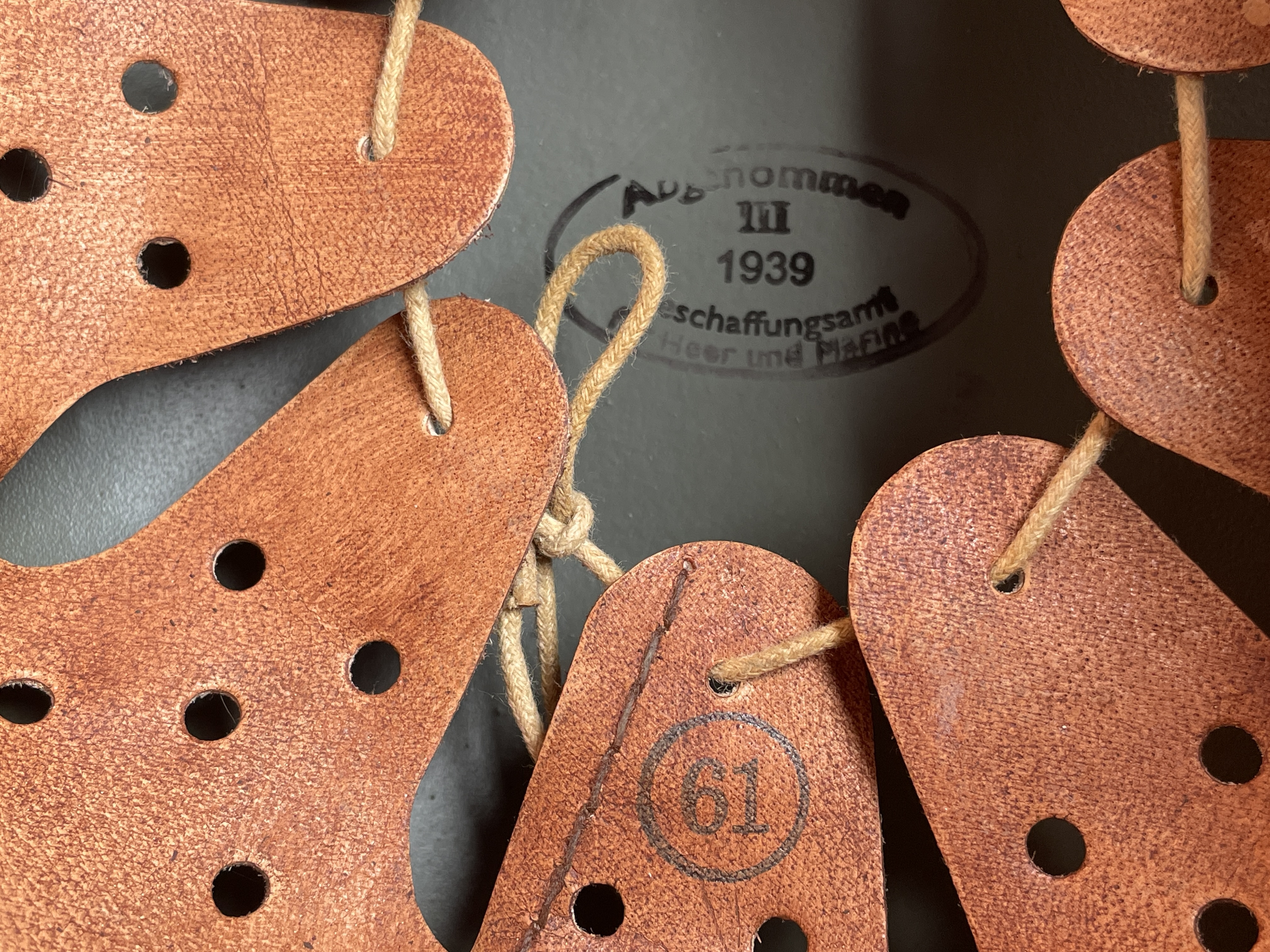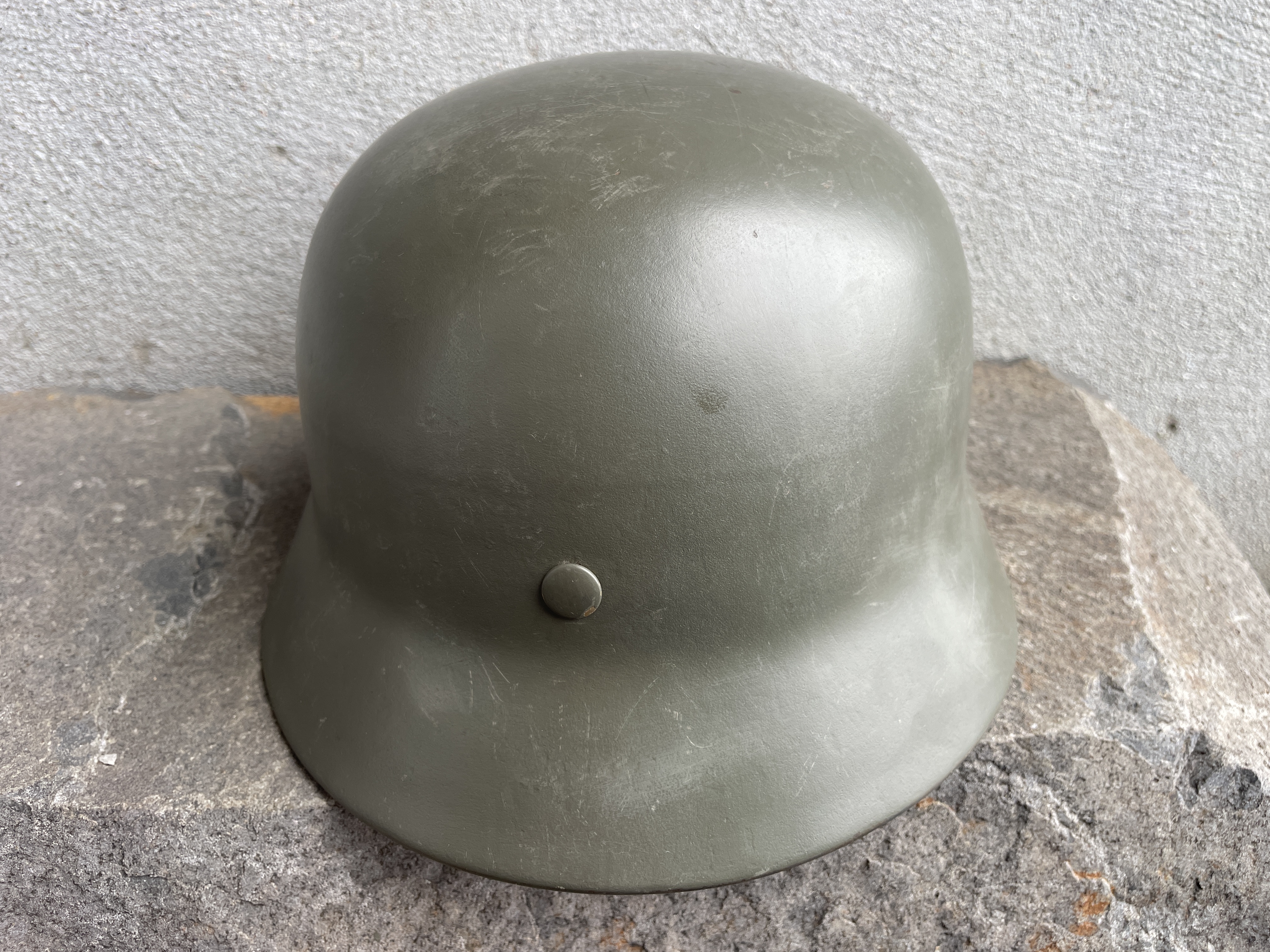 (Every original German helmet produced from 1935 to 45 had two factory stampings punched into the side and rear or both in the rear. The alpha numeric number refers to the factory location and the inside metric circumference in centimeters. The rear lot number refers to the production run and was used as a quality control measure. The font styles used at each factory were slightly different but highly consistent throughout the war and so fakes or reproductions will either not have these numbers at all or they will use the wrong font style or letter spacing and so are easily identified as post war made.)