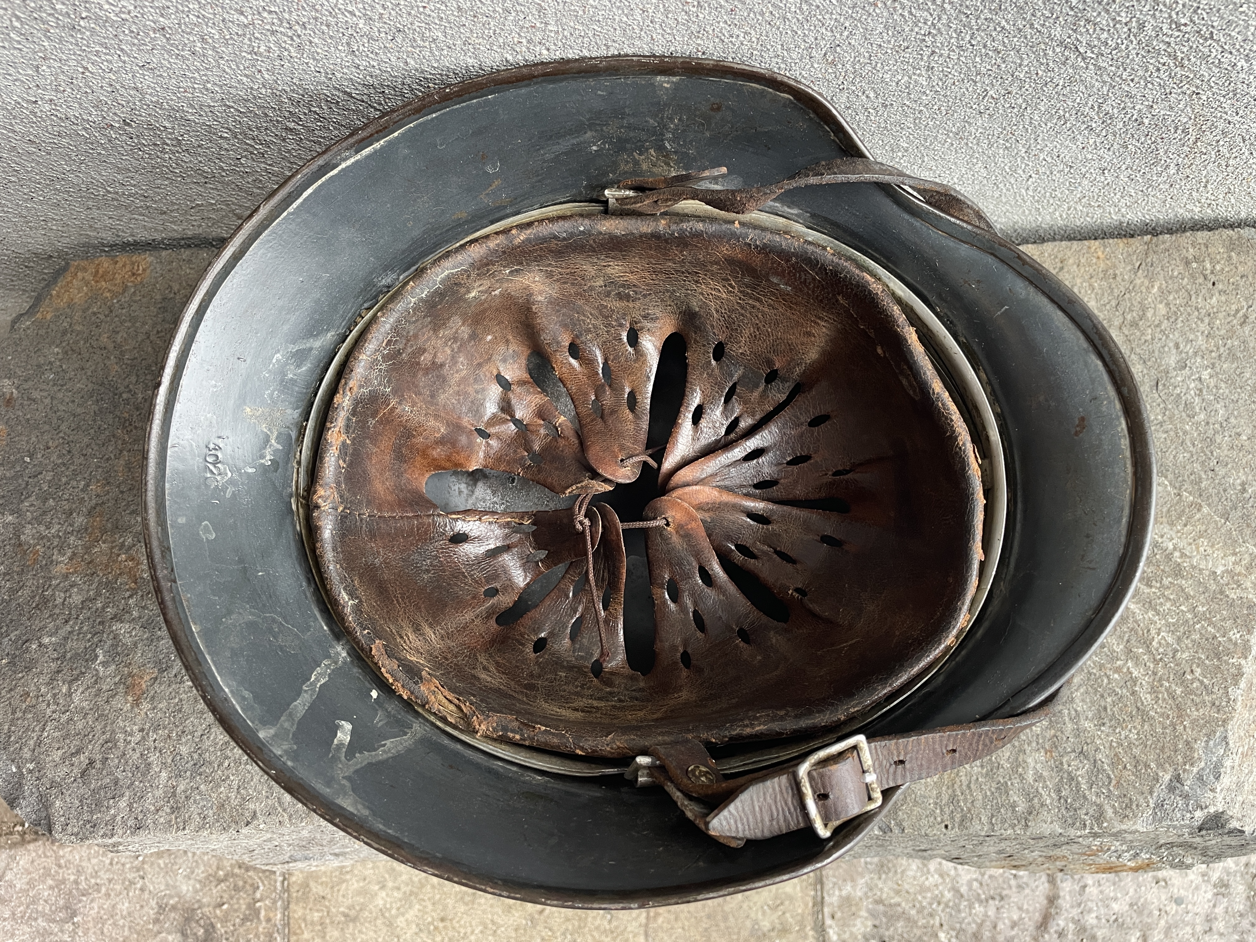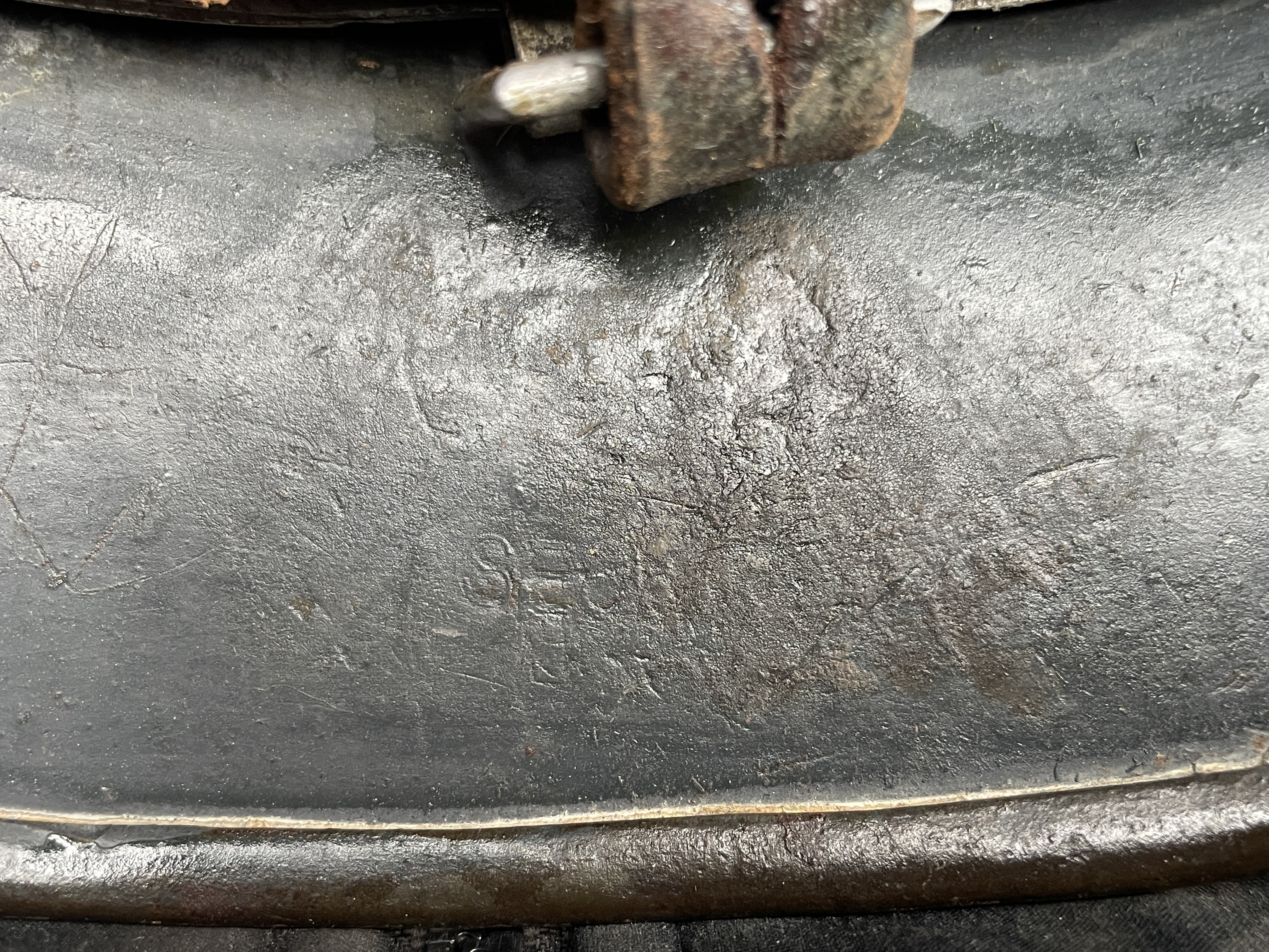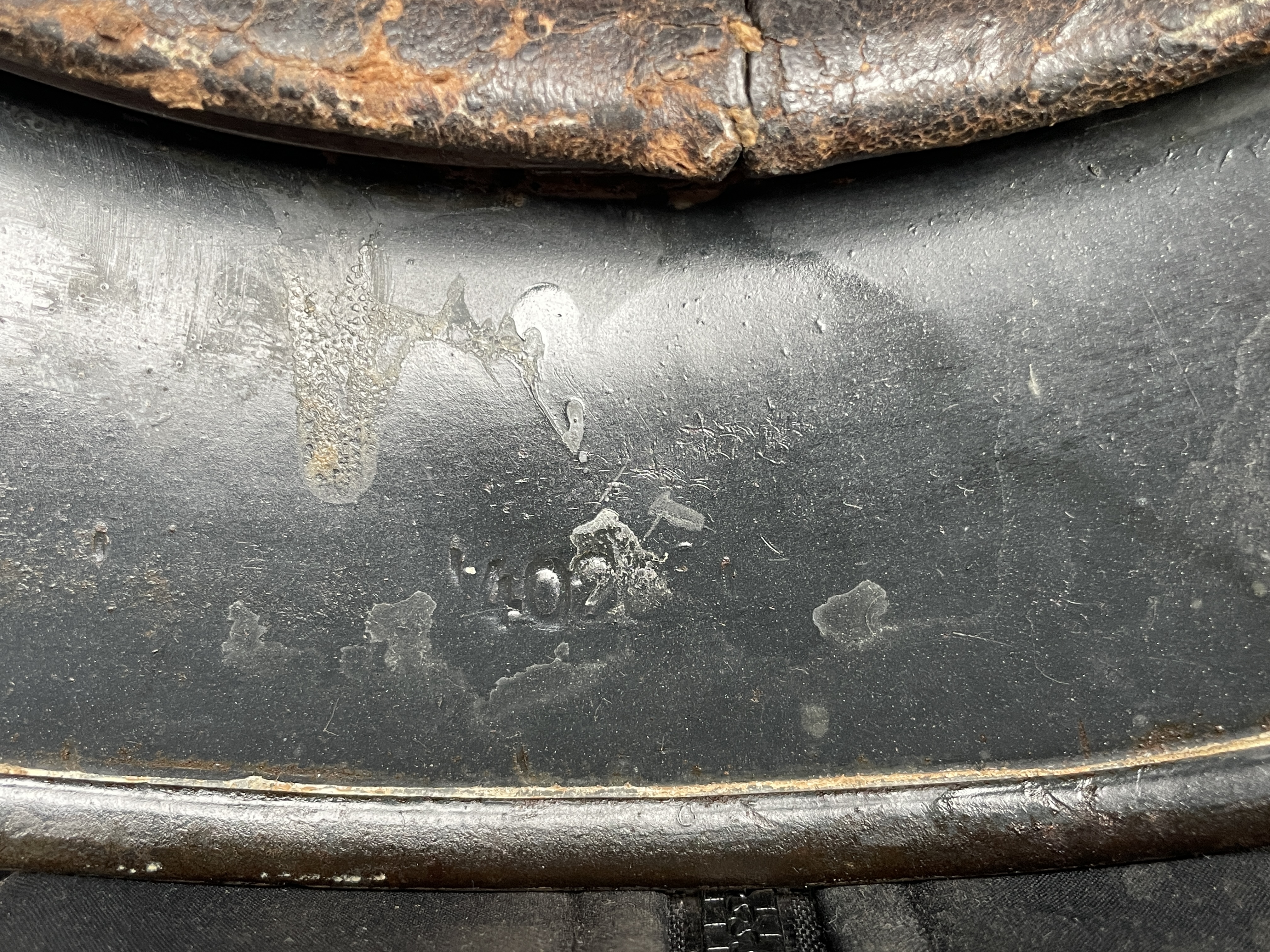 (Every original German helmet produced from 1935 to 45 had two factory stampings punched into the side and rear or both in the rear. The alpha numeric number refers to the factory location and the inside metric circumference in centimeters. The rear lot number refers to the production run and was used as a quality control measure. The font styles used at each factory were slightly different but highly consistent throughout the war and so fakes or reproductions will either not have these numbers at all or they will use the wrong font style or letter spacing and so are easily identified as post war made.)