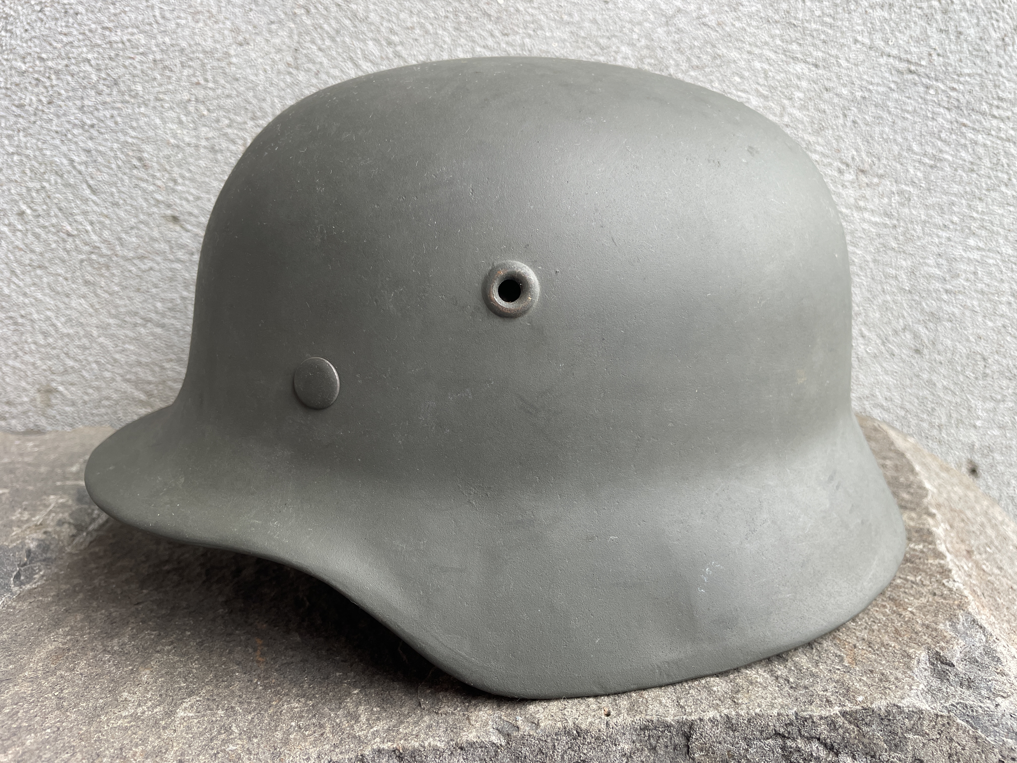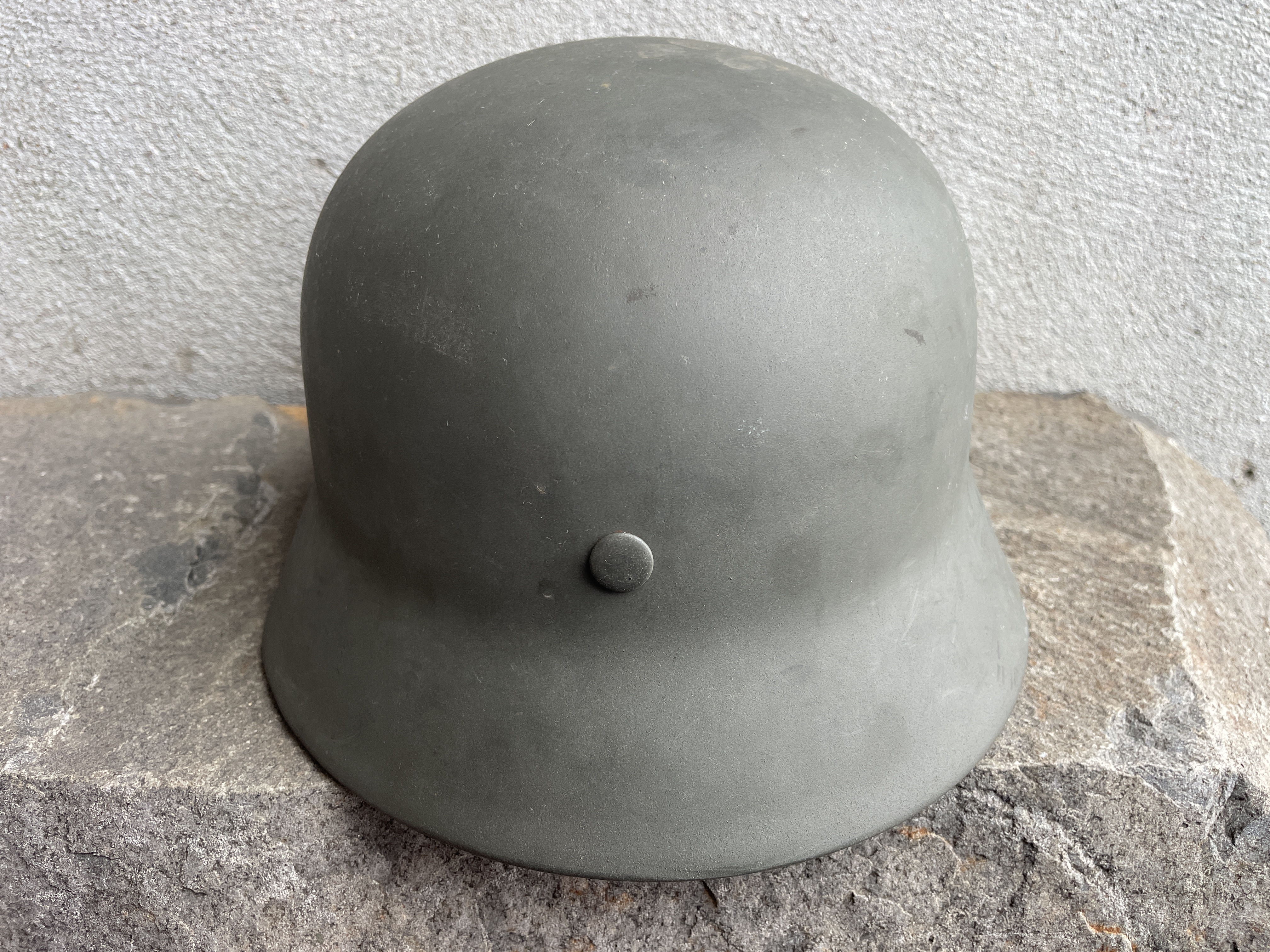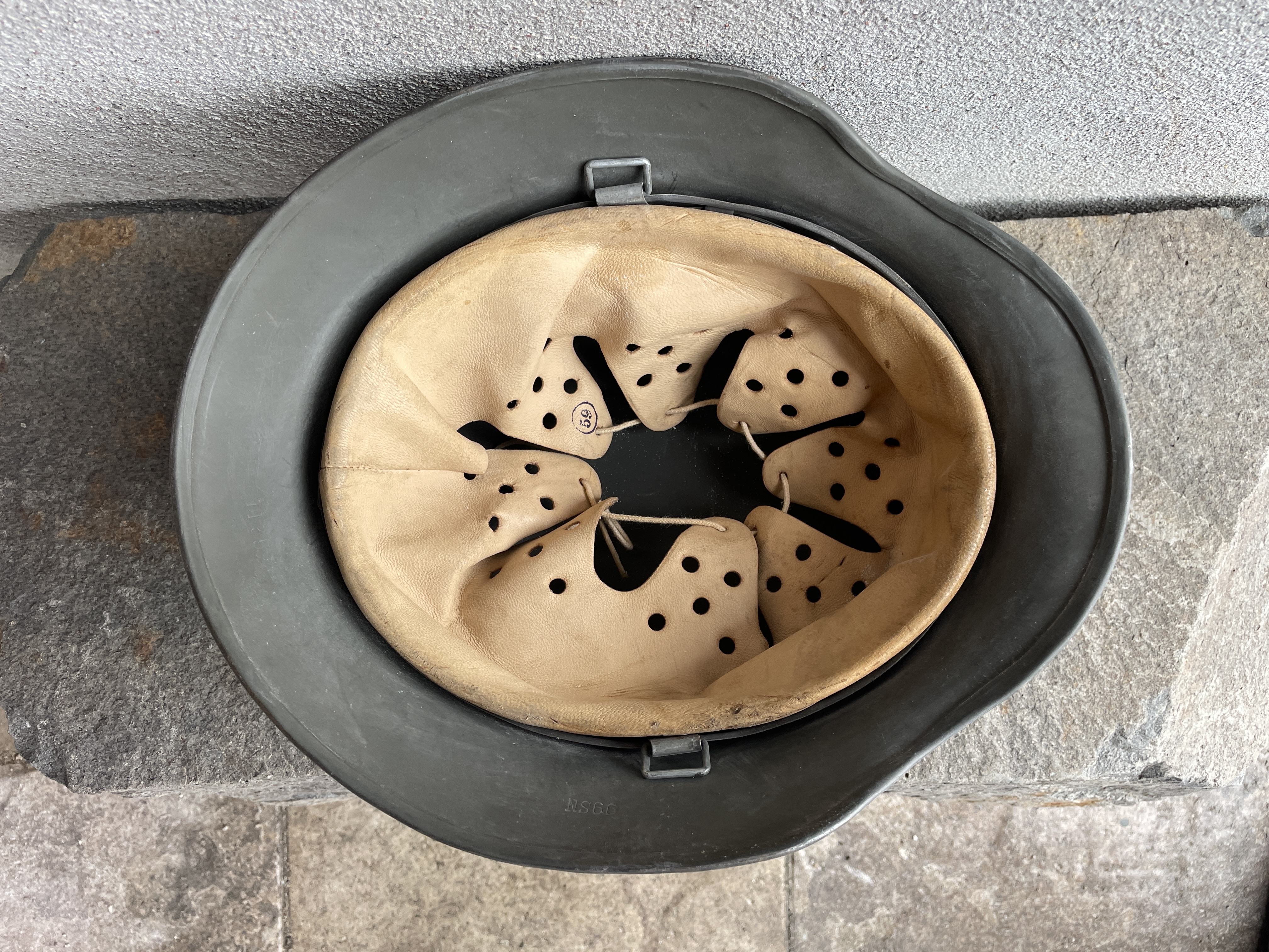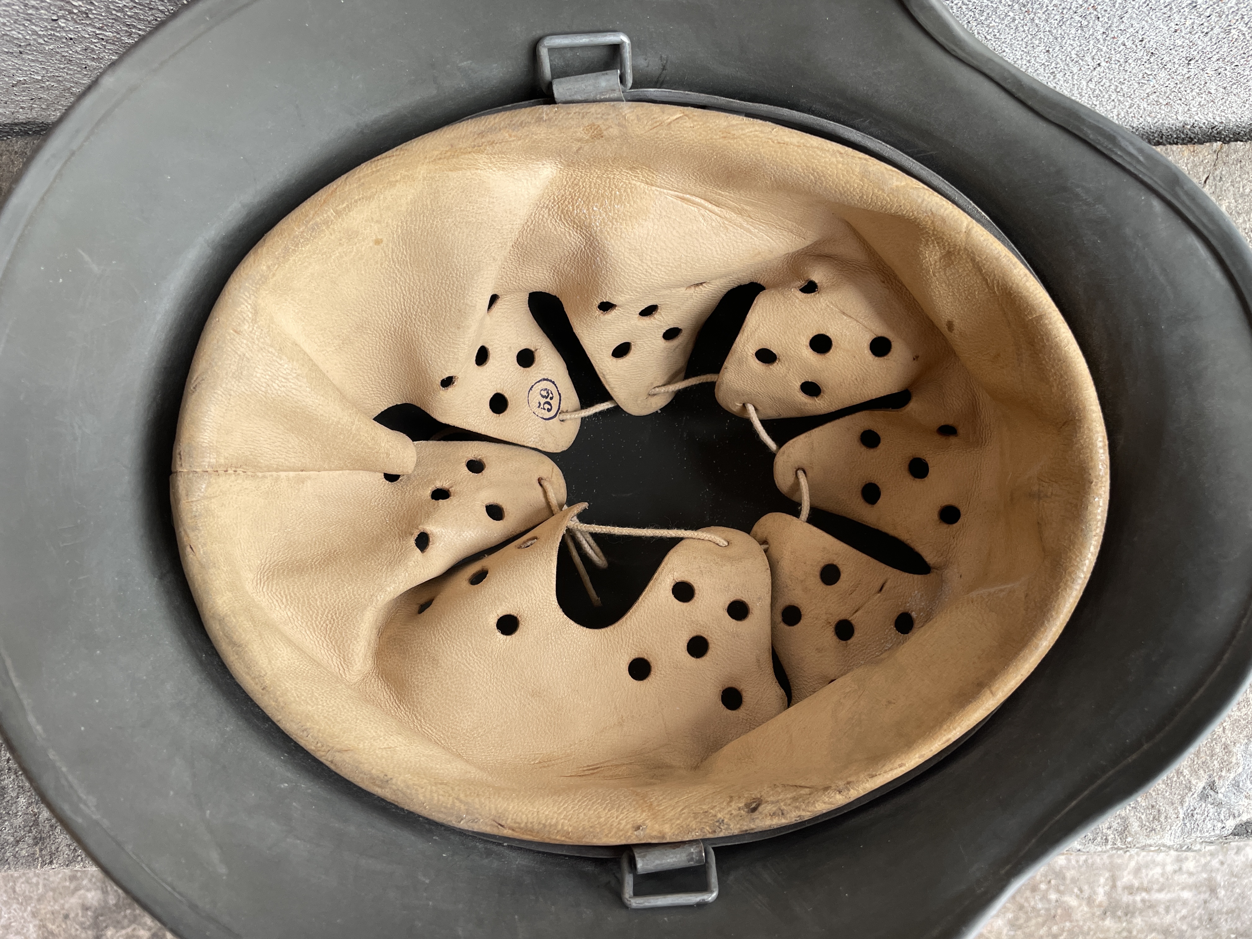 Outside paint is slightly textured feld grau with a smooth enamel finish on the inside and a sheepskin liner system stamped 59 on one of the rear tongues. So a nice big sized M40 example.