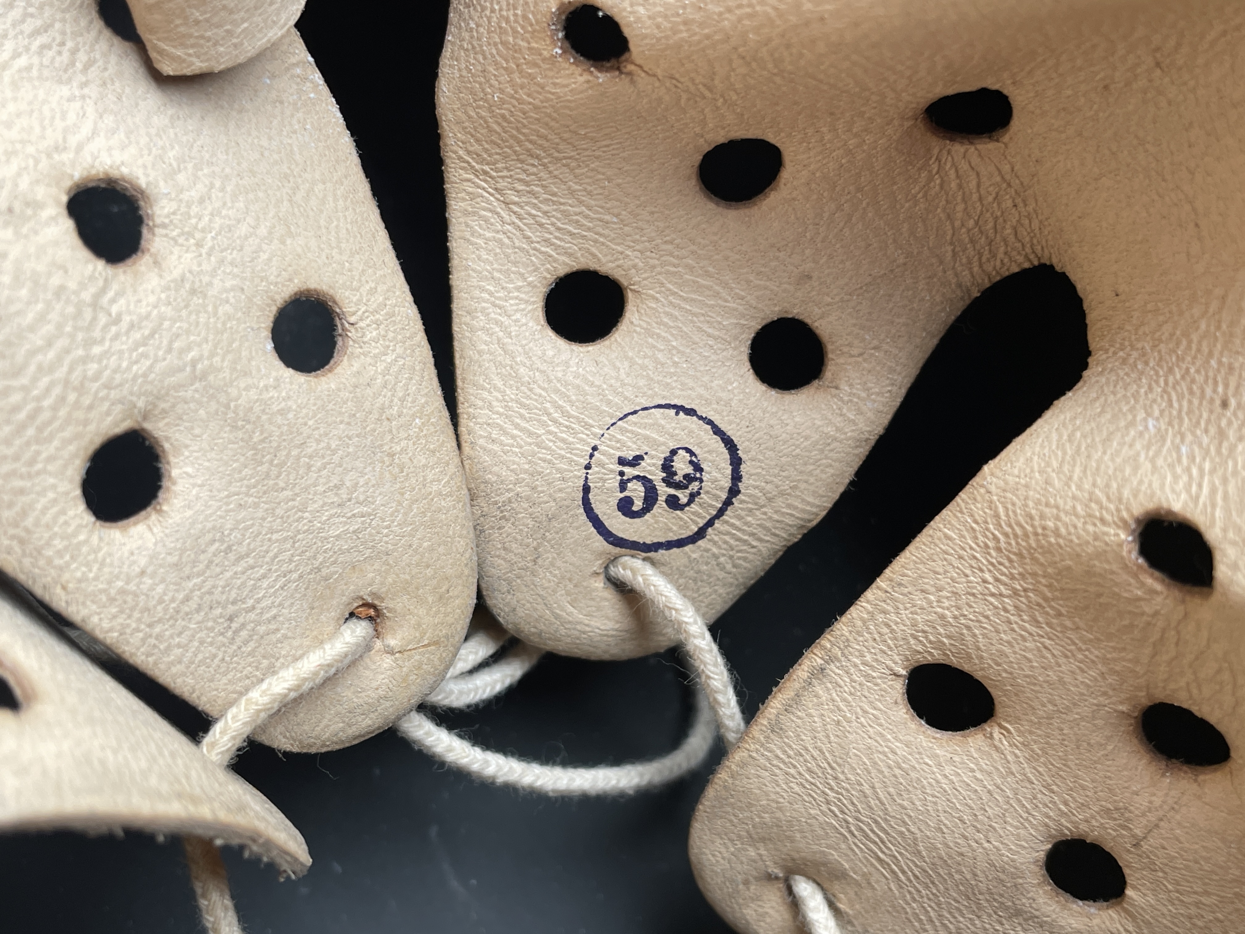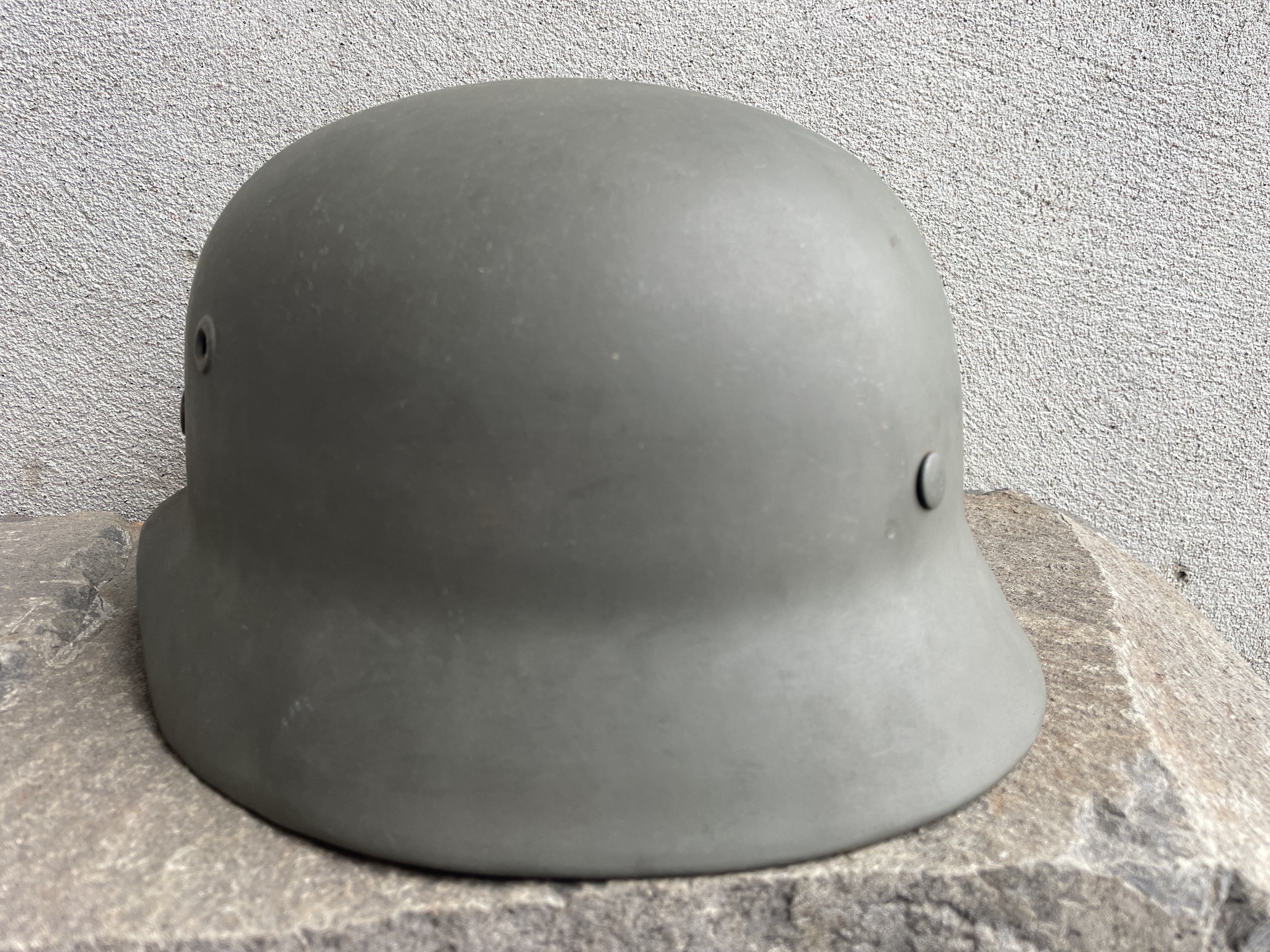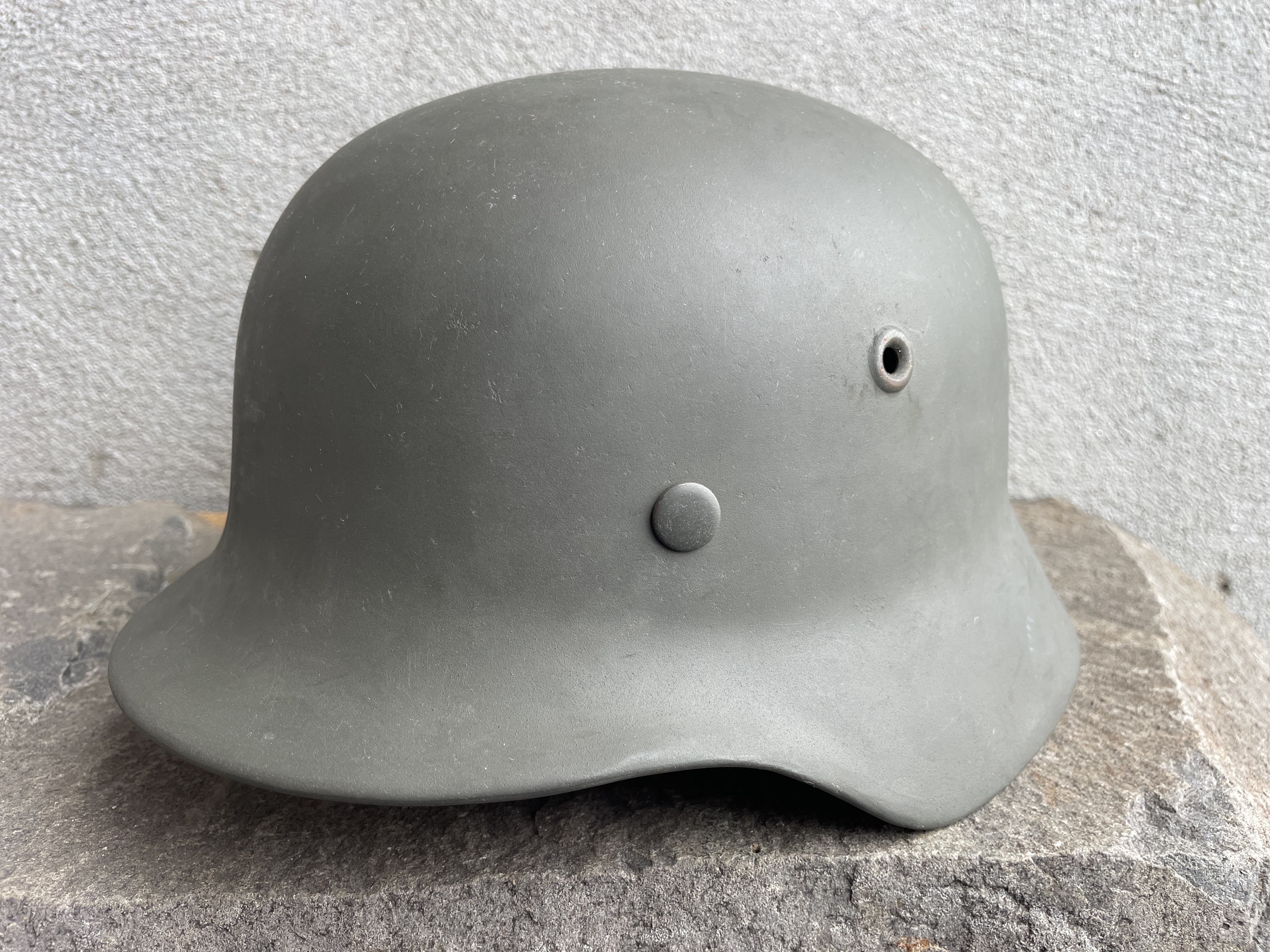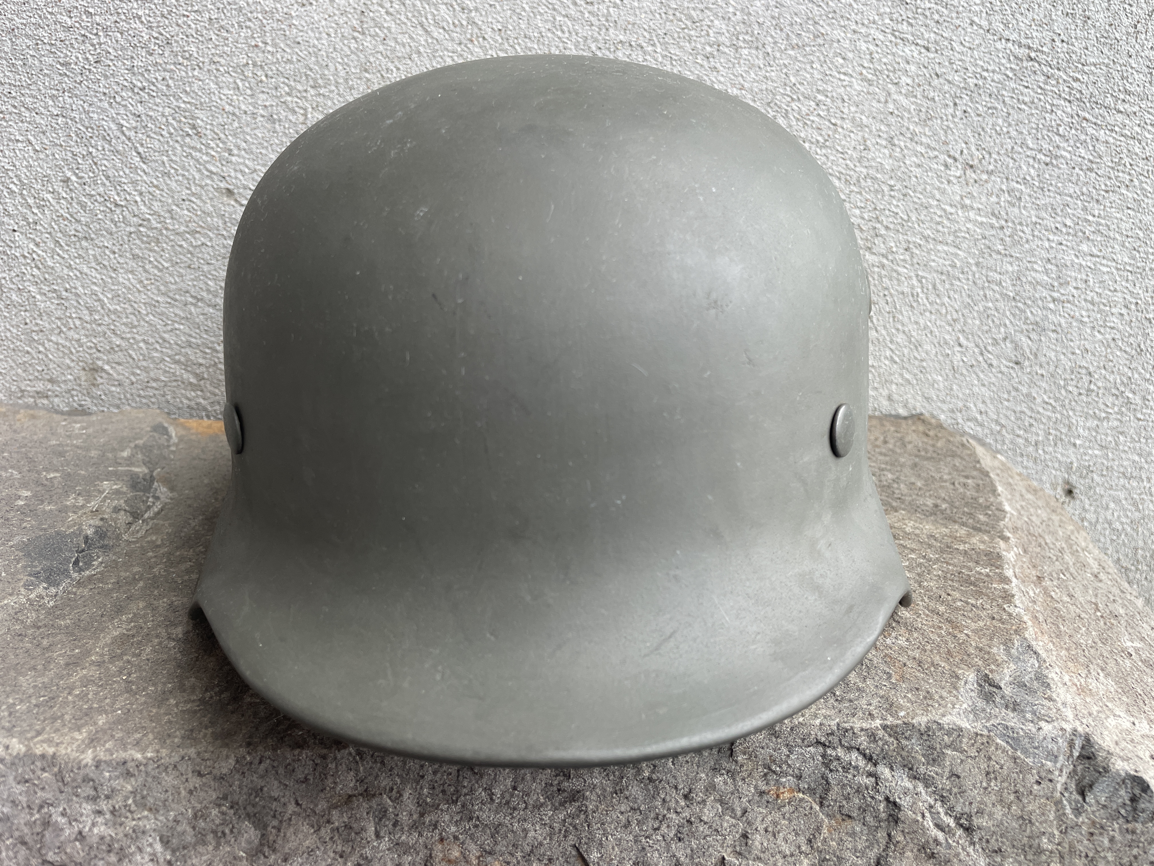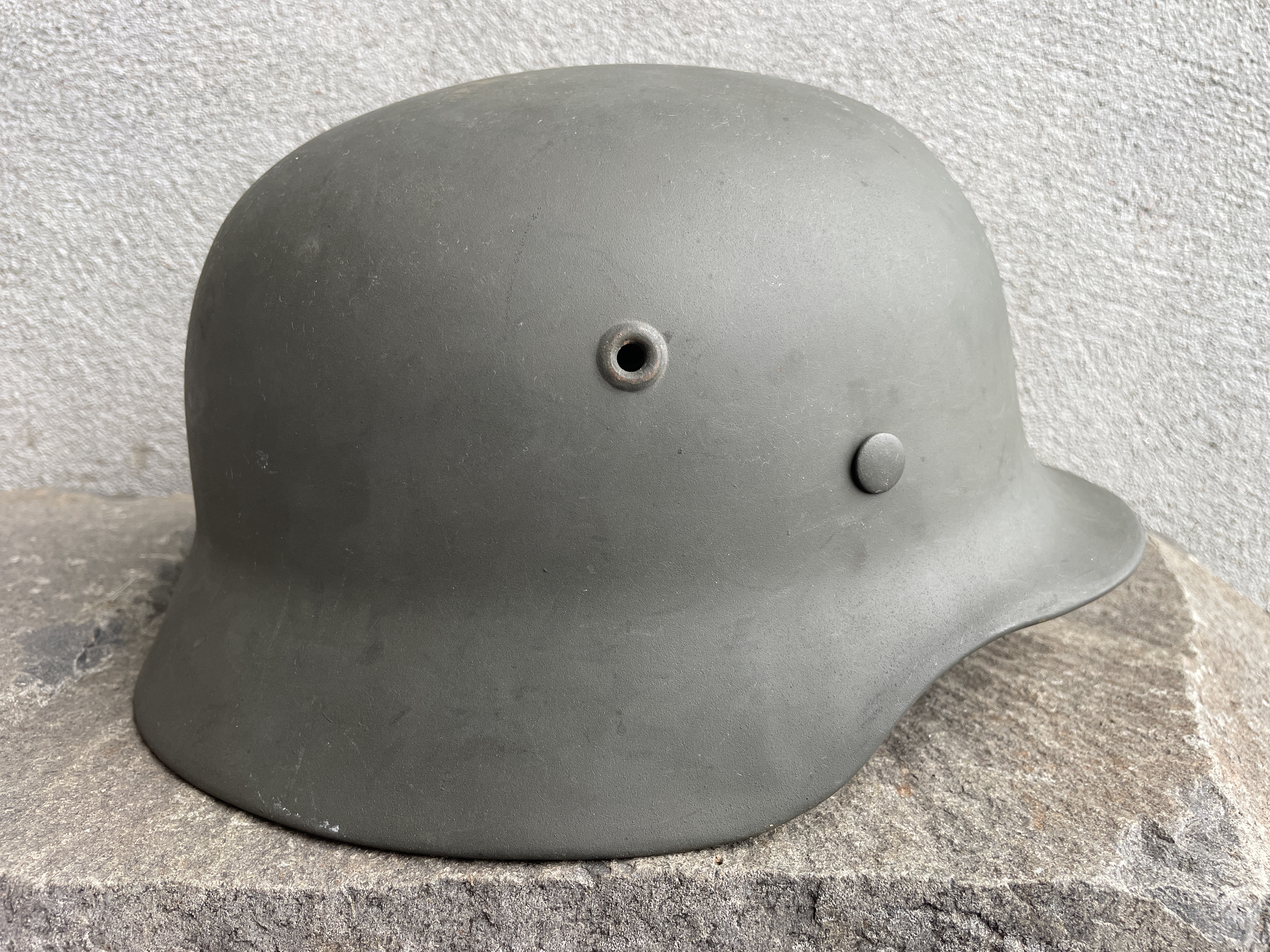 Outside paint is slightly textured feld grau with a smooth enamel finish on the inside and a sheepskin liner system stamped 59 on one of the rear tongues. So a nice big sized M40 example.
