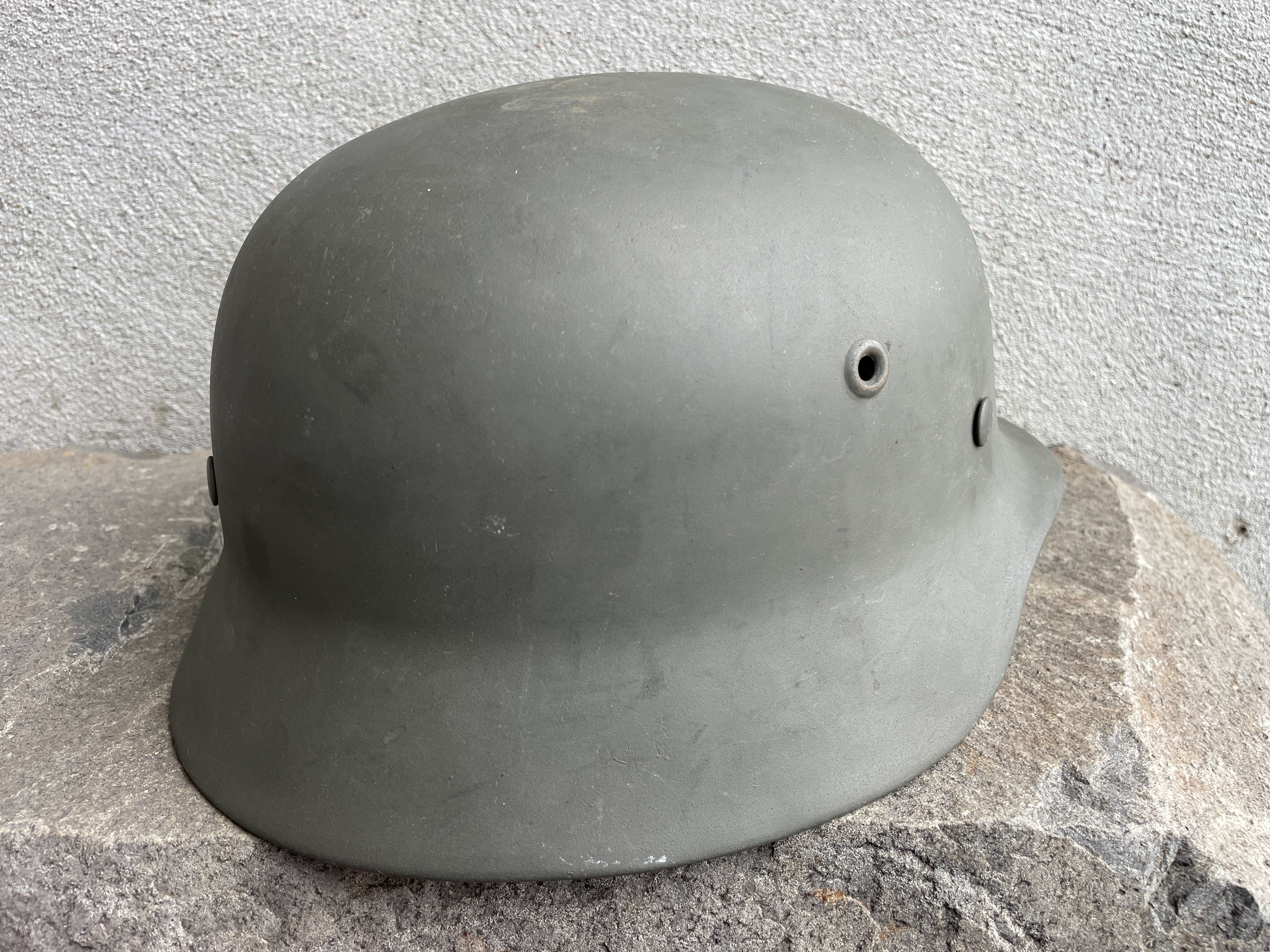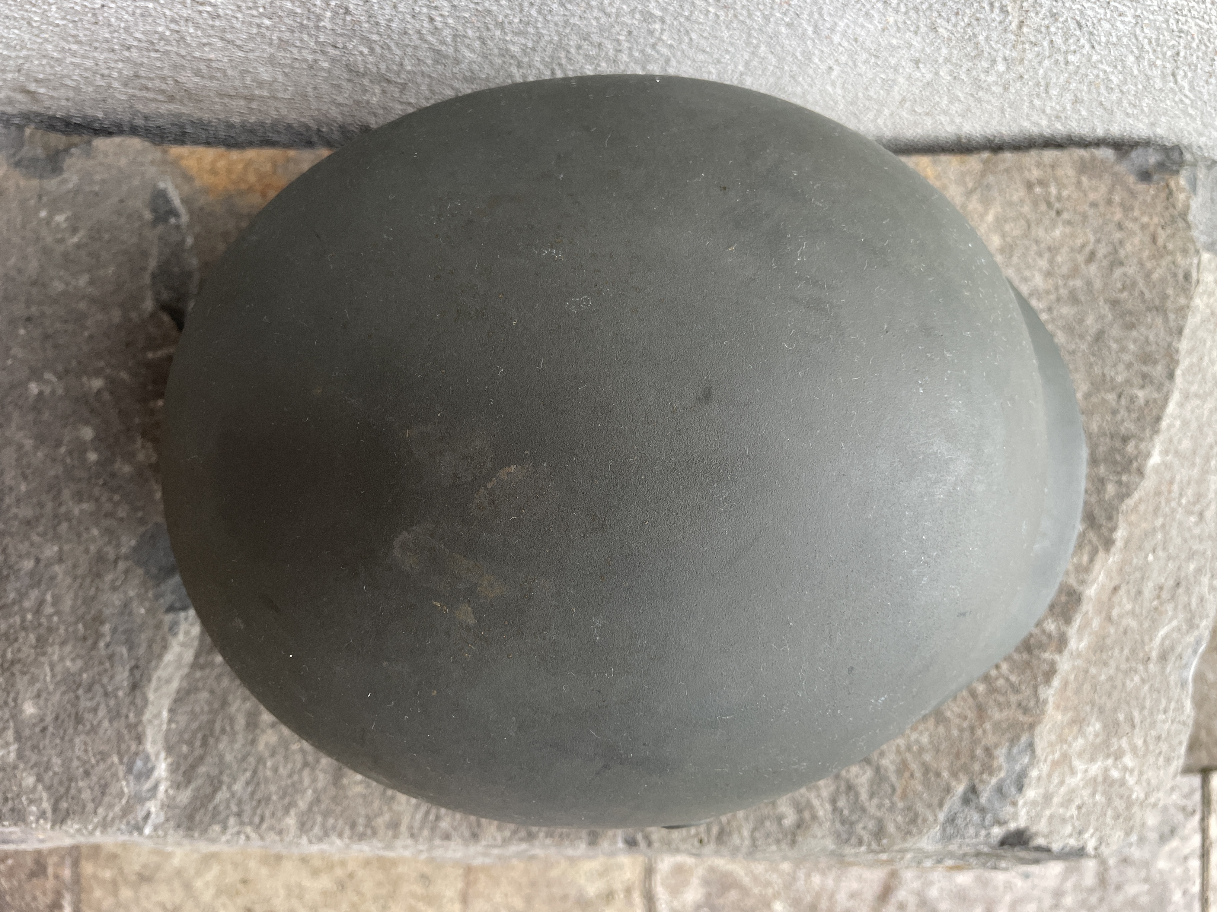 This is a bit of an oddball helmet as it originally came out of the Czech Republic back when I was still able to source shells from there. It was mixed in with a bunch of post war black paint German helmets reused after the war for their civilian fire and police services. It's an oddball find because I'm not sure if this was re-assembled post war by the Czech government using all original German parts they found after the war or if this was a no decal late war WW2 production German helmet that was found in storage post 1945 never issued or used. I guess both possibilities should be entertained.