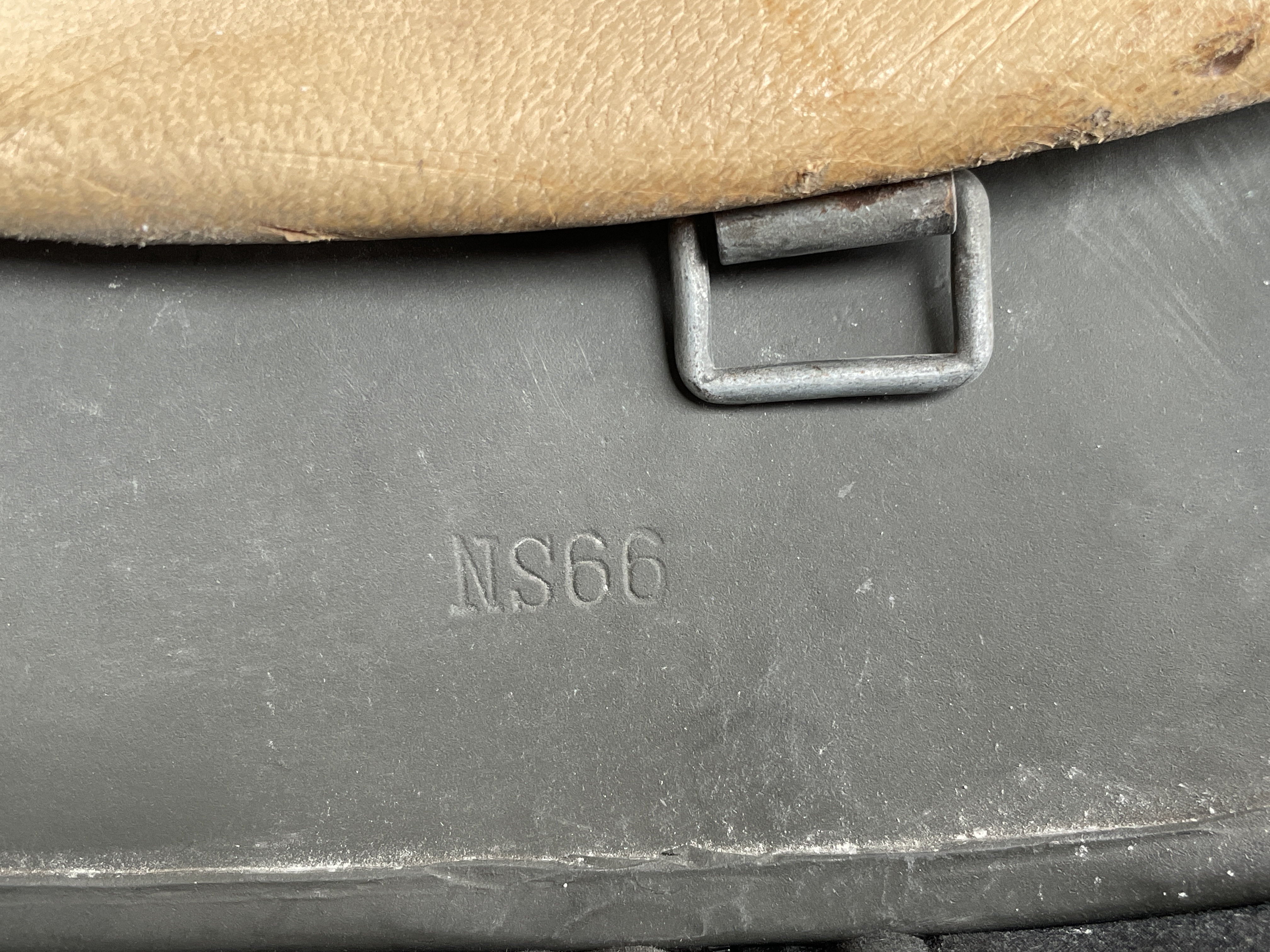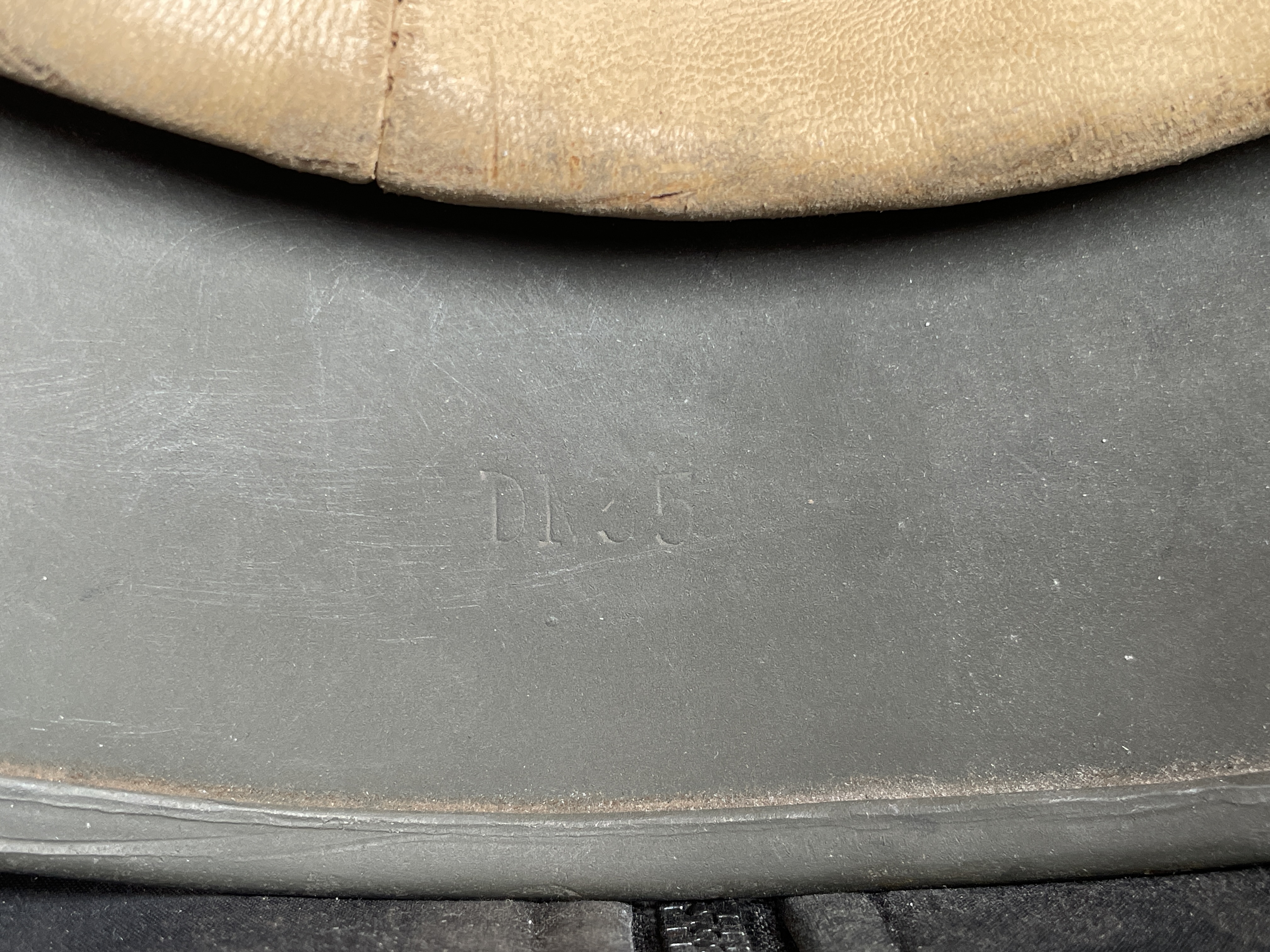 (Every original German helmet produced from 1935 to 45 had two factory stampings punched into the side and rear or both in the rear. The alpha numeric number refers to the factory location and the inside metric circumference in centimeters. The rear lot number refers to the production run and was used as a quality control measure. The font styles used at each factory were slightly different but highly consistent throughout the war and so fakes or reproductions will either not have these numbers at all or they will use the wrong font style or letter spacing and so are easily identified as post war made.)