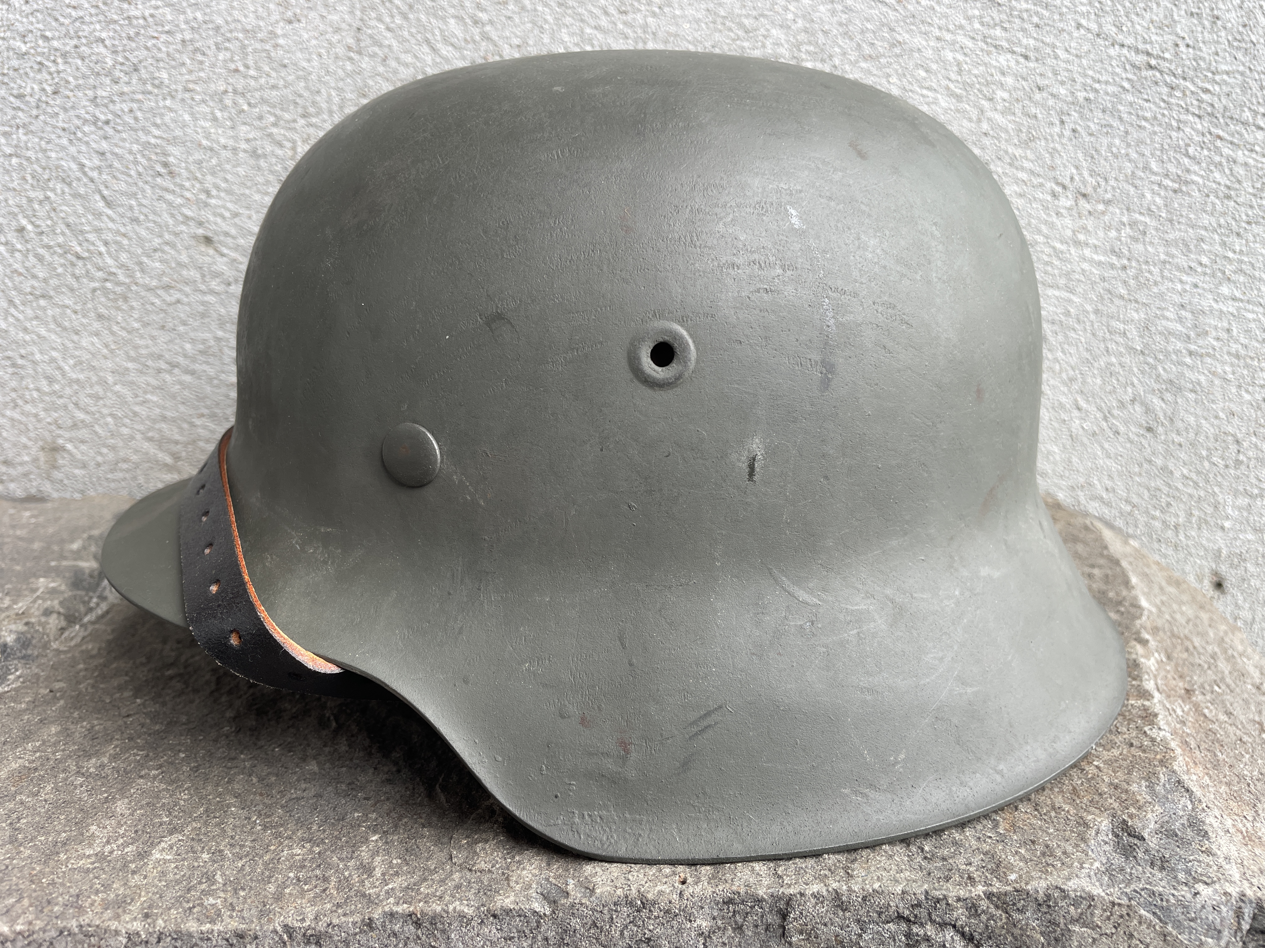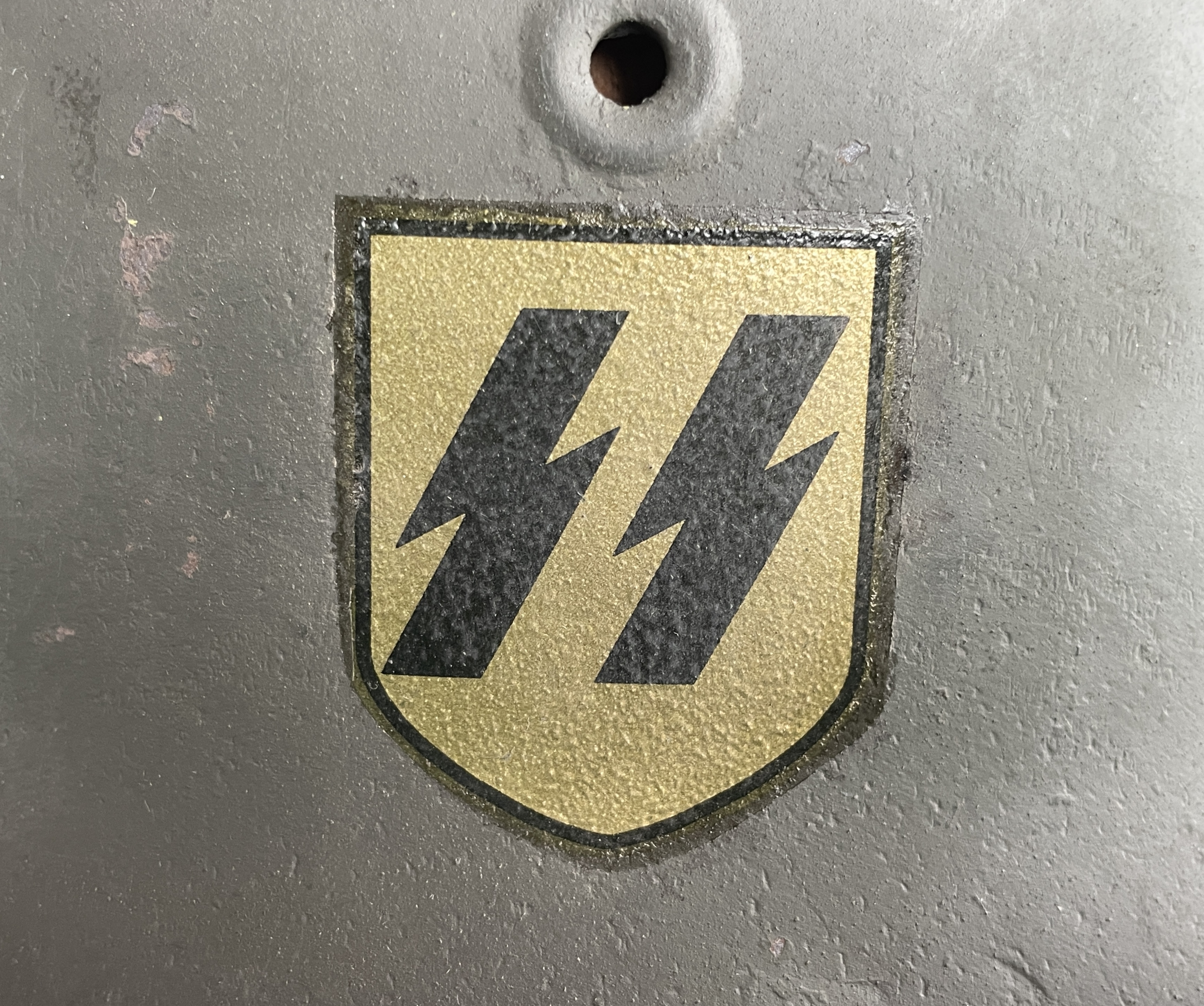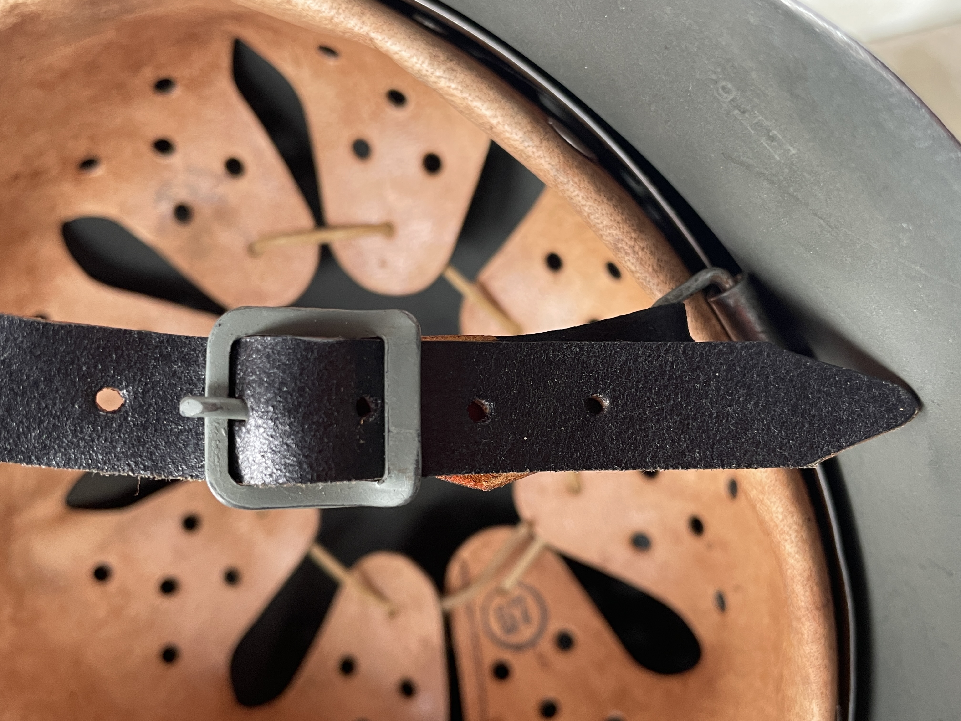 The helmet was given a field gray enamel paint finish smooth on the inside but with rough texture on the outside, then a factory textbook EF SS decal was added whereby the left more rakish rune almost touches the outside black shield line. A professionally aged liner and RBN numbered chinstrap was added to complete the piece.