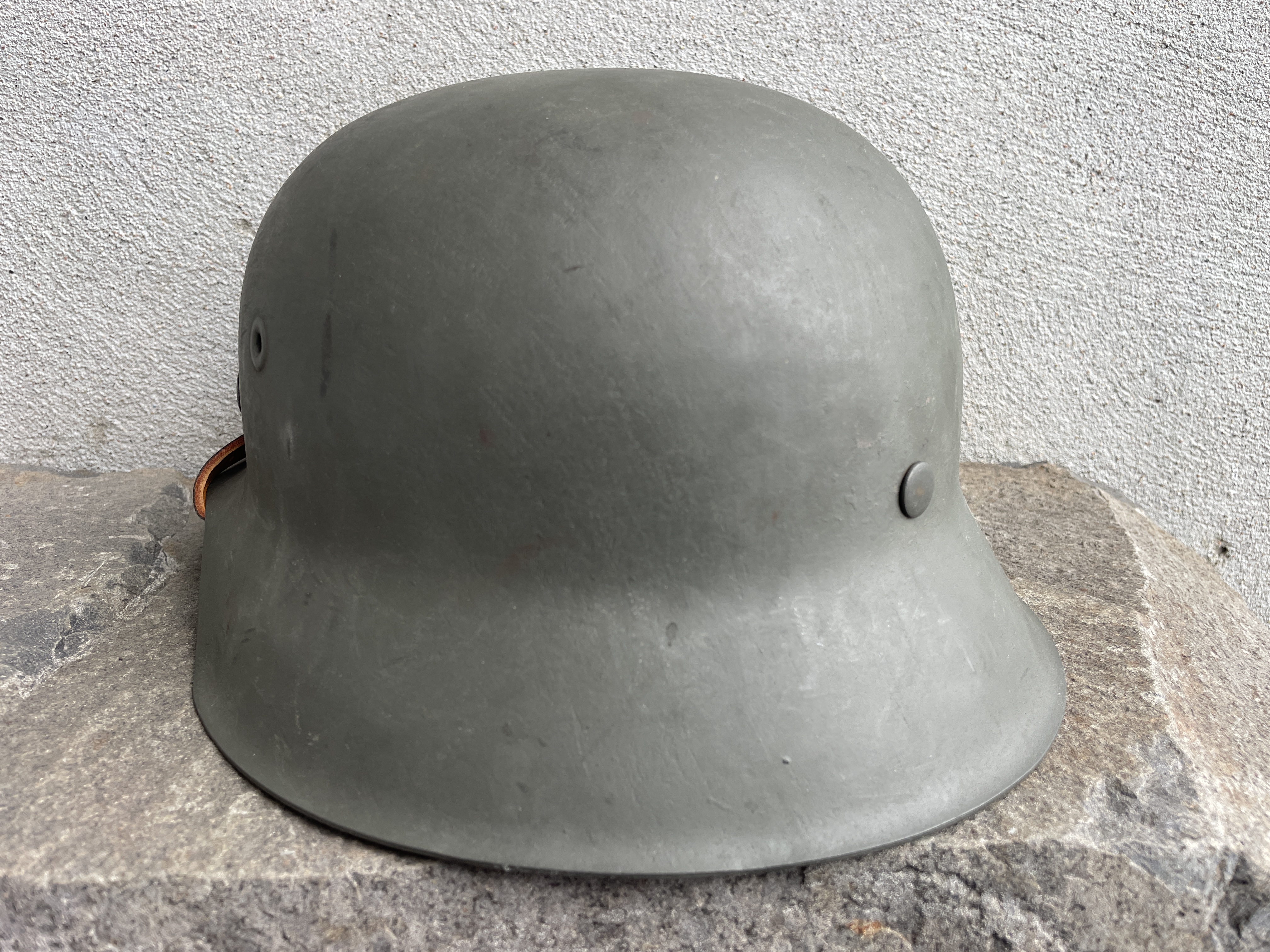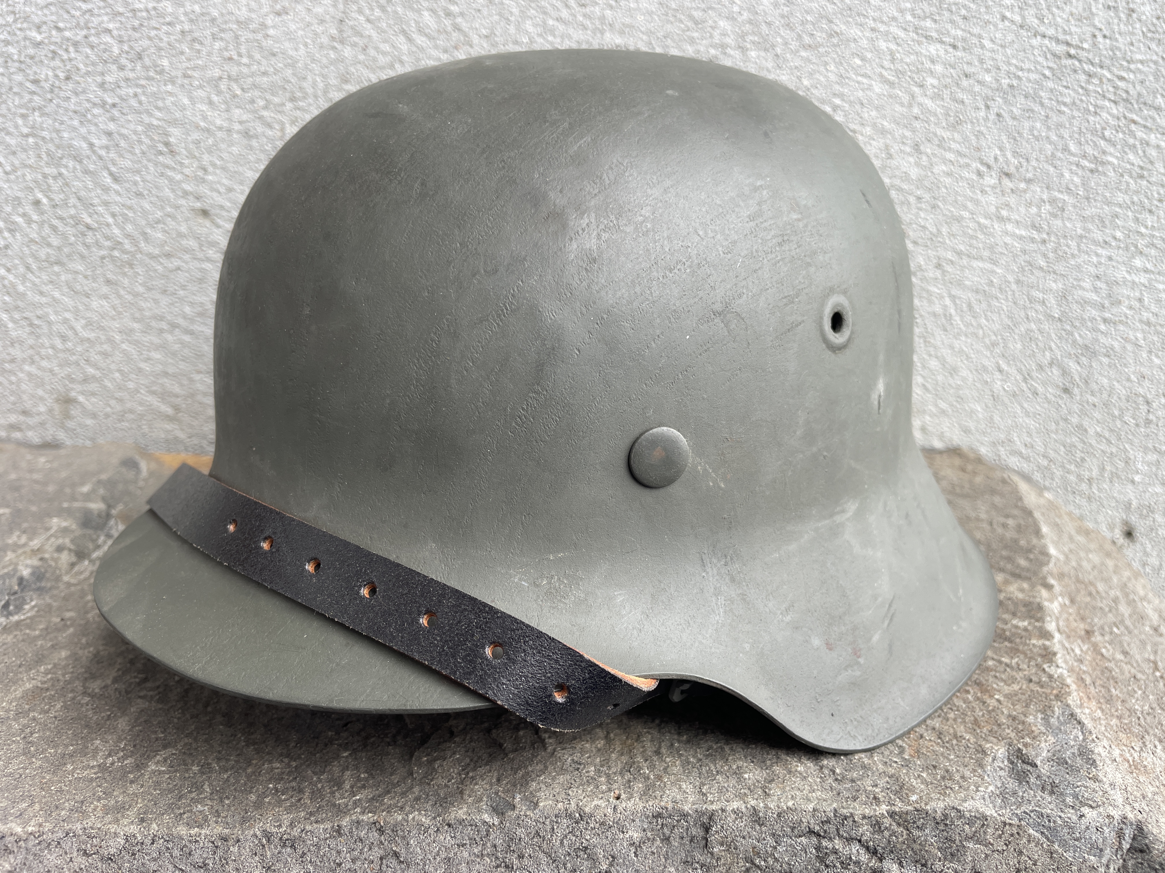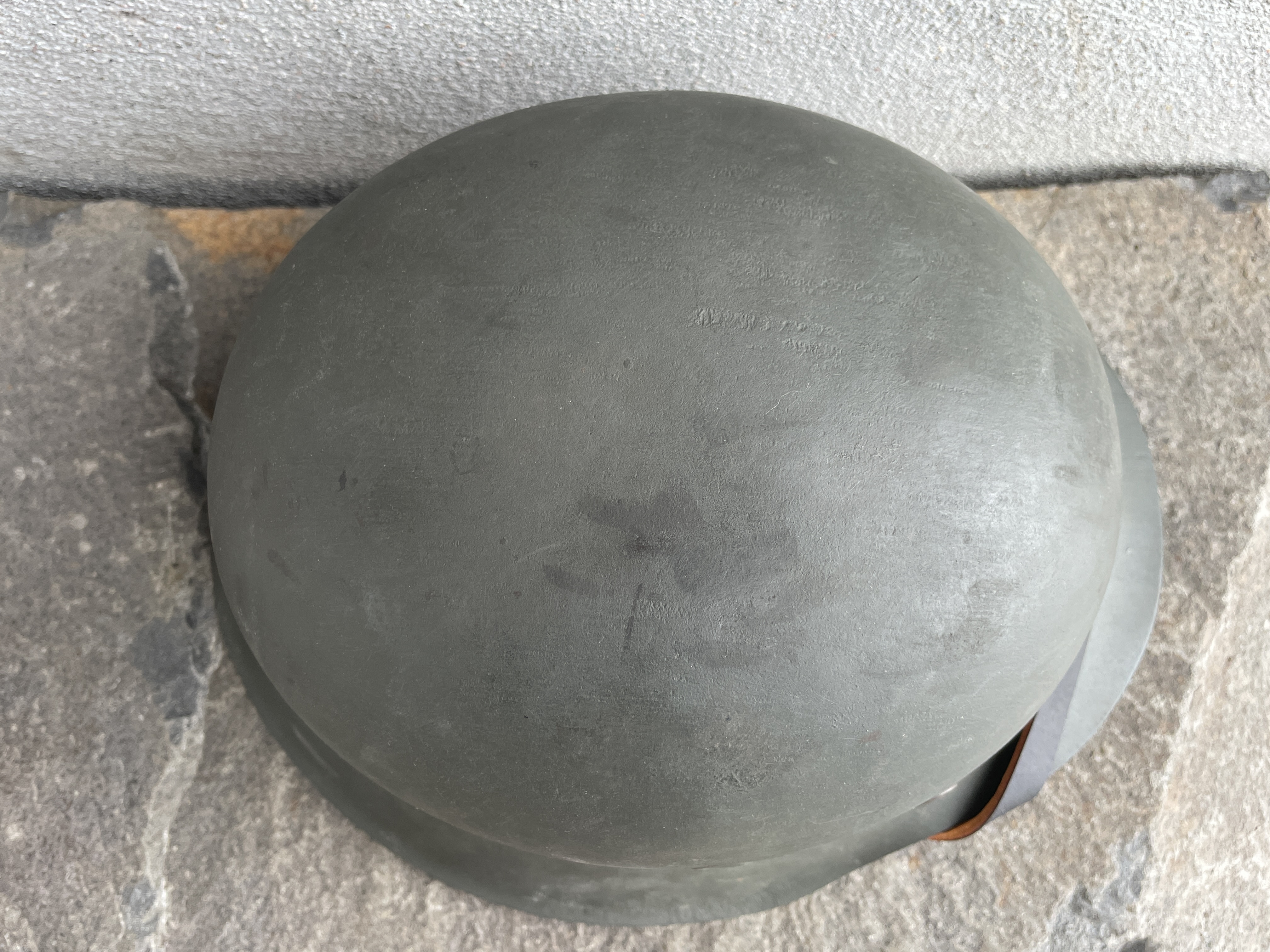 The helmet was given a field gray enamel paint finish smooth on the inside but with rough texture on the outside, then a factory textbook EF SS decal was added whereby the left more rakish rune almost touches the outside black shield line. A professionally aged liner and RBN numbered chinstrap was added to complete the piece.