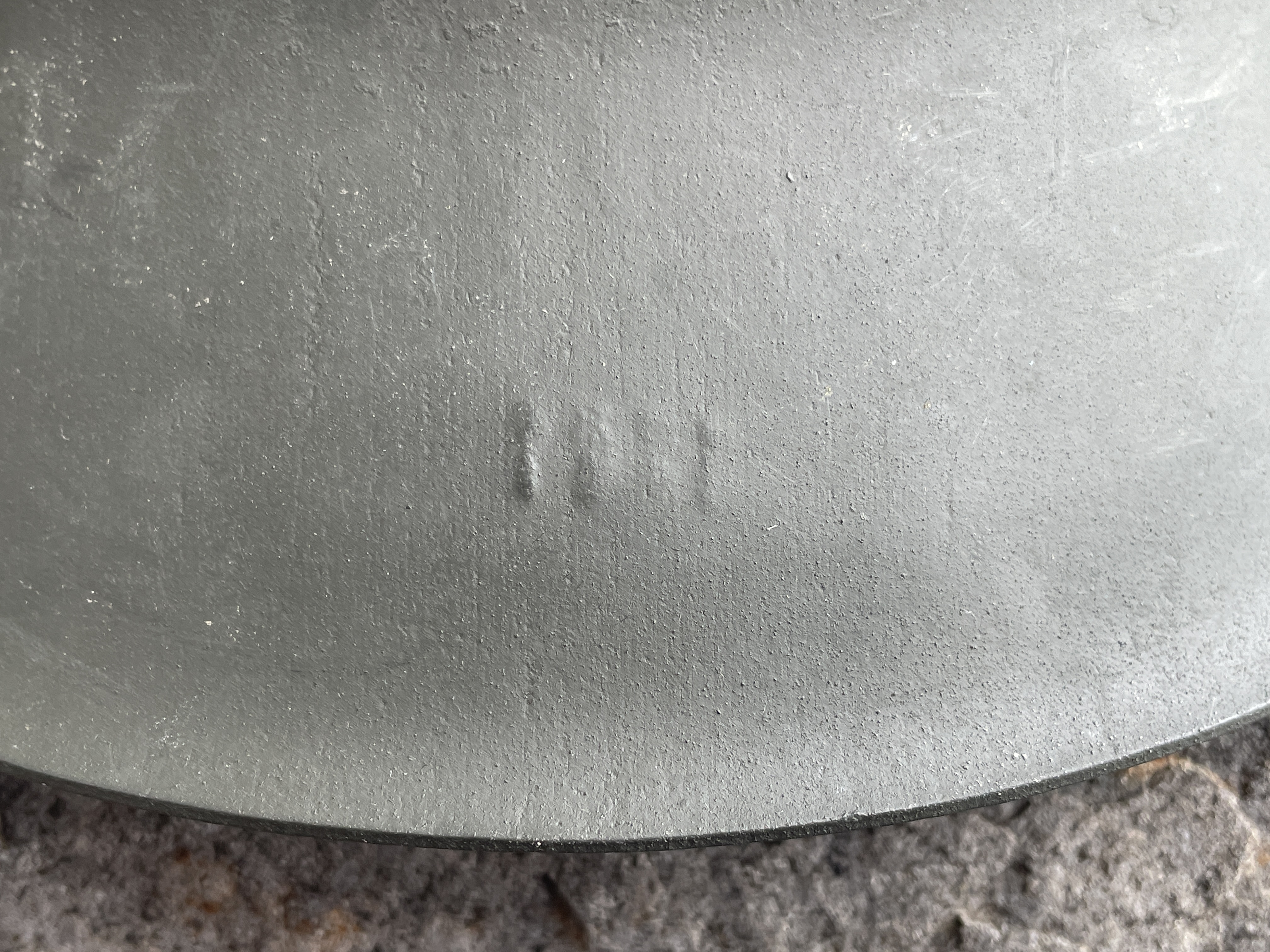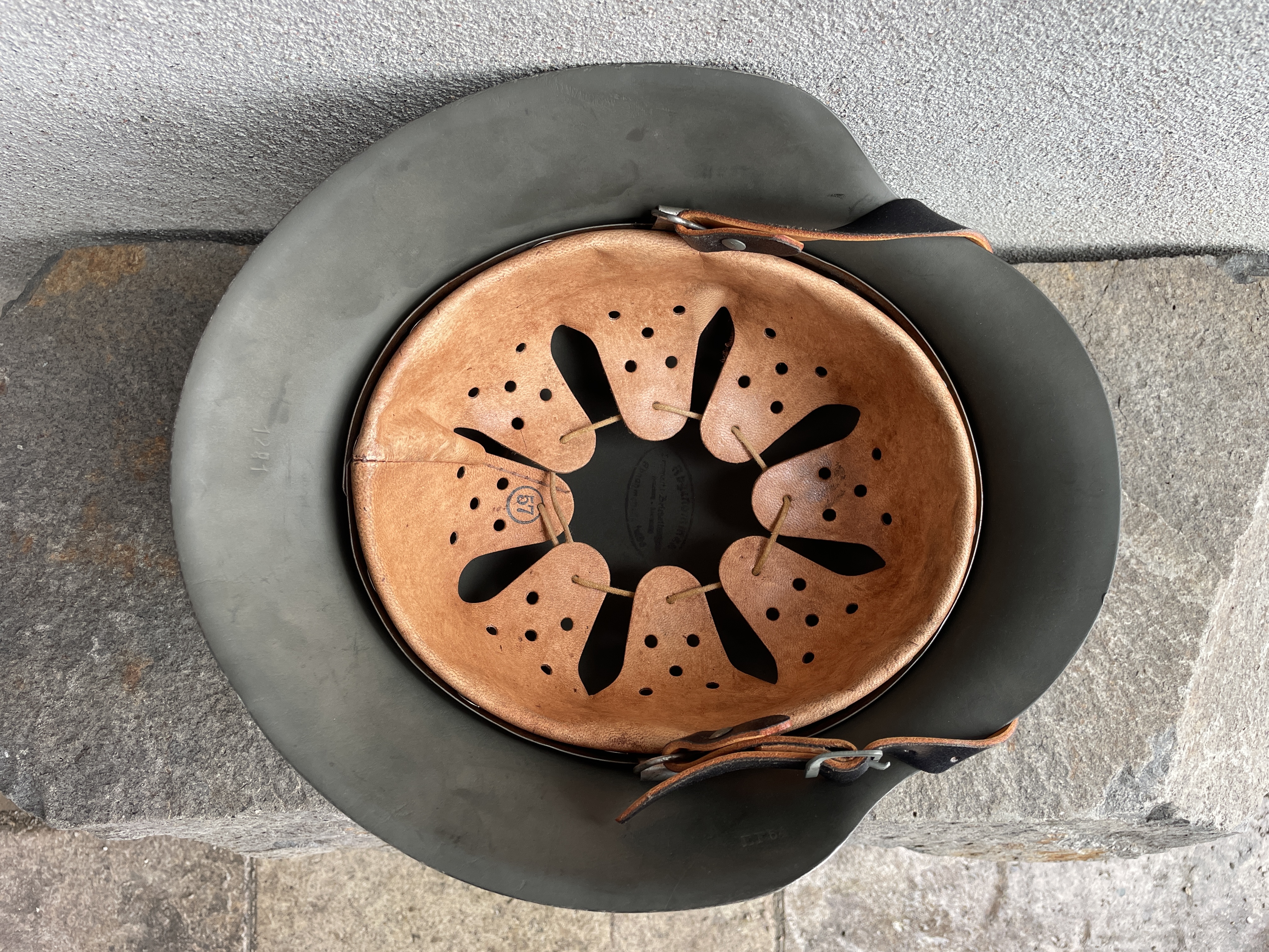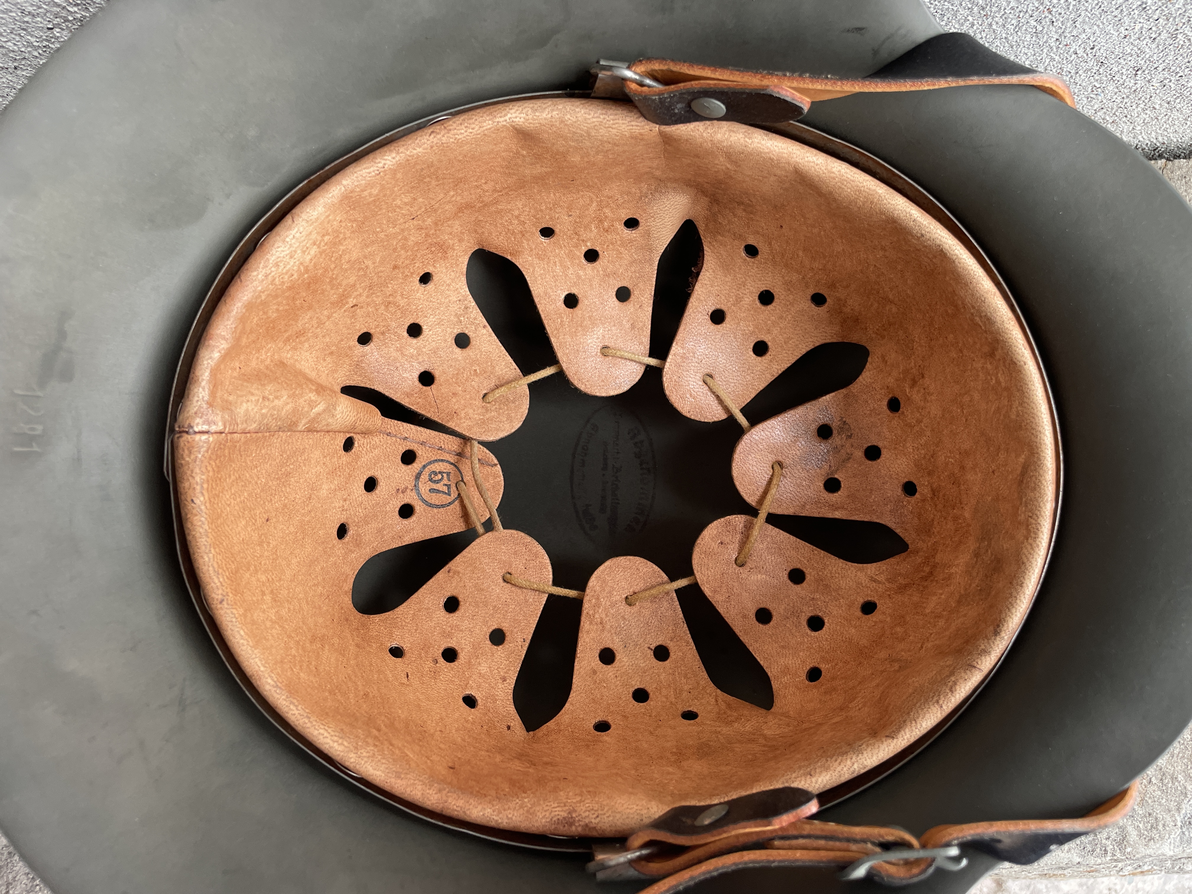 This helmet was original painted in 1950's Czech black paint which although ugly to look at definitely served the helmet well by preserving the underlying steel from the elements over time. Most EF helmets have very weak stampings with barely visible factory markings but this helmet is a nice exception to that rule with clearly legible alphanumeric indentations so much so that you can actually see the rear lot protruding slightly from the back skirt.