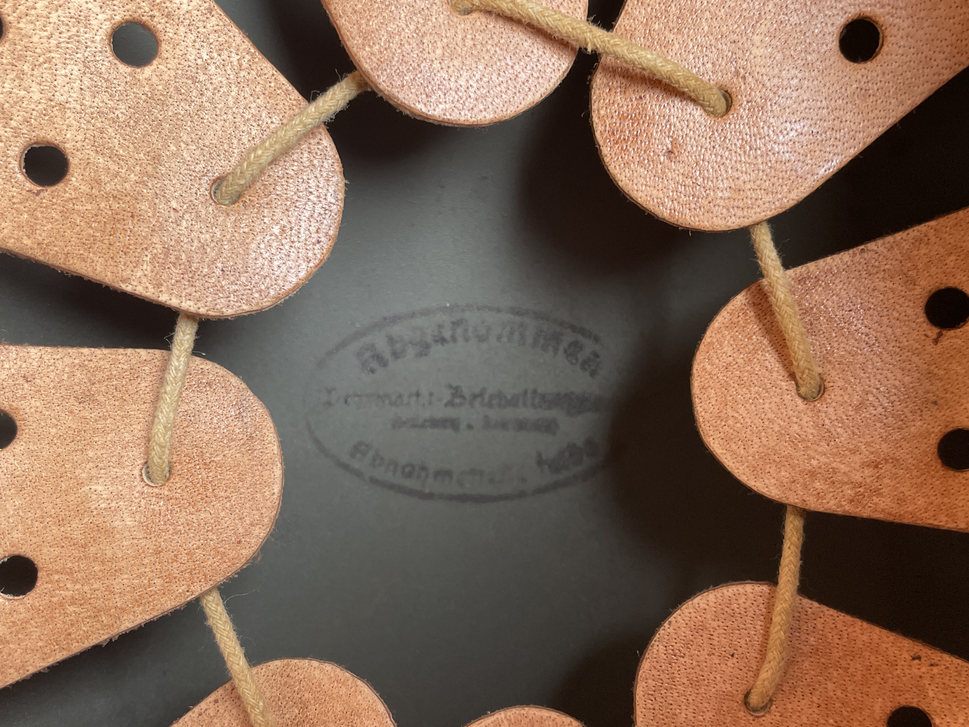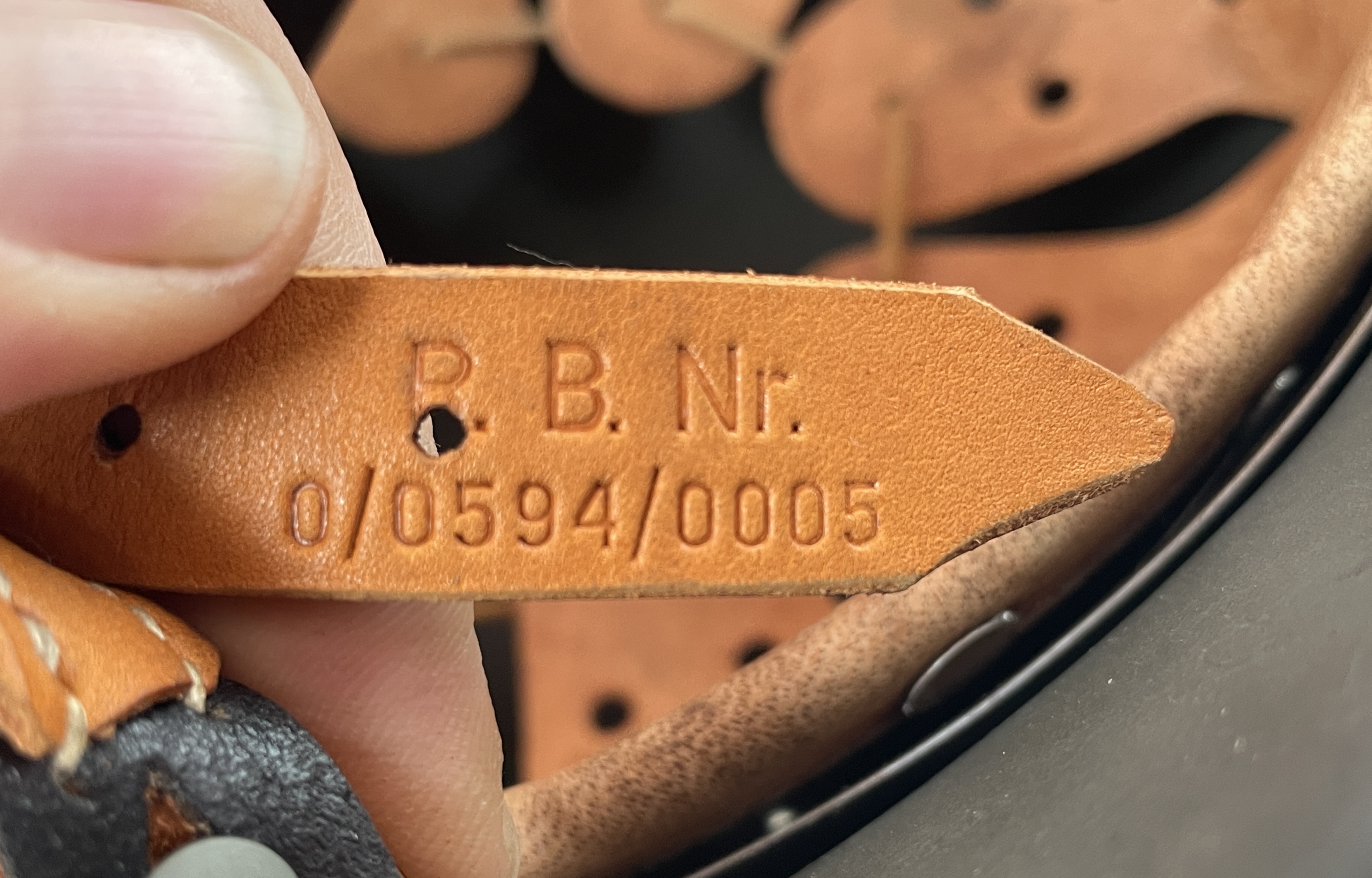 (Every original German helmet produced from 1935 to 45 had two factory stampings punched into the side and rear or both in the rear. The alpha numeric number refers to the factory location and the inside metric circumference in centimeters. The rear lot number refers to the production run and was used as a quality control measure. The font styles used at each factory were slightly different but highly consistent throughout the war and so fakes or reproductions will either not have these numbers at all or they will use the wrong font style or letter spacing and so are easily identified as post war made.)