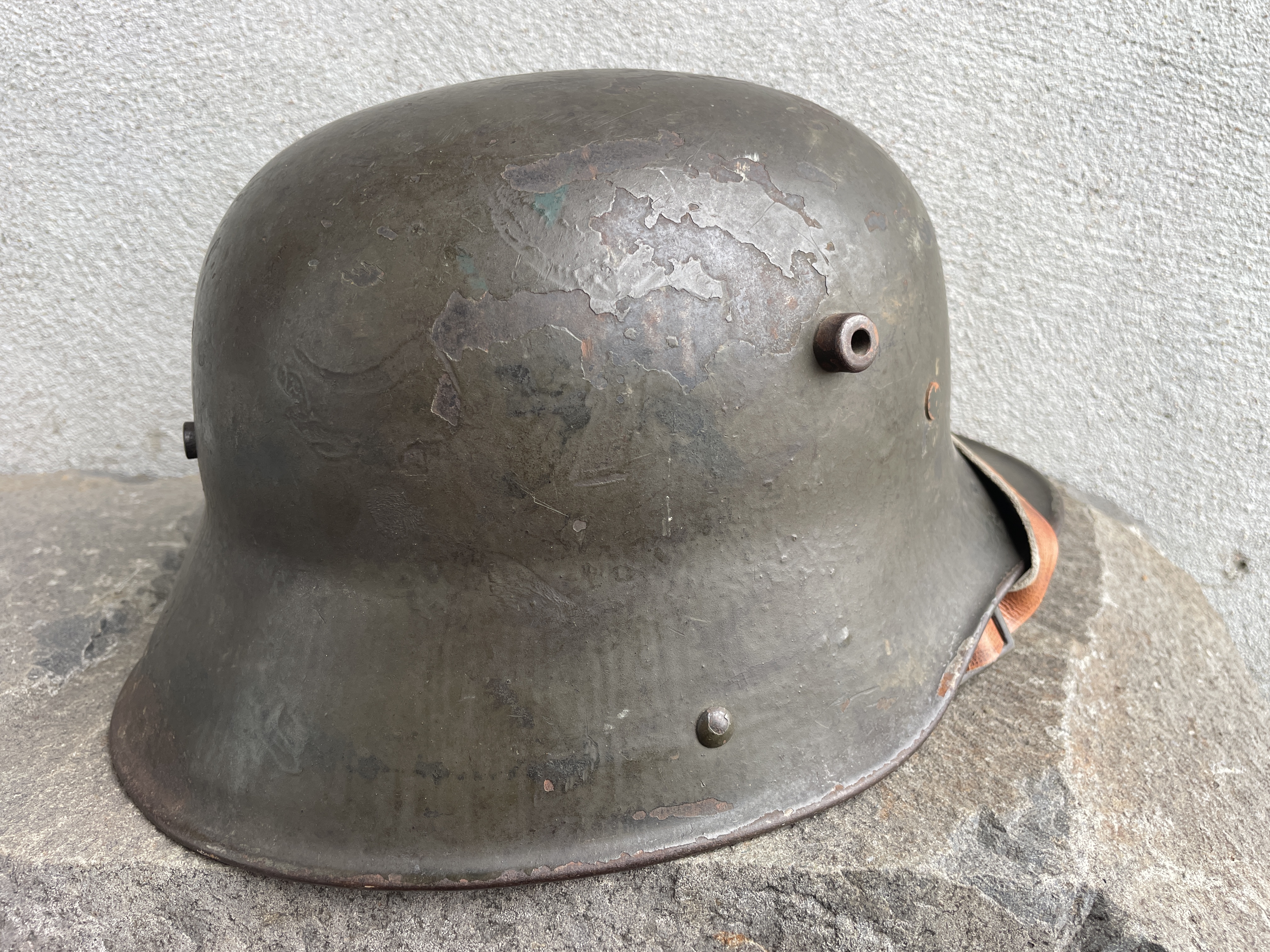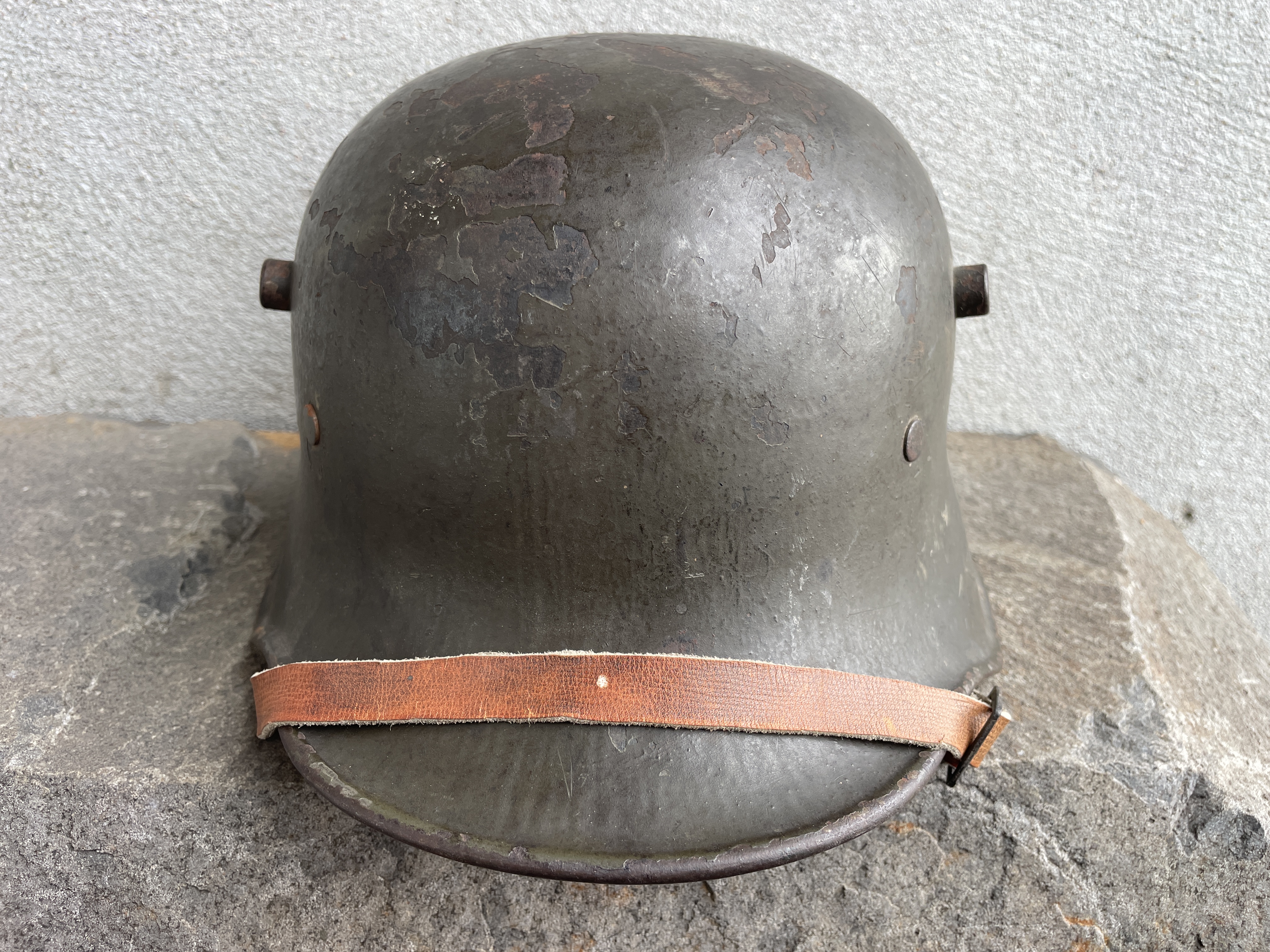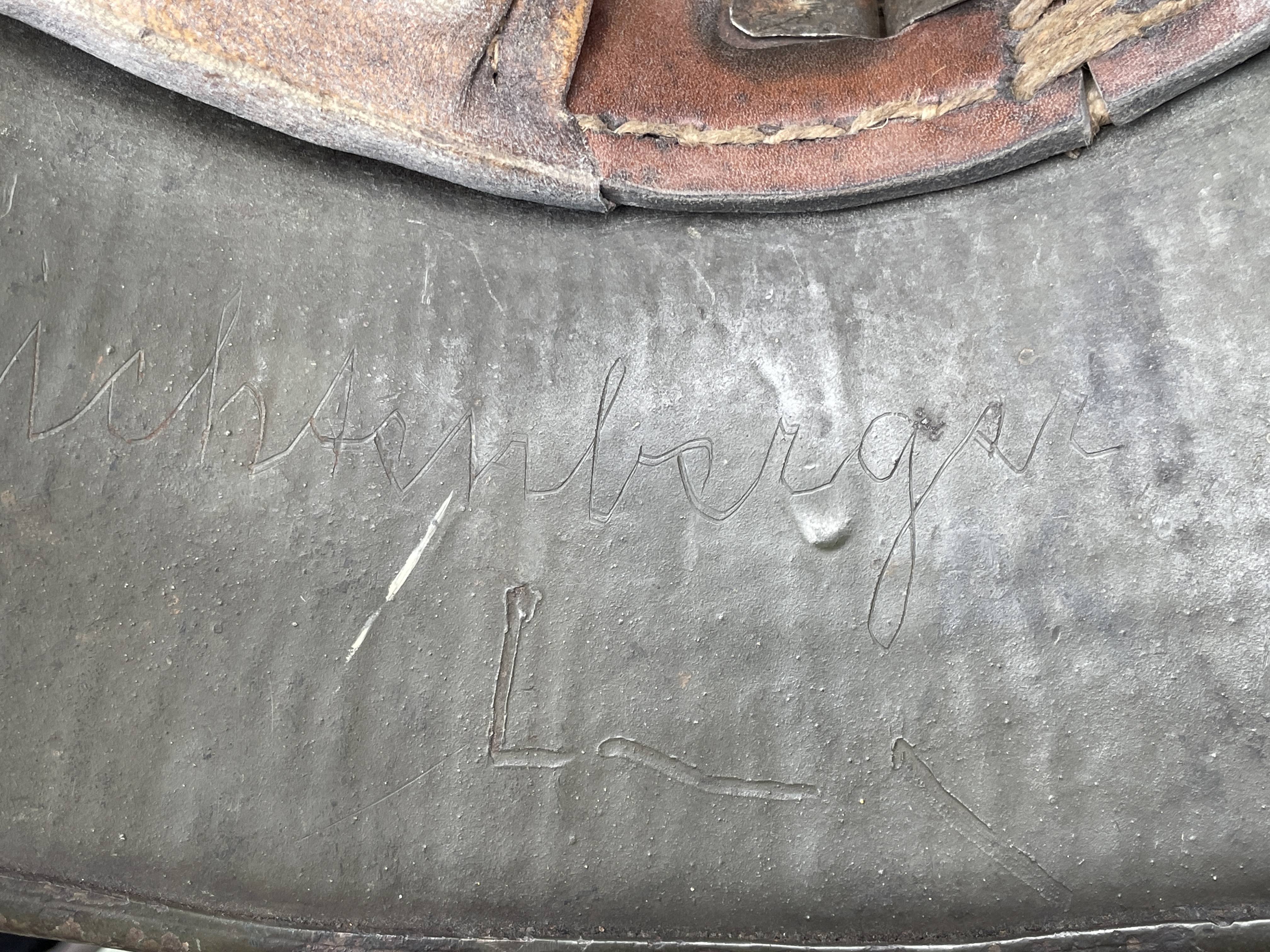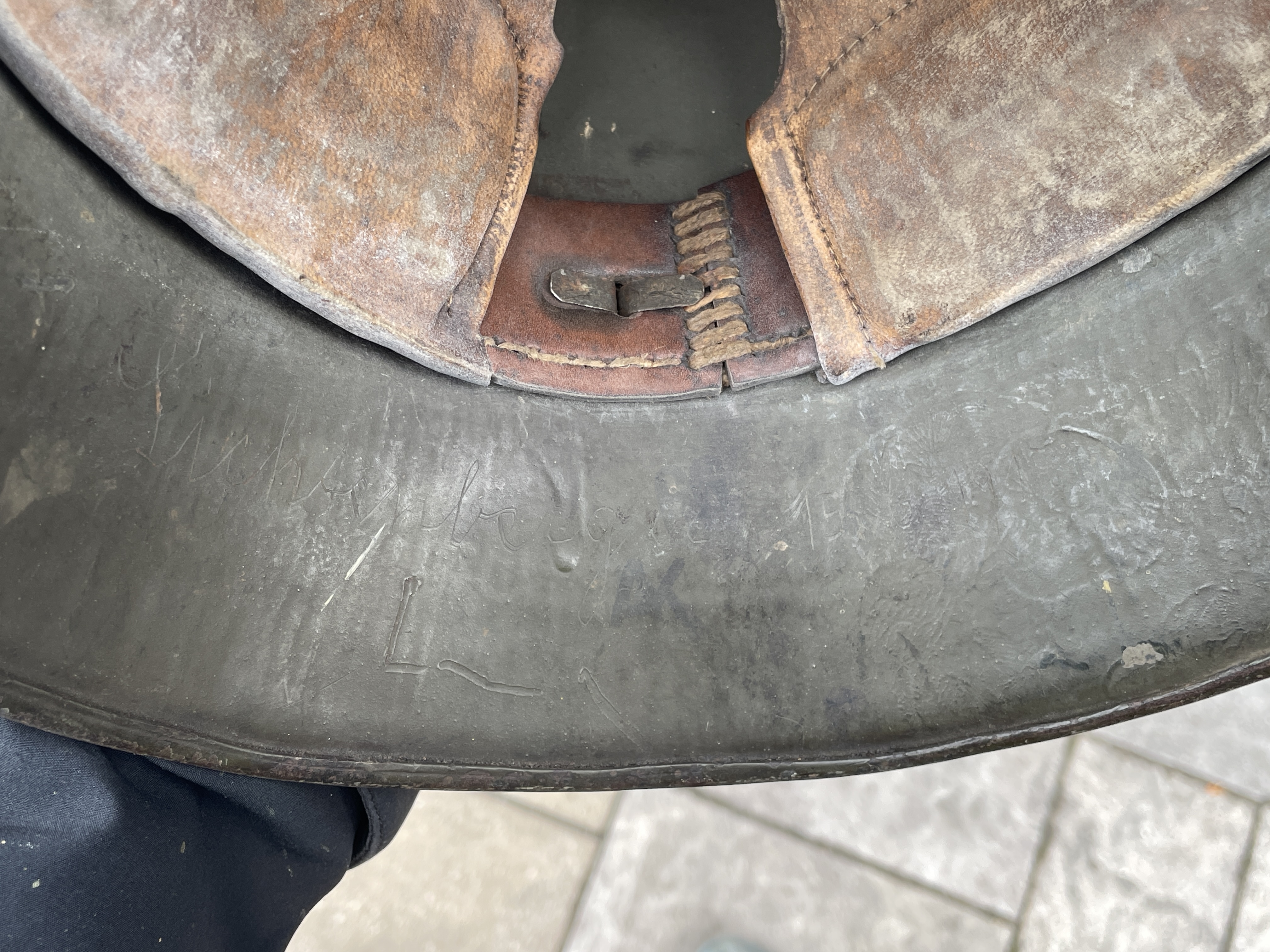 A very interesting highlight of this helmet is that at the back skirt the original German solider engraved his name and date in what must have been a pocket knife the following words: "Lichtenberger 15, 6, 1917" which must refer to his last name and date June 15, 1917.