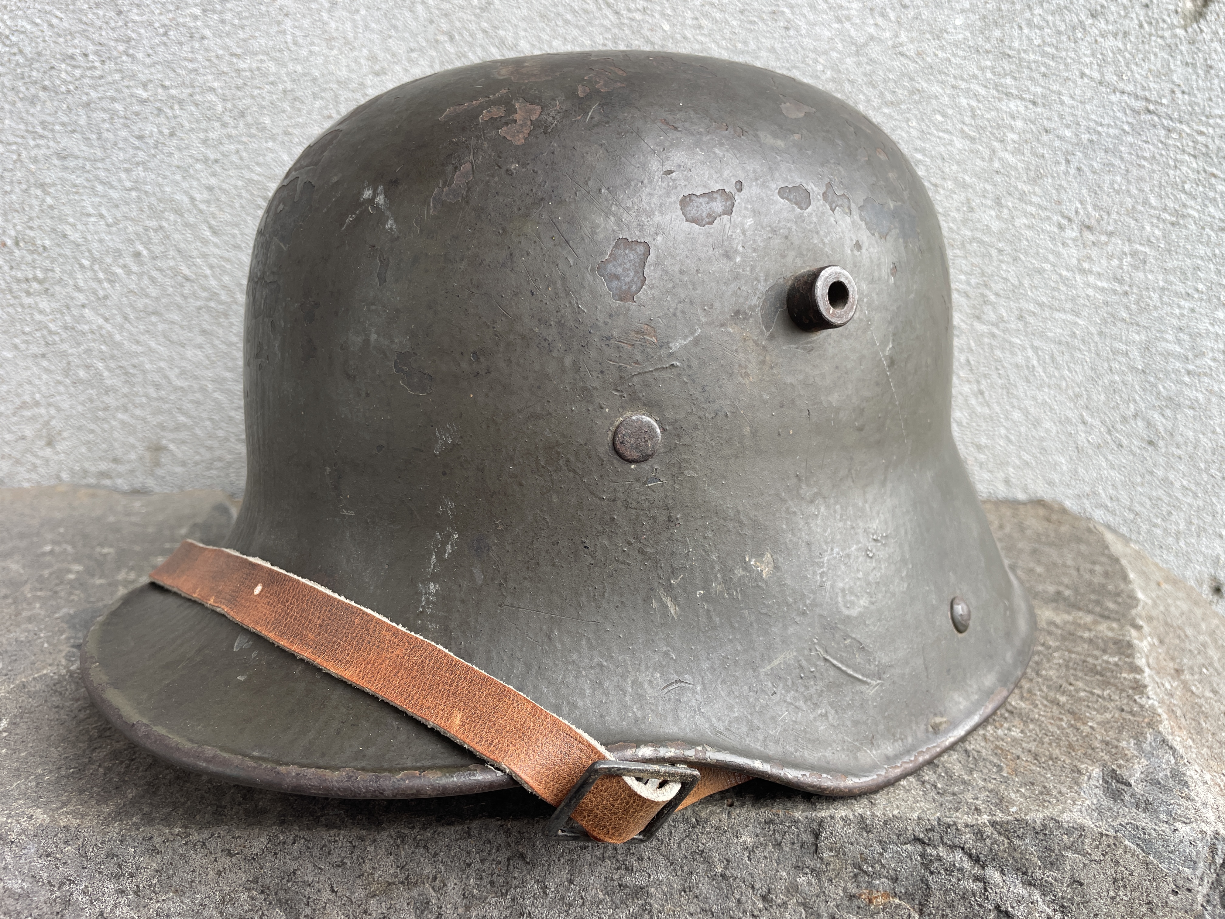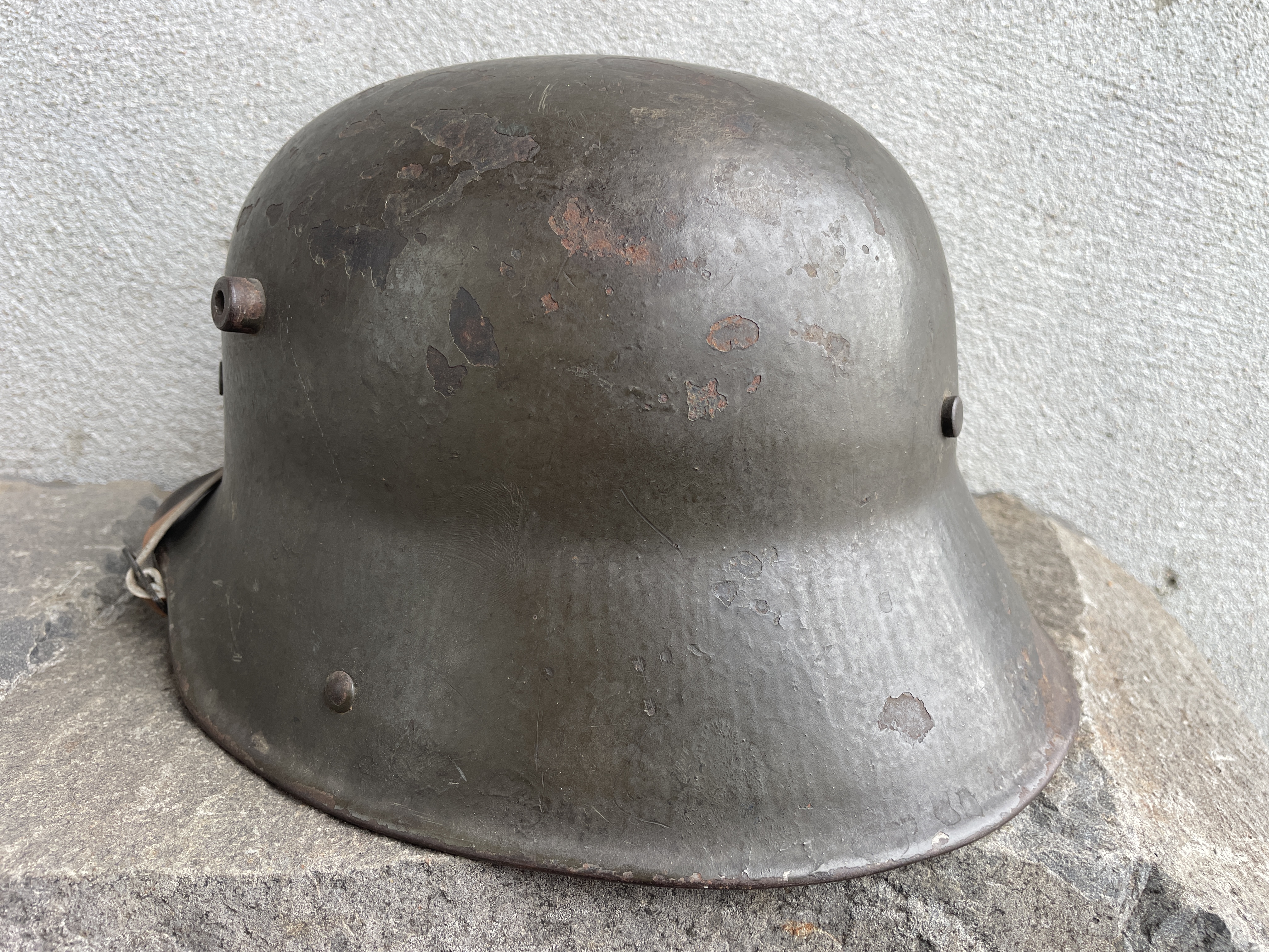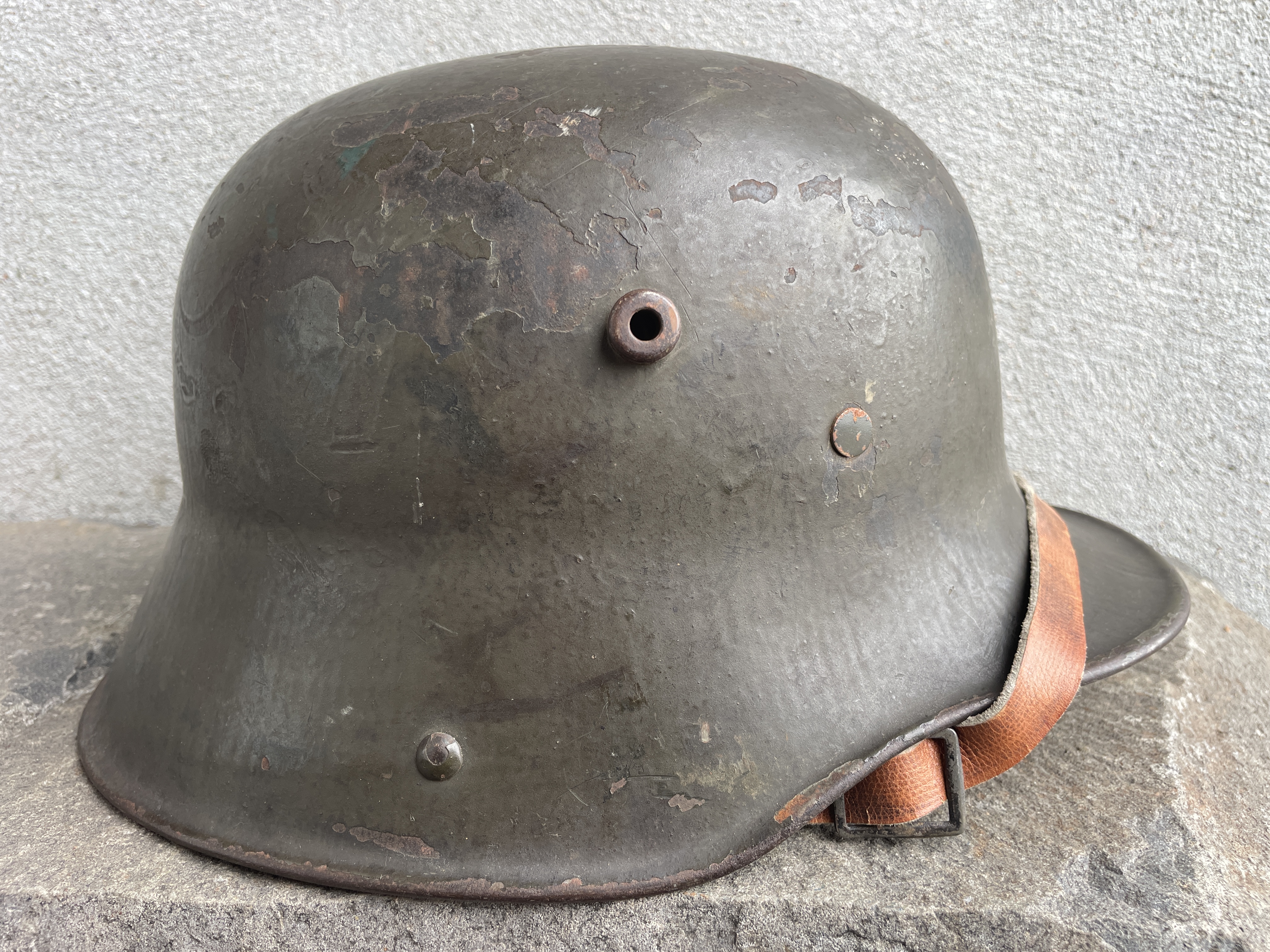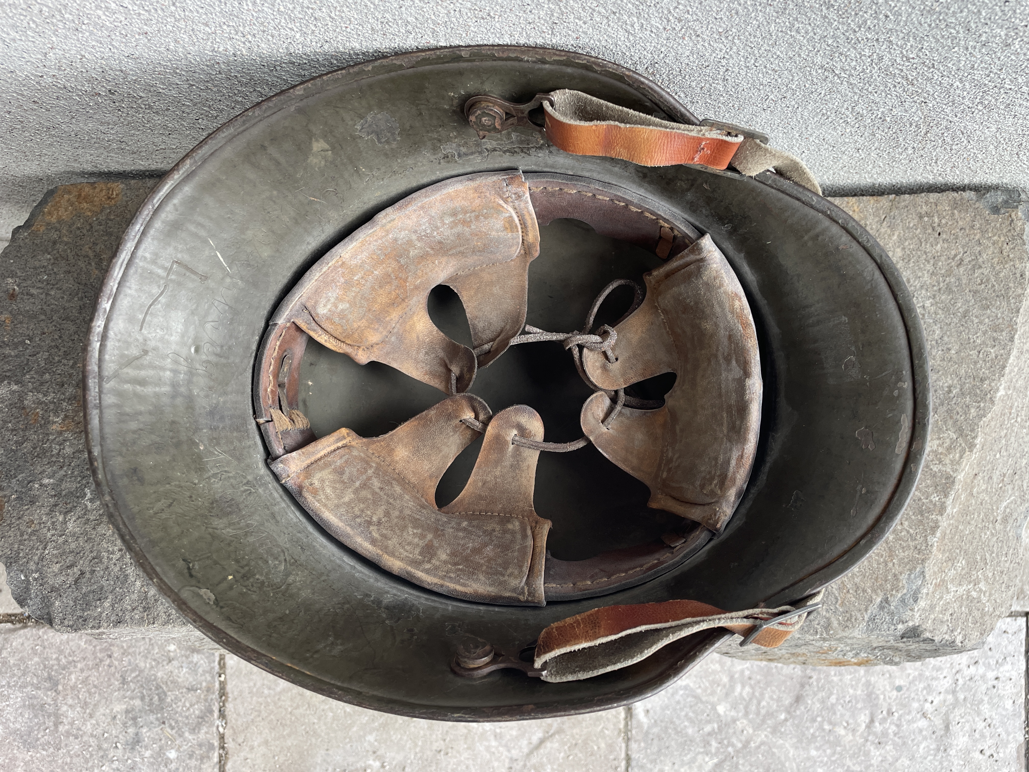 A very interesting highlight of this helmet is that at the back skirt the original German solider engraved his name and date in what must have been a pocket knife the following words: "Lichtenberger 15, 6, 1917" which must refer to his last name and date June 15, 1917.