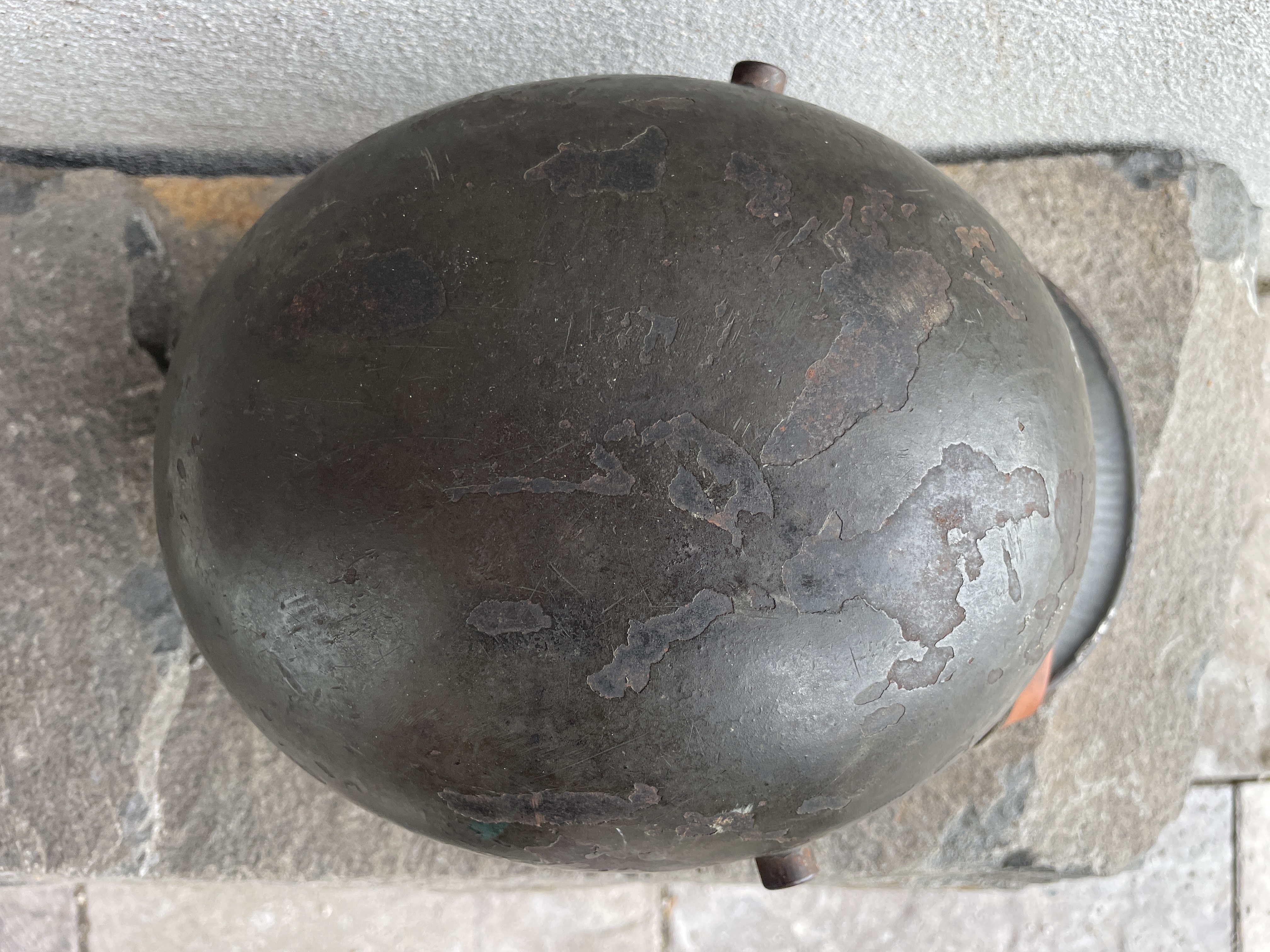 This helmet is a right as rain and came back from a US vet from WW1 in 1918 according to the family's recollections. This is an M16 stamped TJ66 with it's original factory dark pea green enamel paint both inside and outside.